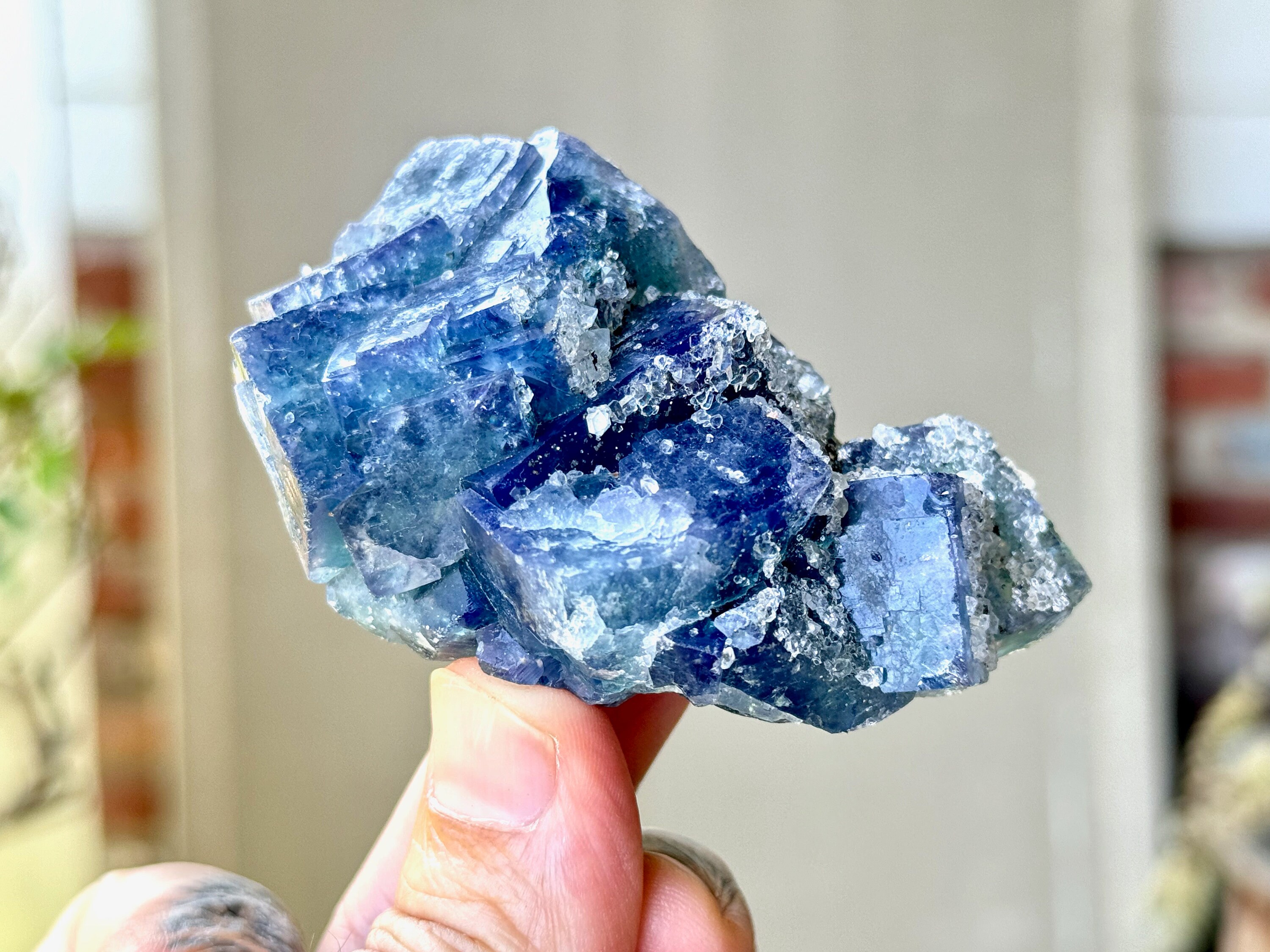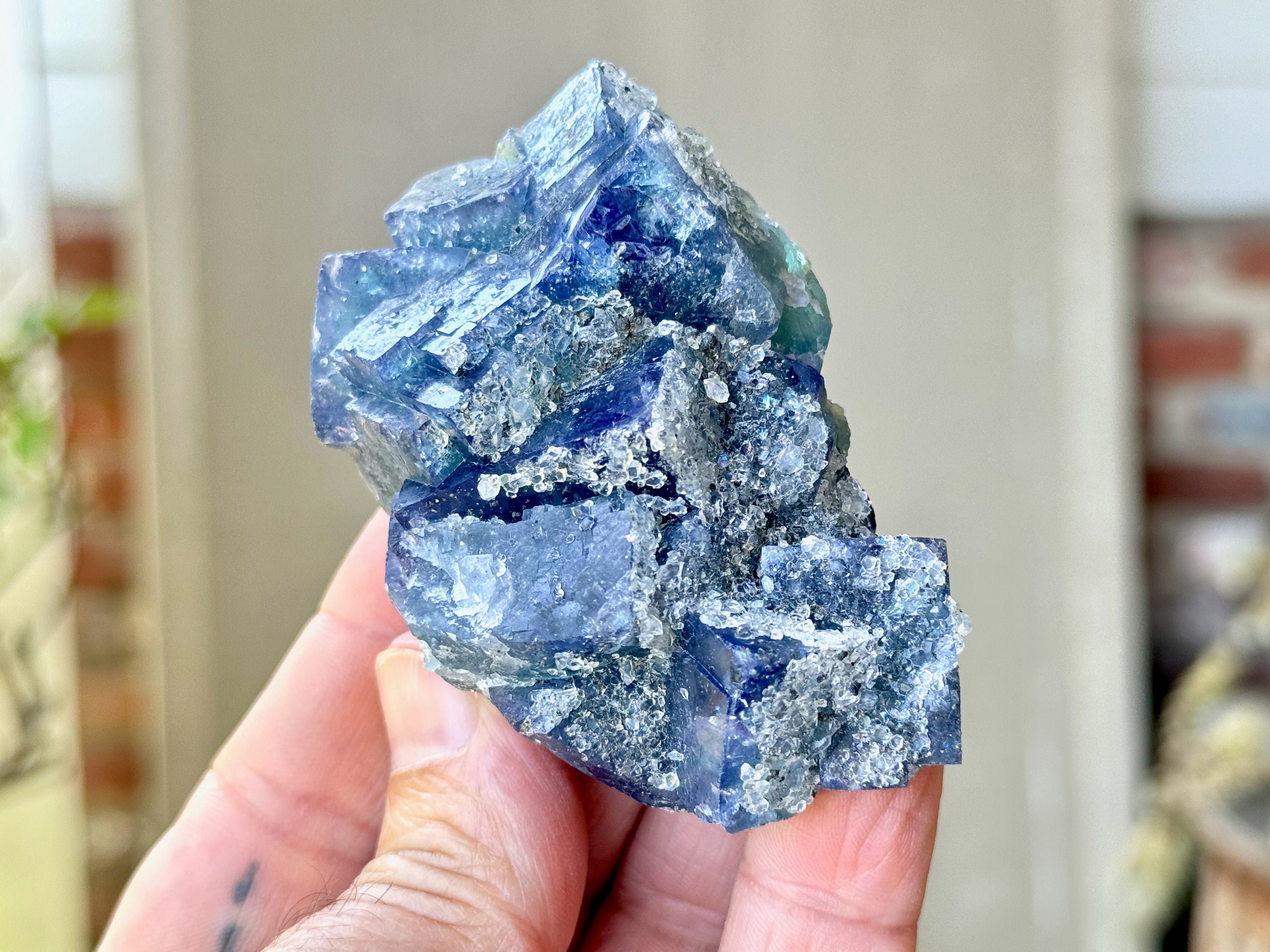 We love the formation of this crystal, with all of its individual cubic formations, clustered together in such an aesthetic way. This piece displays a gorgeous deep indigo blue hue at first, with some areas that are more green near the base. When backlit, we can really see these teal blue-green colors more prominently, and we can also see the zoning of colors that meld into more indigo hues. And when we look at it in natural sunlight, we can start to see some color zoning between the purple and blue-green areas.