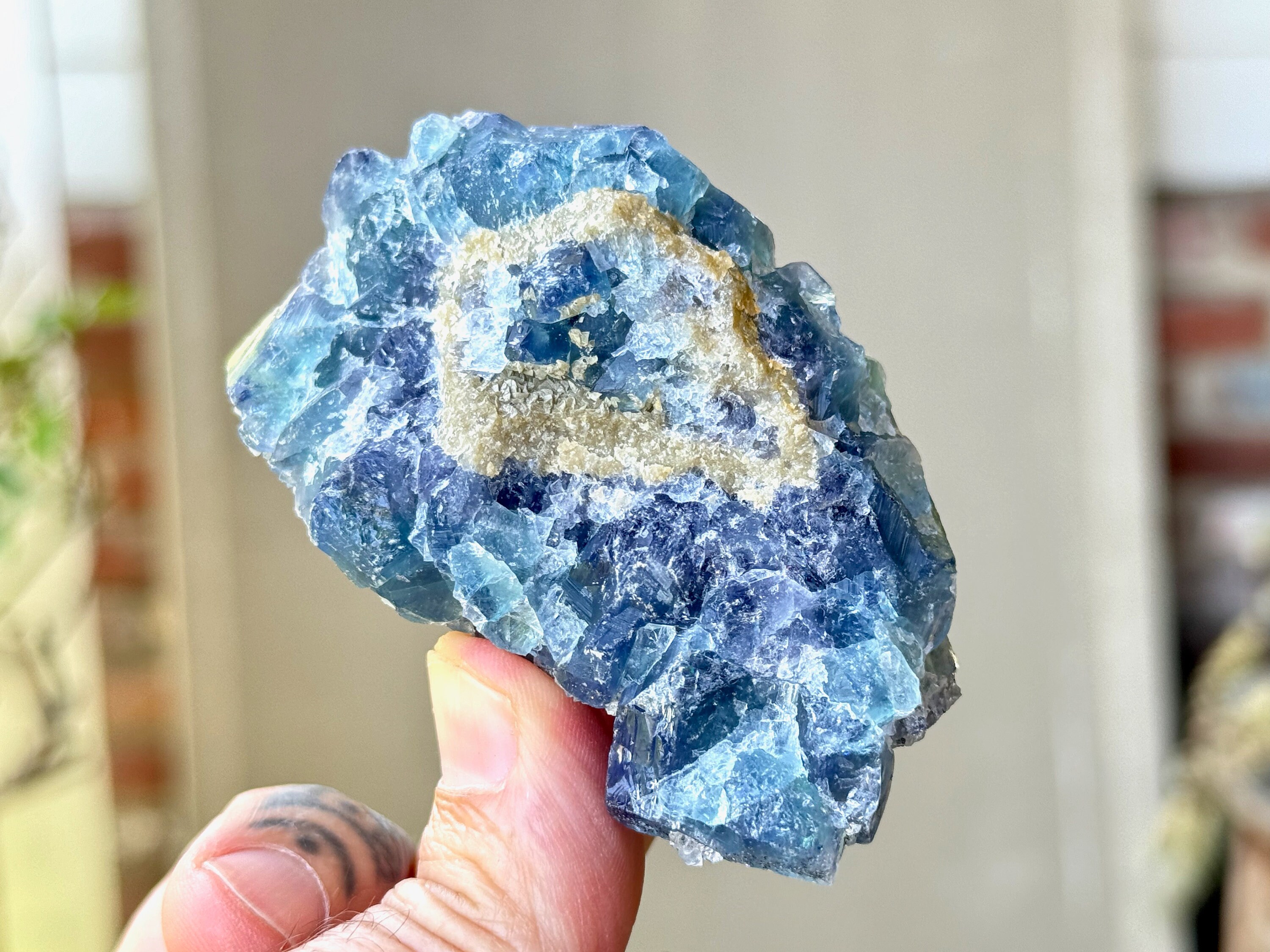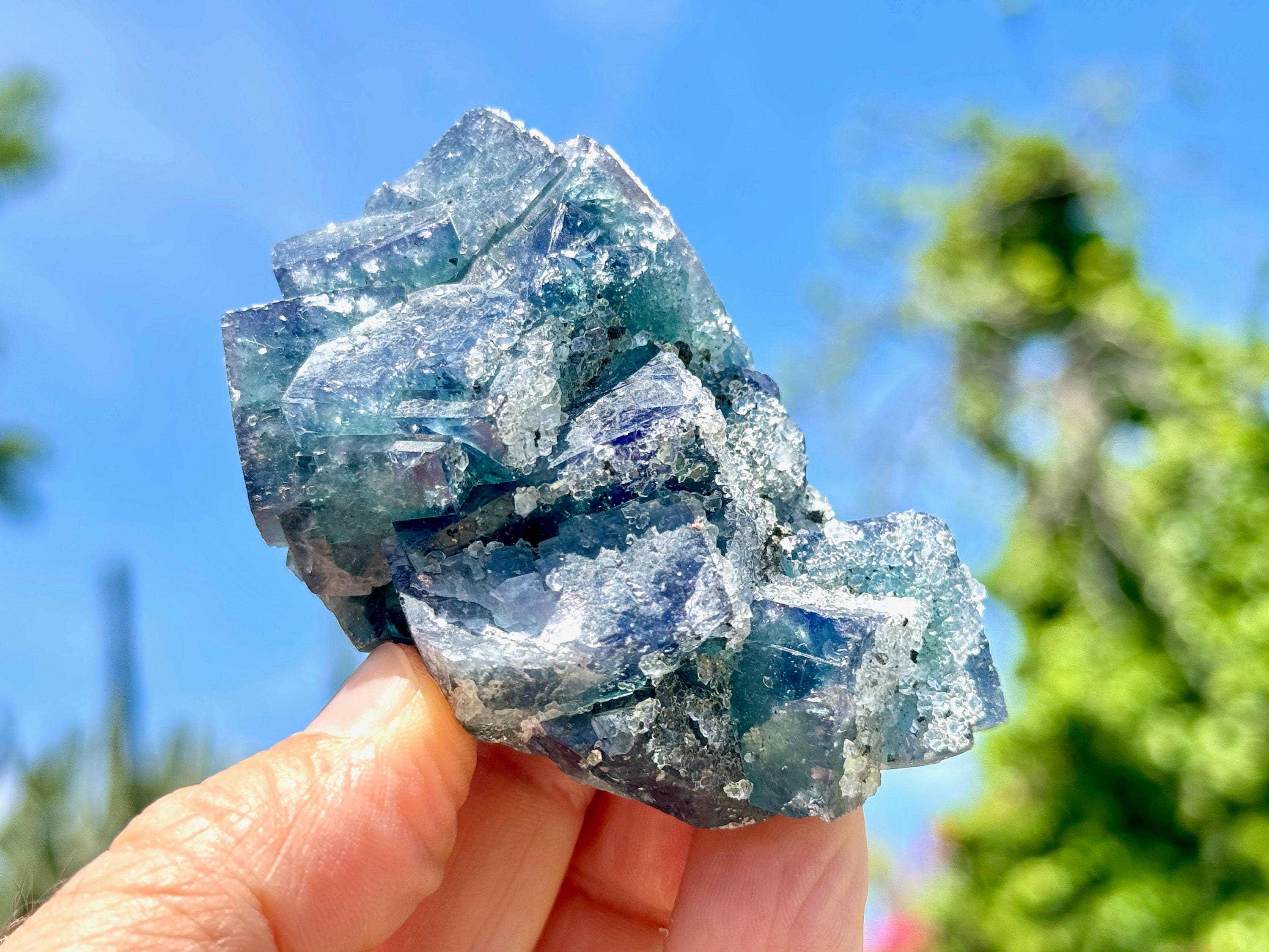 **PLEASE NOTE we've included photos that were taken in 1) partially shaded outdoor lighting 2) natural direct sunlight 3) backlighting to show off their translucency and hues and 4) with direct UV light to show their UV reactivity. We've done our best to faithfully represent these unique crystals in a variety of light environments. Please be aware that these Fluorites can appear differently depending on the environment in which you are enjoying them.