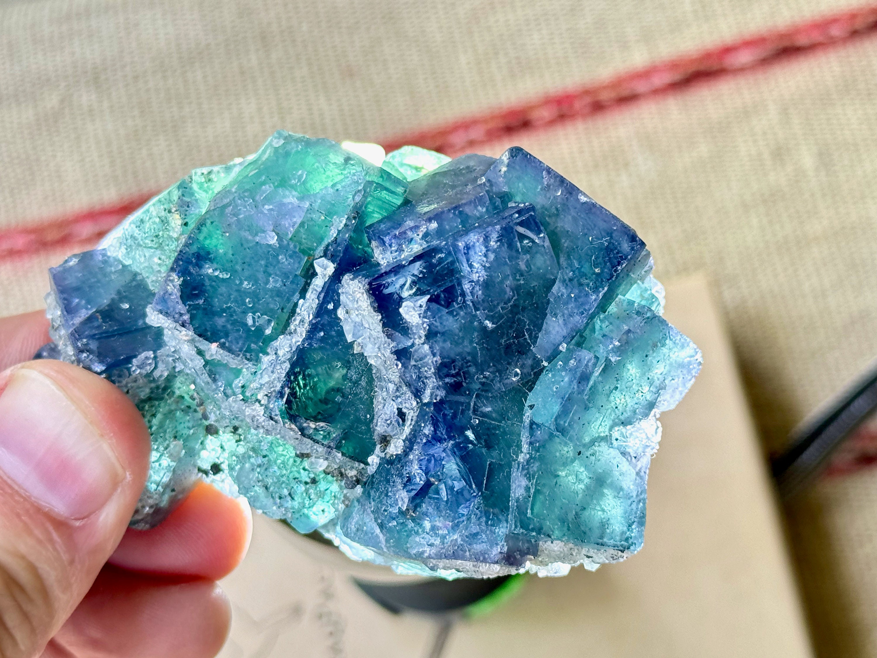 The Fluorites from this find are quite special for a variety of reasons. First, many of them are multicolor, displaying various hues of purple, blue and green. They also are considered to be "color changing," as their hues can vary when viewed in natural sunlight (versus indoors) and especially under UV (Ultraviolet) light, as they are also UV reactive. When backlit, many of these crystals will reveal even more brilliant hues.