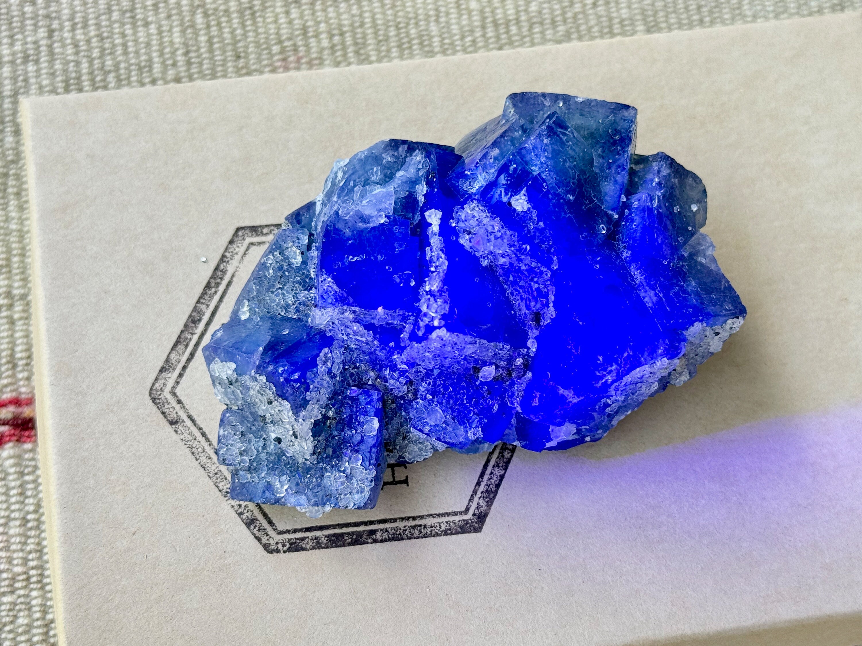 This piece is also highly UV reactive, and when you shine a UV light on it (as seen in Photo 5 and in the video) the color changes to a rich royal blue! It's naturally flat base allows it to sit nicely on any surface. Truly magnificent!