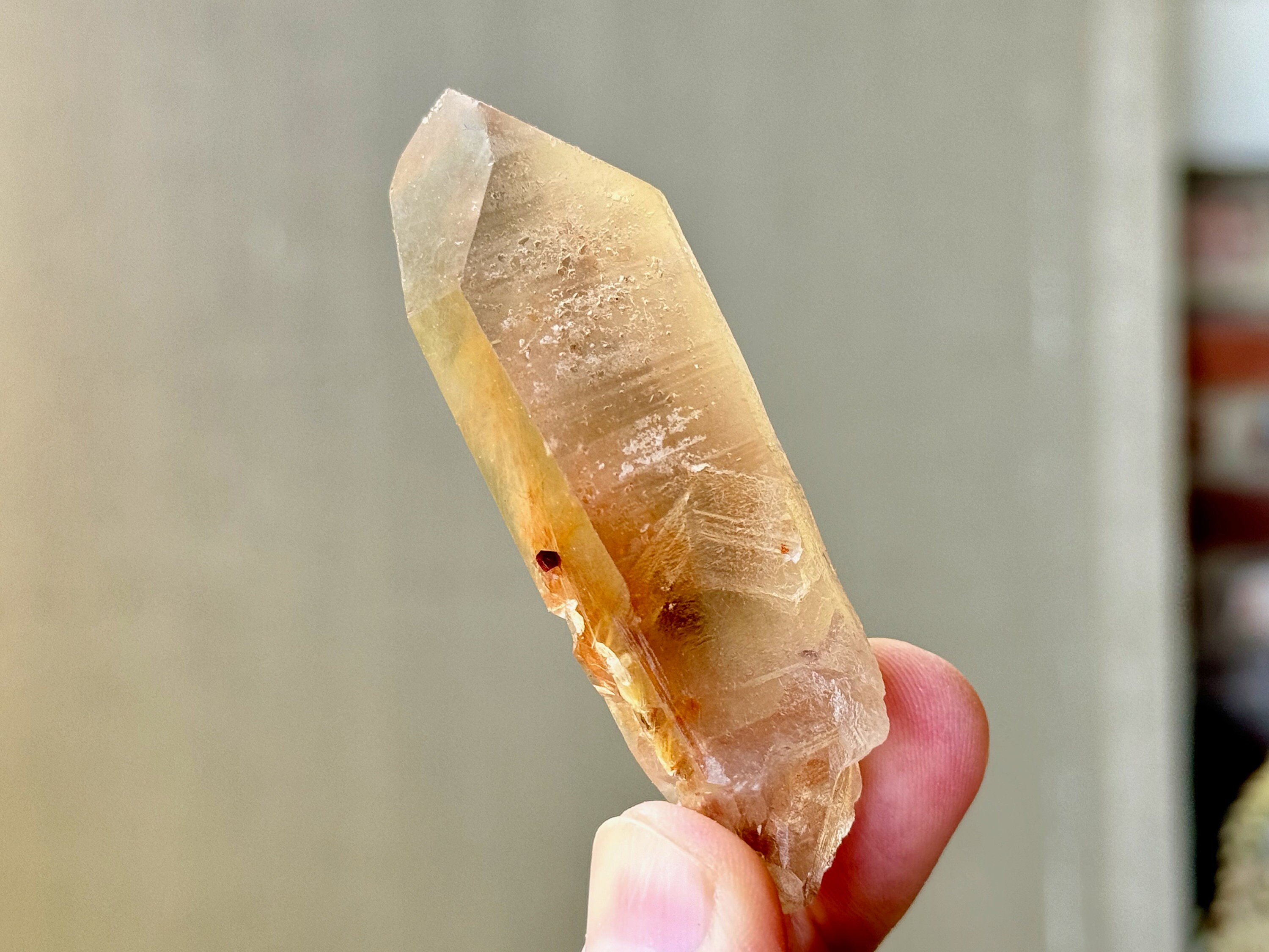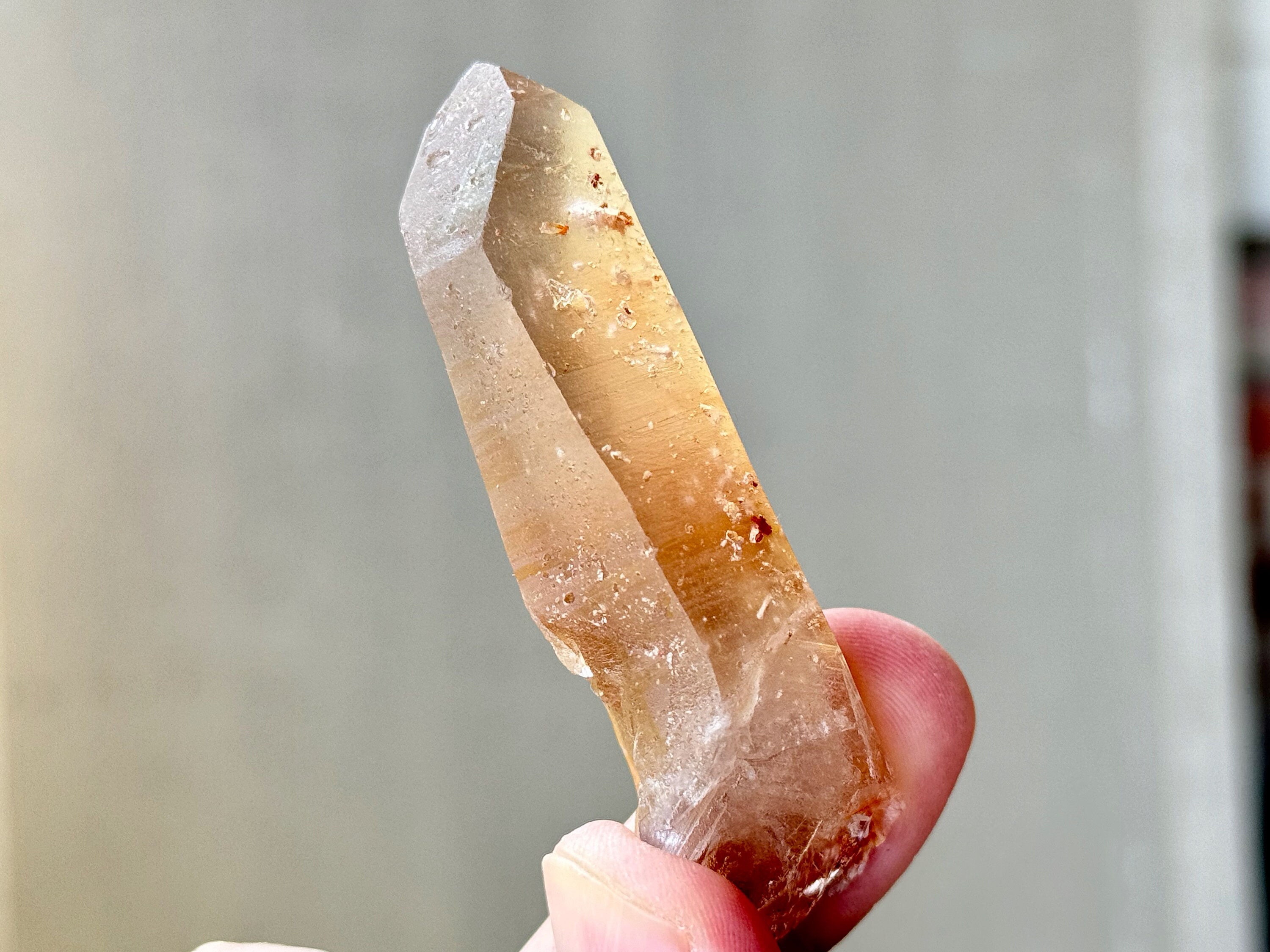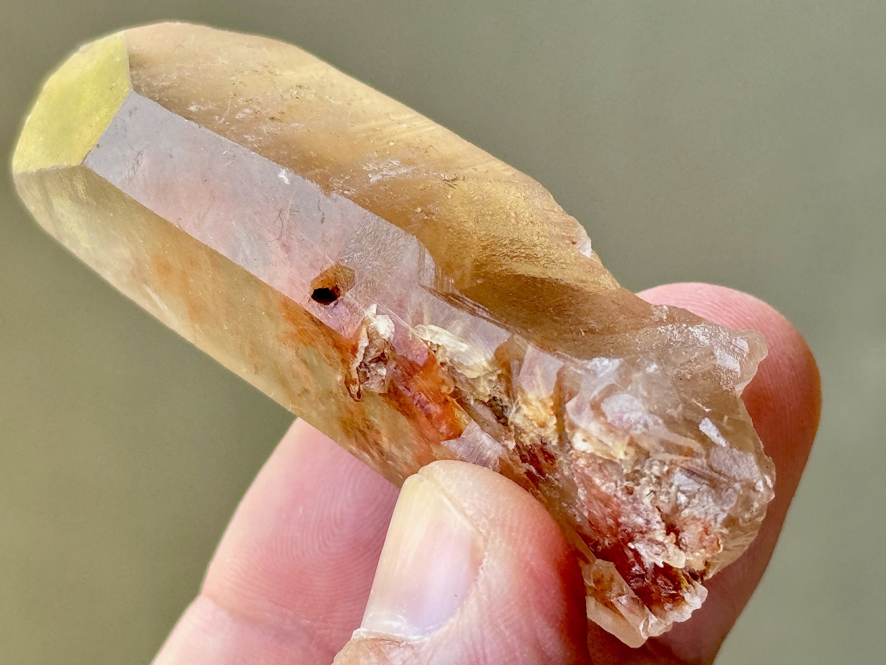 This crystal has lovely clarity and very nice luster. It is this clarity that allows us to peer inside and see all the amazing Angel Hair rutile inclusions within. These inclusions look orange and red, but take a closer look (and backlight as well) and you will see some are golden in this piece. I believe these are all White Amphibole inclusions, due to their fineness and fibrousness, that have taken on a bit of color due to the Hematite content in the crystal and in the soil where it was found.