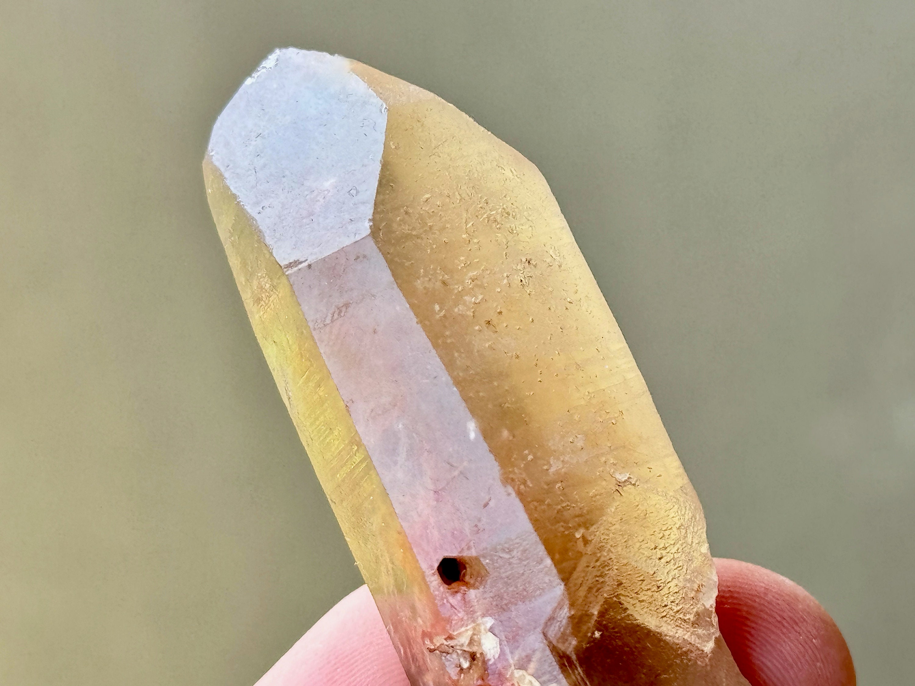 What's even more special about this crystal is that it is a rare Dow Formation, with alternating 7 and 3-sided main facets (see more on this below). There's a very minor "fleabite" near the top of the main facet, but the termination itself is otherwise very nice. A great and unique piece from this small find.