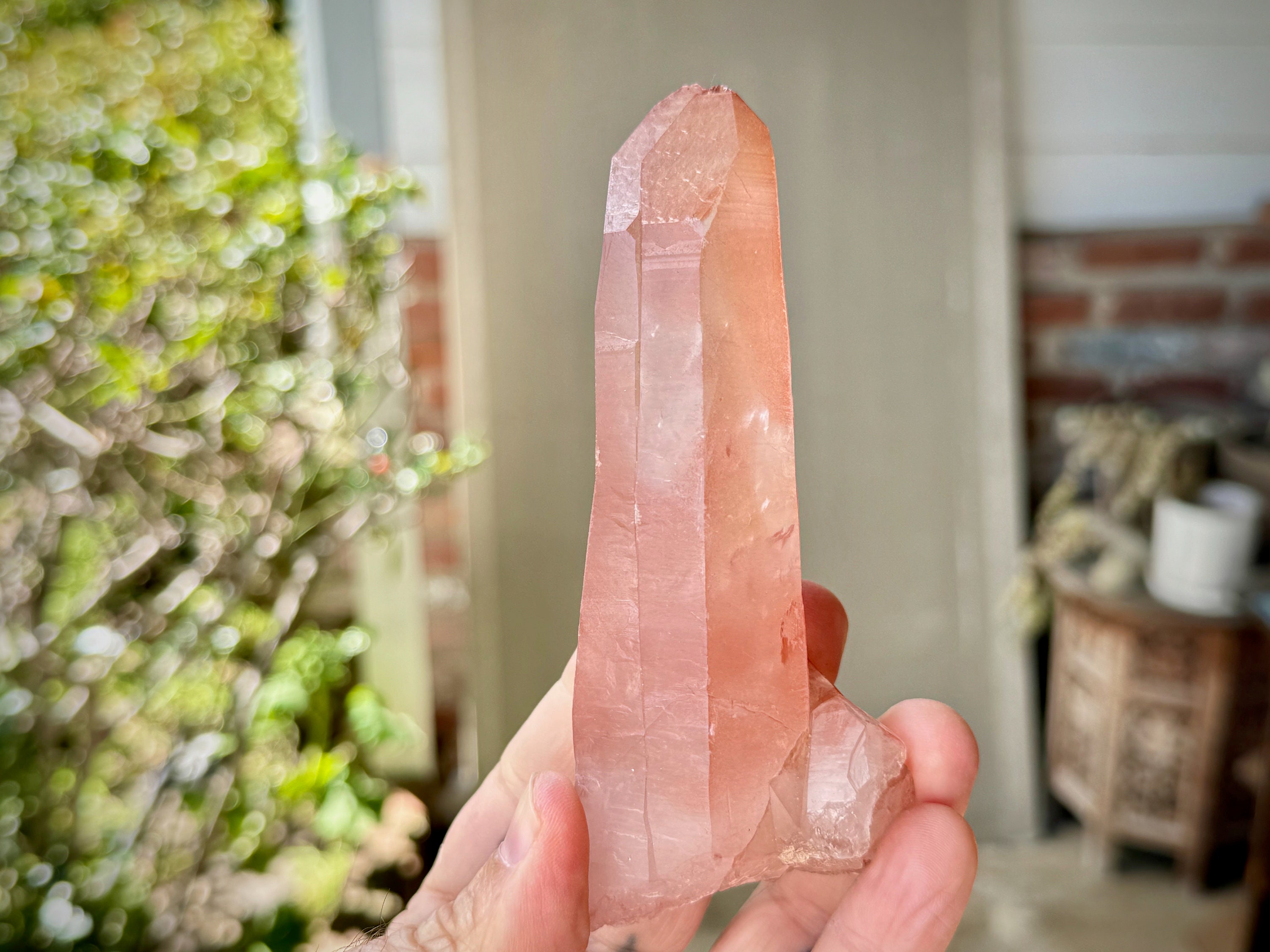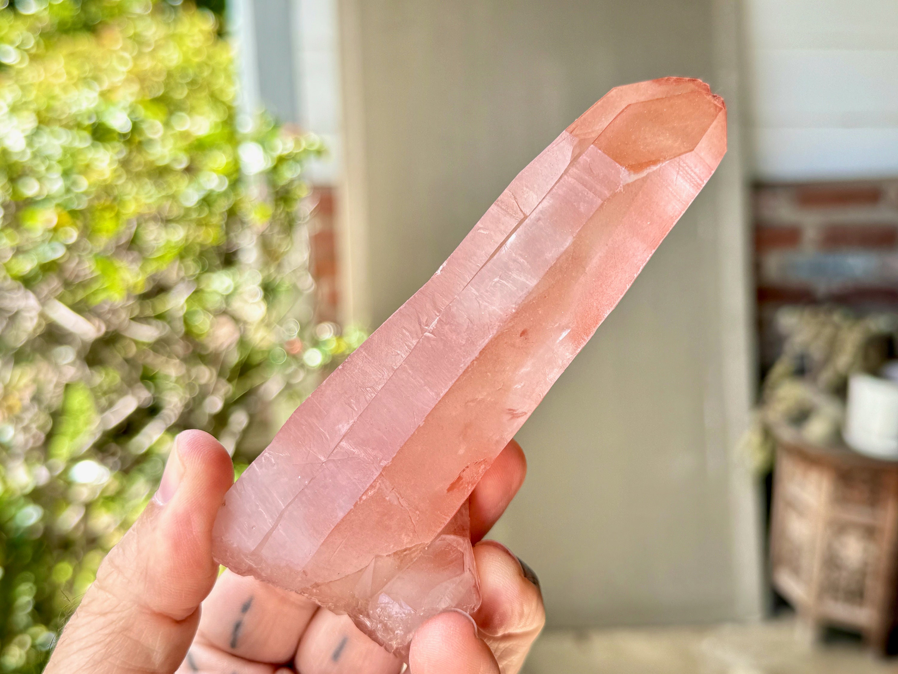 One of the largest pieces from this collection, this is an exquisite Pink Scarlet Lemurian with a gentle, but vibrant, pink hue, outstanding clarity and superb luster! It actually looks more like the original Pink Lemurians from 20+ years back with its rich pink color and clarity. In this particular crystal, the pink hue is most certainly saturated into the Quartz itself, giving it a beautiful depth of color and clarity. There is also a bit of a mild white "frost" on the exterior on the back, as is characteristic of some of the crystals from this find.