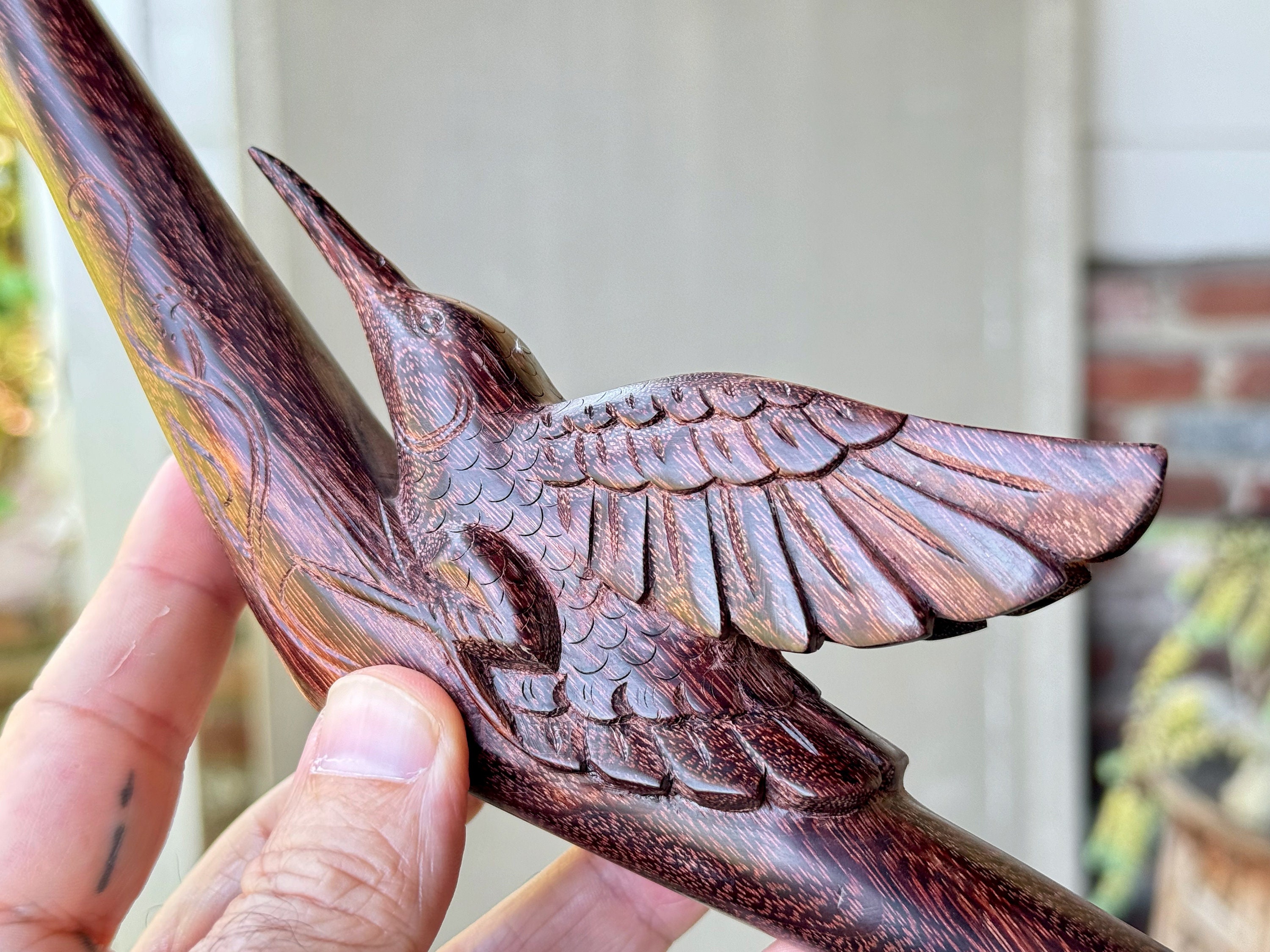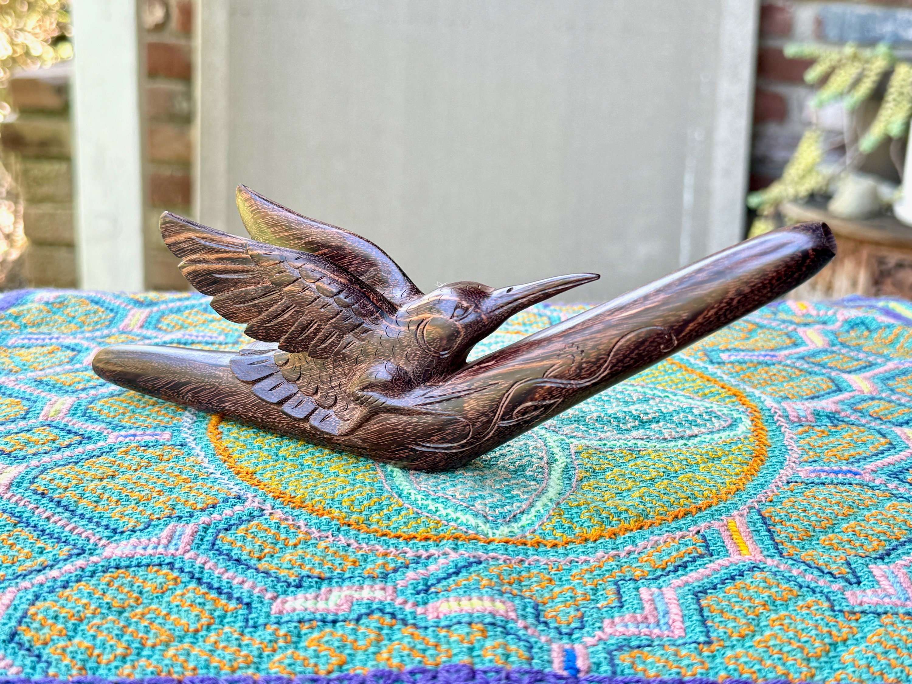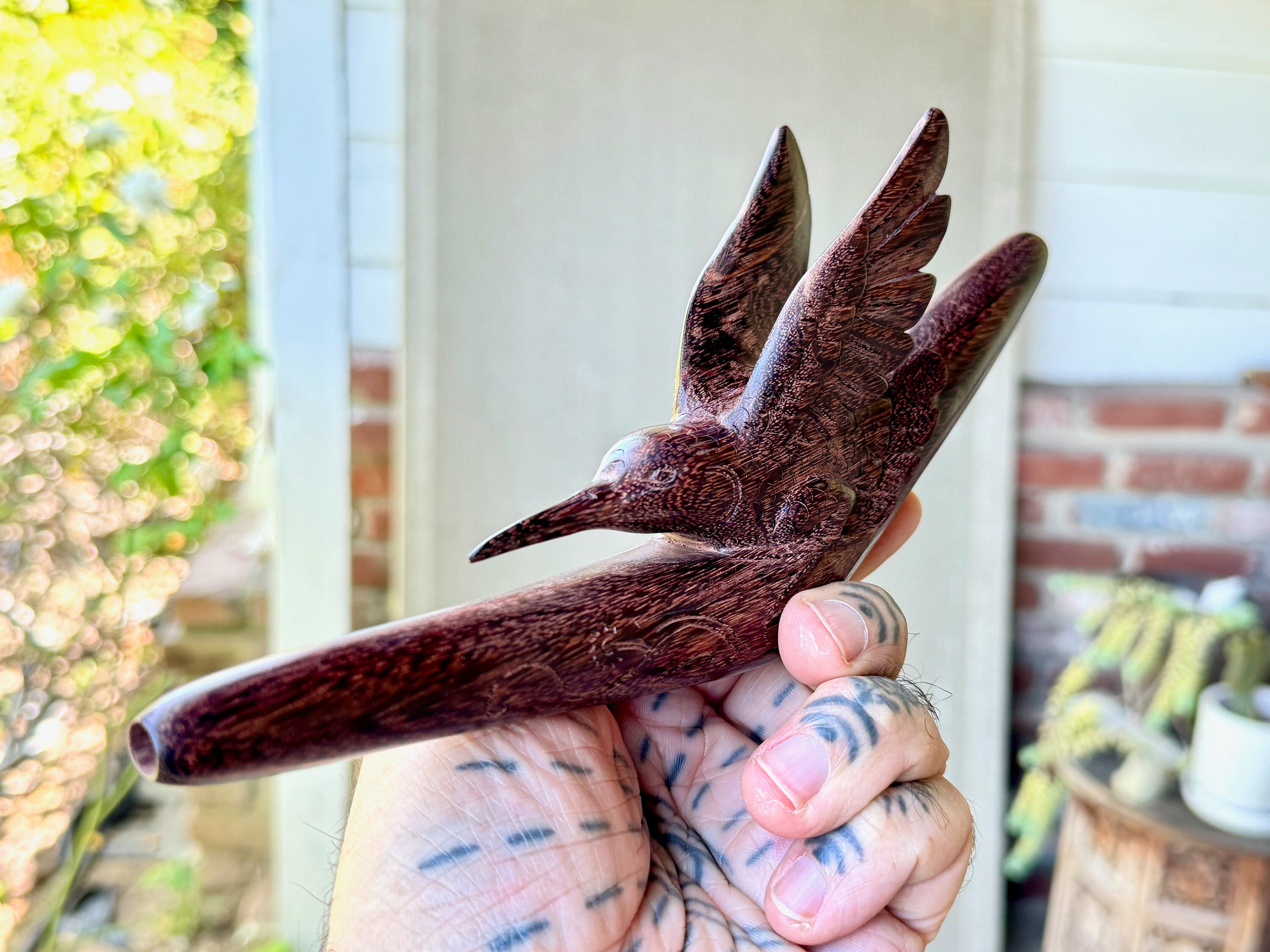 A beautiful Hummingbird in flight! Exquisite craftsmanship to this beautiful tepi pipe made from a solid piece of natural, dark Tamarind Wood. Tamarind is among our favorite woods for these pipes, as it has a beautiful grain and is very dense, like stone! Gorgeous and elegant, with a wonderful attention to detail. A wonderful medicine tool.