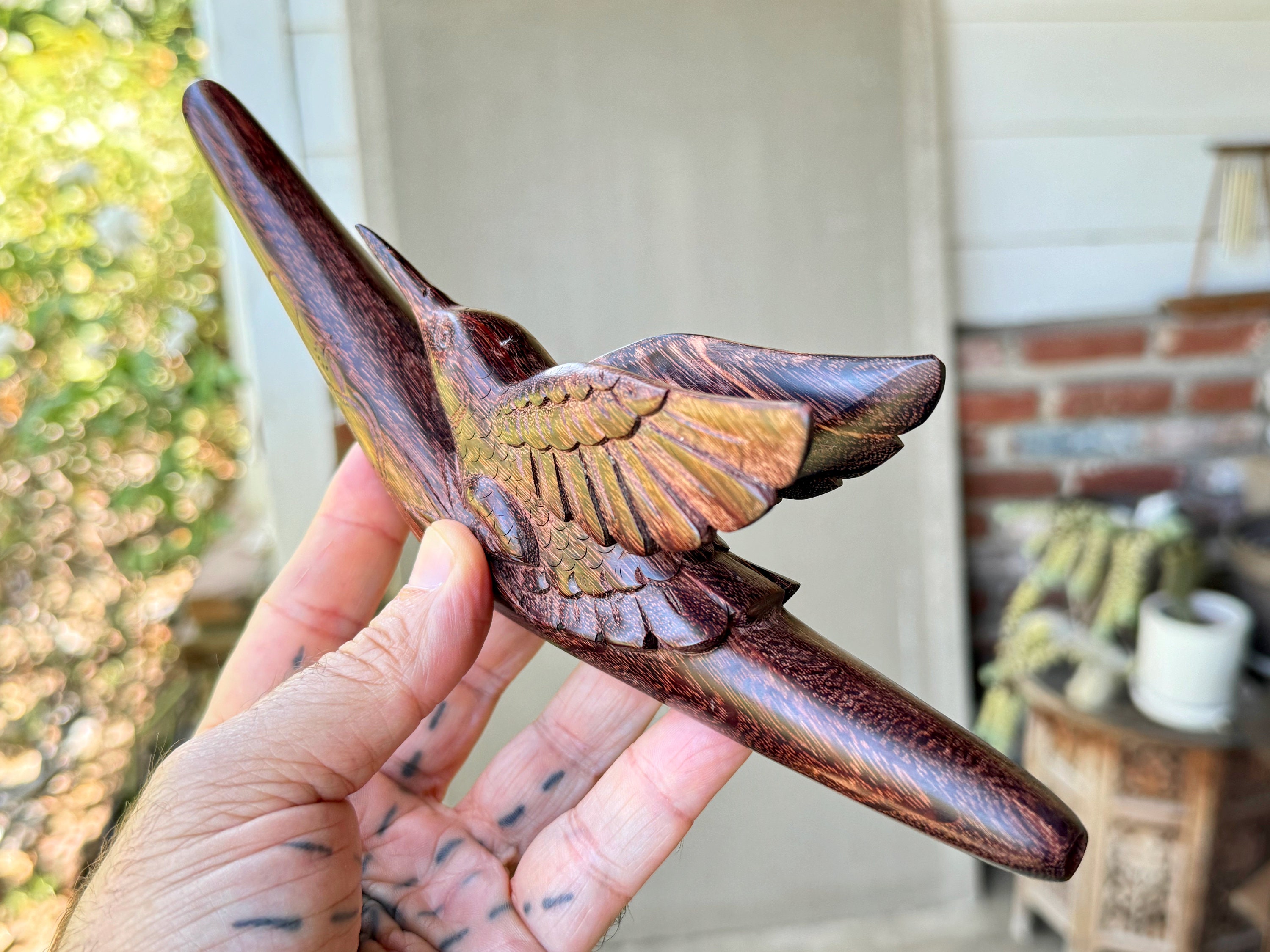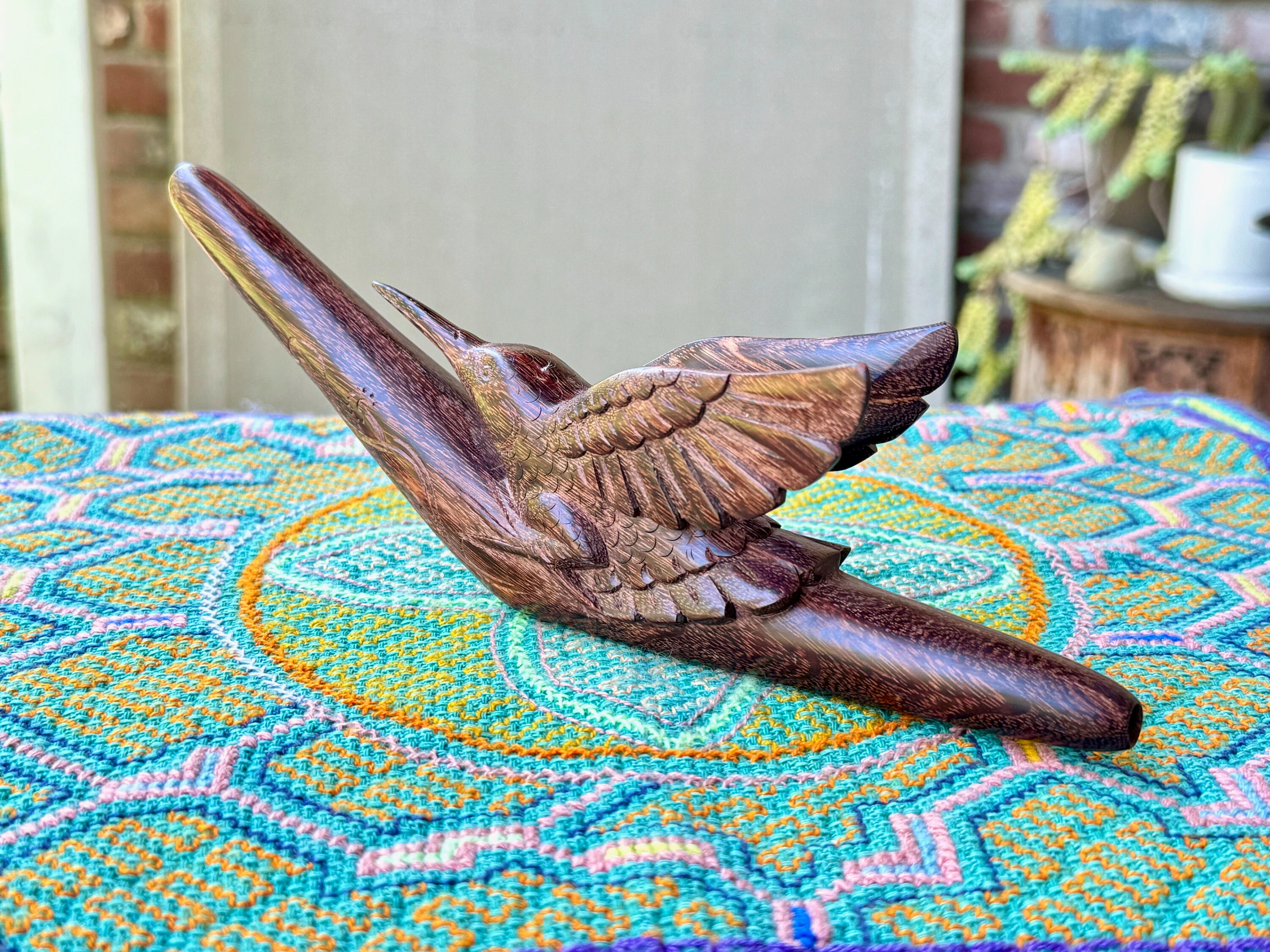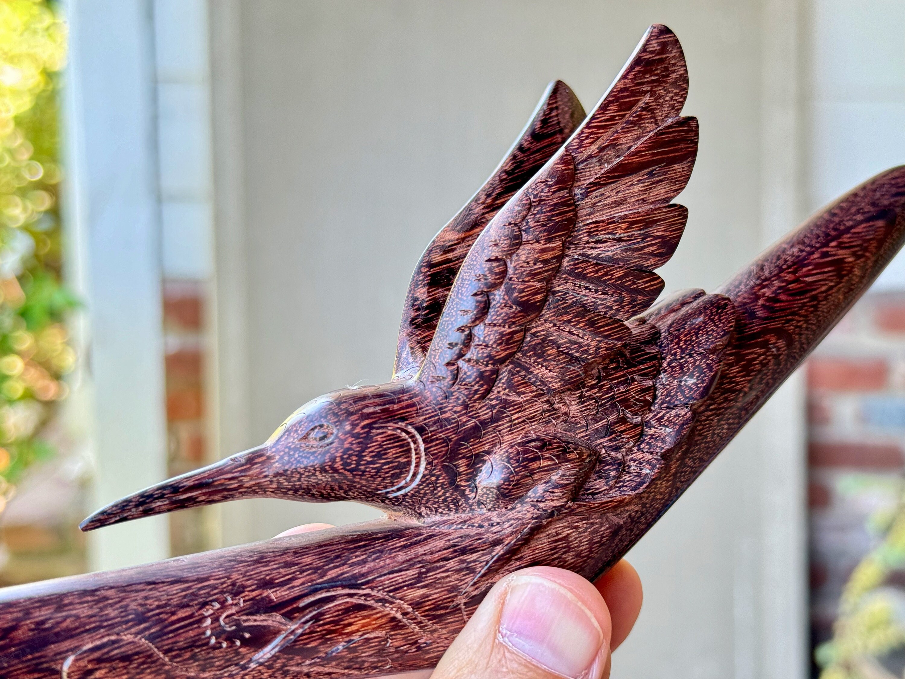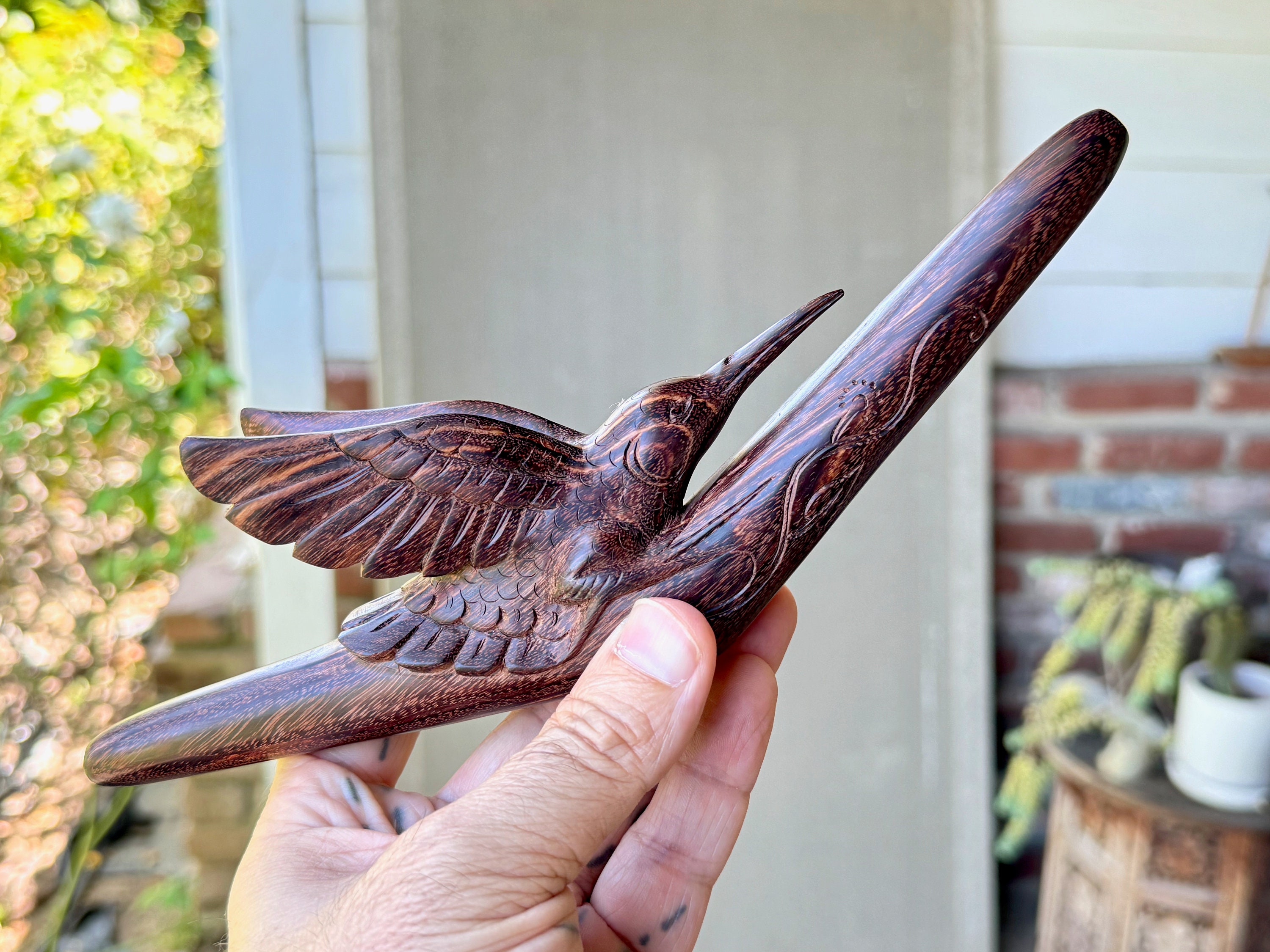 A beautiful Hummingbird in flight! Exquisite craftsmanship to this beautiful tepi pipe made from a solid piece of natural, dark Tamarind Wood. Tamarind is among our favorite woods for these pipes, as it has a beautiful grain and is very dense, like stone! Gorgeous and elegant, with a wonderful attention to detail. A wonderful medicine tool.
