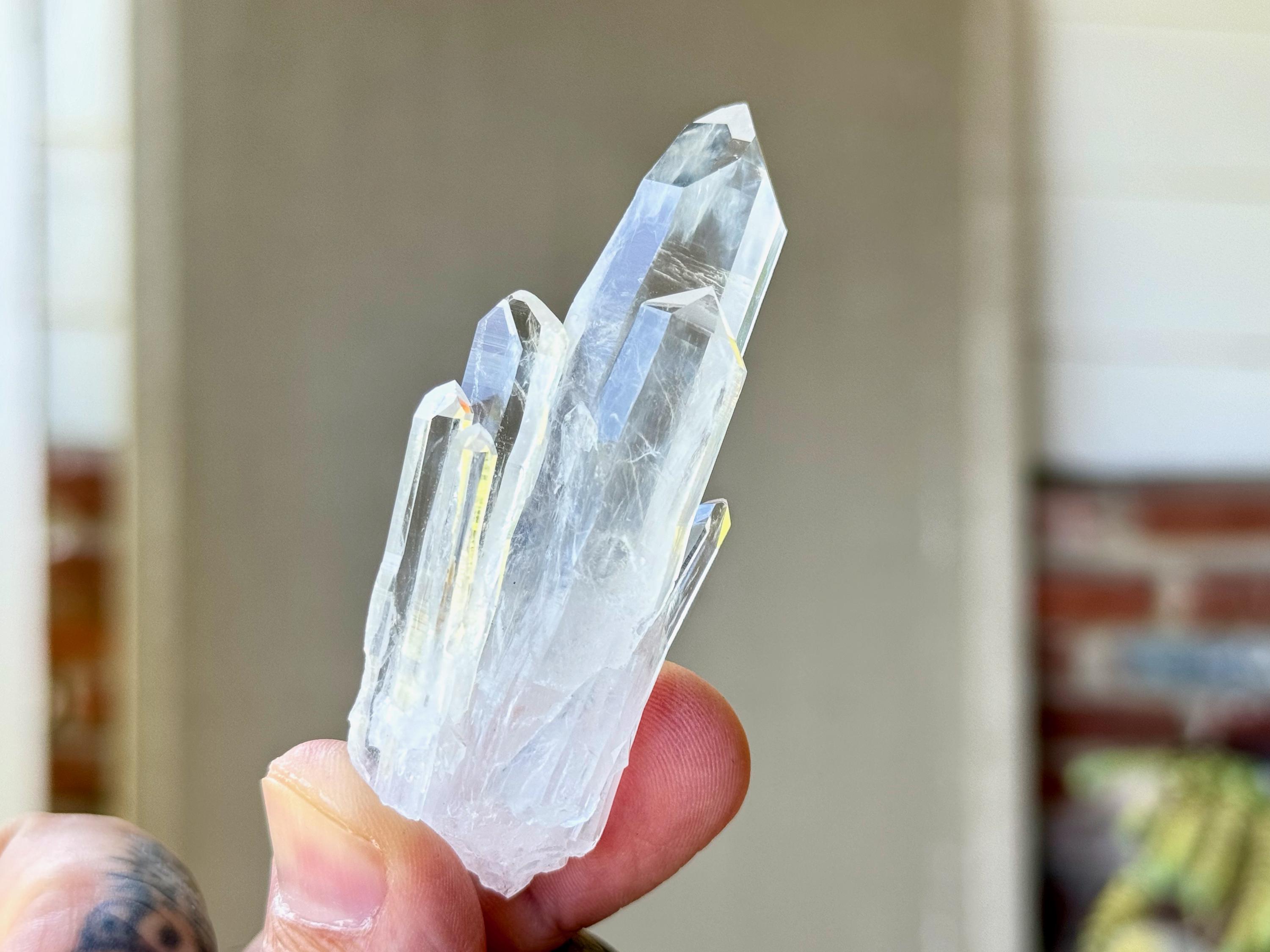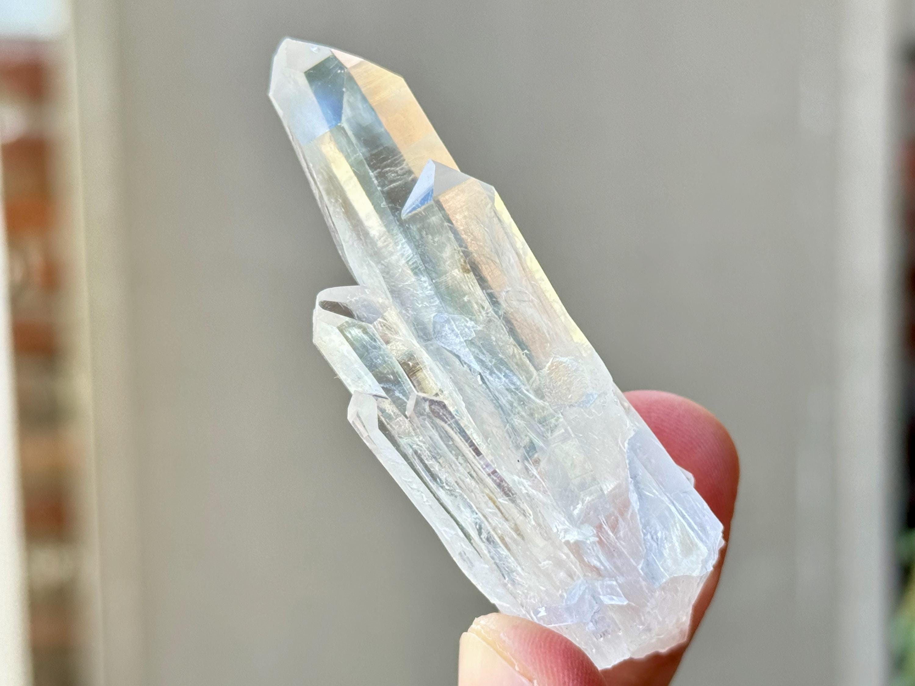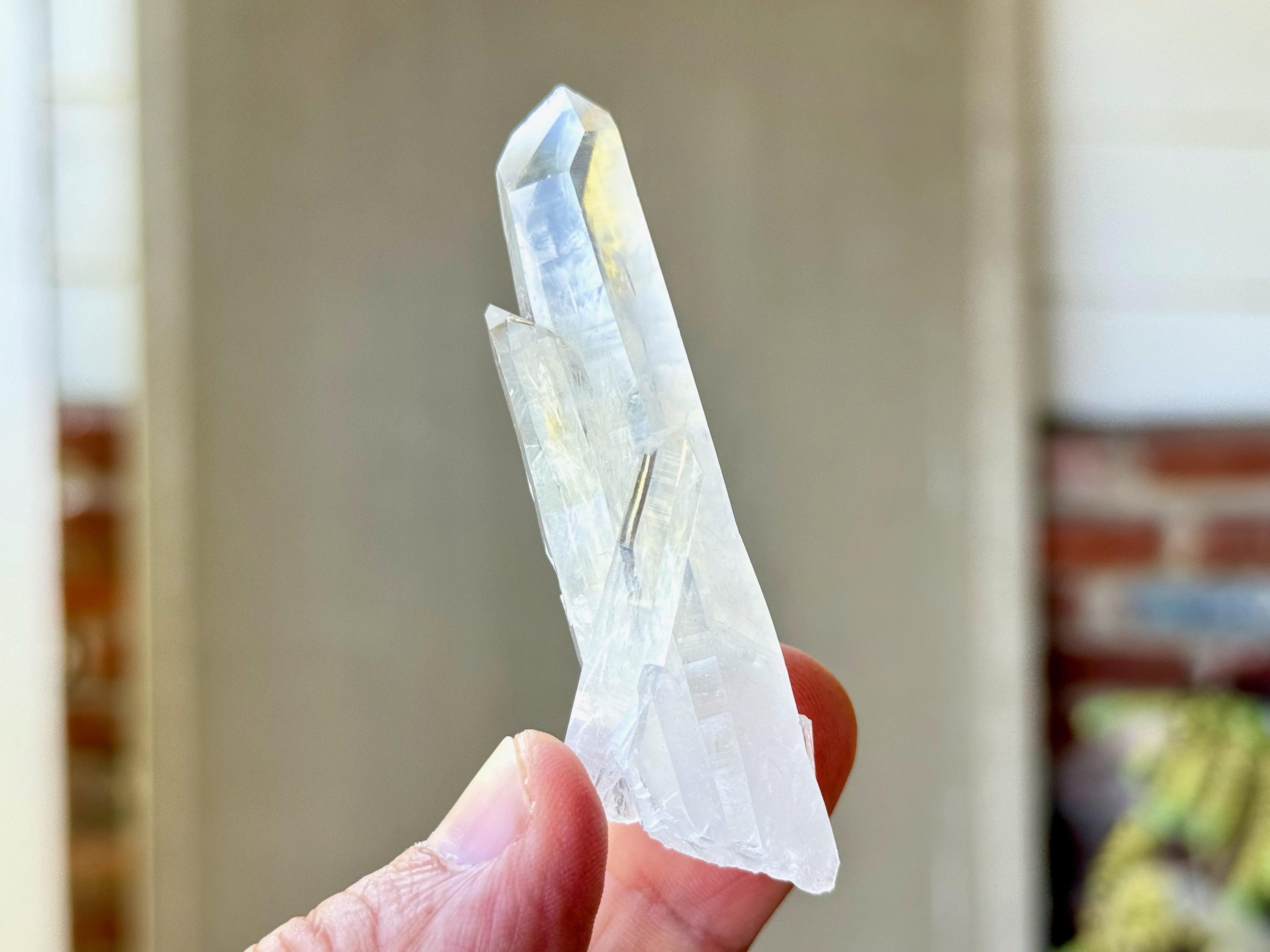 Sometimes also referred to as "Blue Mist" or "Blue Feather" Quartz, these crystals are named for the nebulous pale blue and white phantoms that appear in the center of many of them, which are considered to be a product of their natural opalescence (or "girasol effect") and not a mineral inclusion. While these phantom inclusions are generally white with an occasional pale blue tint, *some* of the crystals from this new find share similar properties to "Blue Needle" Quartz, and when lit in a certain way with pure white light, these inclusions may show up with a bit more of a blue hue akin to Blue Needle Quartz.