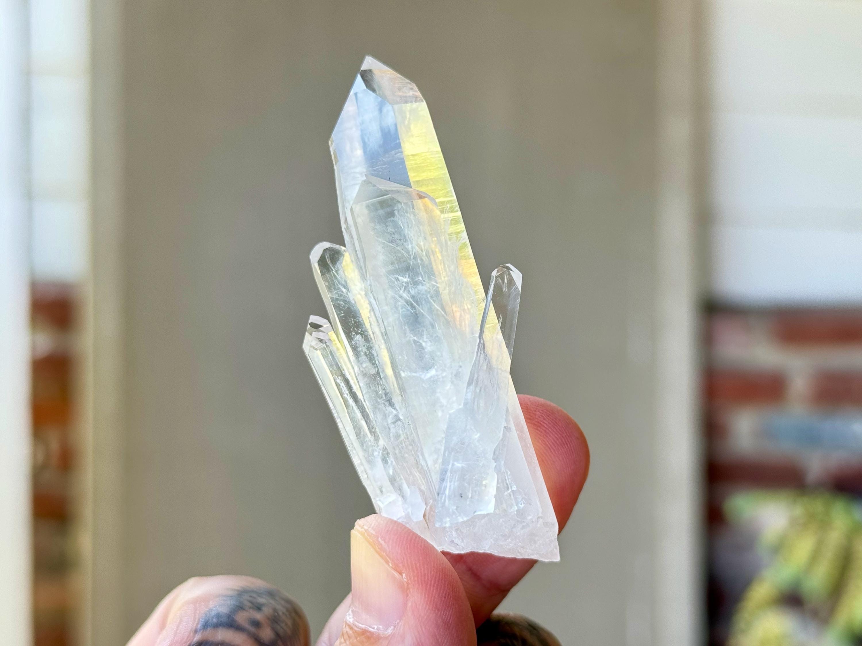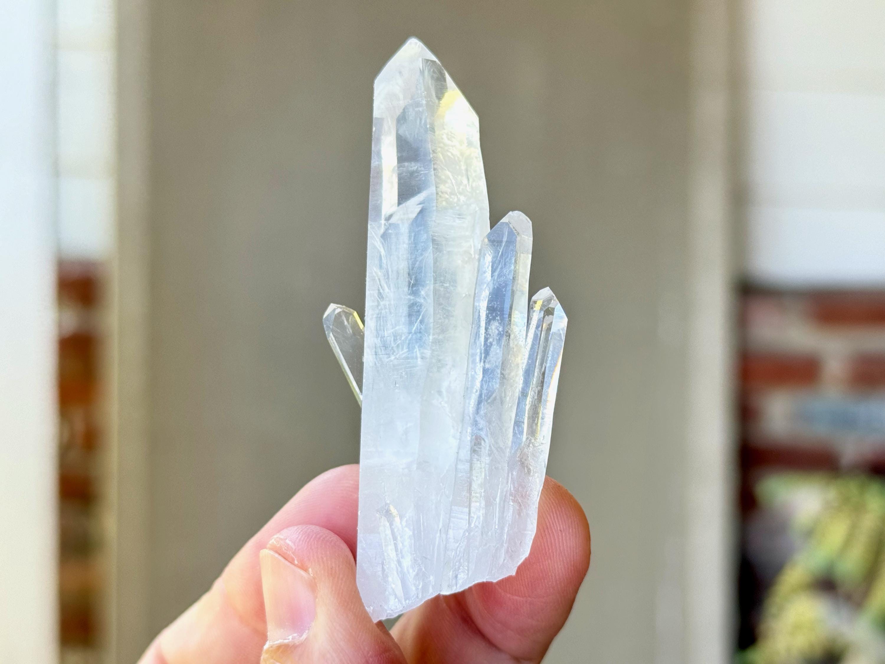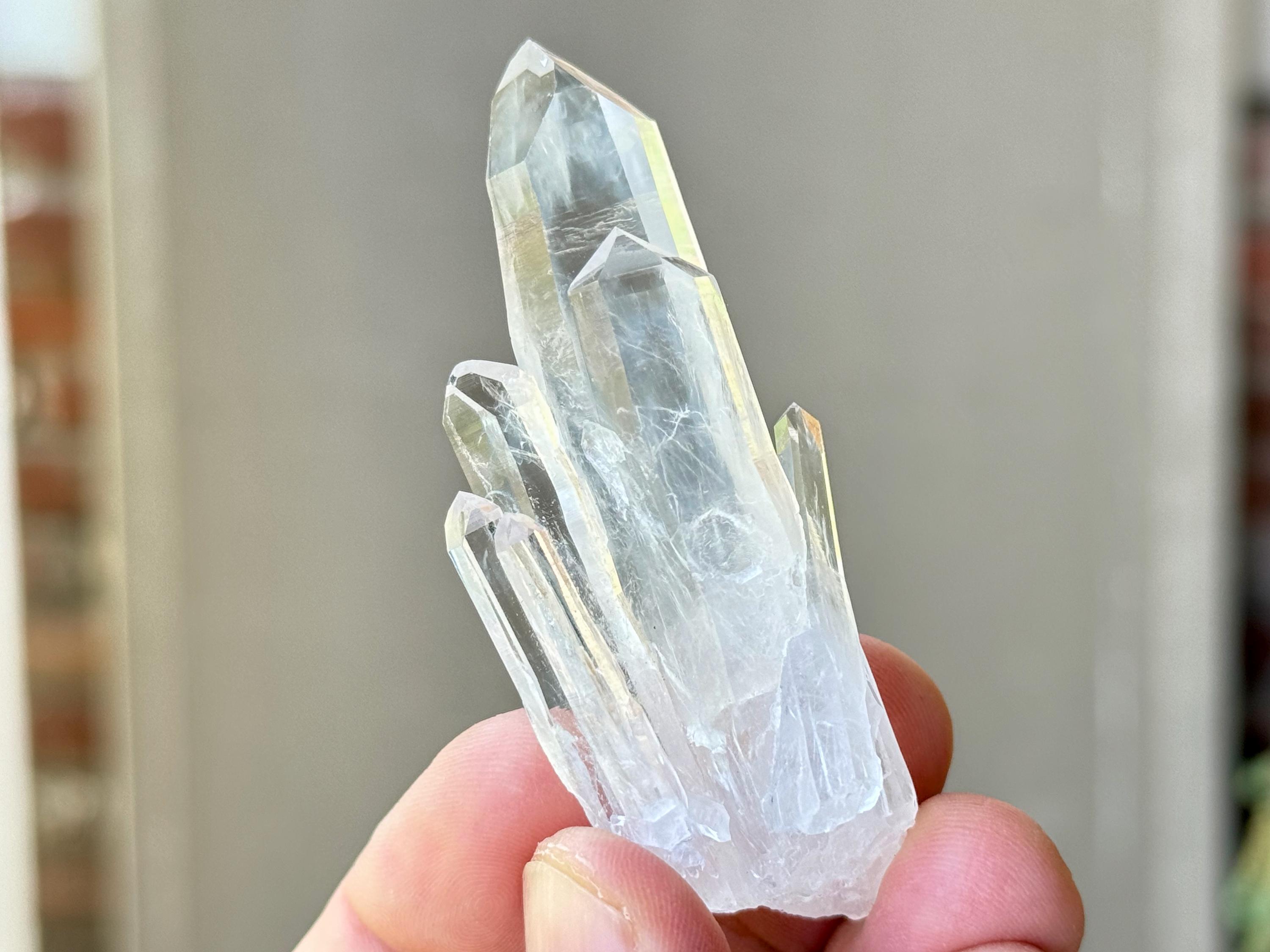 Sometimes also referred to as "Blue Mist" or "Blue Feather" Quartz, these crystals are named for the nebulous pale blue and white phantoms that appear in the center of many of them, which are considered to be a product of their natural opalescence (or "girasol effect") and not a mineral inclusion. While these phantom inclusions are generally white with an occasional pale blue tint, *some* of the crystals from this new find share similar properties to "Blue Needle" Quartz, and when lit in a certain way with pure white light, these inclusions may show up with a bit more of a blue hue akin to Blue Needle Quartz.