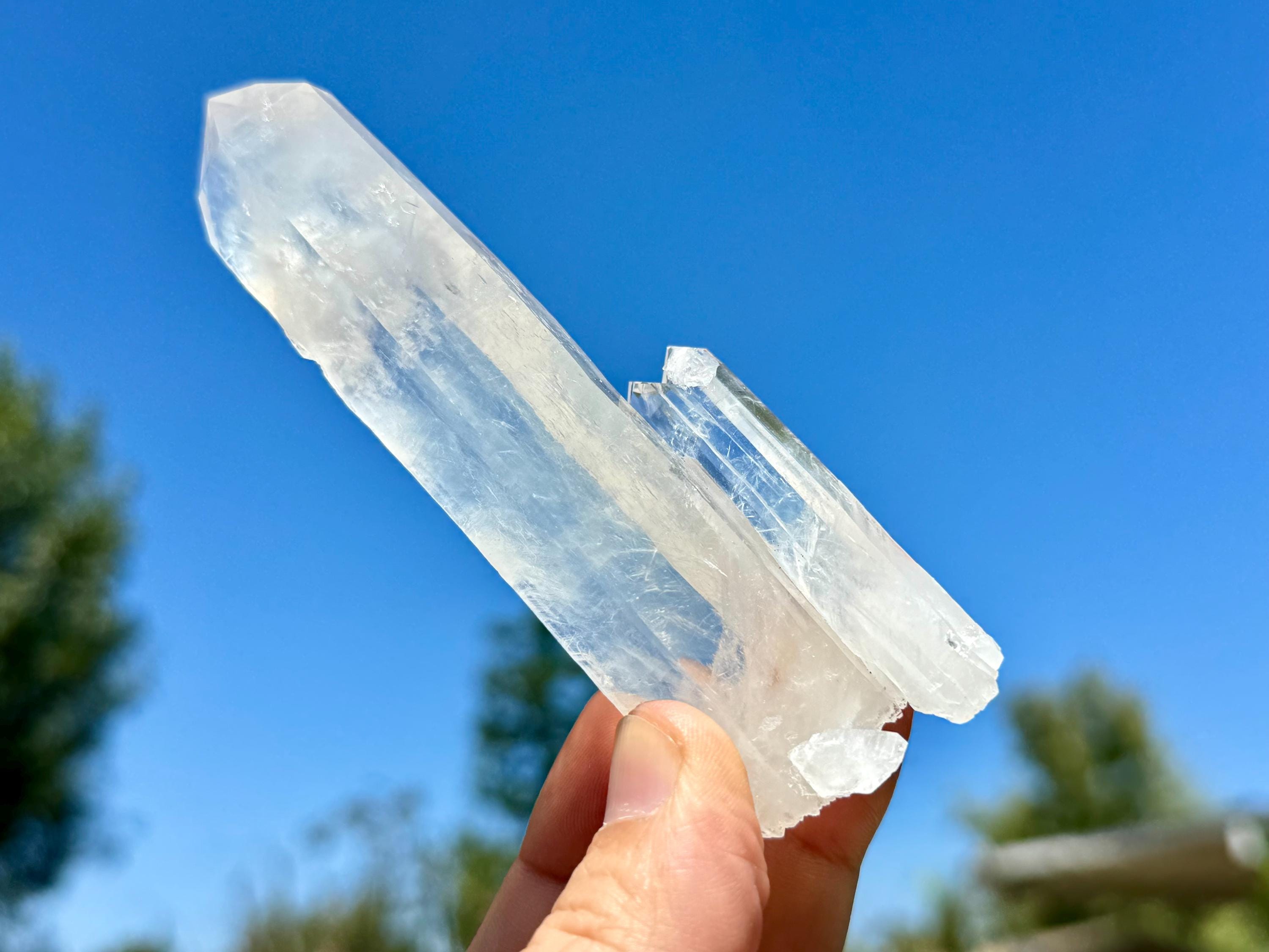 Sometimes also referred to as "Blue Mist" or "Blue Feather" Quartz, these crystals are named for the nebulous pale blue and white phantoms that appear in the center of many of them, which are considered to be a product of their natural opalescence (or "girasol effect") and not a mineral inclusion. While these phantom inclusions are generally white with an occasional pale blue tint, *some* of the crystals from this new find share similar properties to "Blue Needle" Quartz, and when lit in a certain way with pure white light, these inclusions may show up with a bit more of a blue hue akin to Blue Needle Quartz.