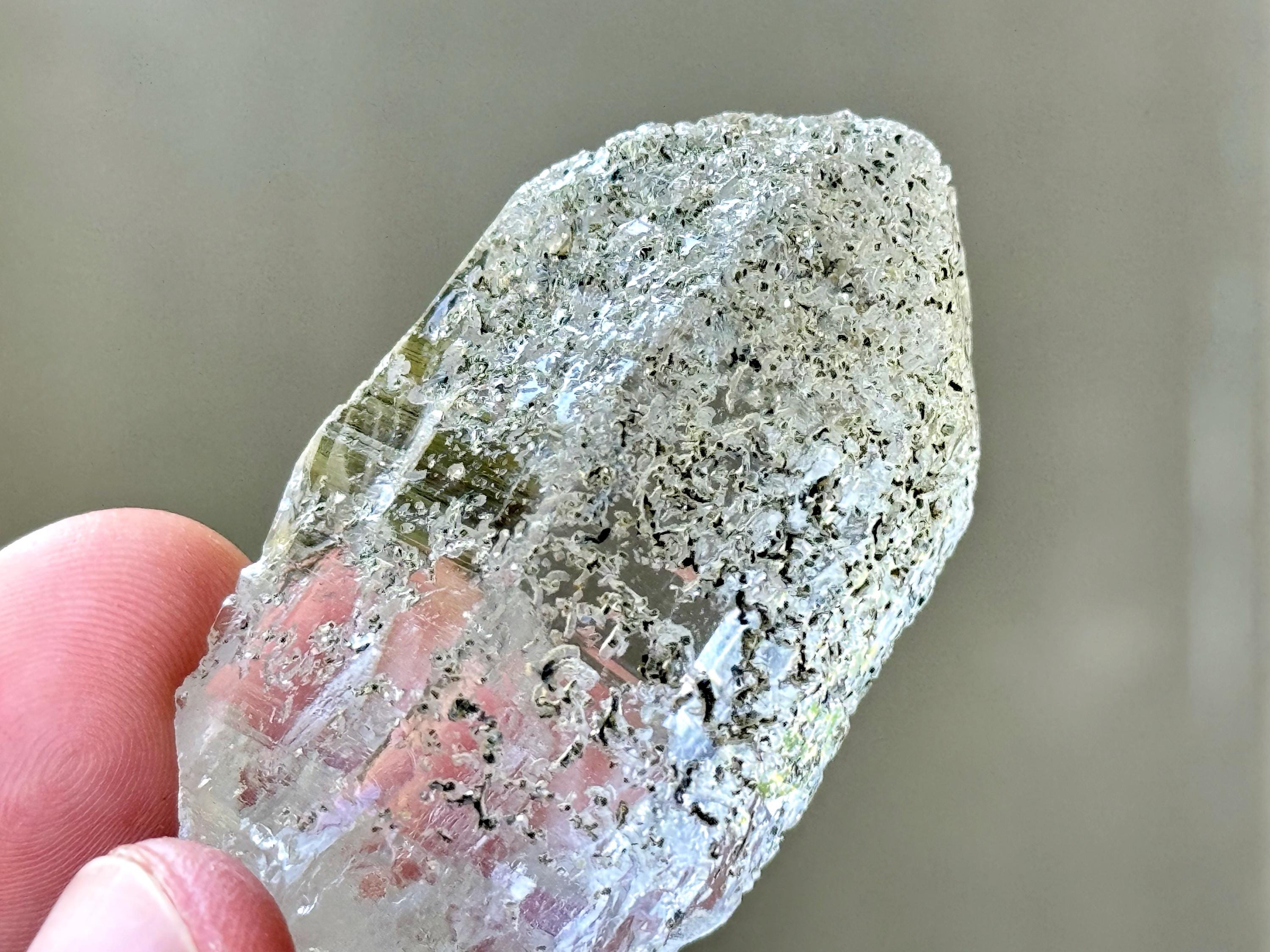 Outstanding, etched textures cover the upper portion and back of this brilliant Mondo Quartz, with its water clear clarity and brilliant luster. Embedded within these etched impressions are hundreds of little mineral inclusions (we're not sure exactly what they are, possible Epidote). Excellent termination as well.