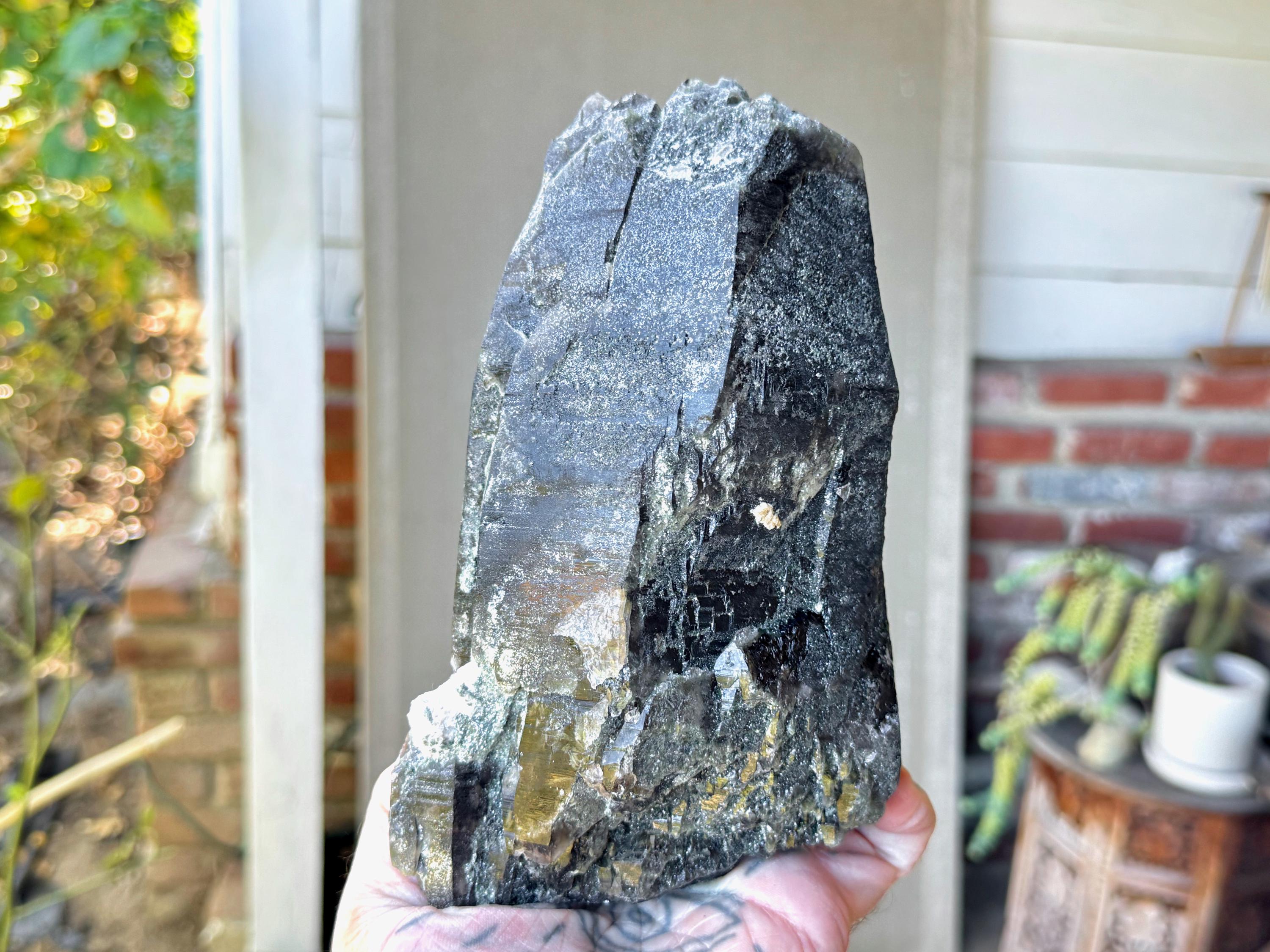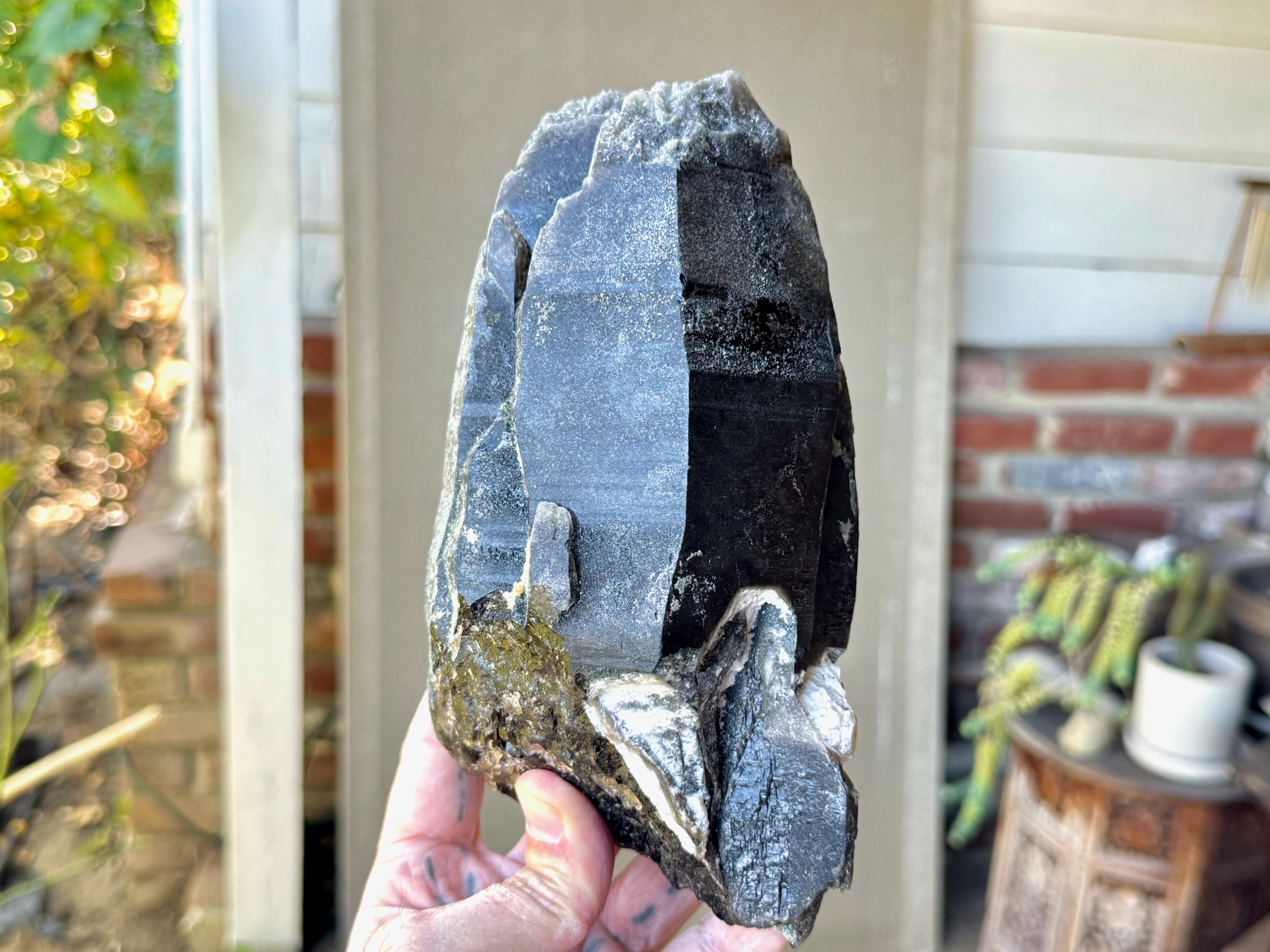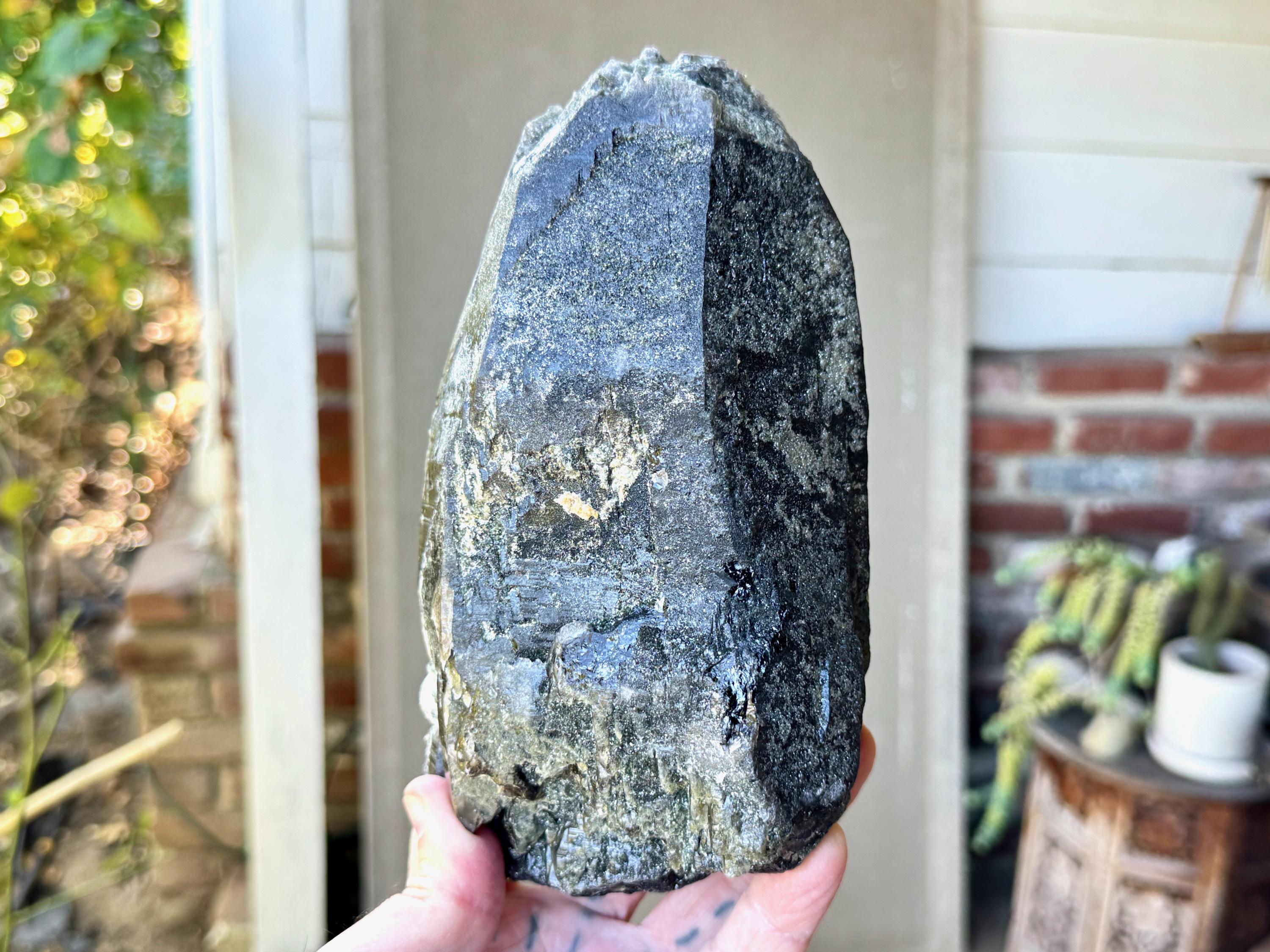 A massive and imposing energetic presence! This is a giant Morion Cathedral Quartz weighing 6 pounds and standing 8" tall, with a deep black complexion.