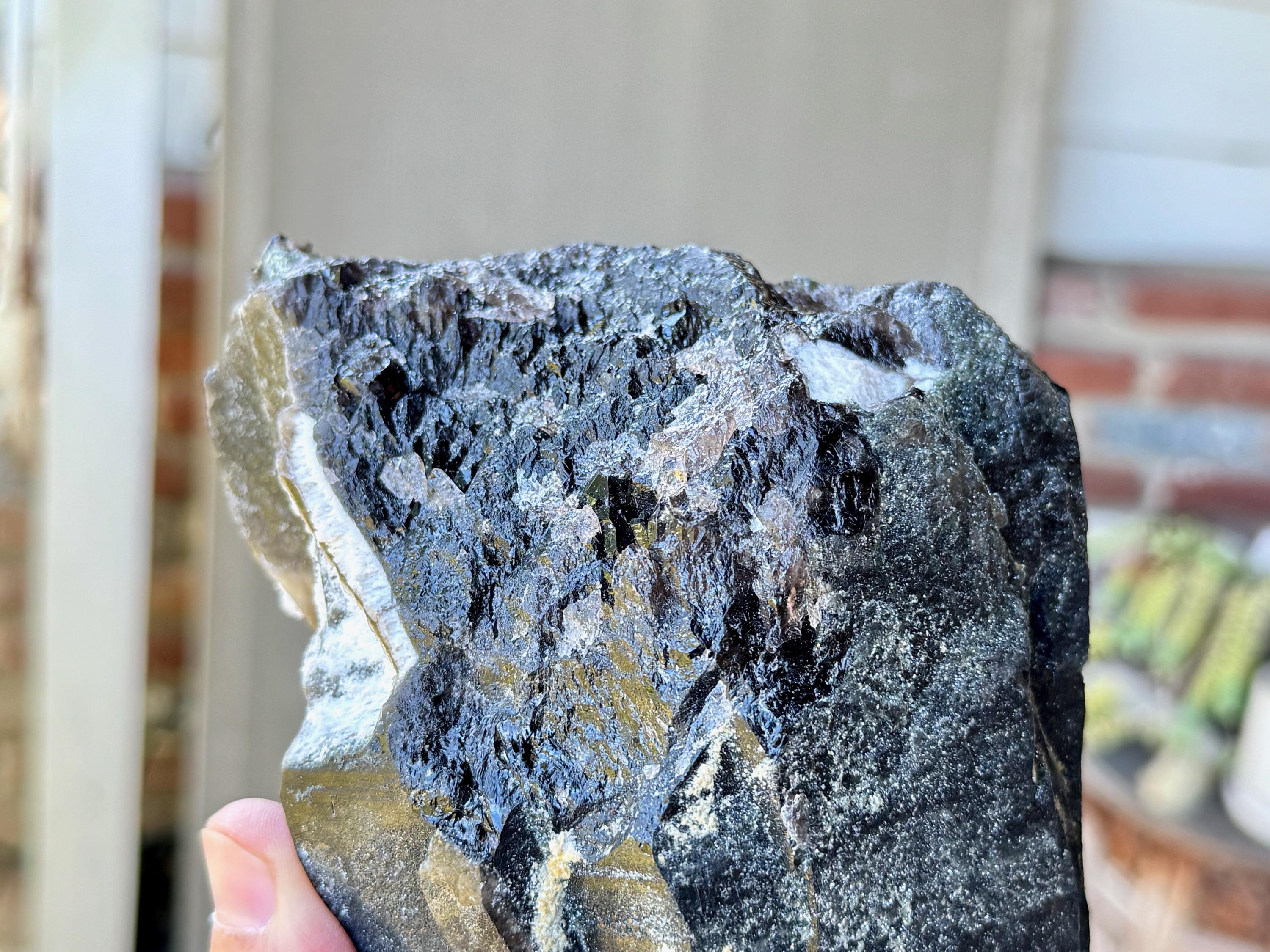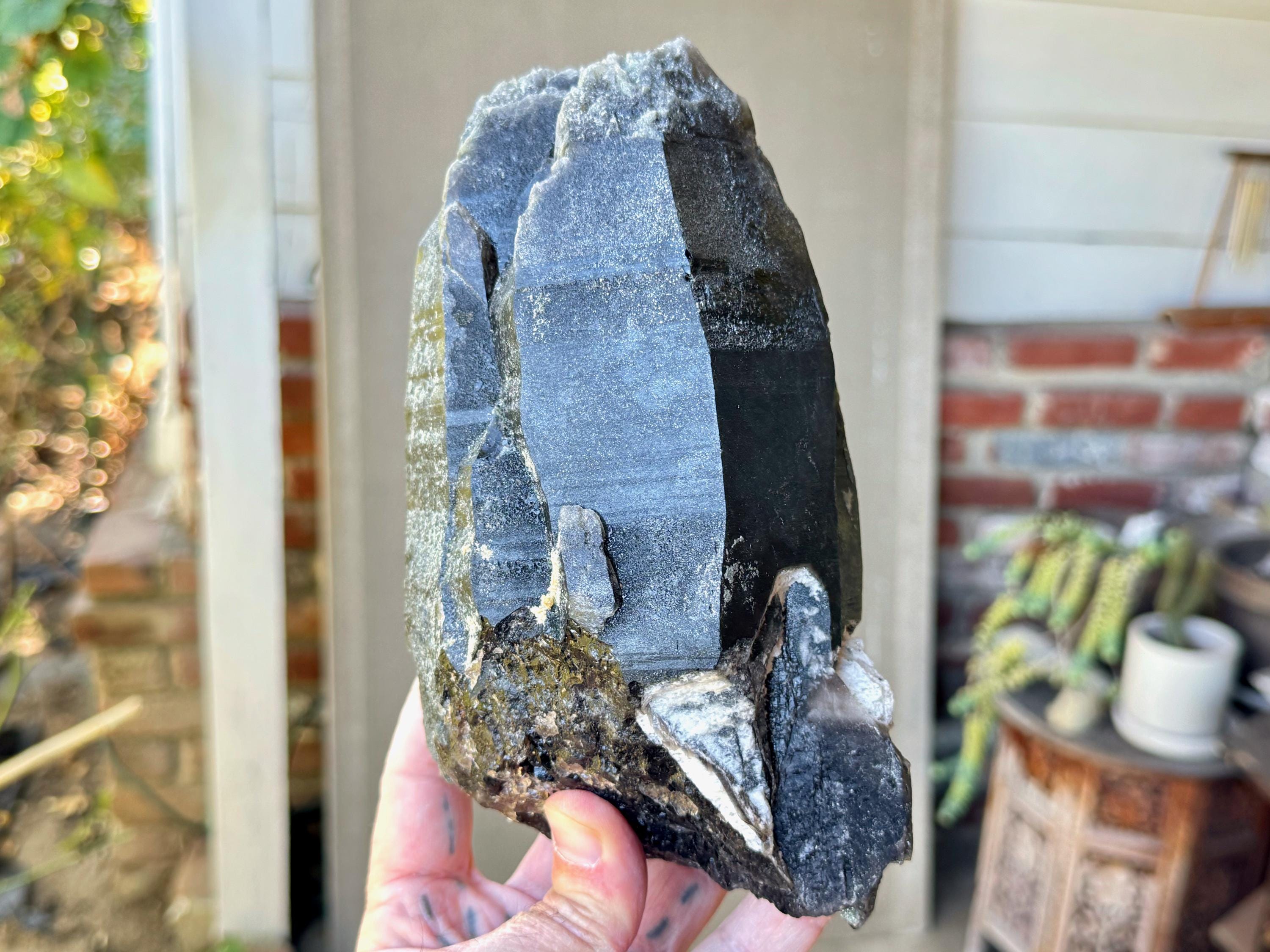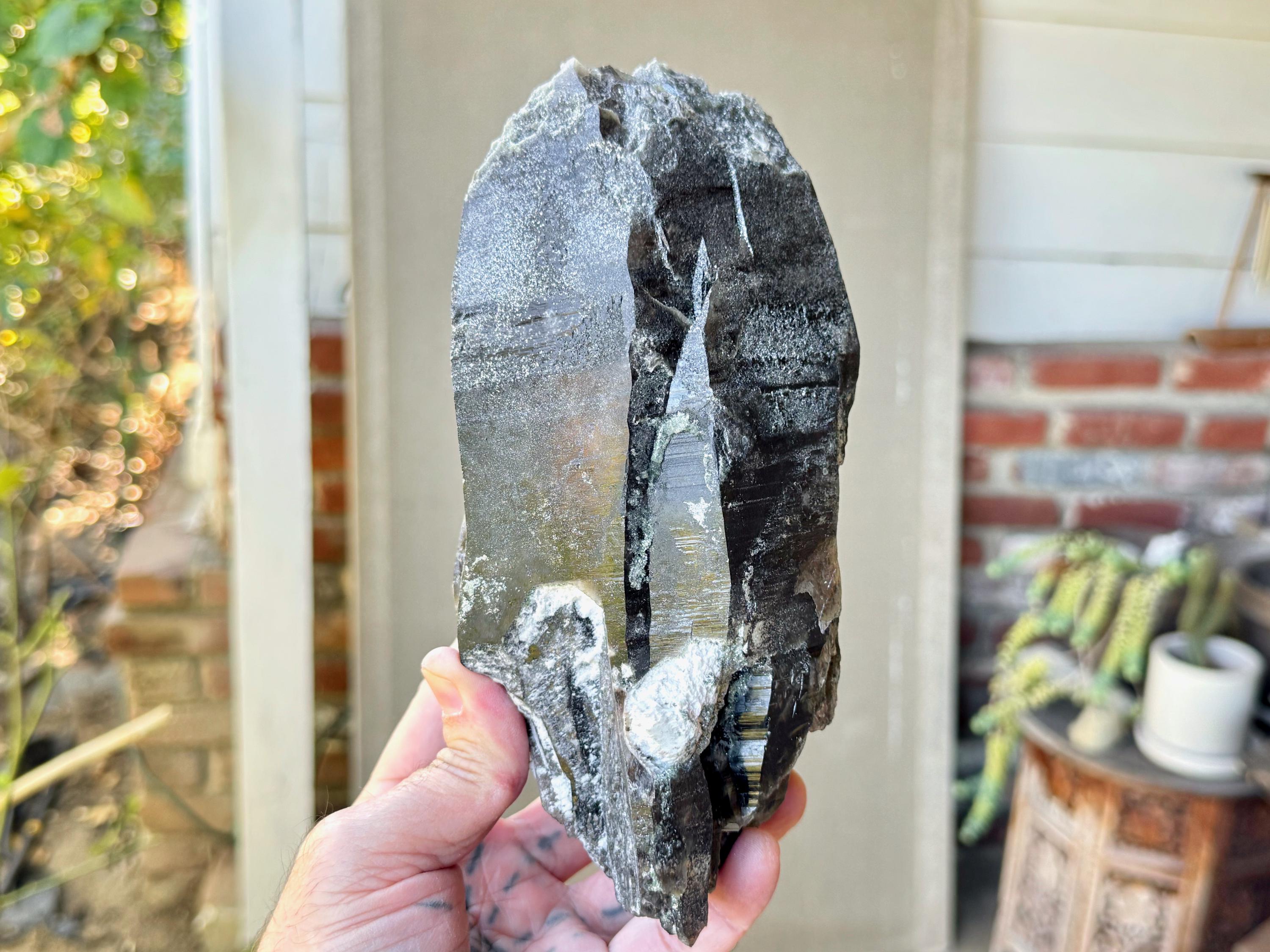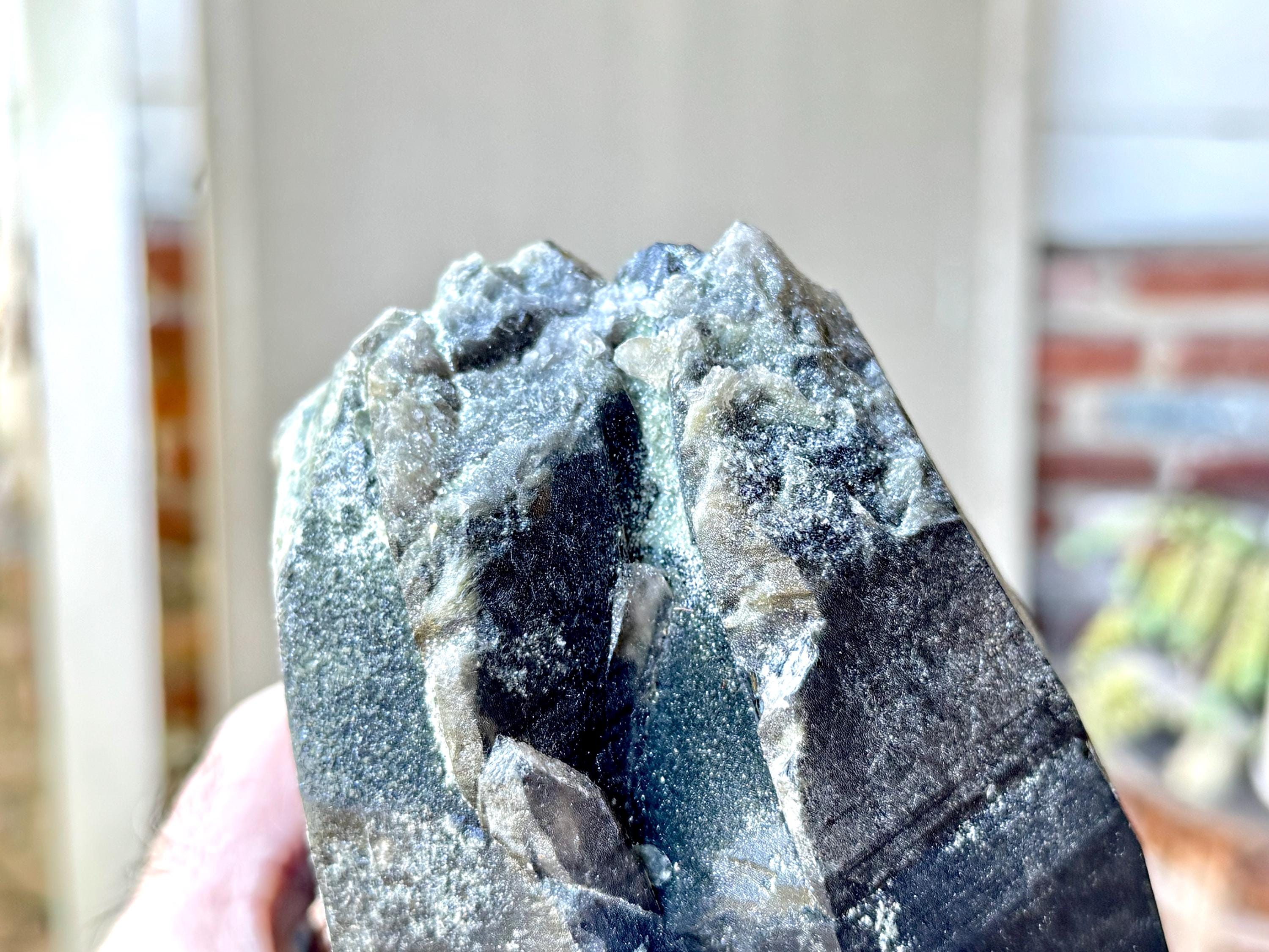 A massive and imposing energetic presence! This is a giant Morion Cathedral Quartz weighing 6 pounds and standing 8" tall, with a deep black complexion.