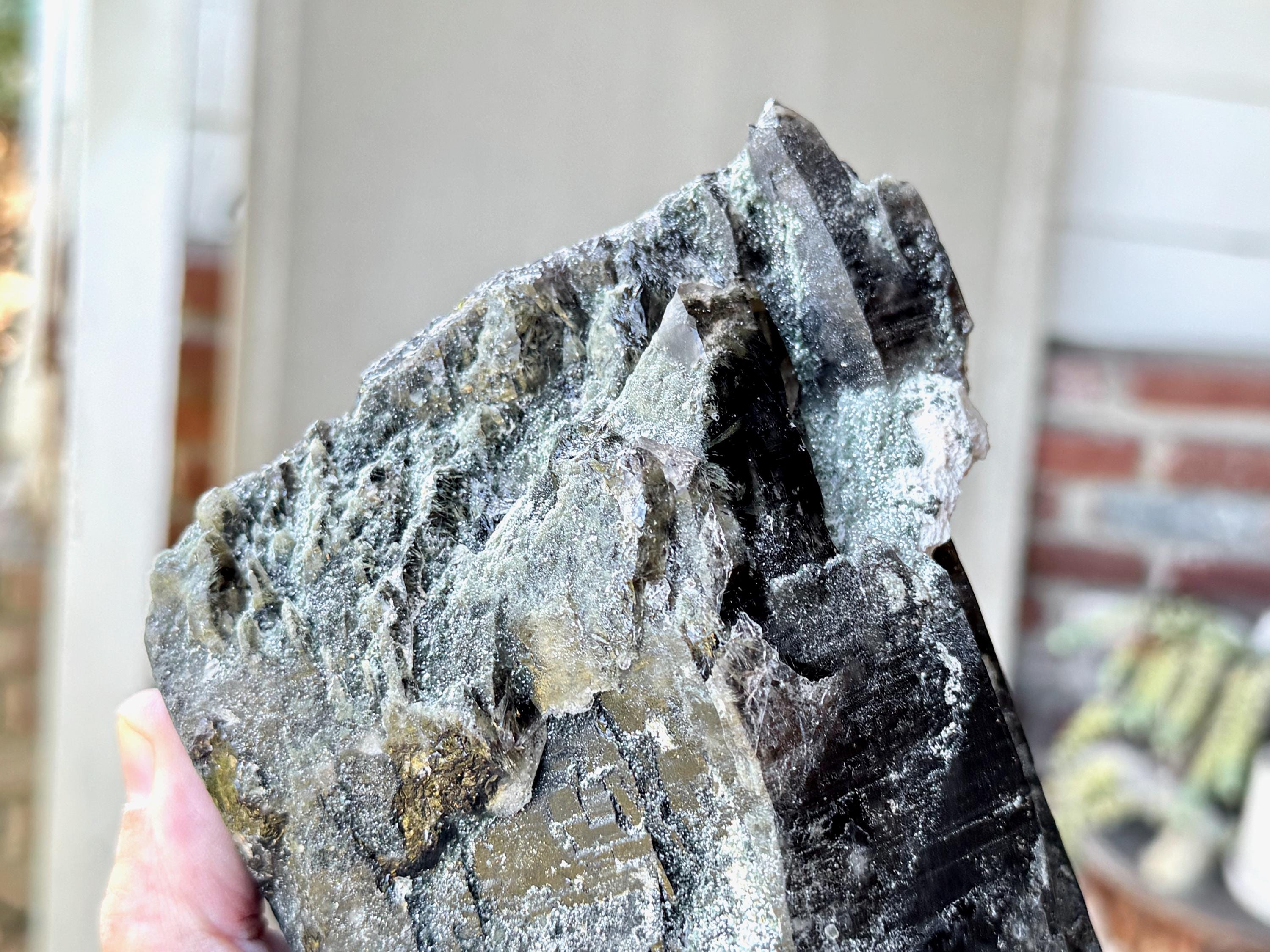 This crystal is entirely natural (i.e. not heat-treated or irradiated) and features wonderful broad sides with various cathedral formations. This piece has a mild luster, but a bit more of a "matte" complexion due to the various minerals that are "frosted" on the exterior in many places. We see a very fine silvery "dust" on the exterior which may be Pyrite or it may be Mica. There's also a bit of white Feldspar embedded in the base, as well as a waxy, dull green inclusion that we see most prominently growing over the top portion (photo 10).