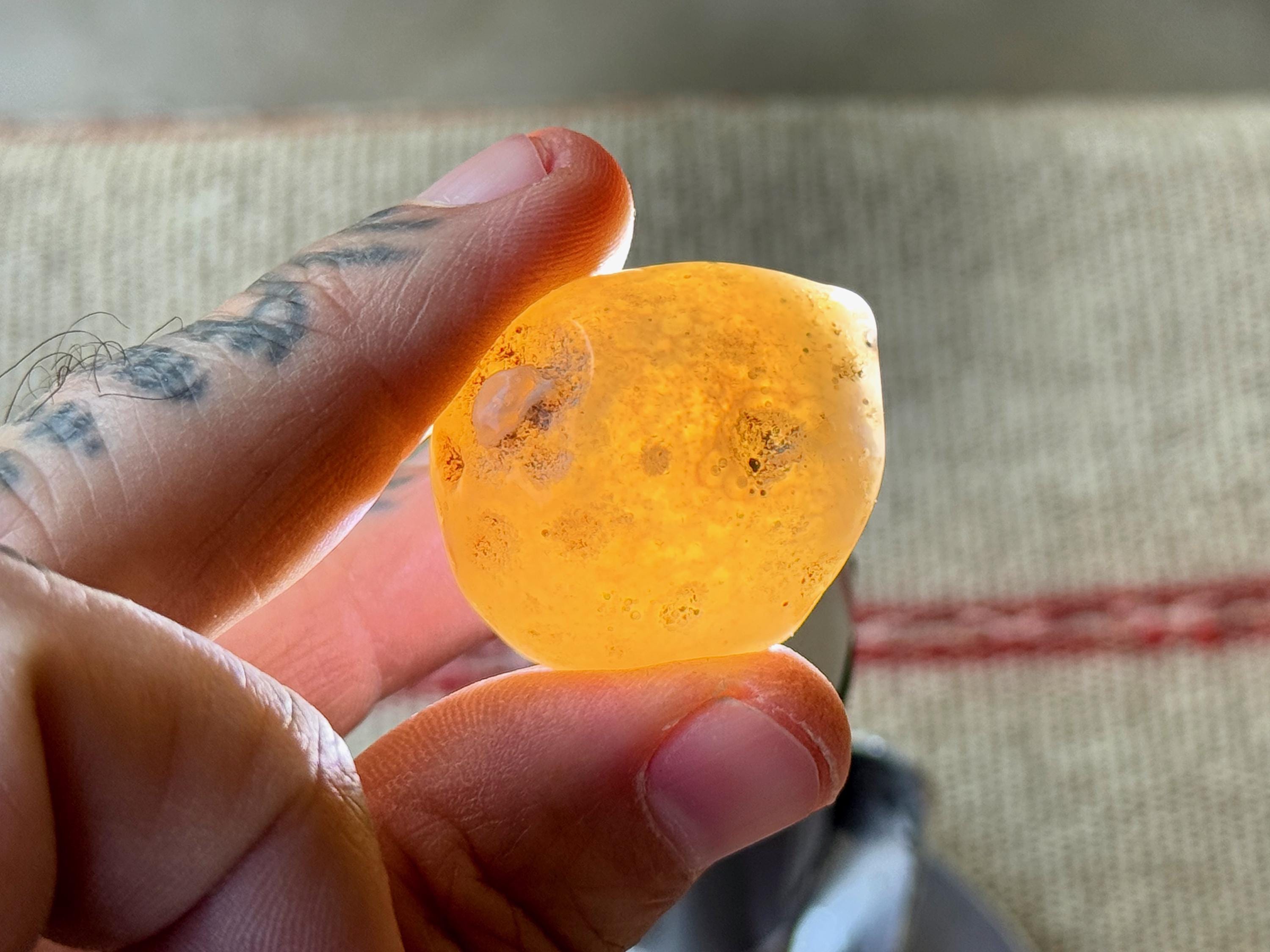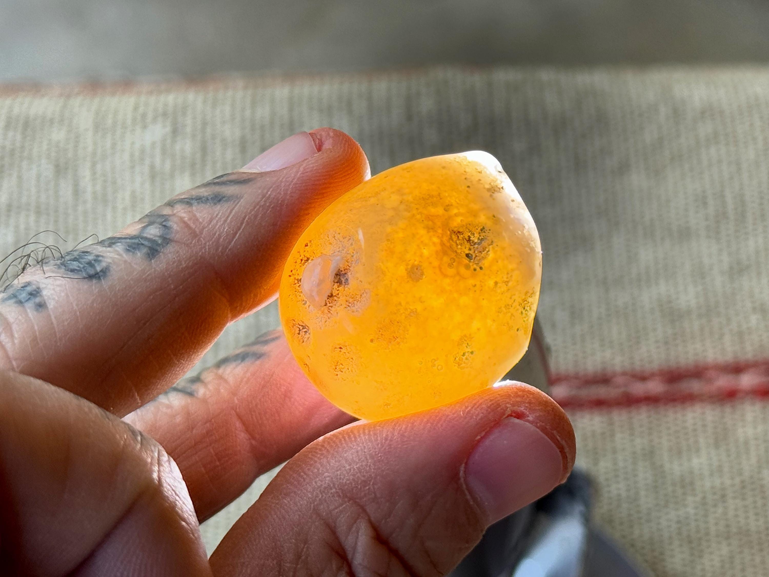 This aquatic Agate has AMAZING translucency when backlit which makes it easy to see the water swishing inside. The video shows this and it will be much more evident in person. We've included a few photos of the stone backlit as well (Photos 3-4).