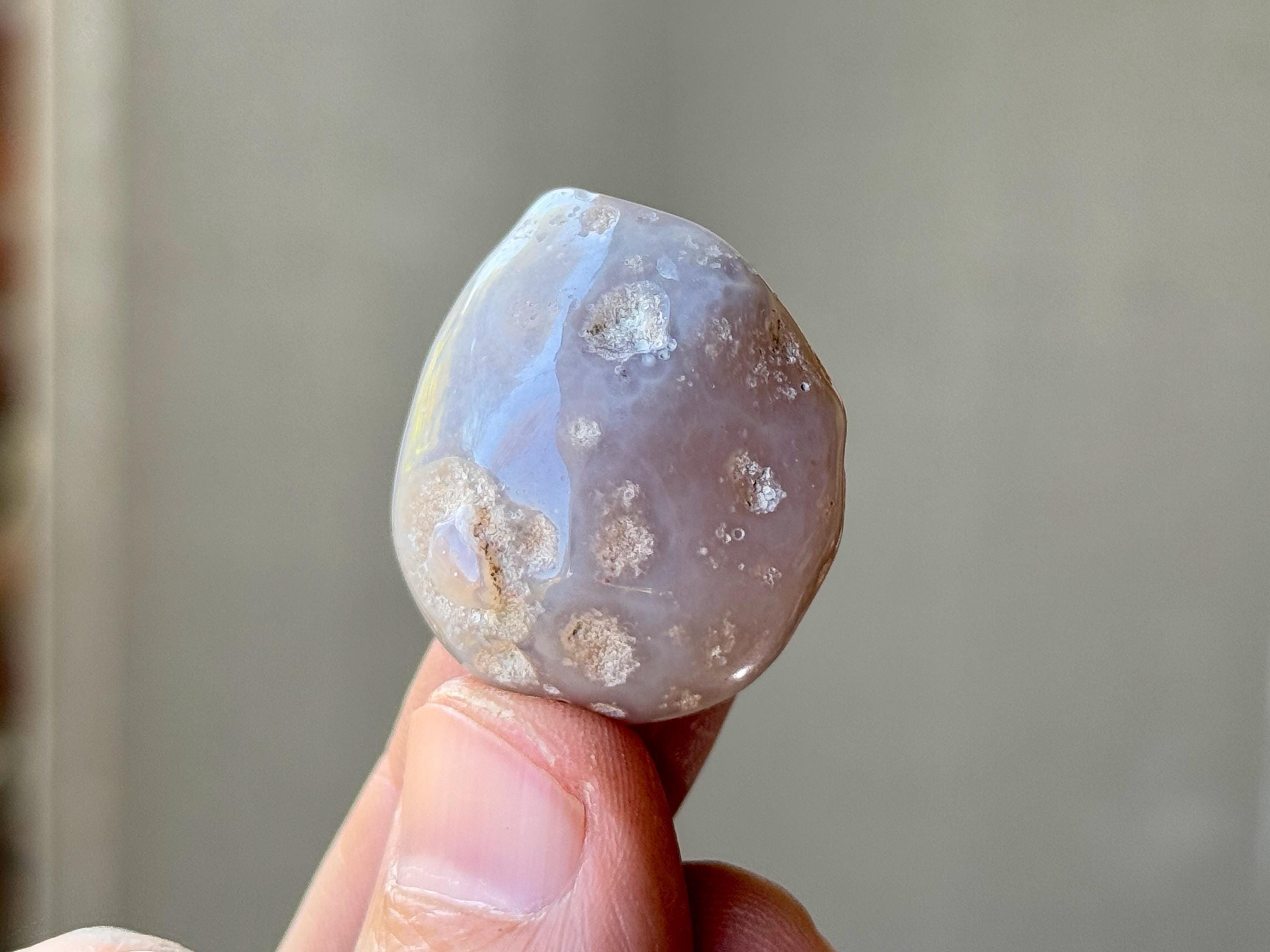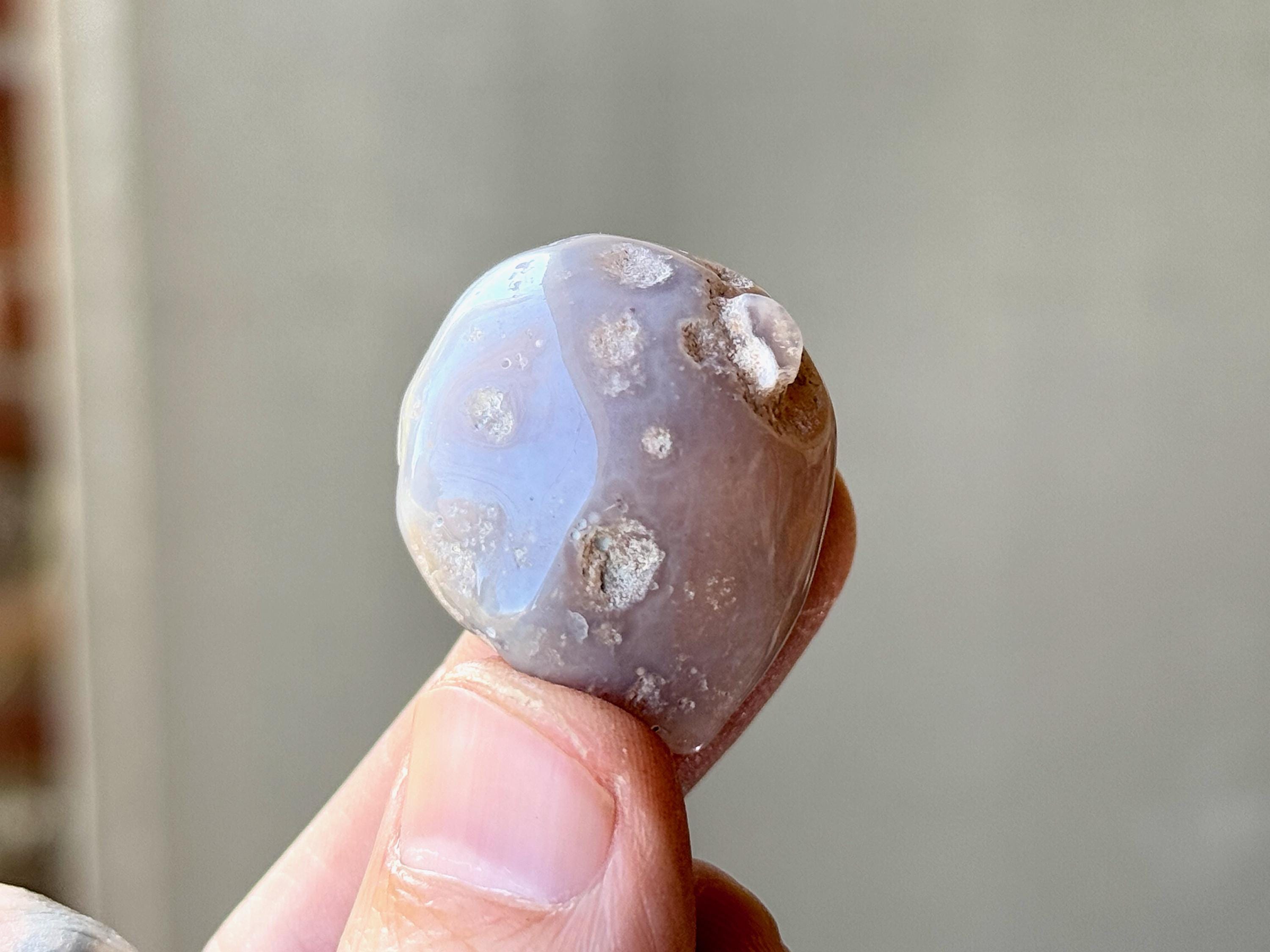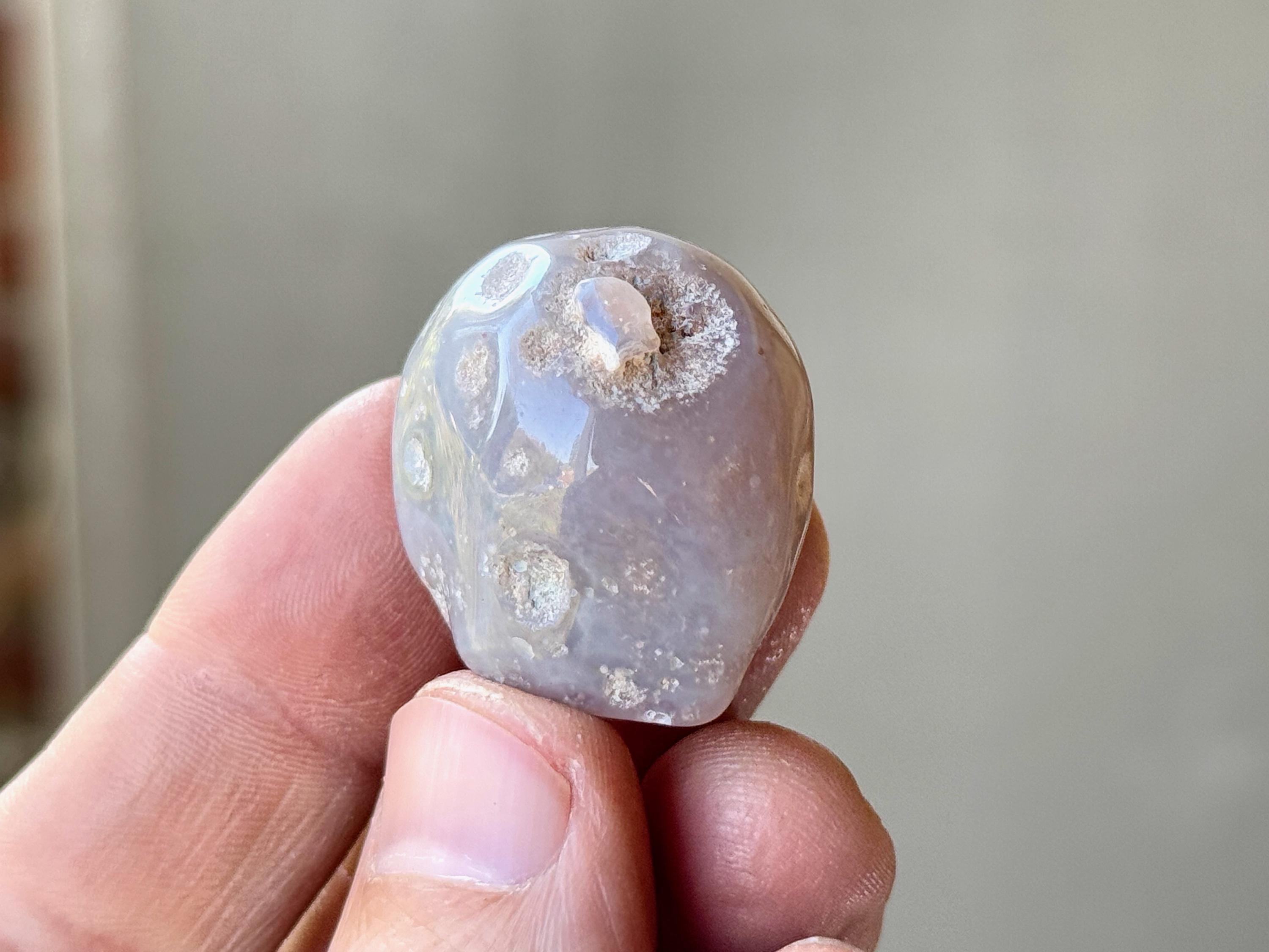A spectacular Enhydro Agate from this collection! This stone has a lustrous complexion, with a rounded formation, and a muted blue-gray hue with pitted markings. Of course what is most special about this piece is that it is absolutely FILLED with ancient water.