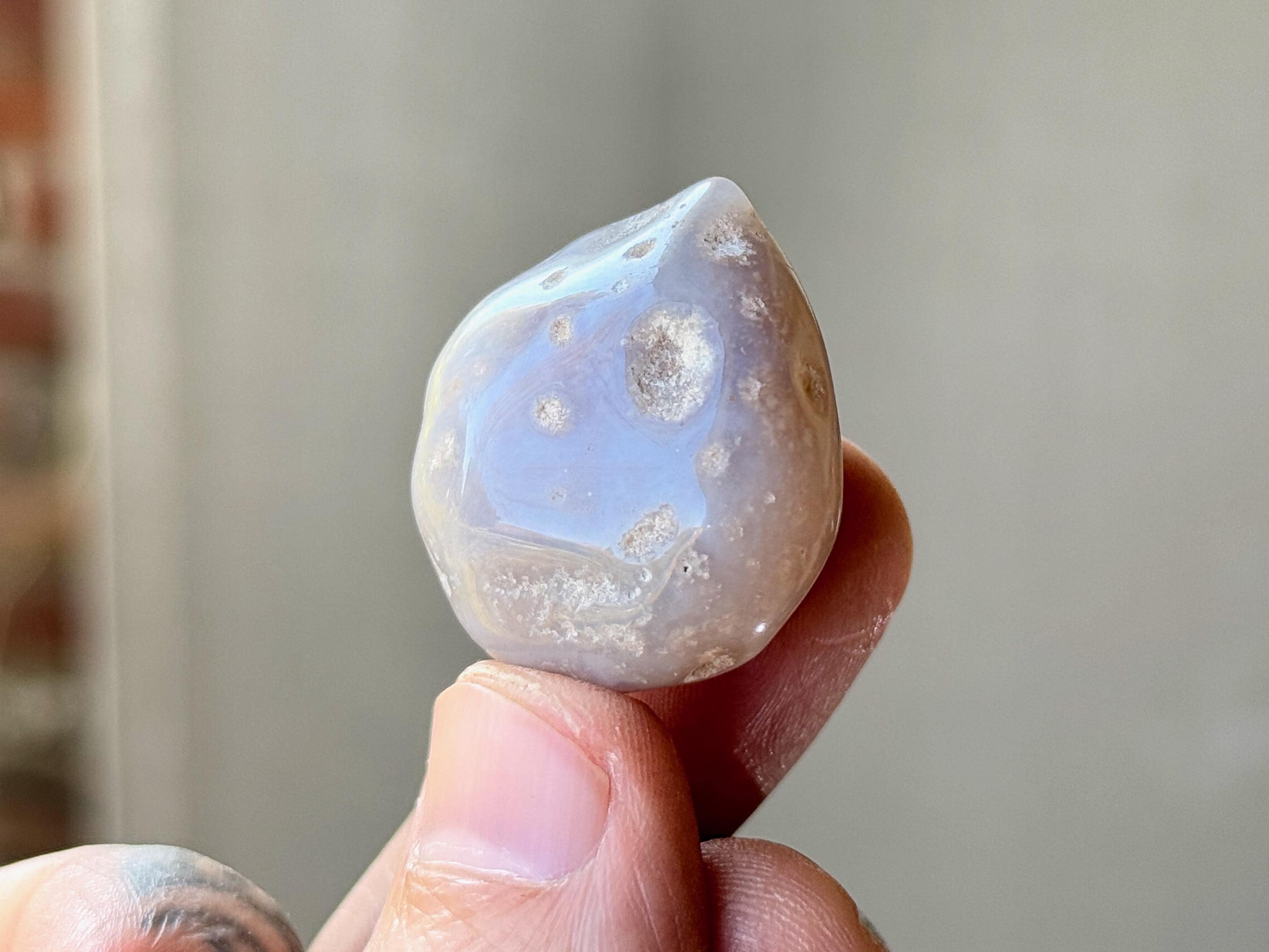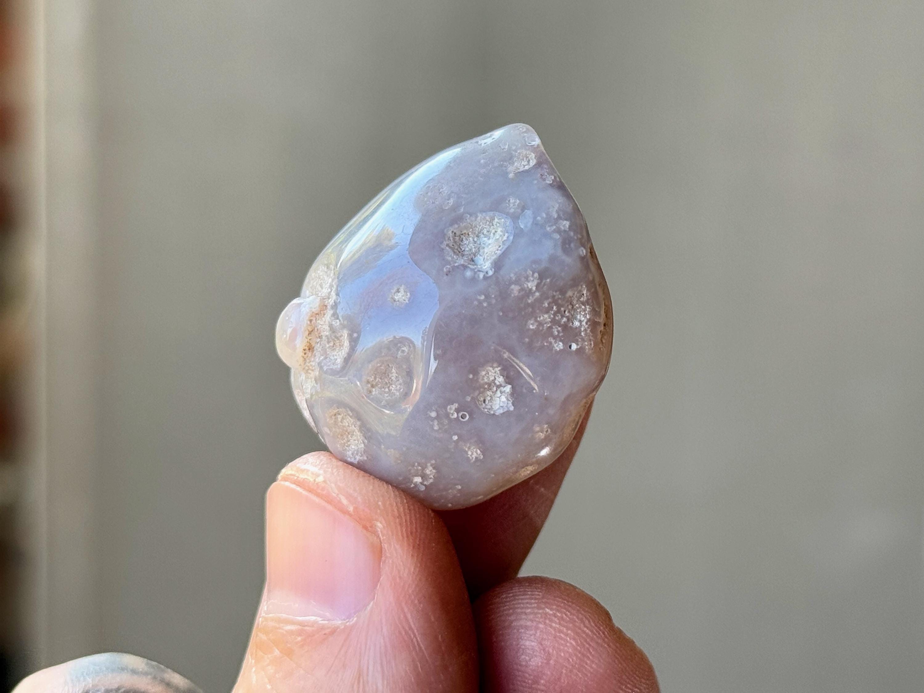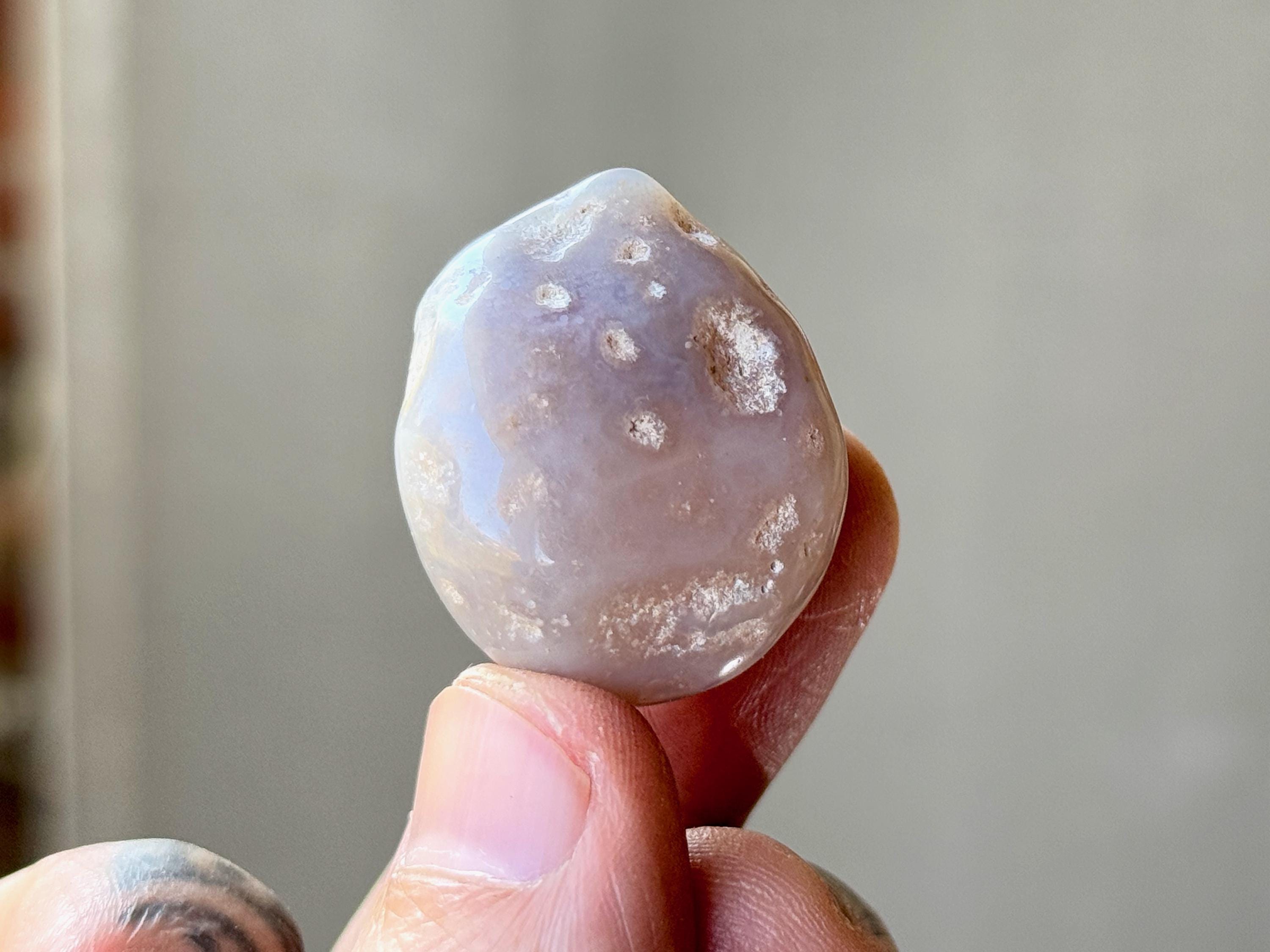 A spectacular Enhydro Agate from this collection! This stone has a lustrous complexion, with a rounded formation, and a muted blue-gray hue with pitted markings. Of course what is most special about this piece is that it is absolutely FILLED with ancient water.