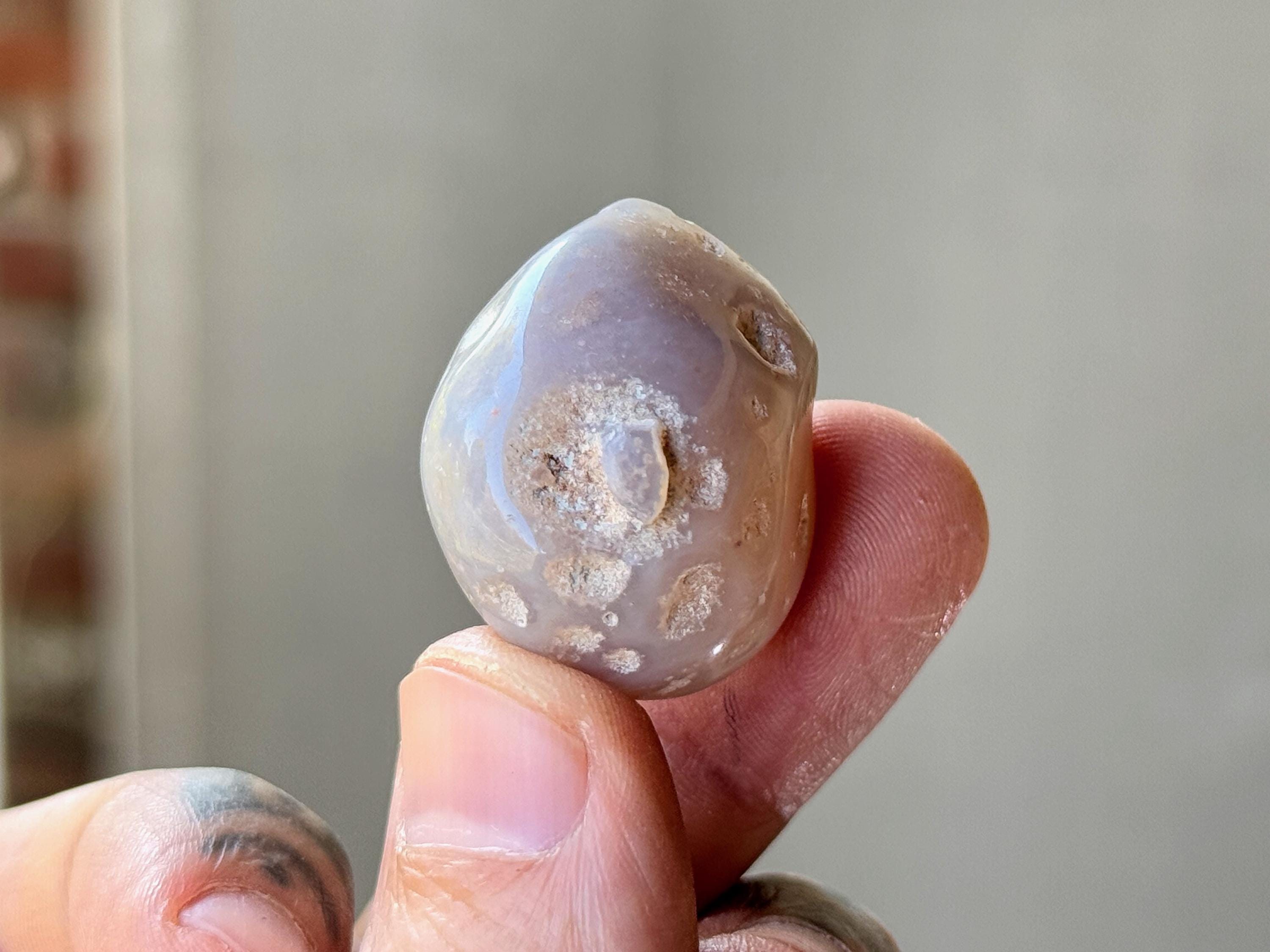 The term for this natural phenomenon is "Enhydro" and it occurs when water is trapped inside of an Agate (or crystal) during its millions-of-years development. These Agates have been polished so that one can see the water moving within when backlit (with a flashlight, for instance). In many cases, you can actually hear the water swishing if you shake it next to your ear. This is an incredibly rare phenomenon, as most Enhydro crystals contain only the smallest drop of water. These very special stones bring a balance between the elements of Earth and Water, increased spiritual receptivity and balance.