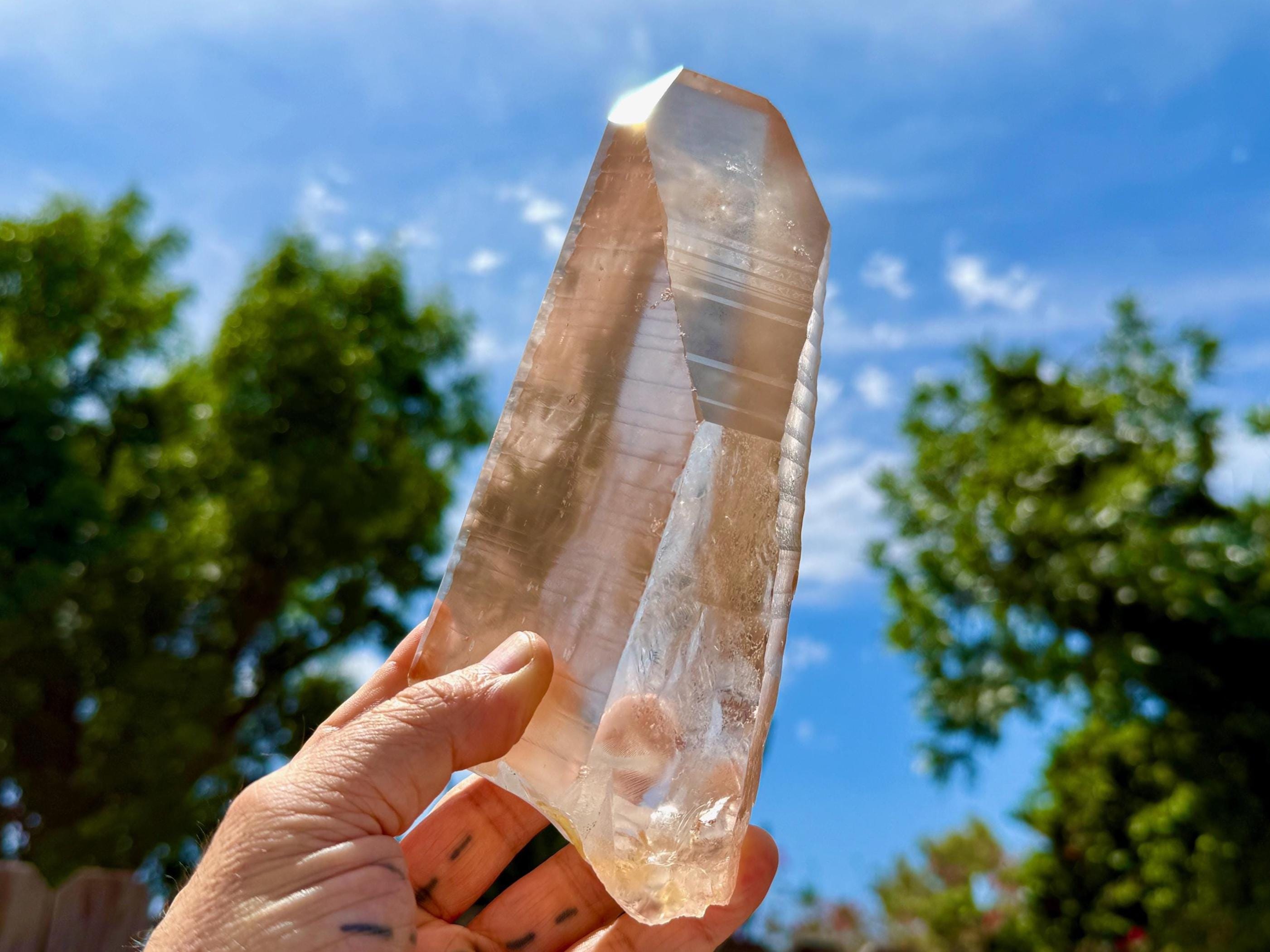 Lemurian Quartz resonates with all chakras, but primarily the Crown Chakra. It has one of the highest vibrations of any crystal and is a beautiful companion for meditation and to realign energies in the body. It can assist in clearing blockages in one's energy field and/or chakras, dispelling heavy energies from the body. If there is stagnant energy in the body, it can help to increase Prana (life force) energy to get things moving properly again. Meditating with Lemurian Crystals can allow us to connect with higher-dimensional spirit guides and connect to Divine realms, as well as to decode the information they contain within.