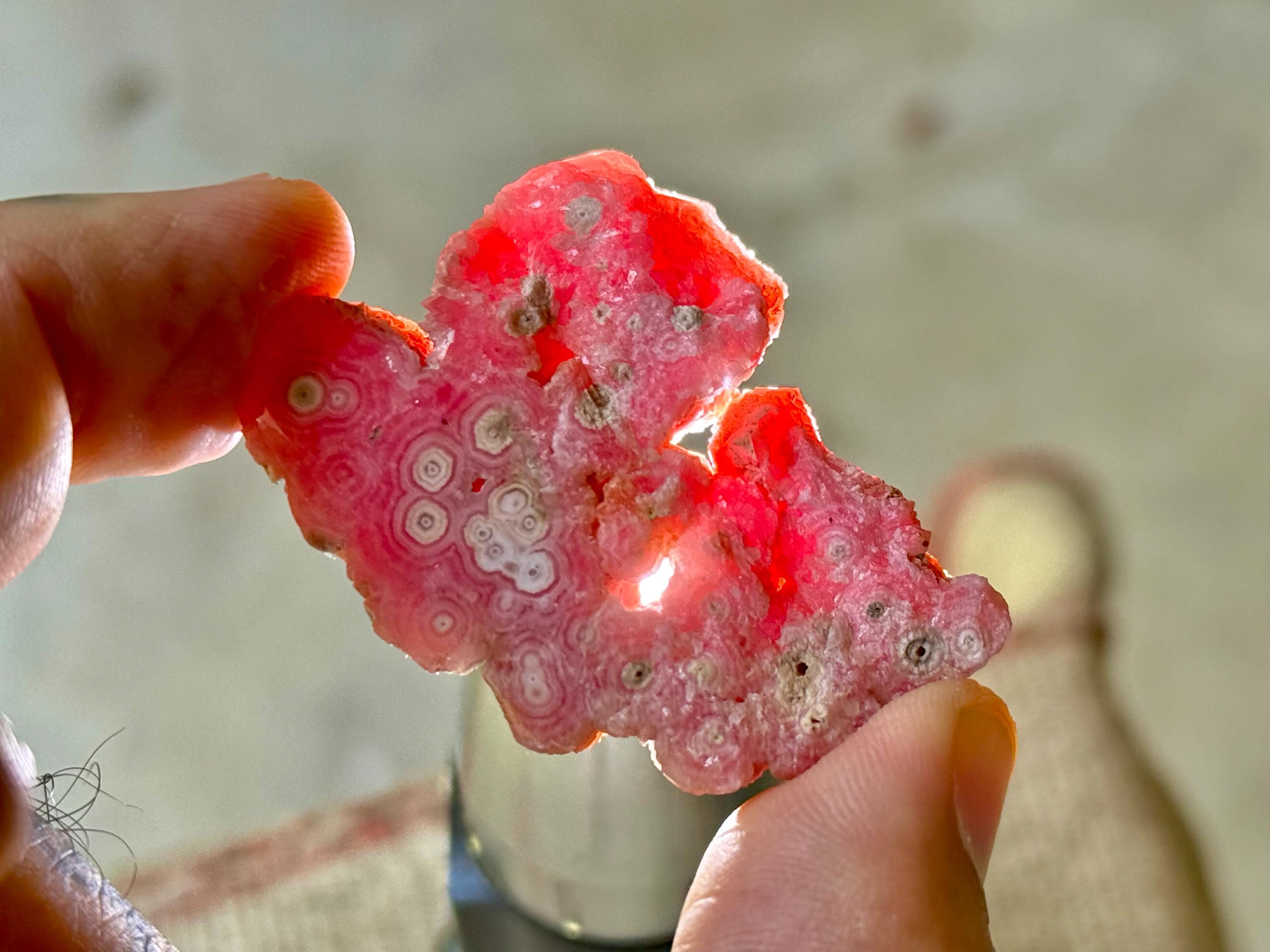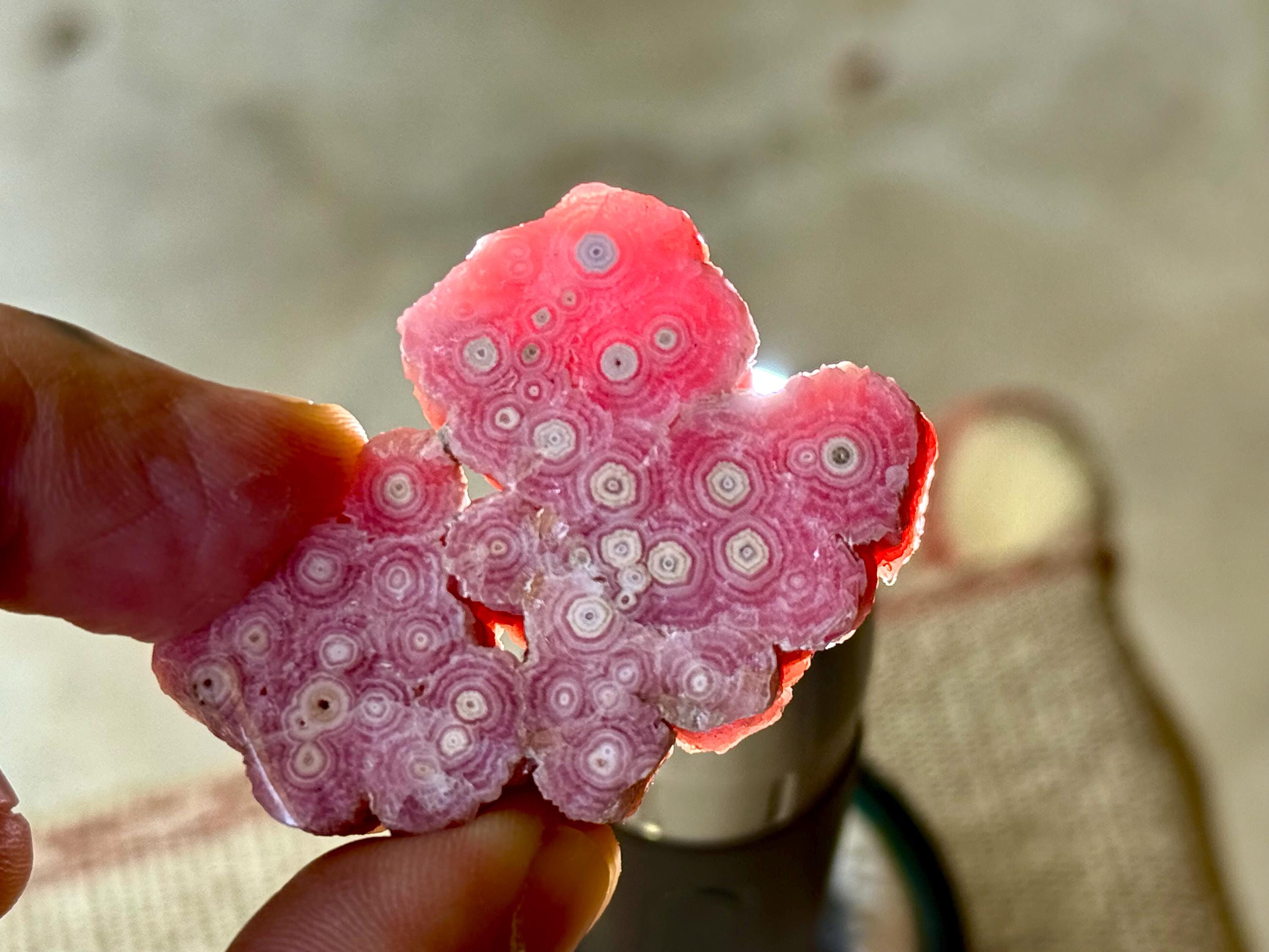 This exquisite Rhodocrosite Stalactite slice comes from an old find in the famed Capillitas Mine, Andalgalá Dept., Catamarca Province, Argentina. This is one of the only localities in the world that produces these extraordinarily unique crystals, which grow in Manganese rich cave environments.
