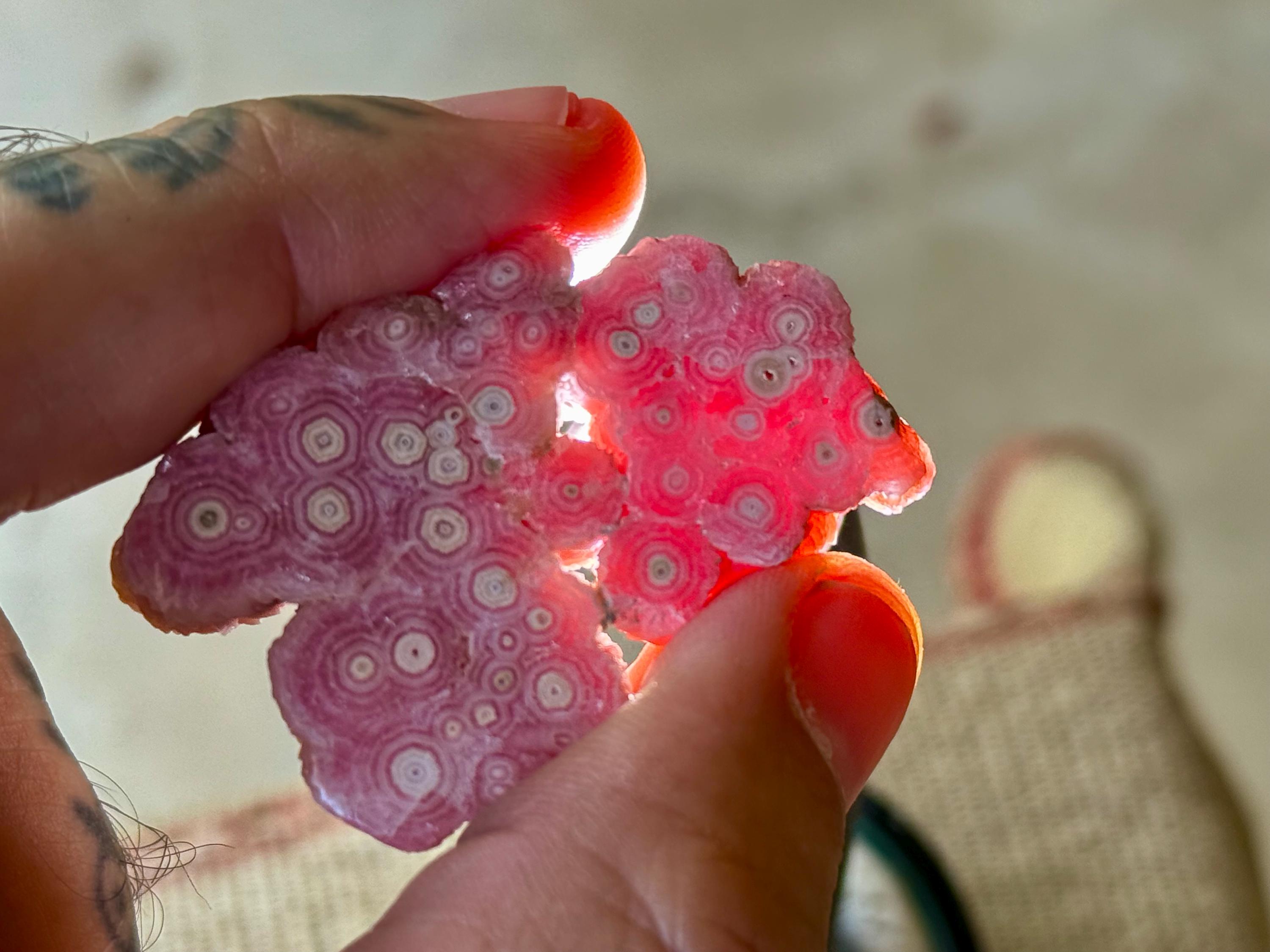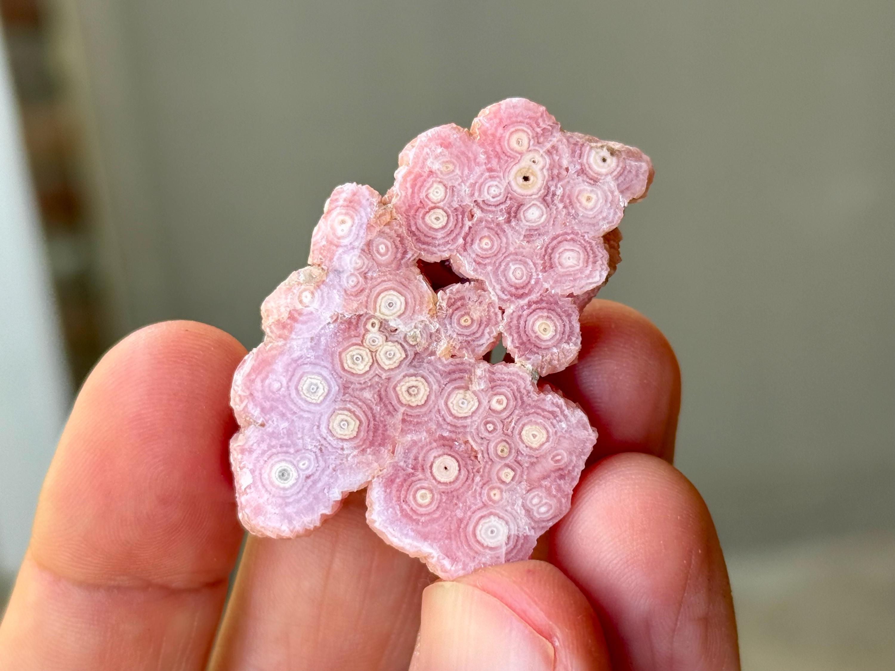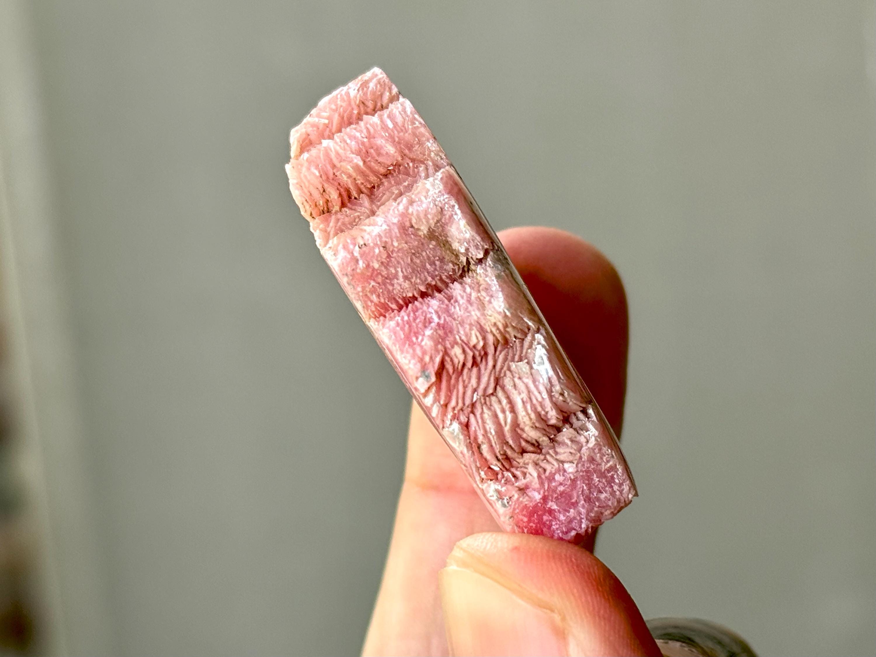 Gorgeous patterning to this stunning Rhodochrosite Stalactite slice with a bubble-gum pink color and wonderful formation. This crystal has been polished on its front side and on a portion of its backside, while the edges and a portion of the bottom in back have been left totally natural.