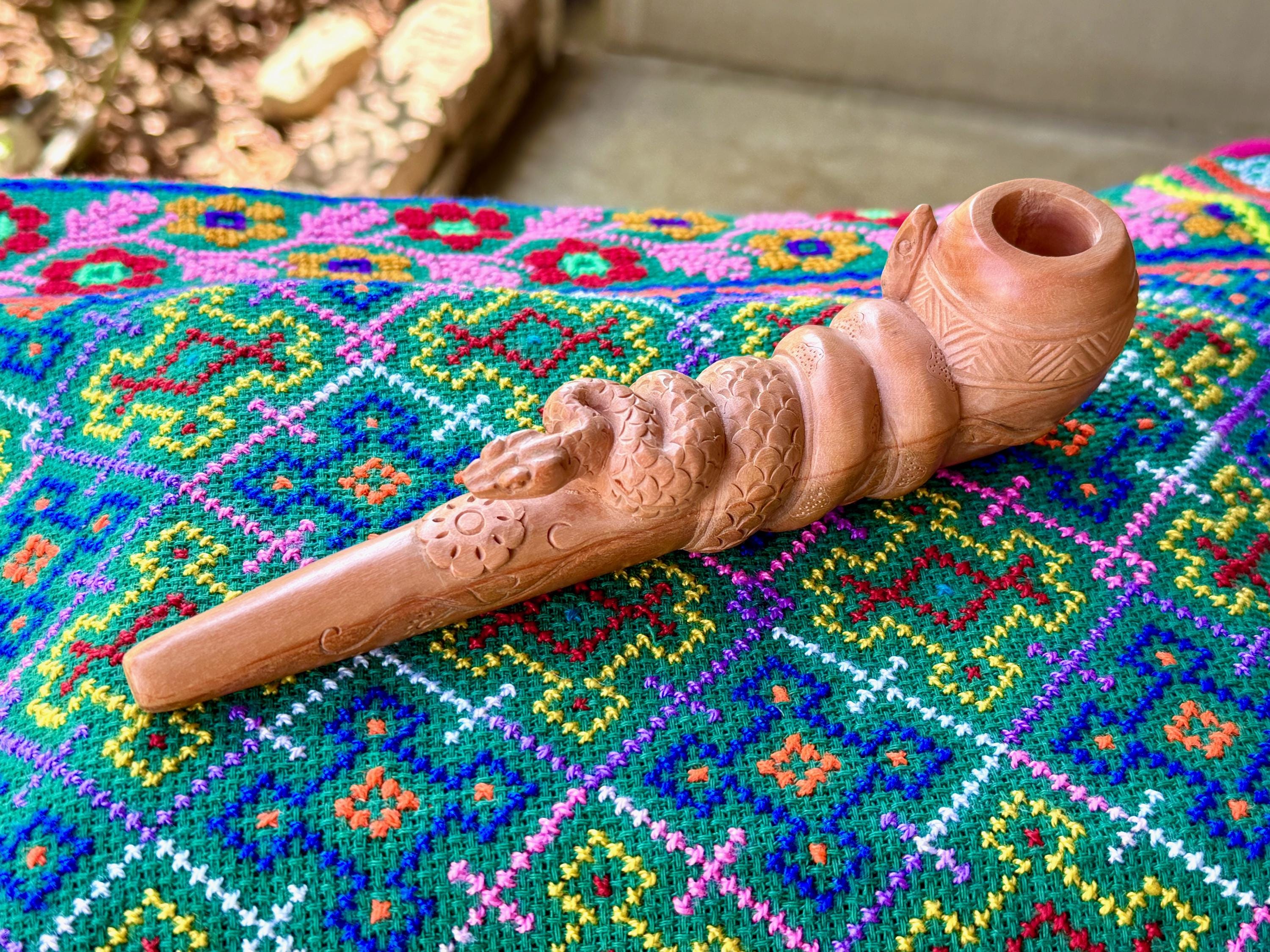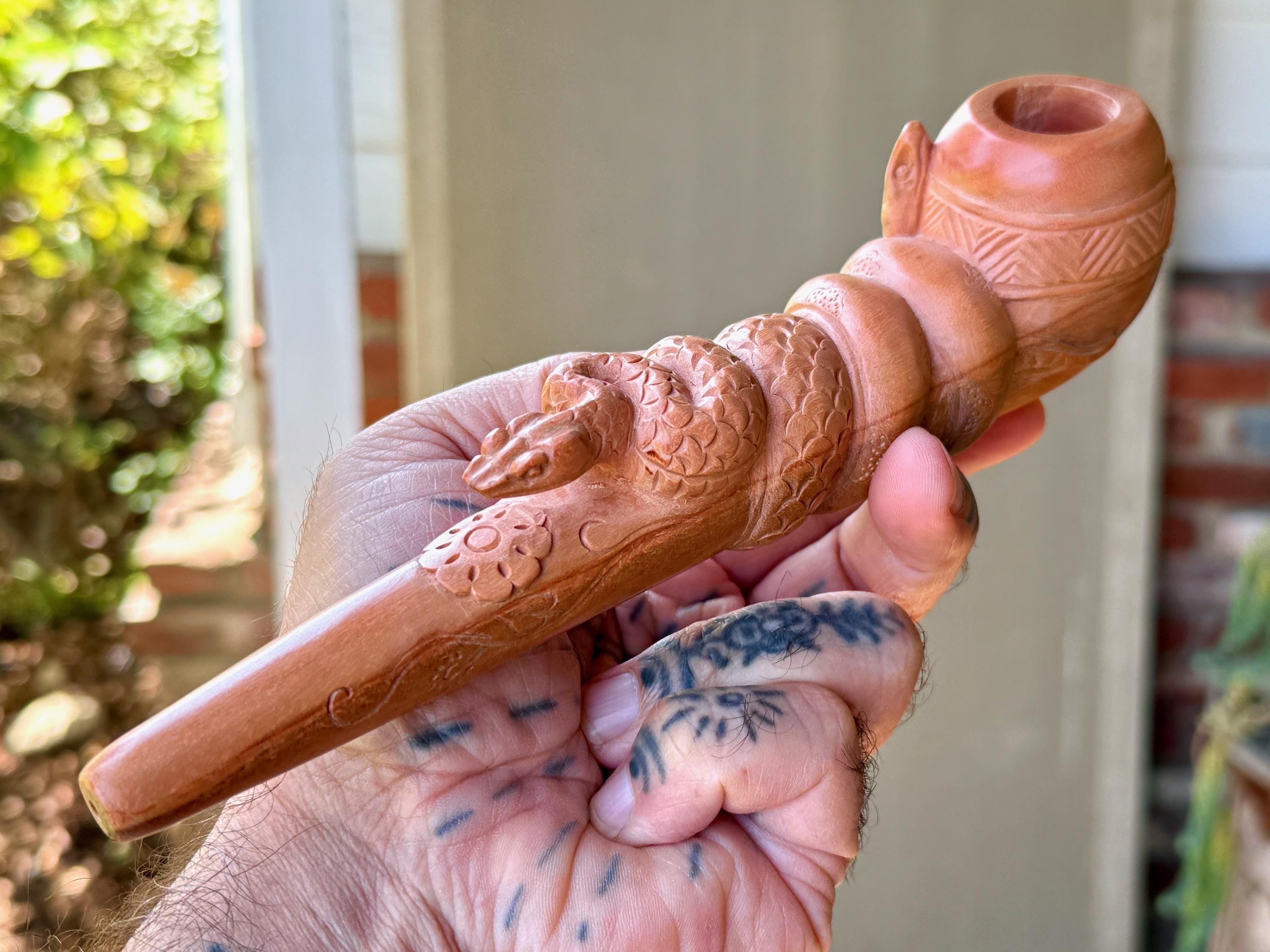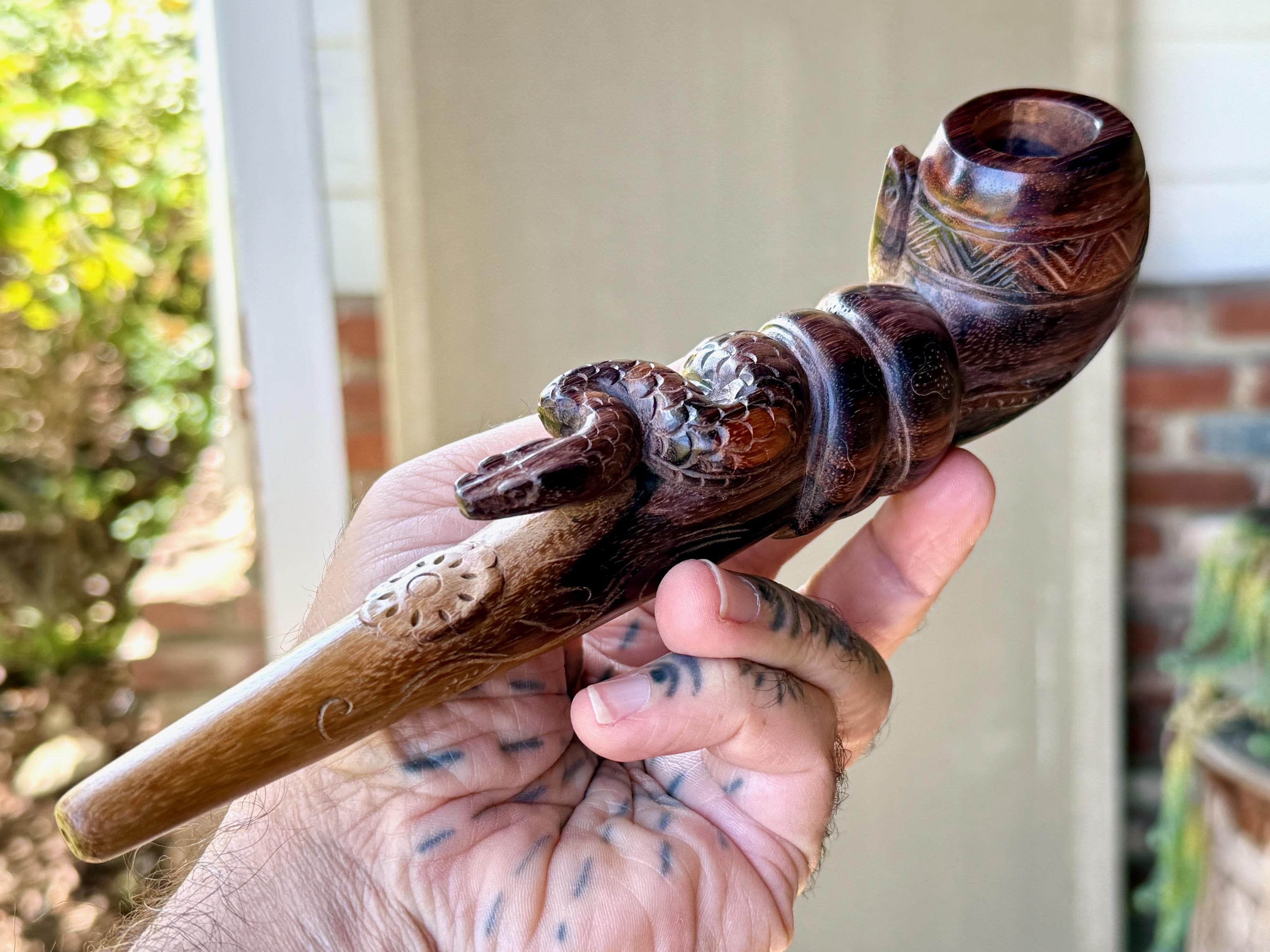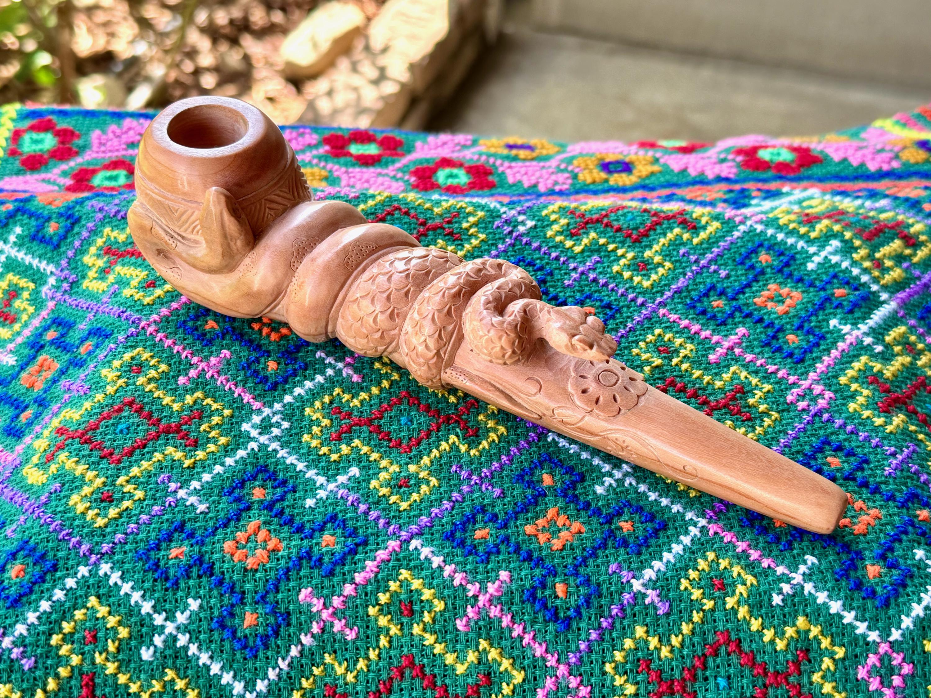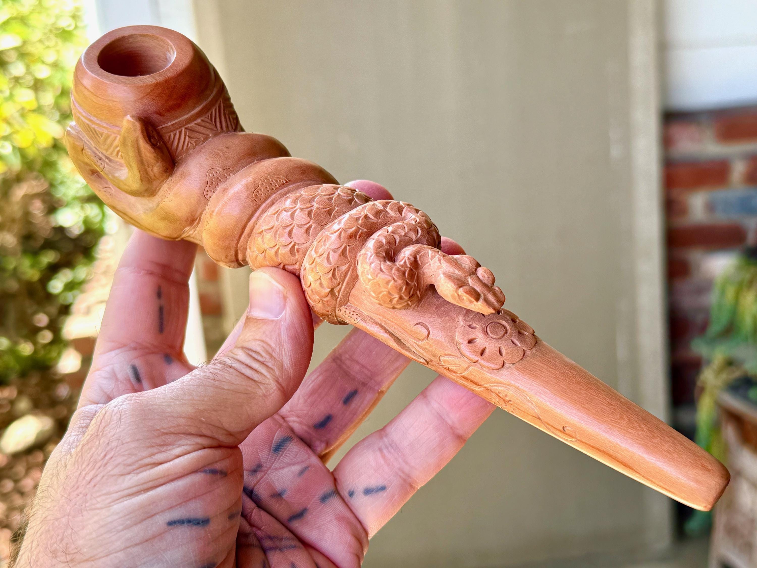 Exceptional beauty and elegance to these stunning tobacco pipes, with the protective serpent wrapped around them. These pipes are hand carved from solid pieces of native hardwood and display a master level of elegance and craftsmanship, with sleek lines and marvelous attention to detail.