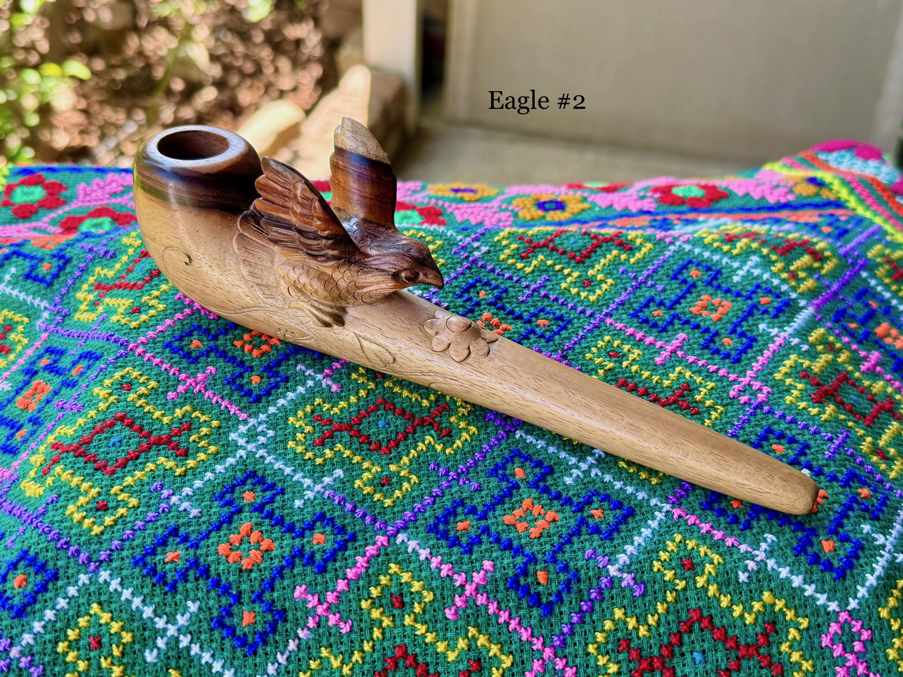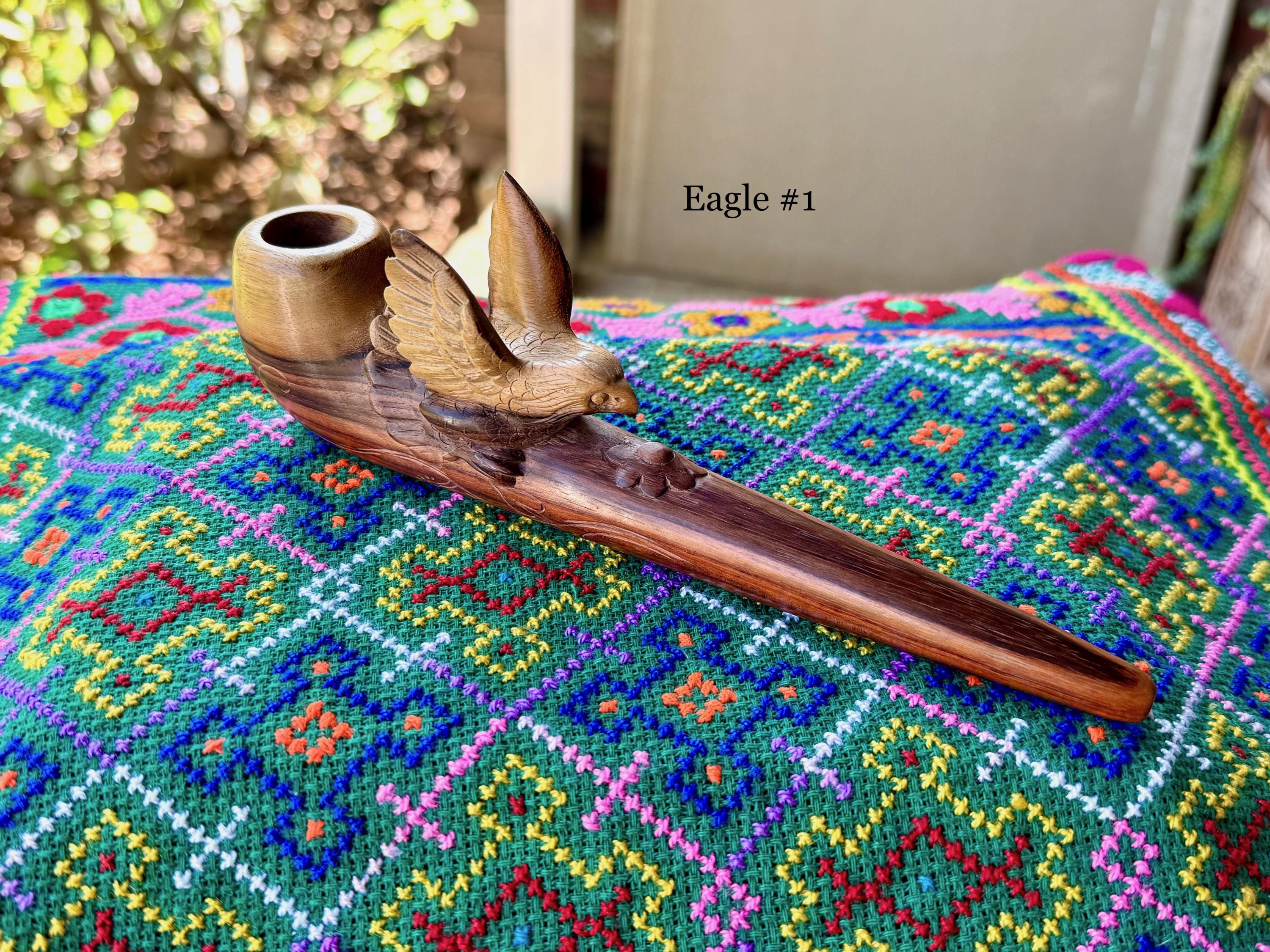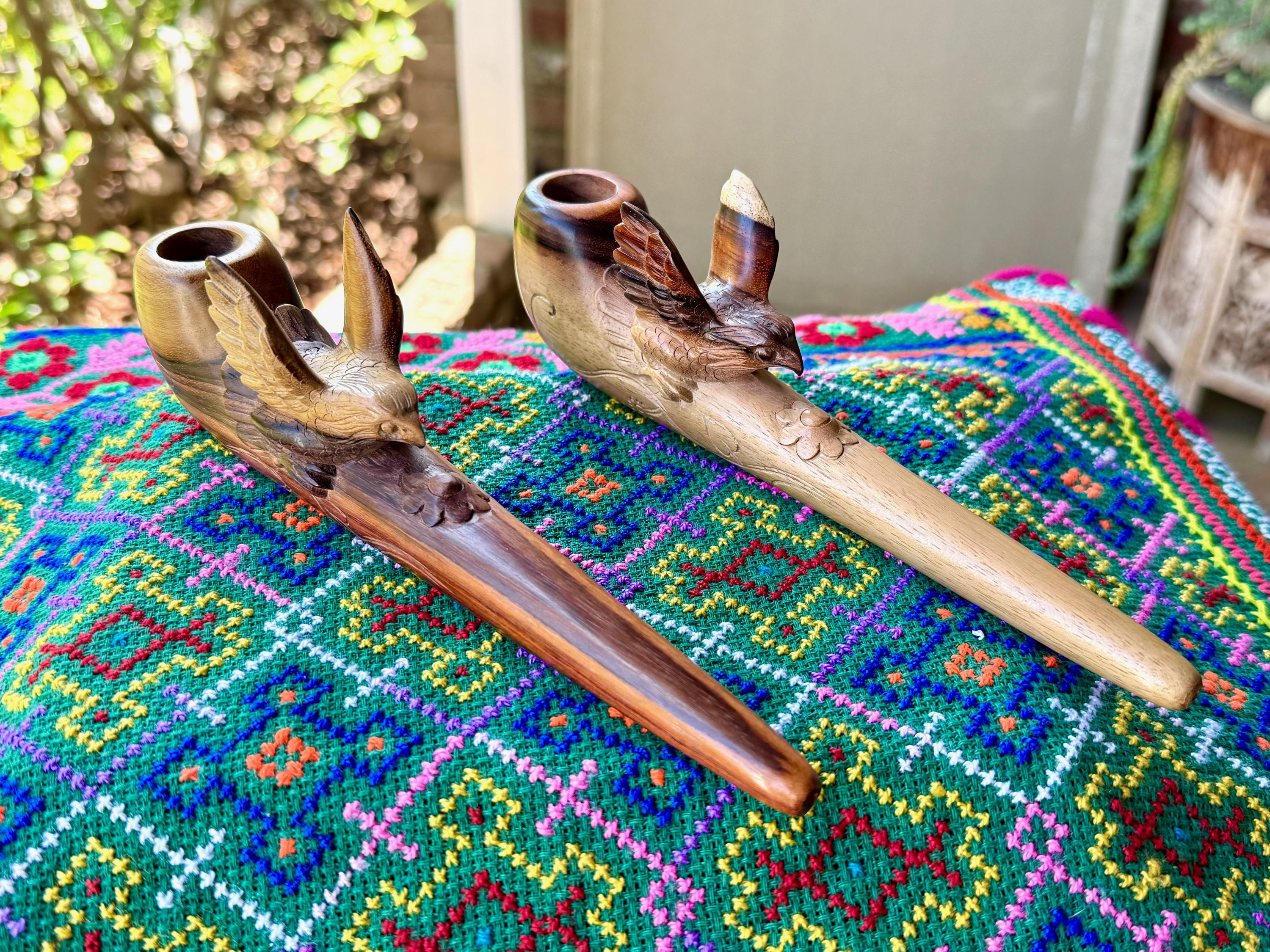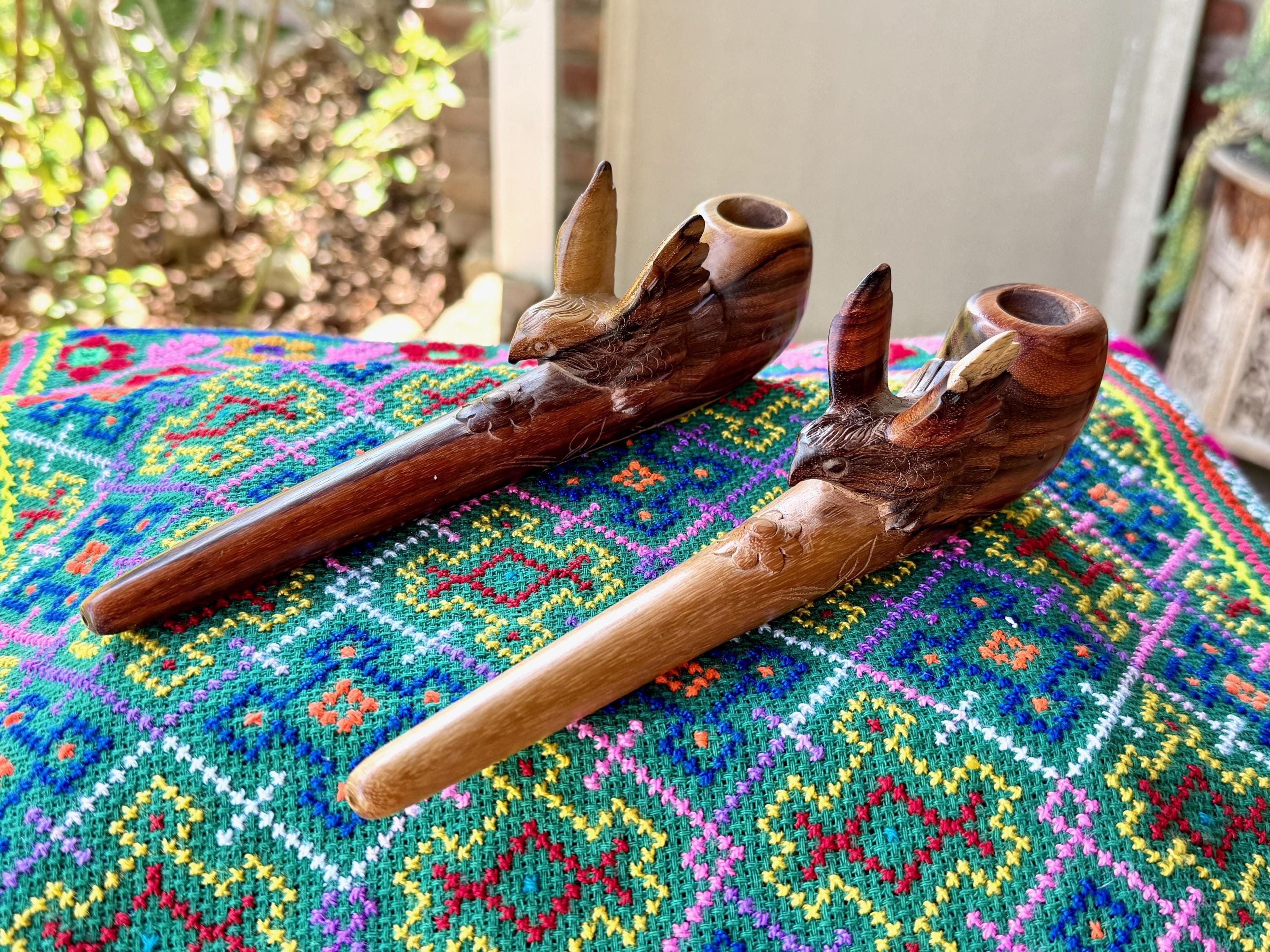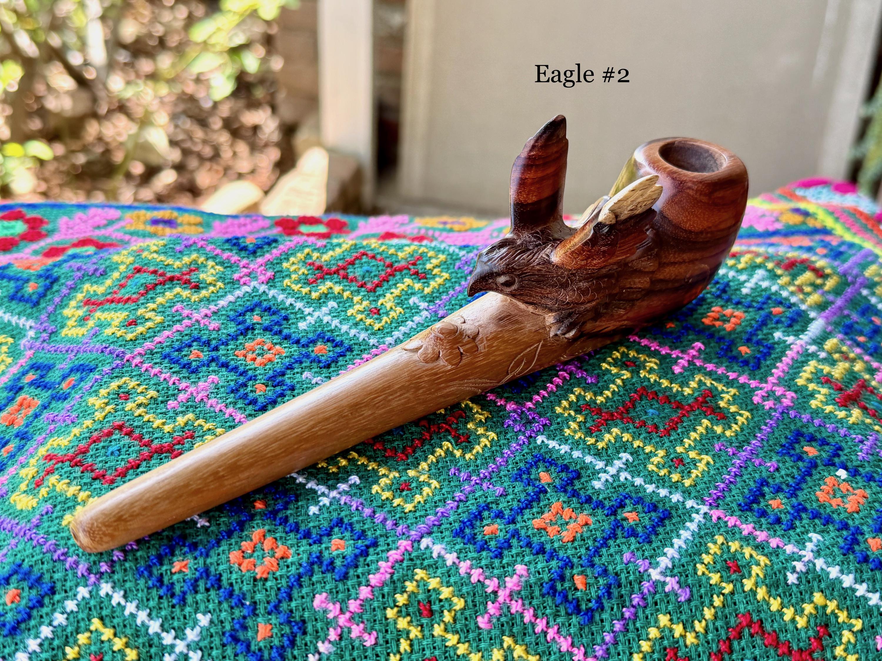 These magnificent Eagle Pipes for tobacco and mapacho were hand carved from solid, two-tone tropical hardwood. These pipes are intended for use in shamanic healing ceremonies or for other energy healing applications. There are TWO to choose from, simply select your preference from the dropdown menu.