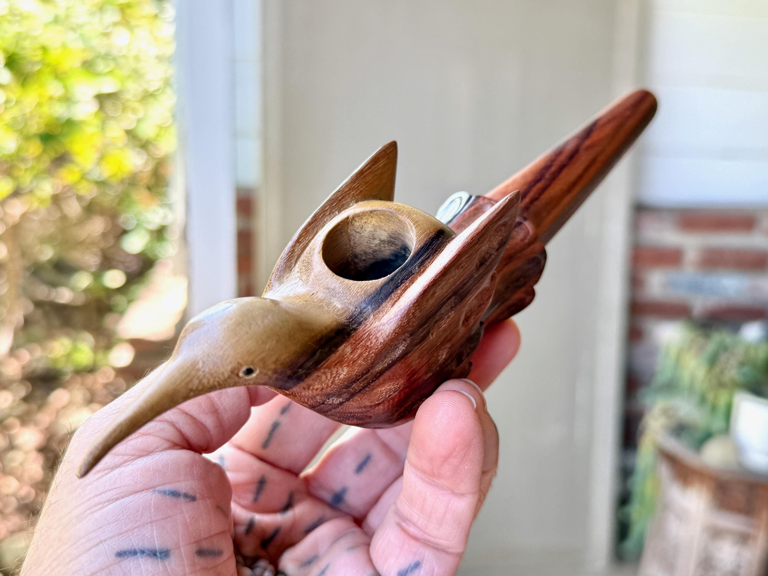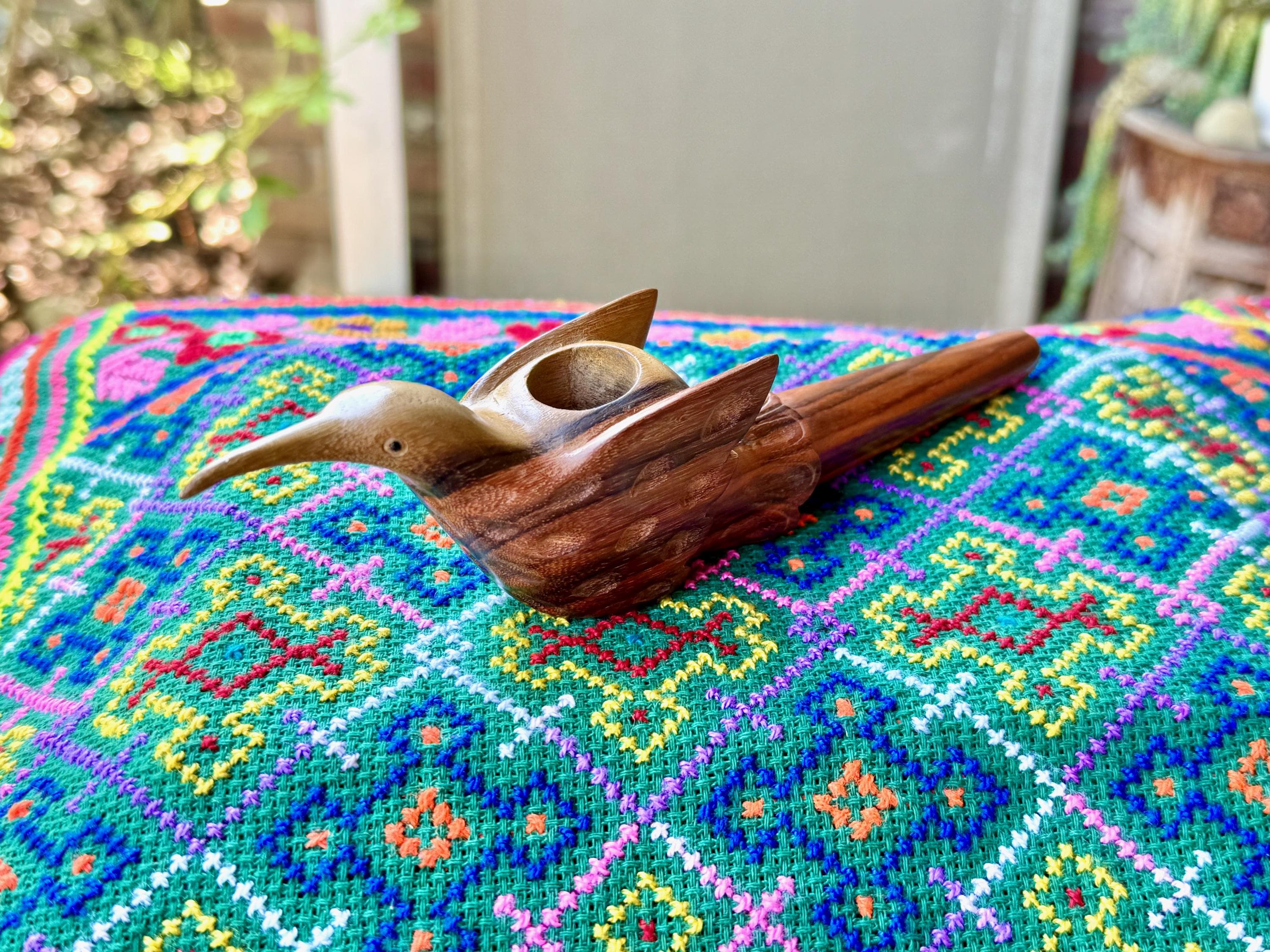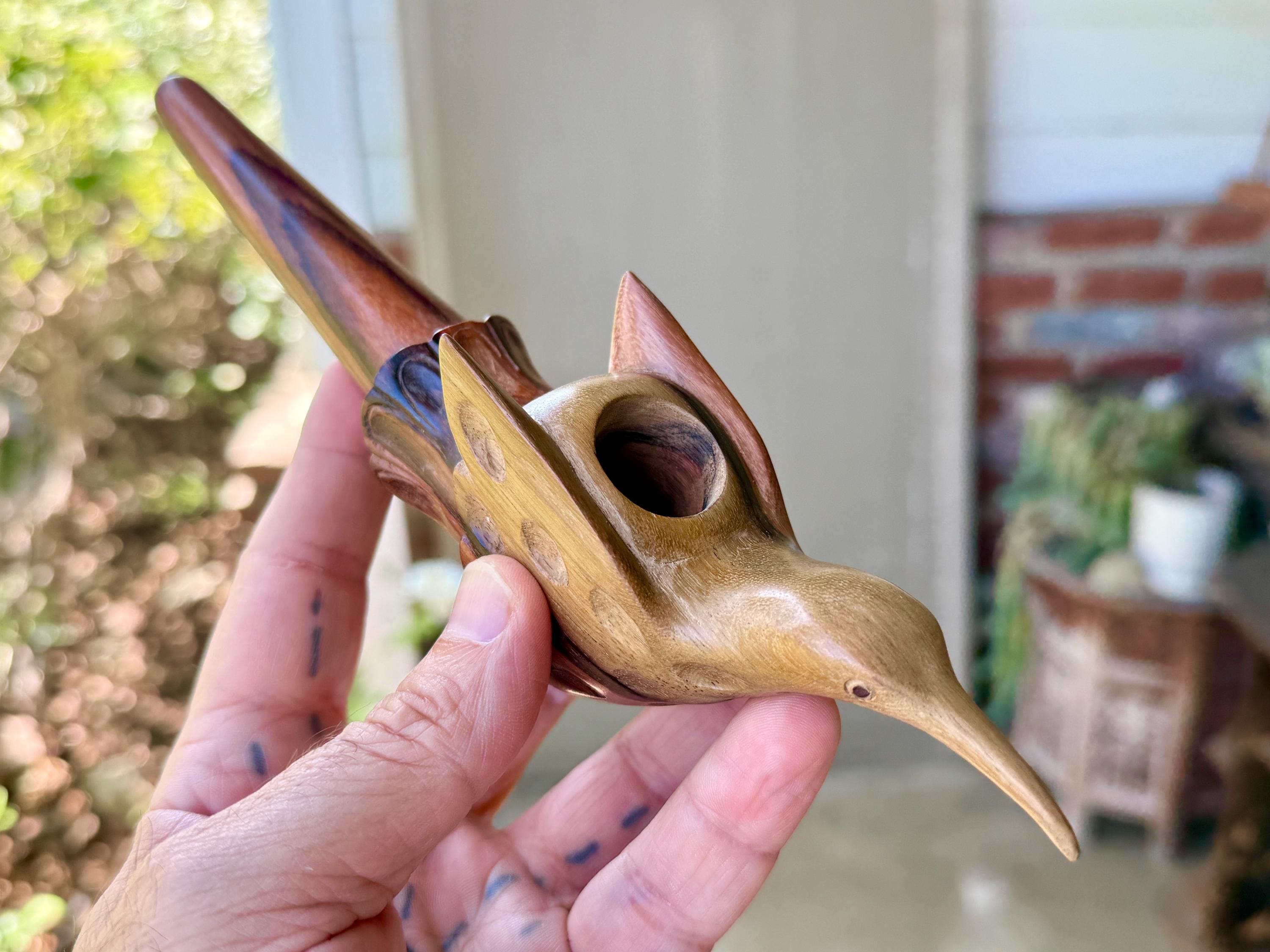 The joy and light of our most beloved animal ally, the Hummingbird, captured here in this beautiful tobacco pipe. We love the design and the beautiful grain and two-tone hue of the wood. The level of craftsmanship is impressive! A beautiful and powerful tool for shamanic ceremony.
