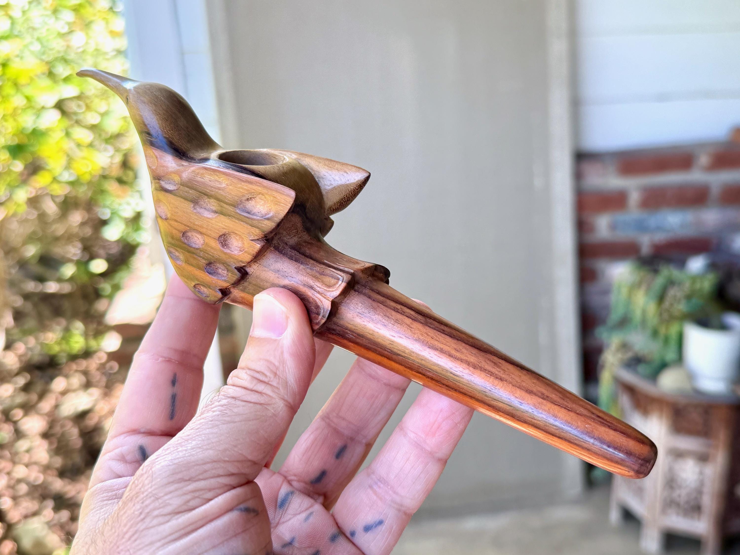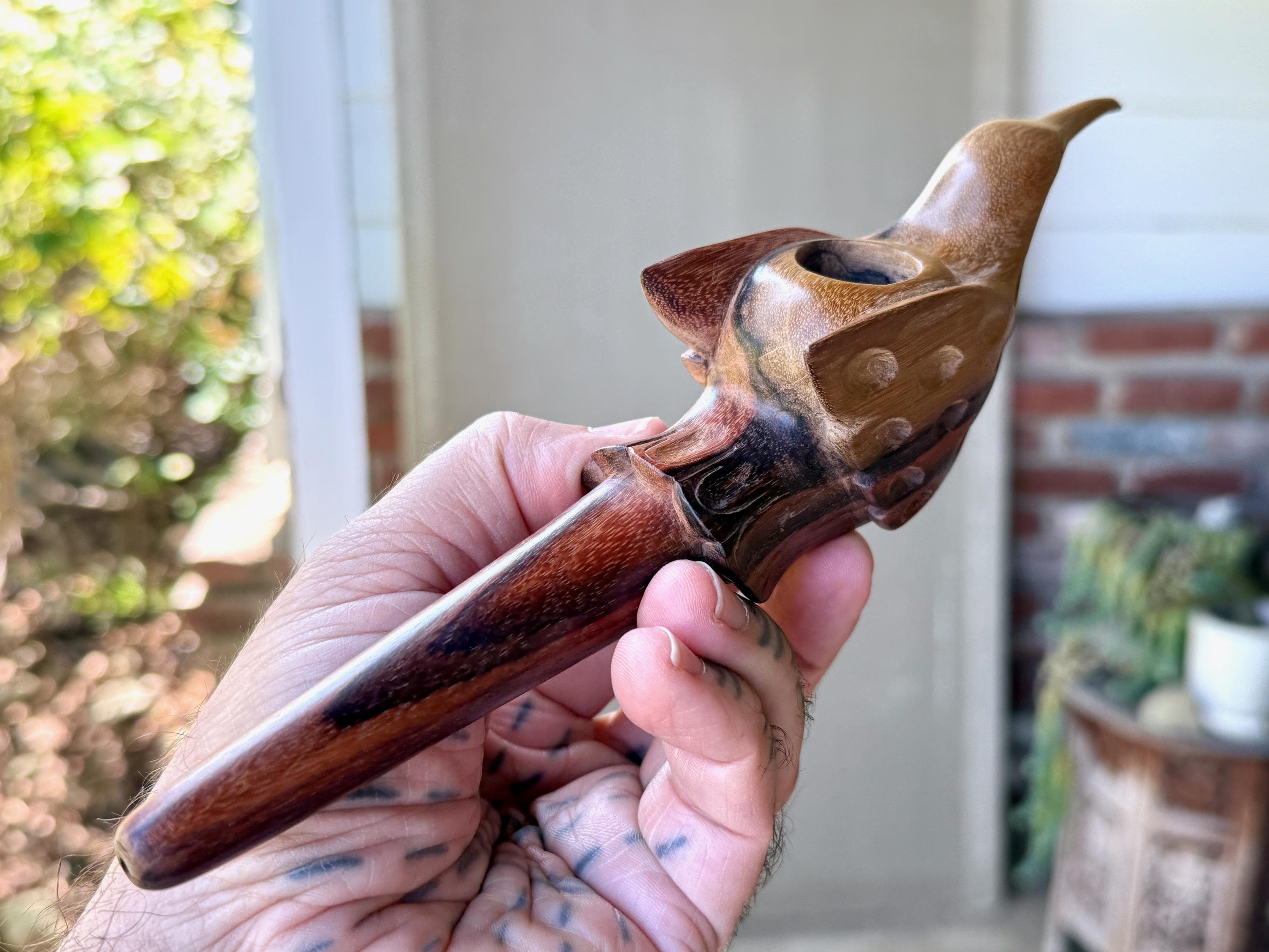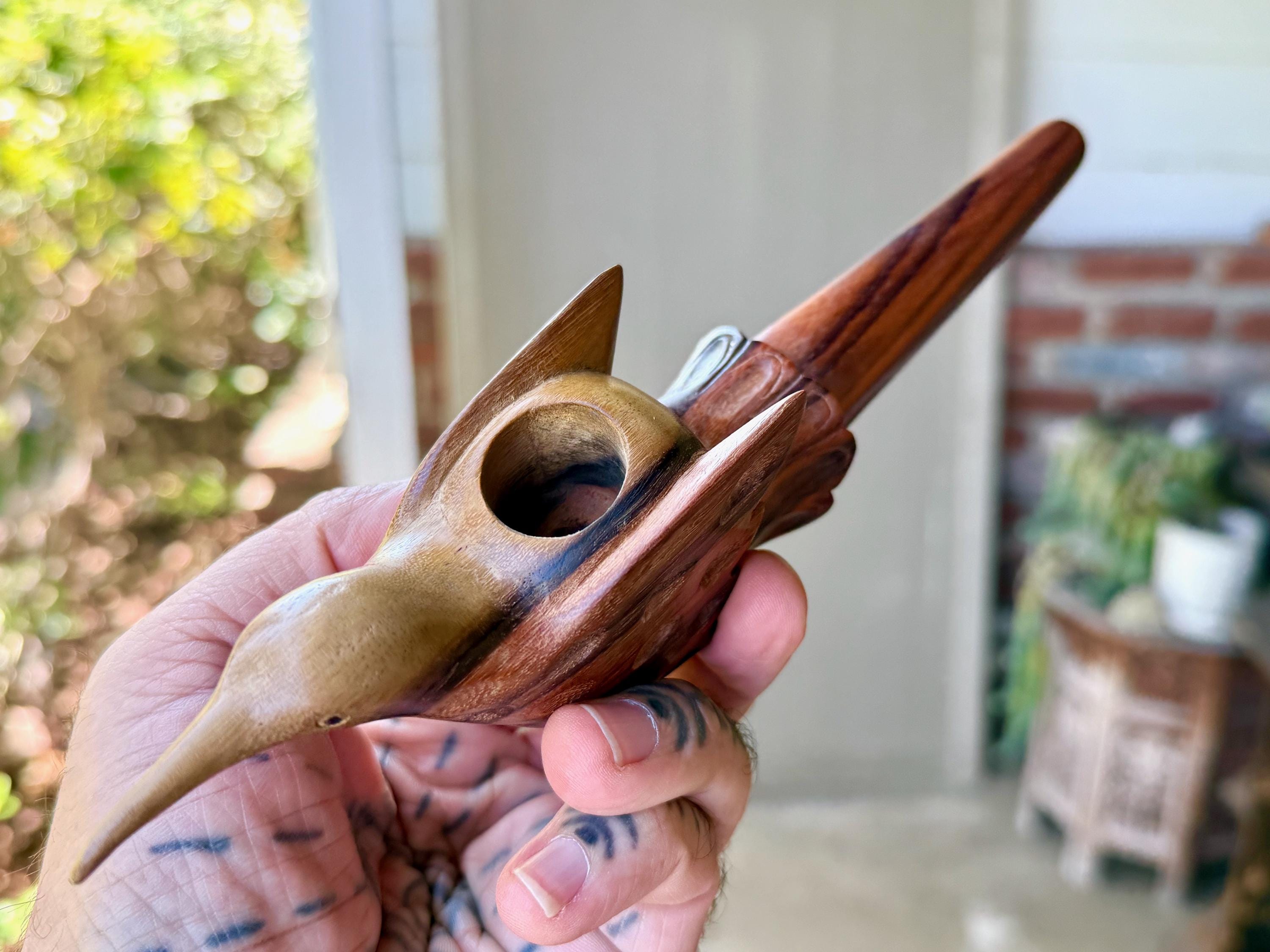 The joy and light of our most beloved animal ally, the Hummingbird, captured here in this beautiful tobacco pipe. We love the design and the beautiful grain and two-tone hue of the wood. The level of craftsmanship is impressive! A beautiful and powerful tool for shamanic ceremony.