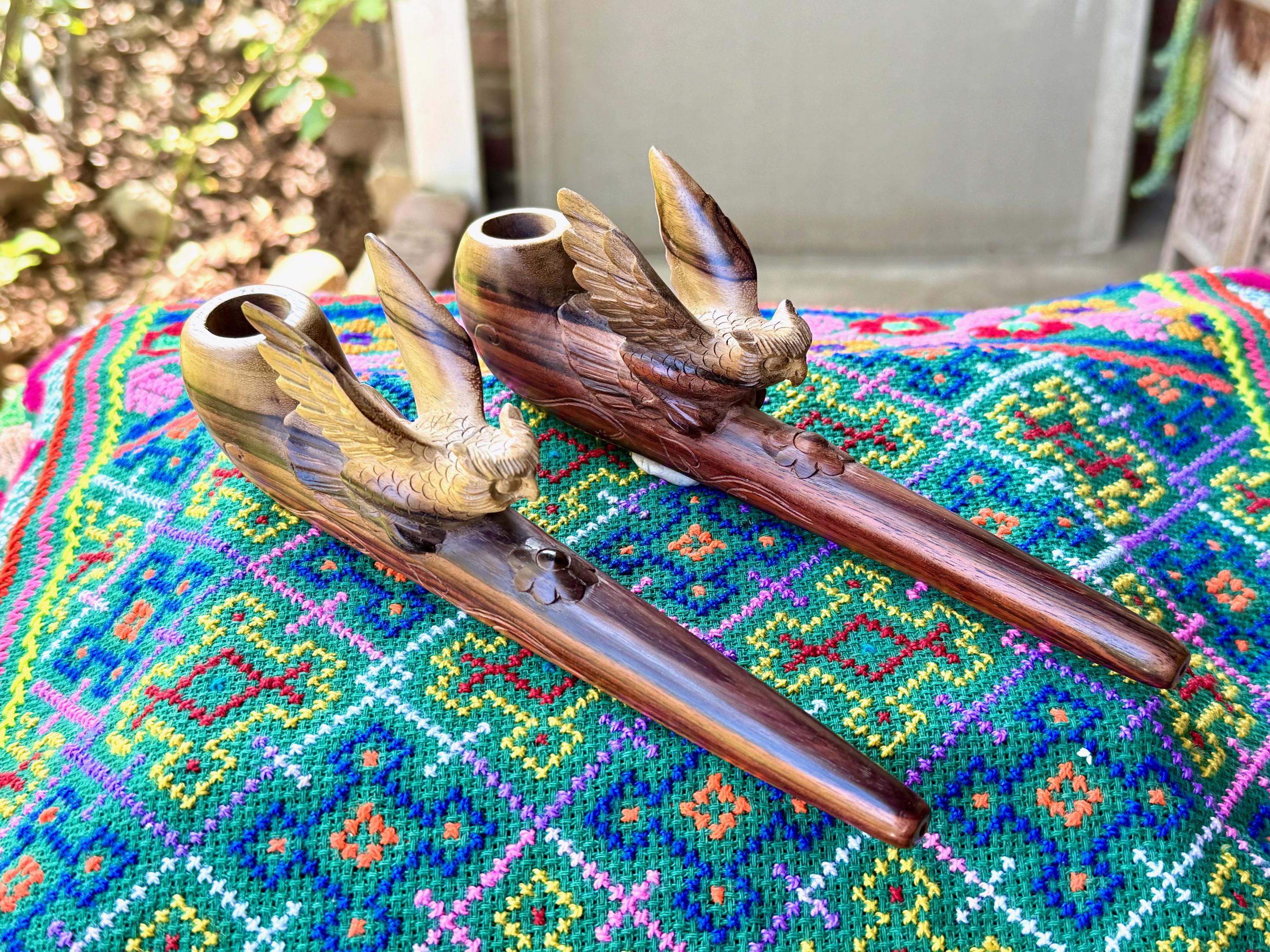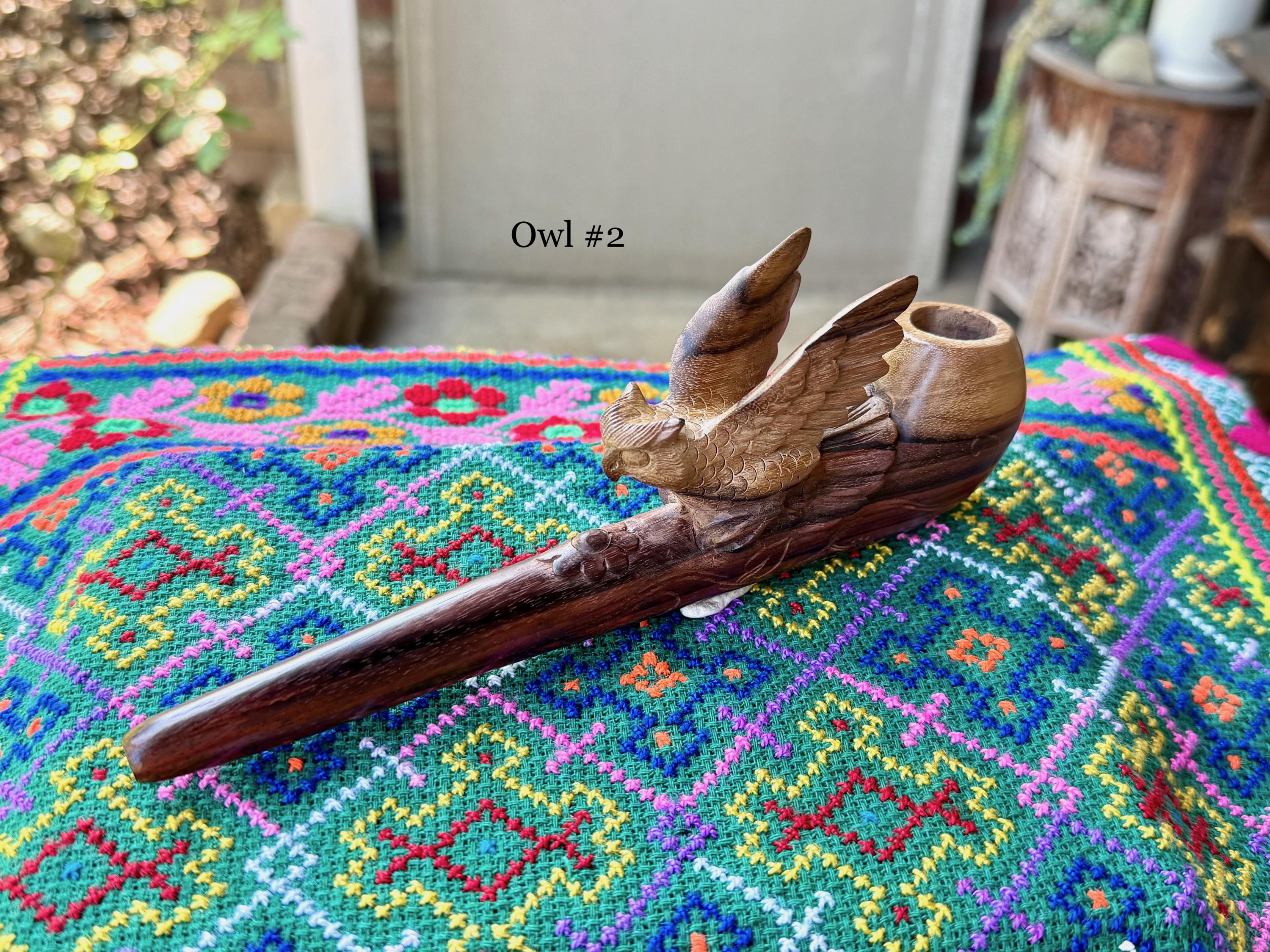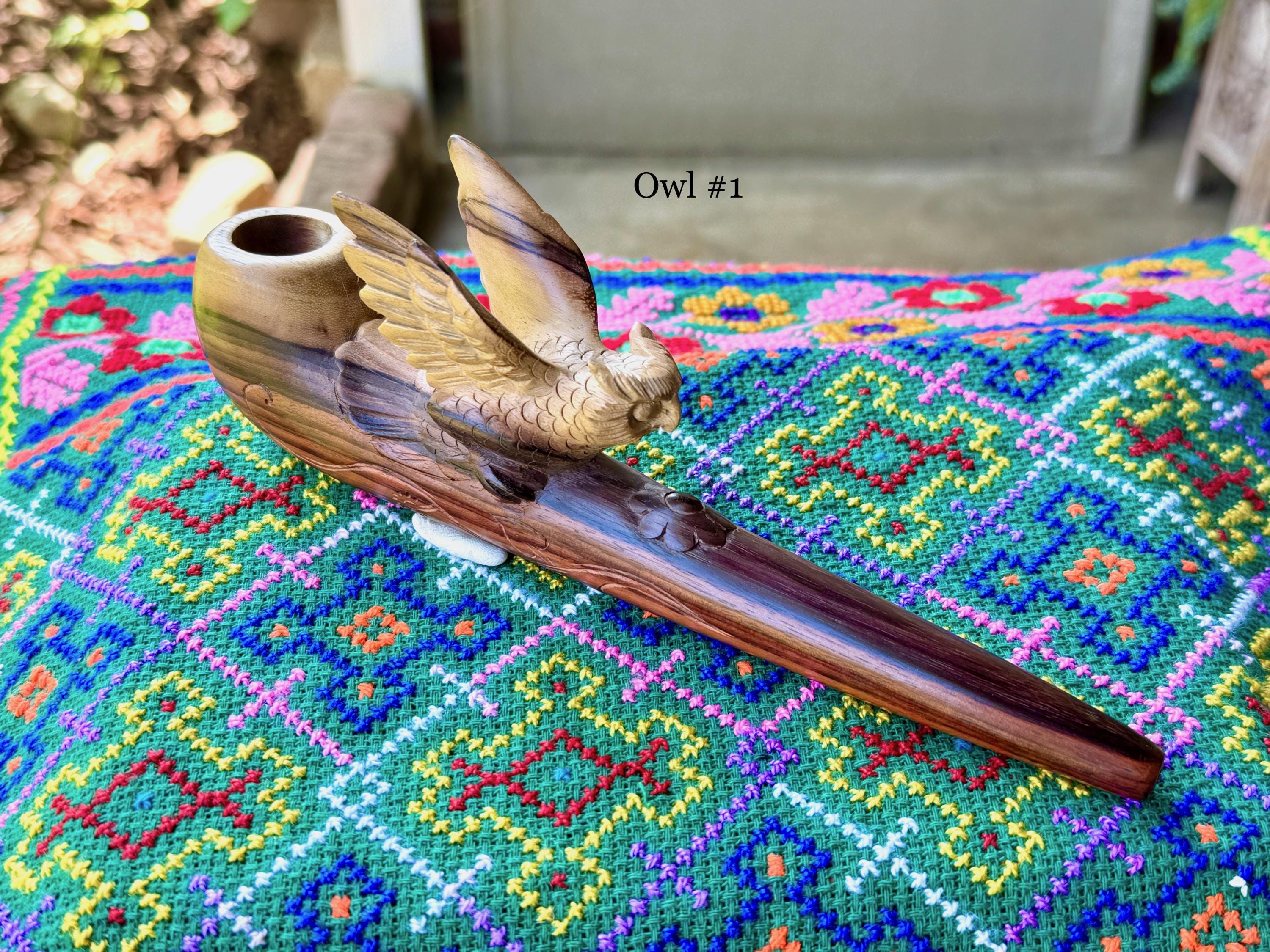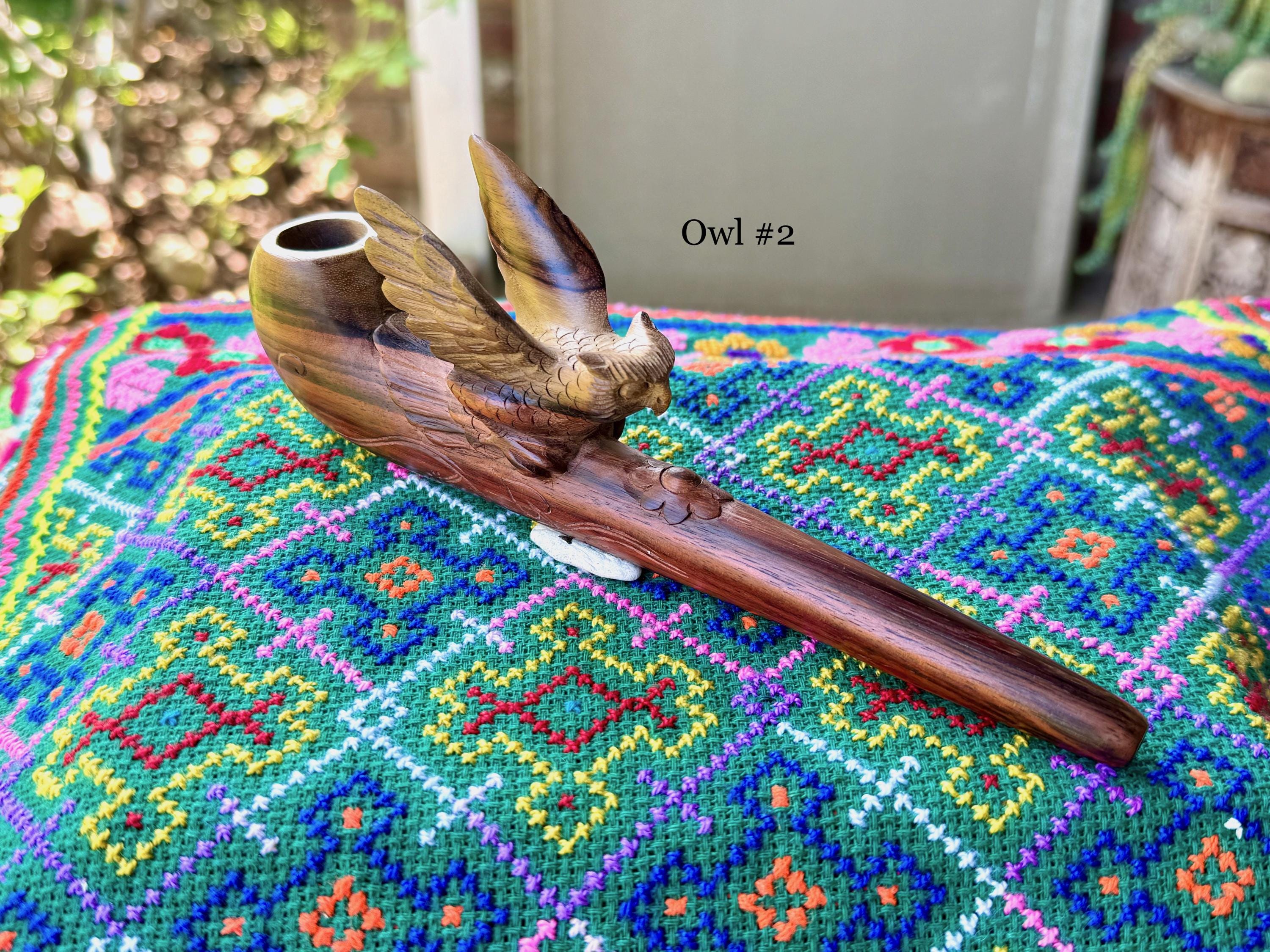 These exquisite Shamanic Owl pipes for tobacco and mapacho were hand carved from natural, two-tone tropical hardwood by our artisans. These pipes are intended for use in shamanic healing ceremonies or other energy healing applications. Each is numbered, simply select your preference from the dropdown menu.