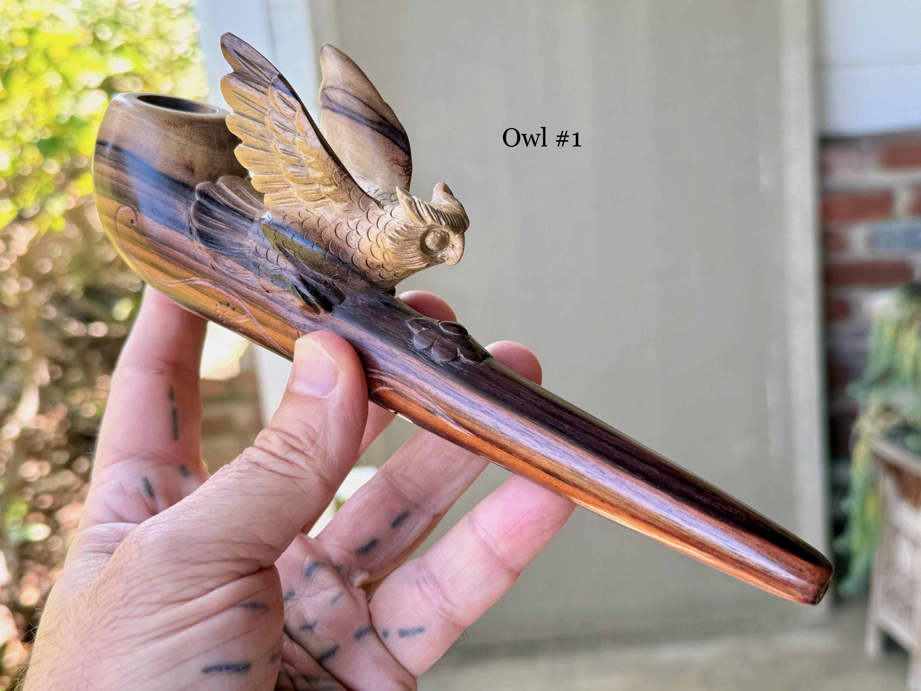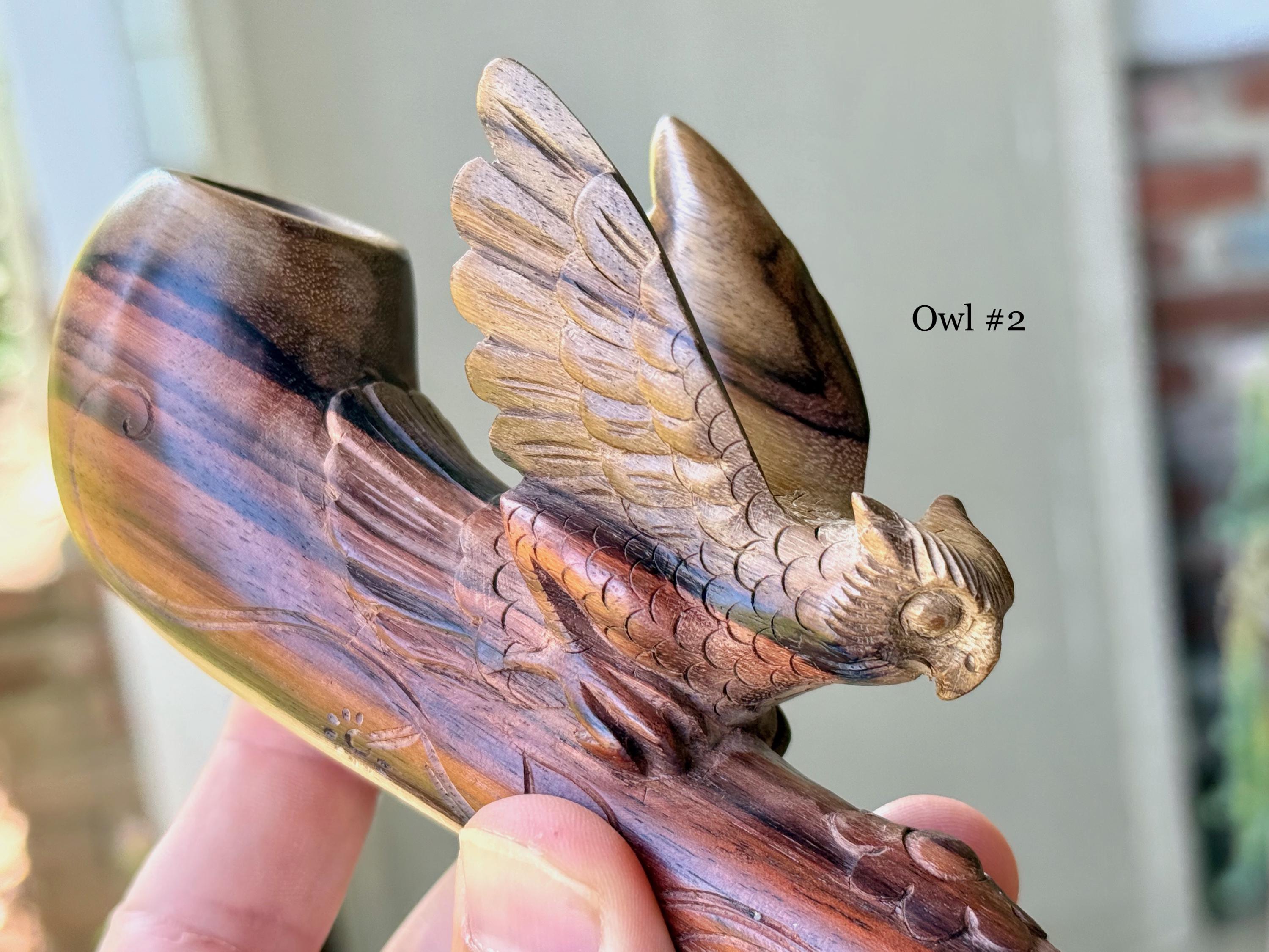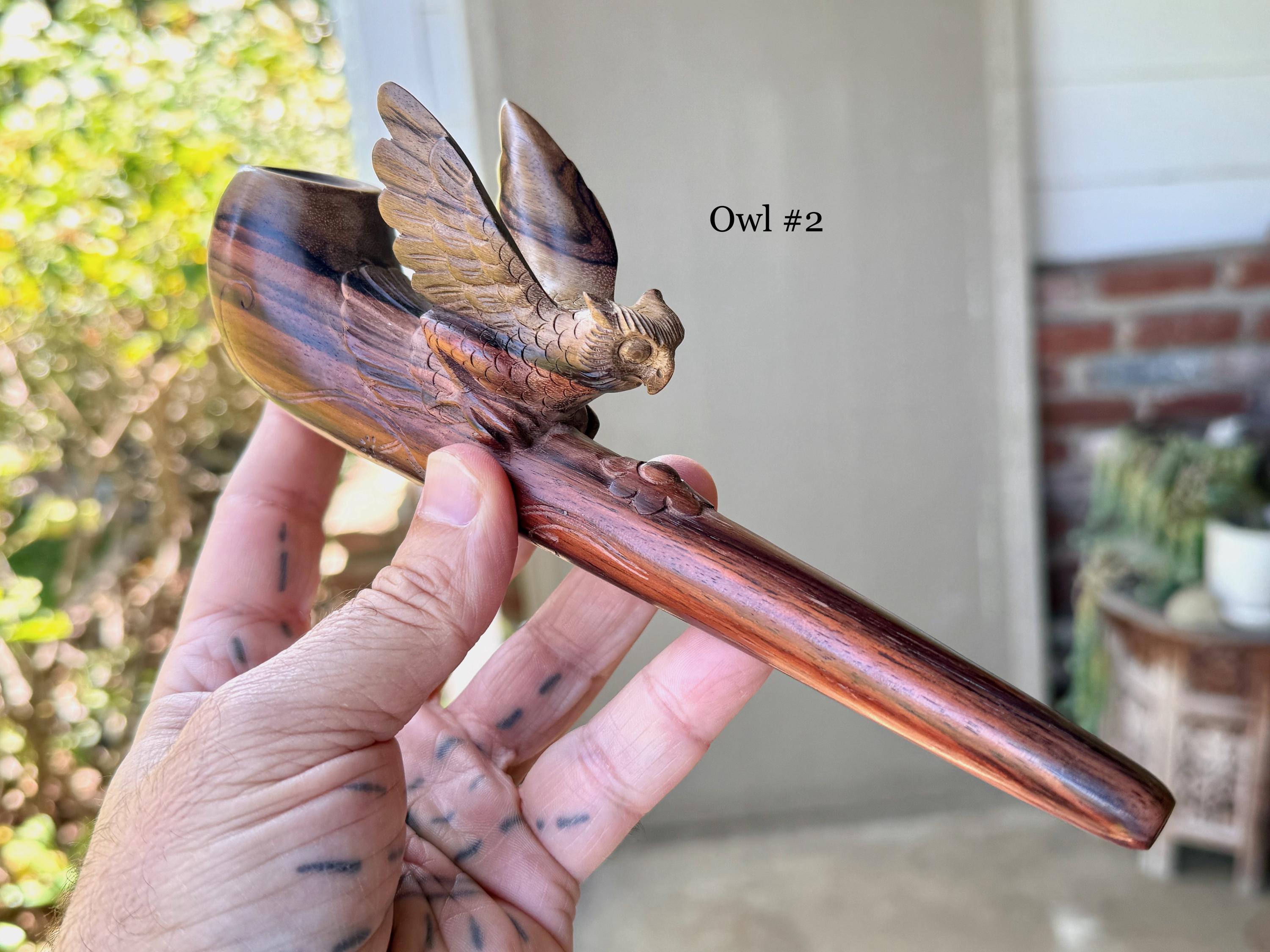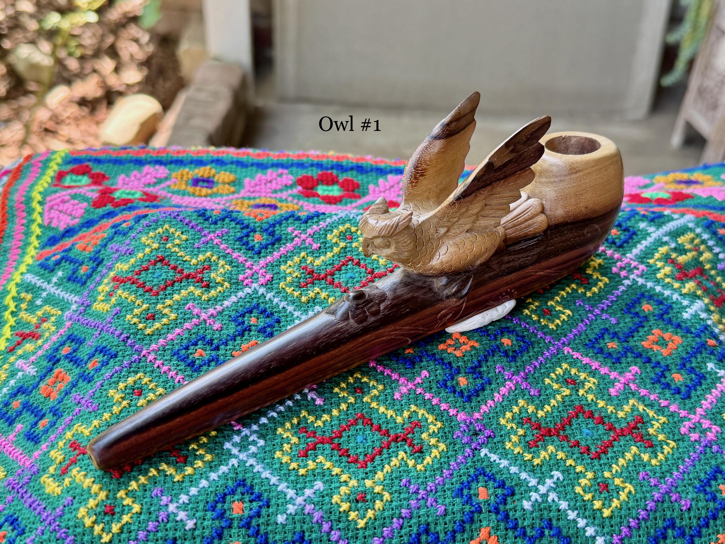 The wise and protective Owl in flight! These elegant ceremonial pipes feature this most beloved animal protector, hand carved with meticulous attention to detail. Each feather of the wings are hand carved!