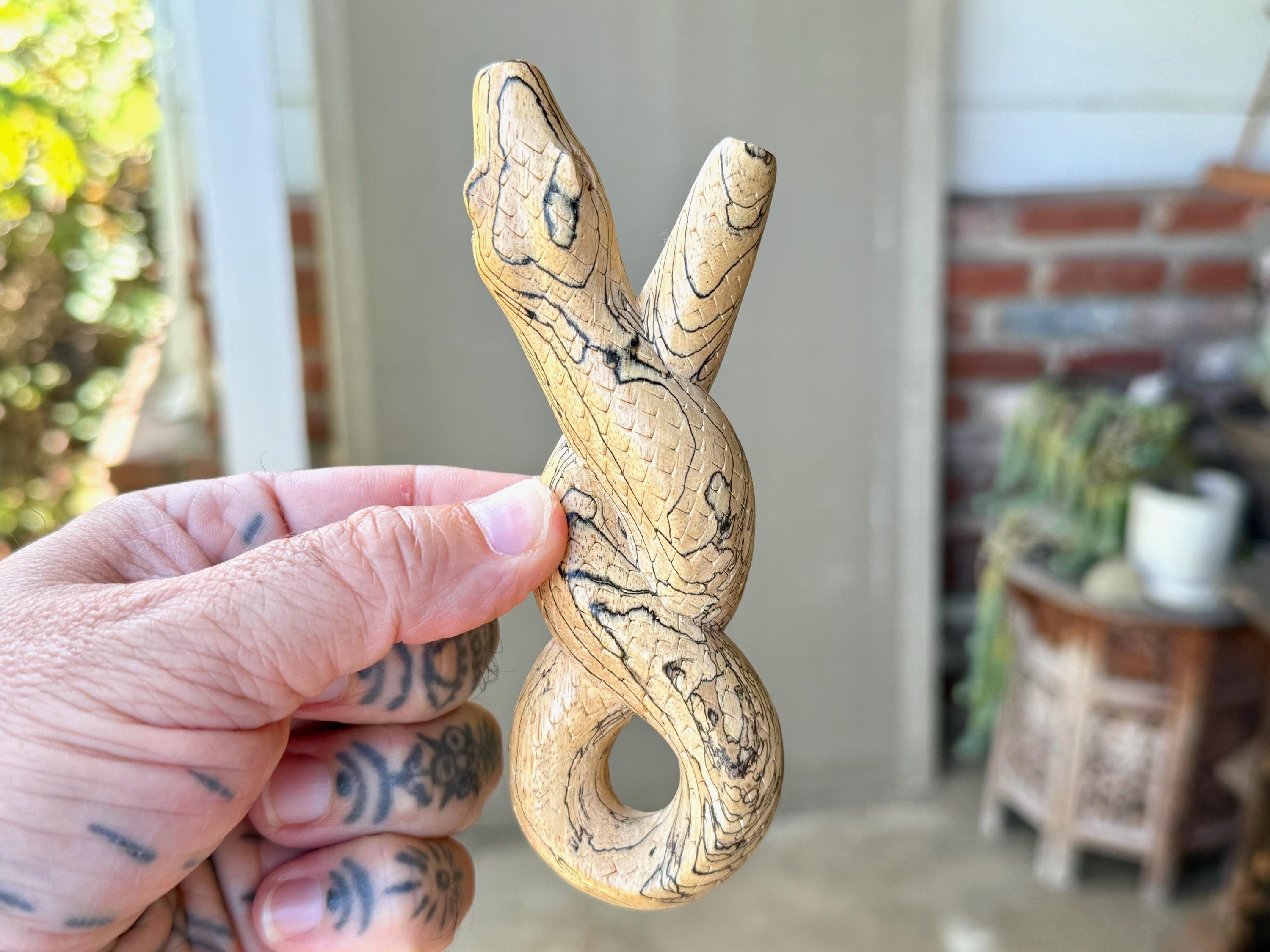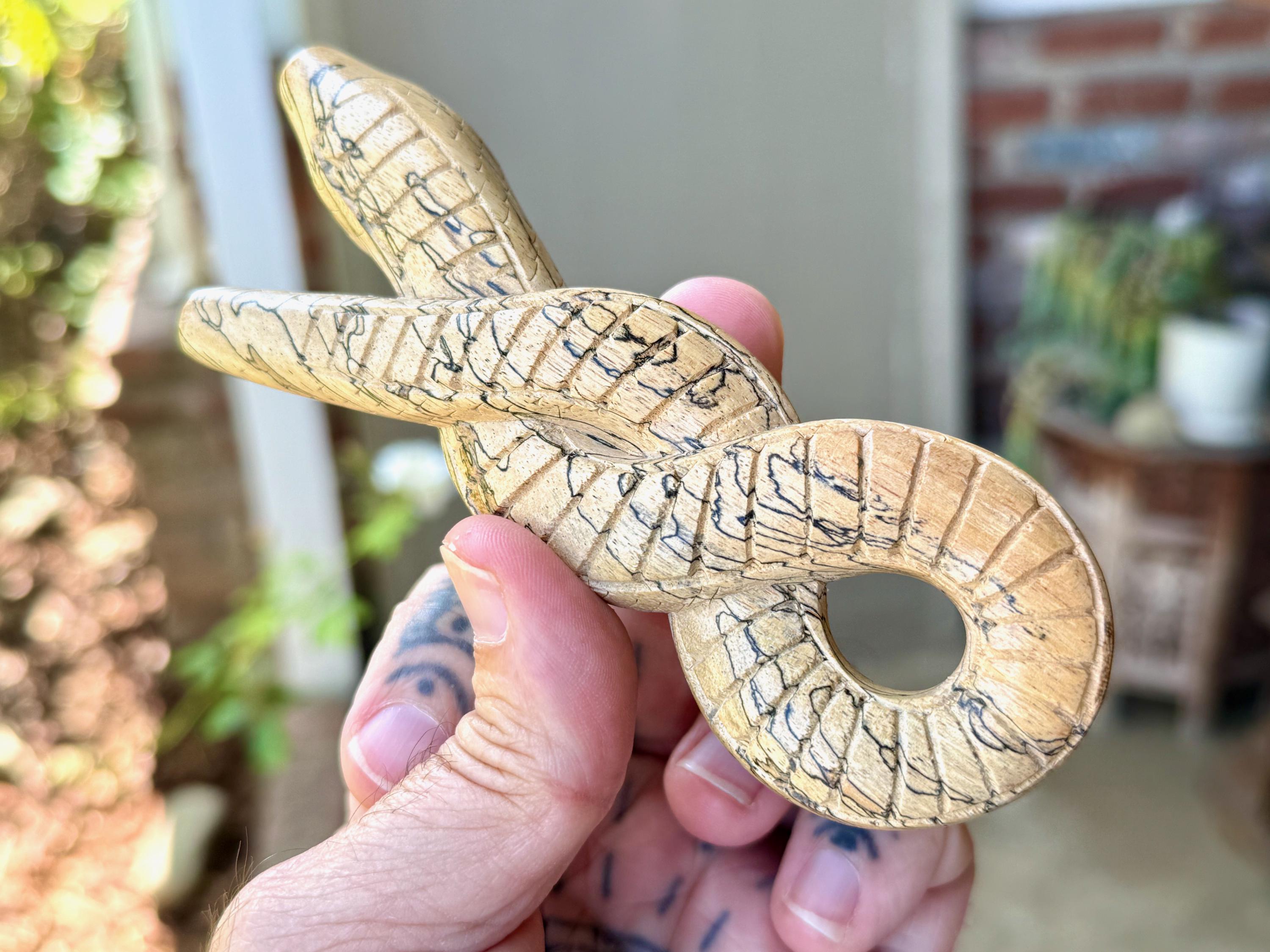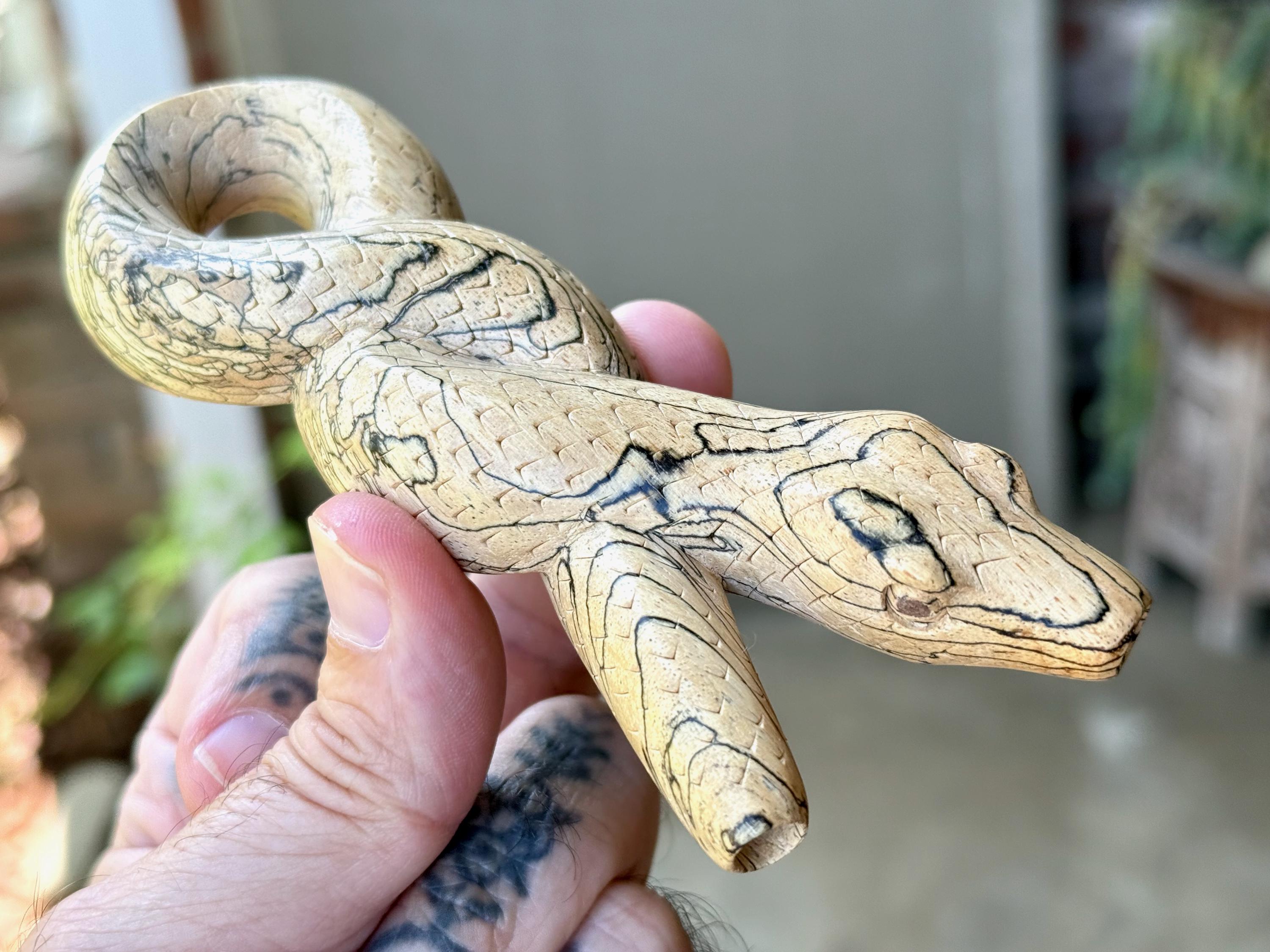 One of our most popular designs, this Infinity Serpent Kuripe is masterfully carved from a single block of beautifully grained Crocodile Wood, a lightweight but durable tropical hardwood. The attention to detail is outstanding (each scale is carved by hand!). A beautiful and powerful medicine tool.