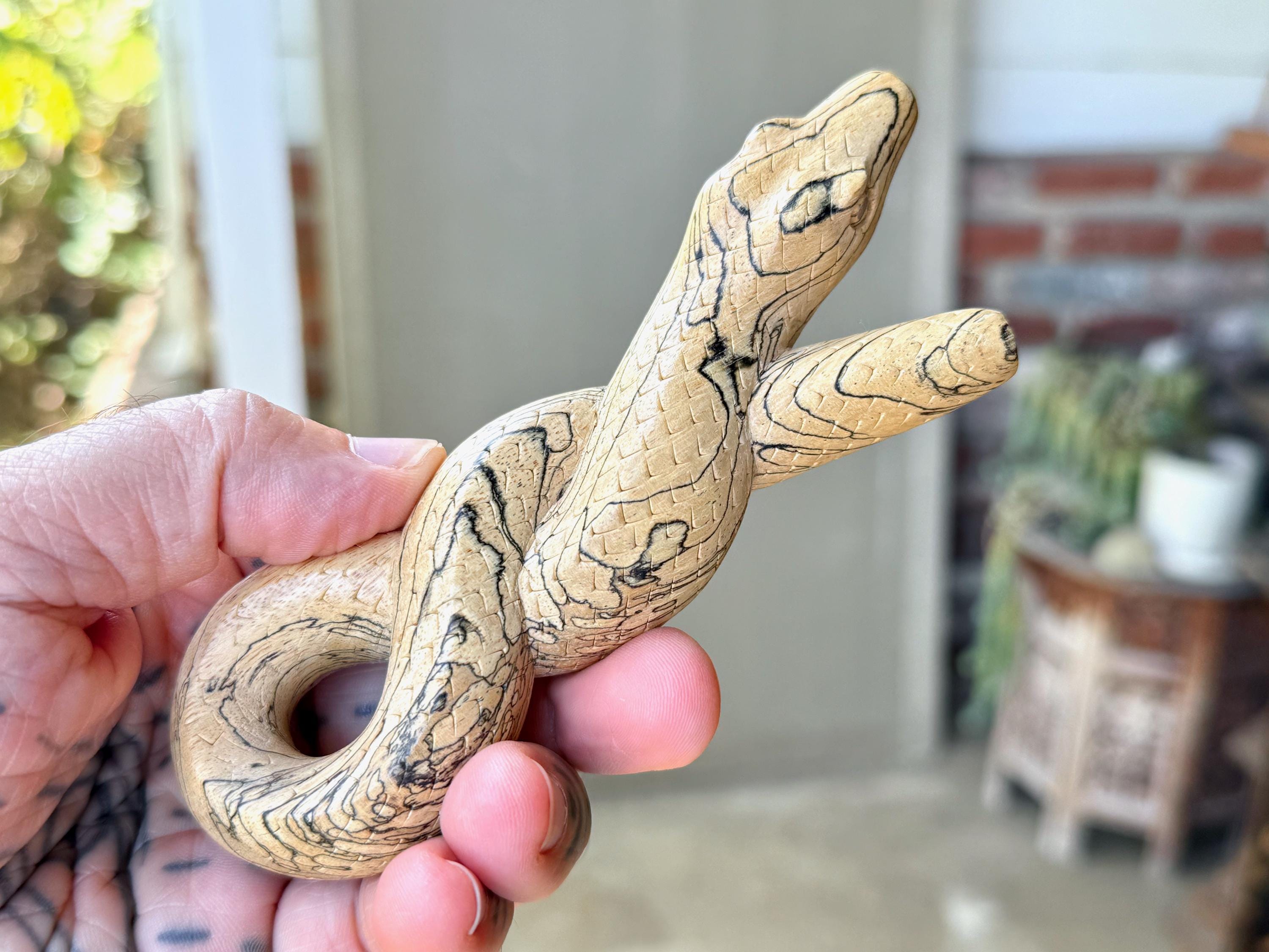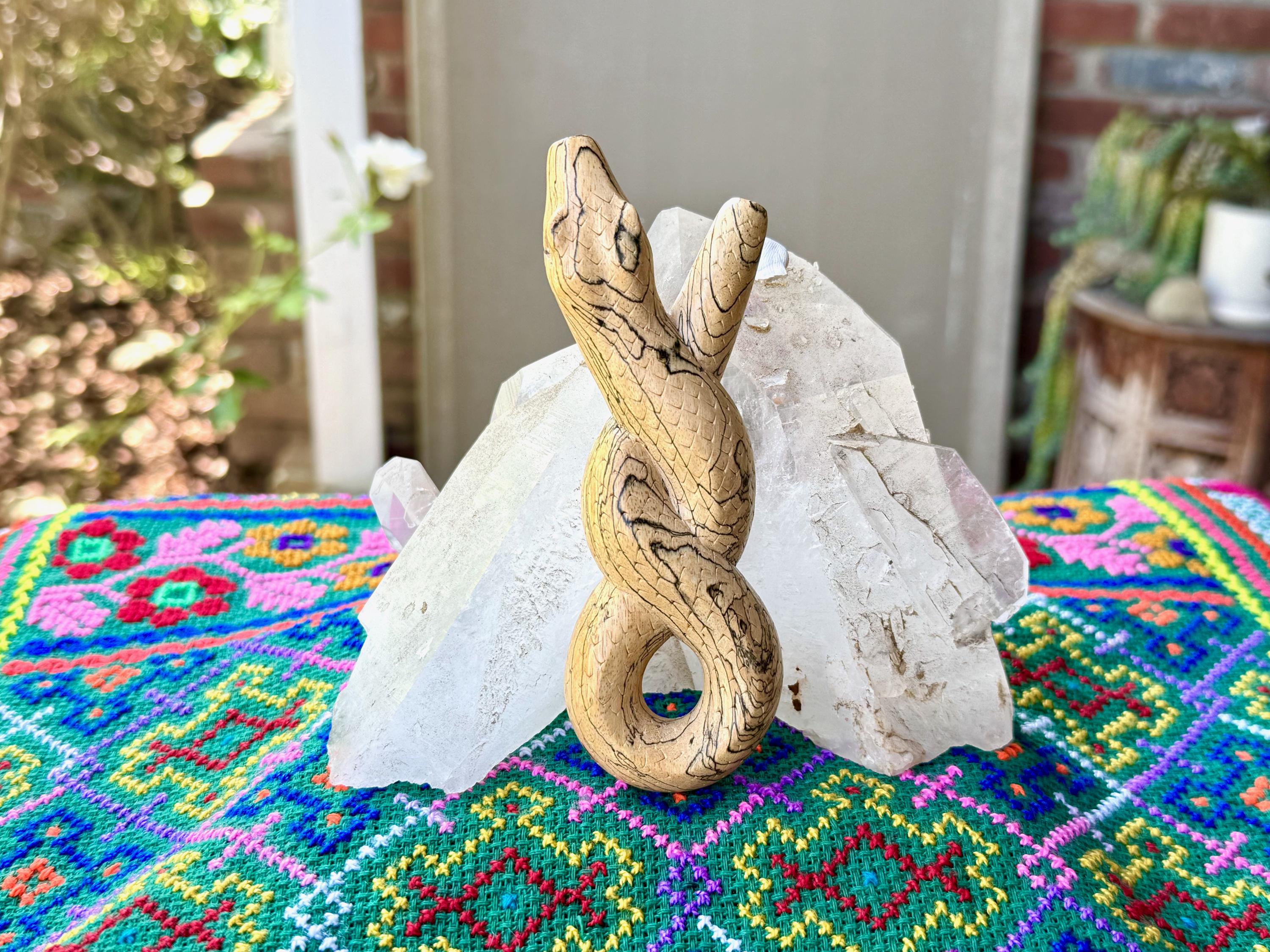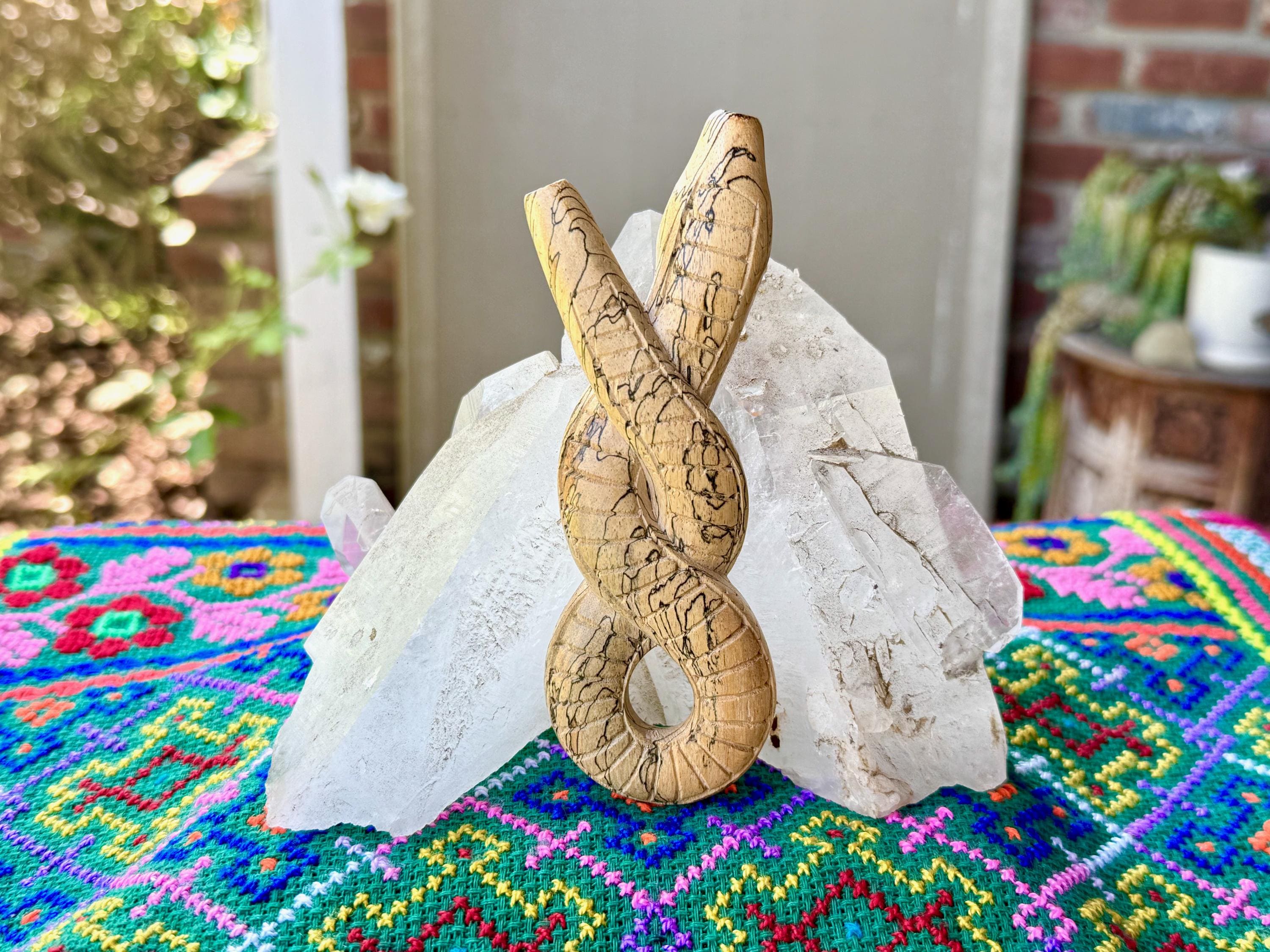 This traditional Infinity Serpent Kuripe was hand carved by our artisans from solid, natural Crocodile Wood.