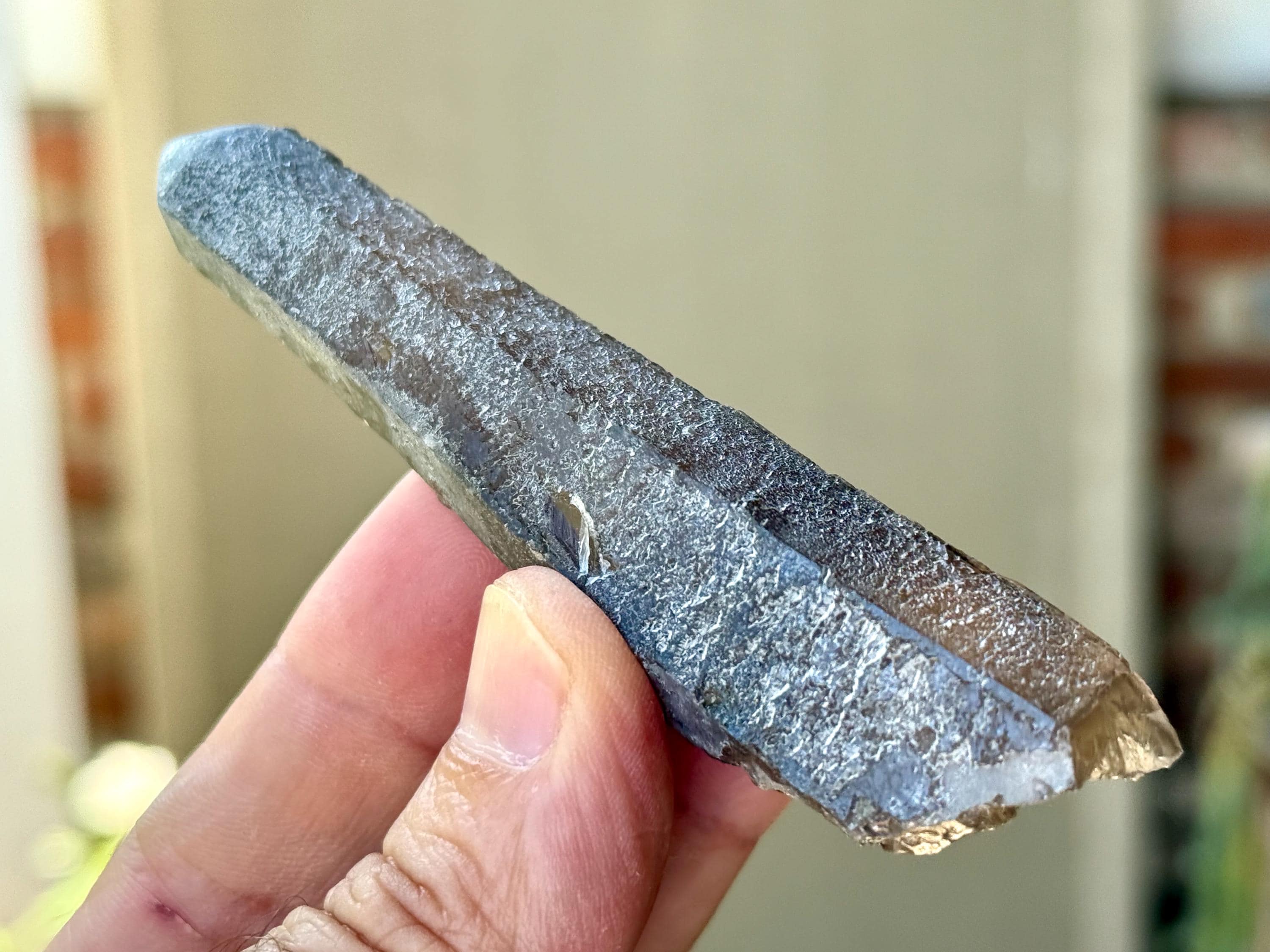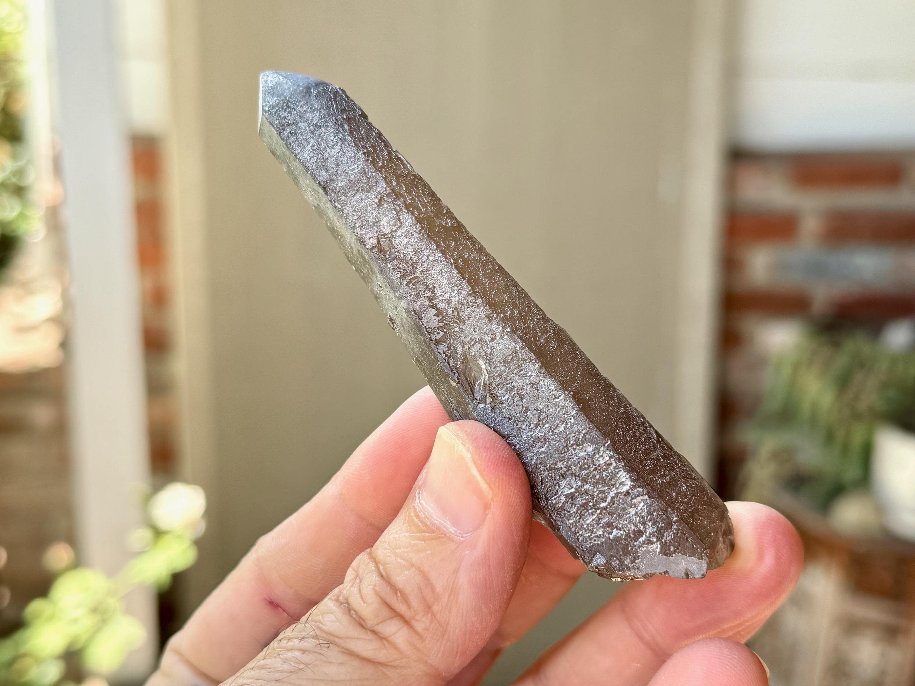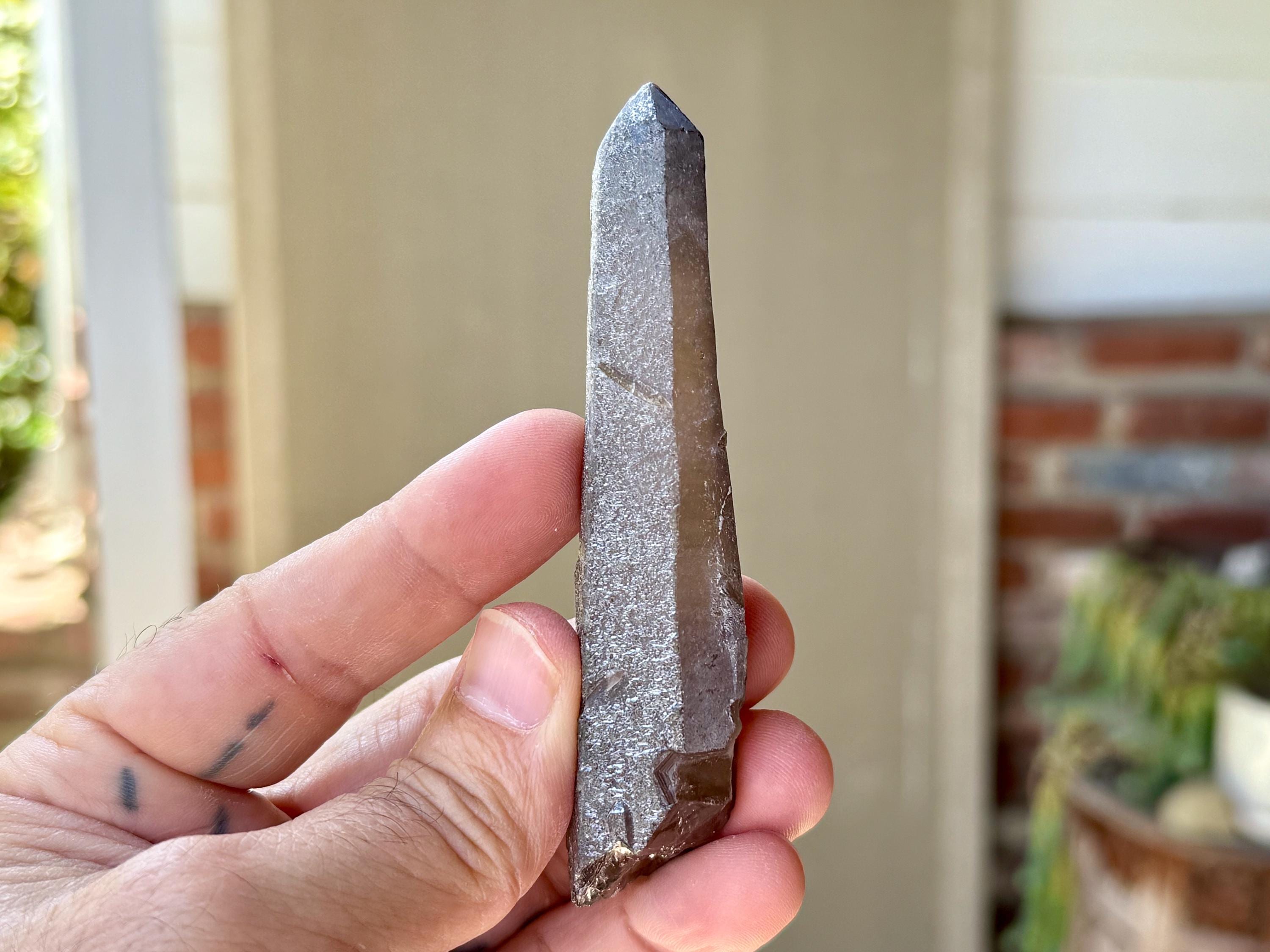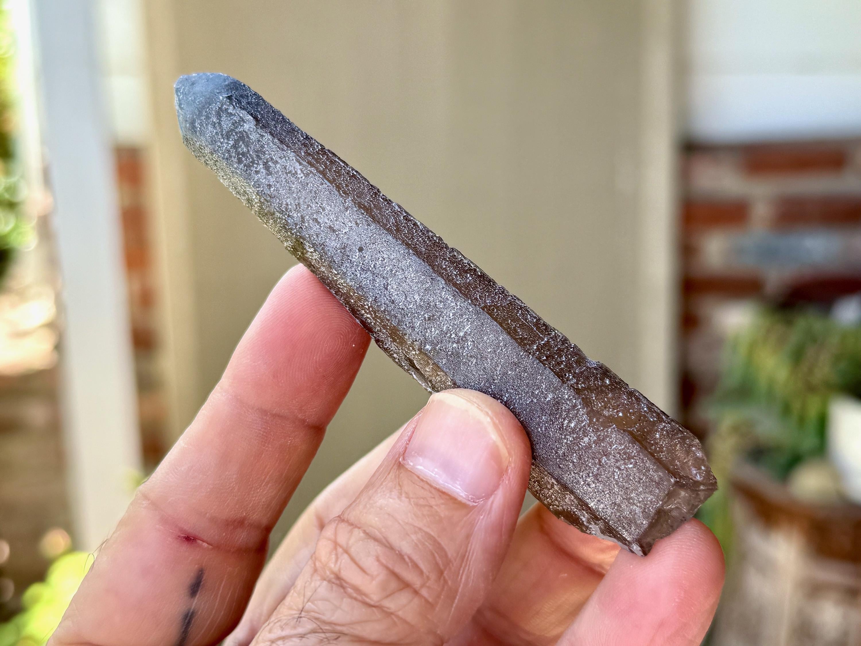 Lovely elongated formation to this Smoky Quartz crystal point with mildly etched textures on its exterior and a very mild white "frost" in some areas. When backlit, as in Photos 2-3, we can see its wonderful translucency, and also catch a glimpse of the mild Hedenbergite inclusions concentrated at the top.
