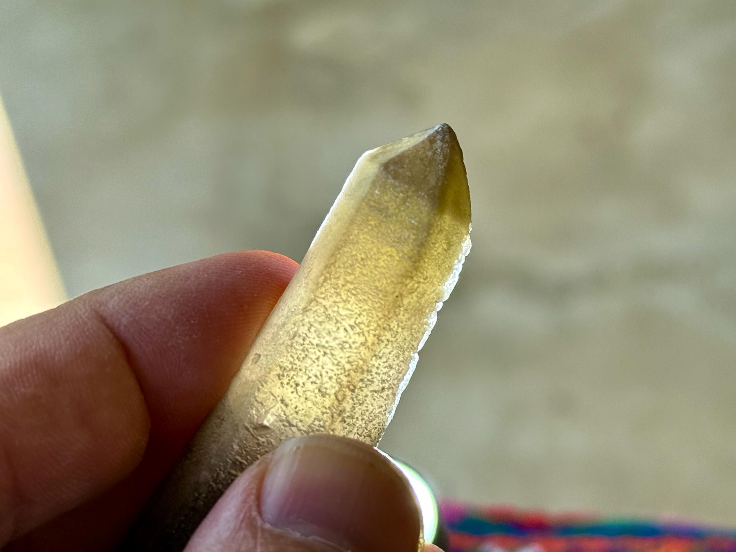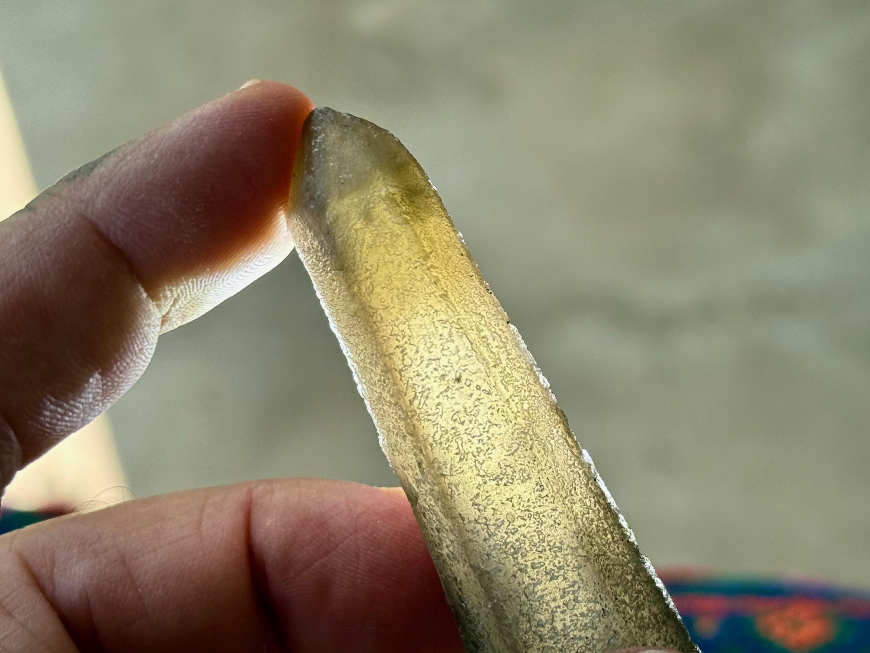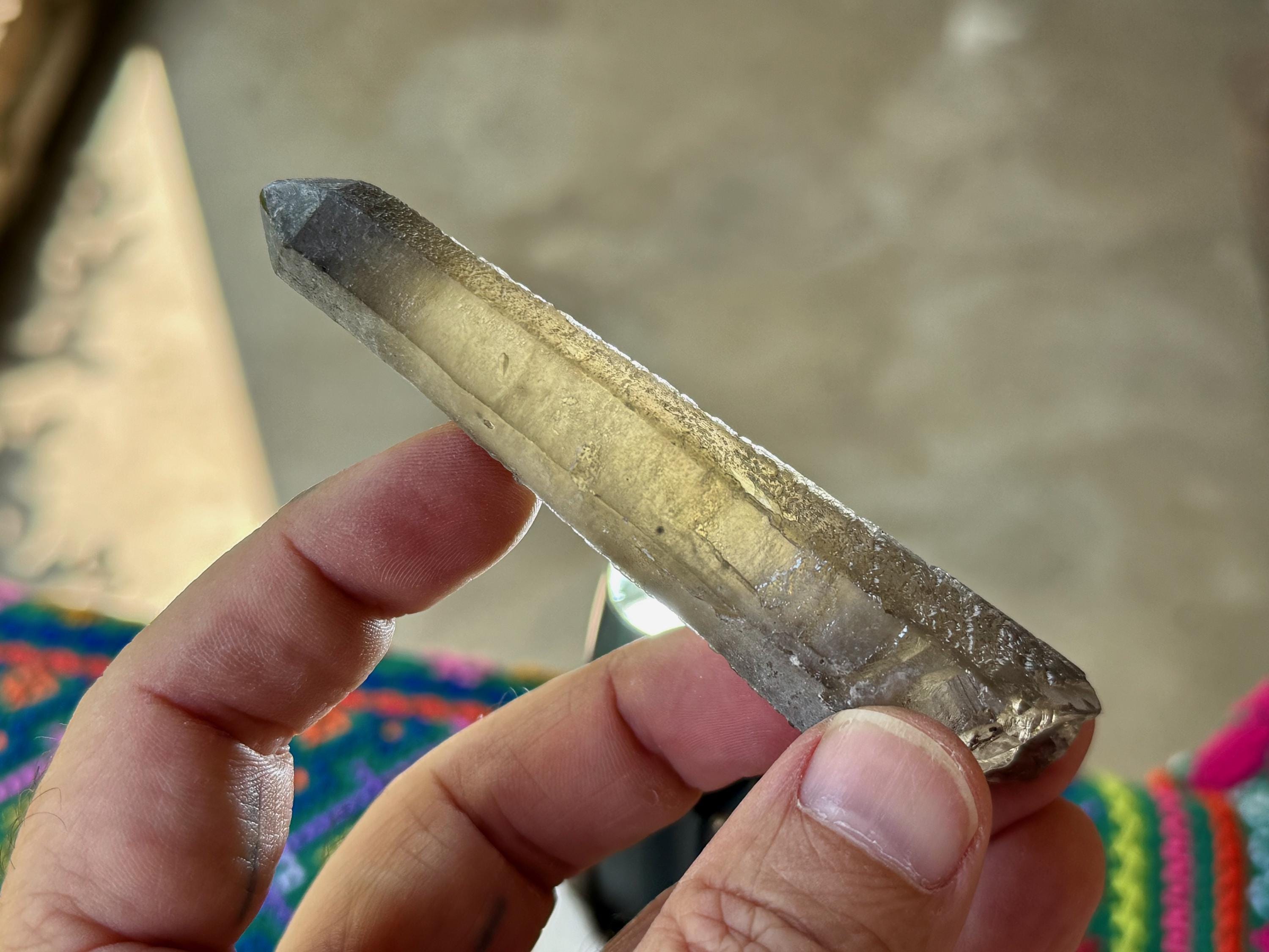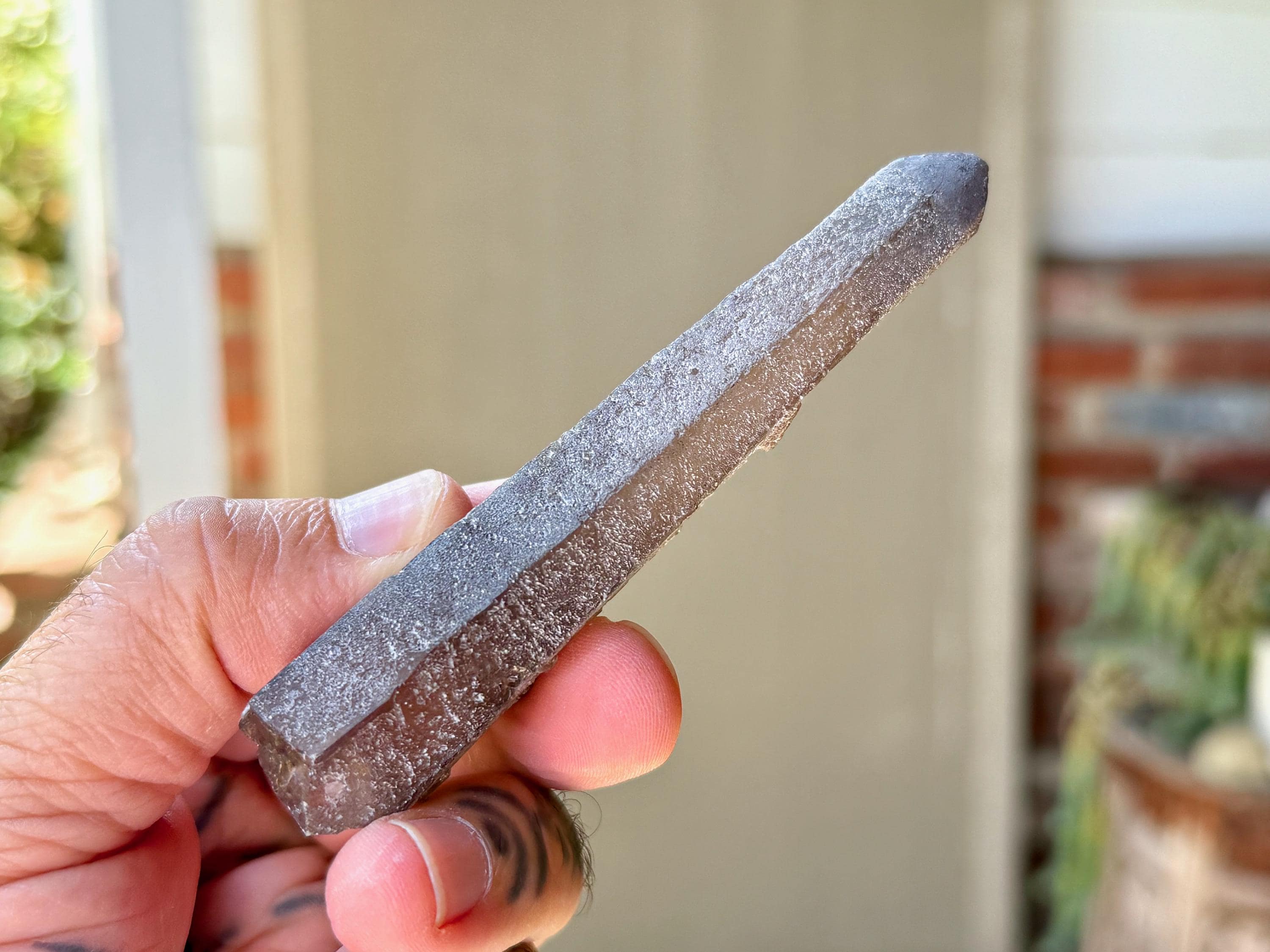 Lovely elongated formation to this Smoky Quartz crystal point with mildly etched textures on its exterior and a very mild white "frost" in some areas. When backlit, as in Photos 2-3, we can see its wonderful translucency, and also catch a glimpse of the mild Hedenbergite inclusions concentrated at the top.