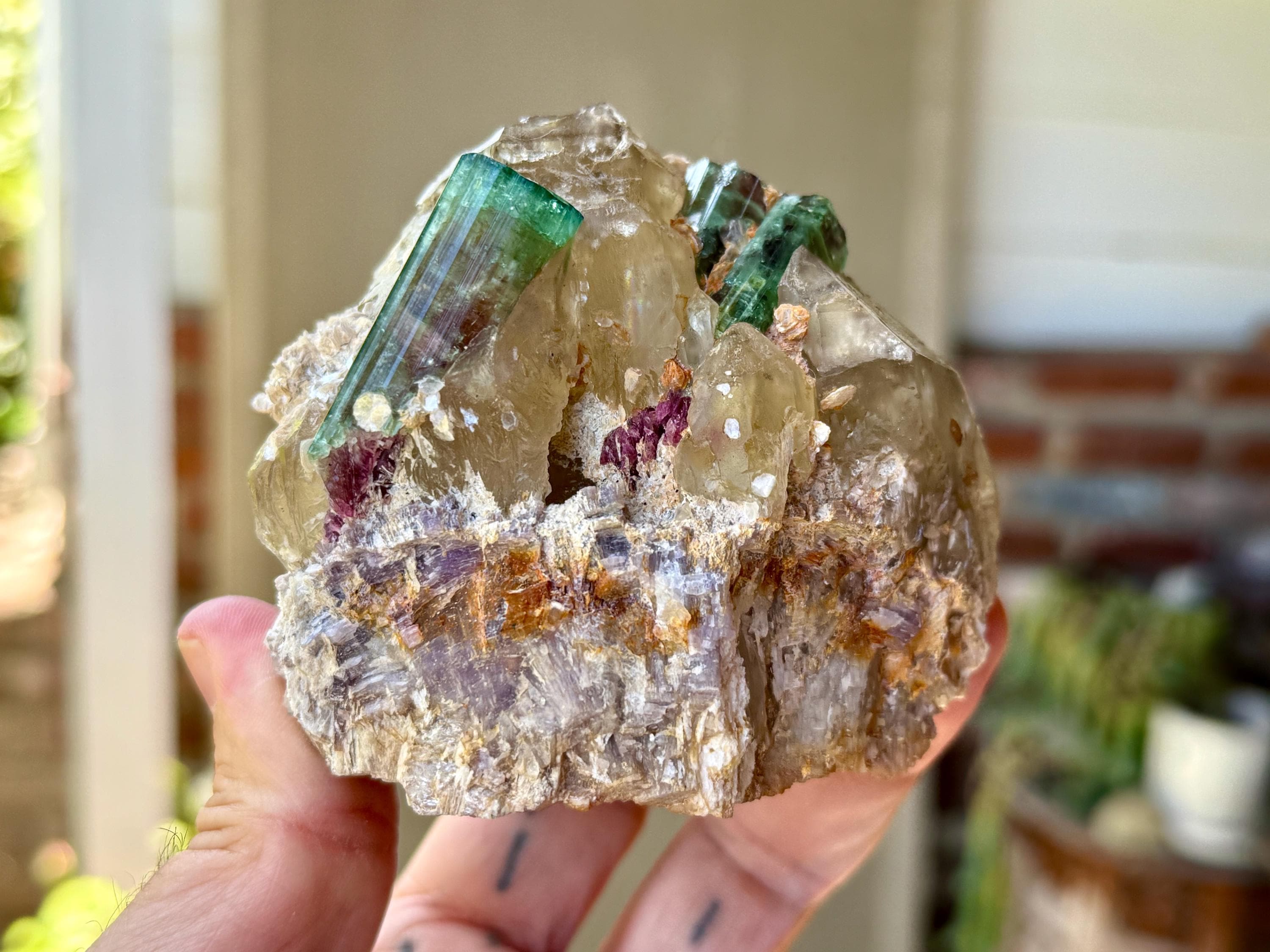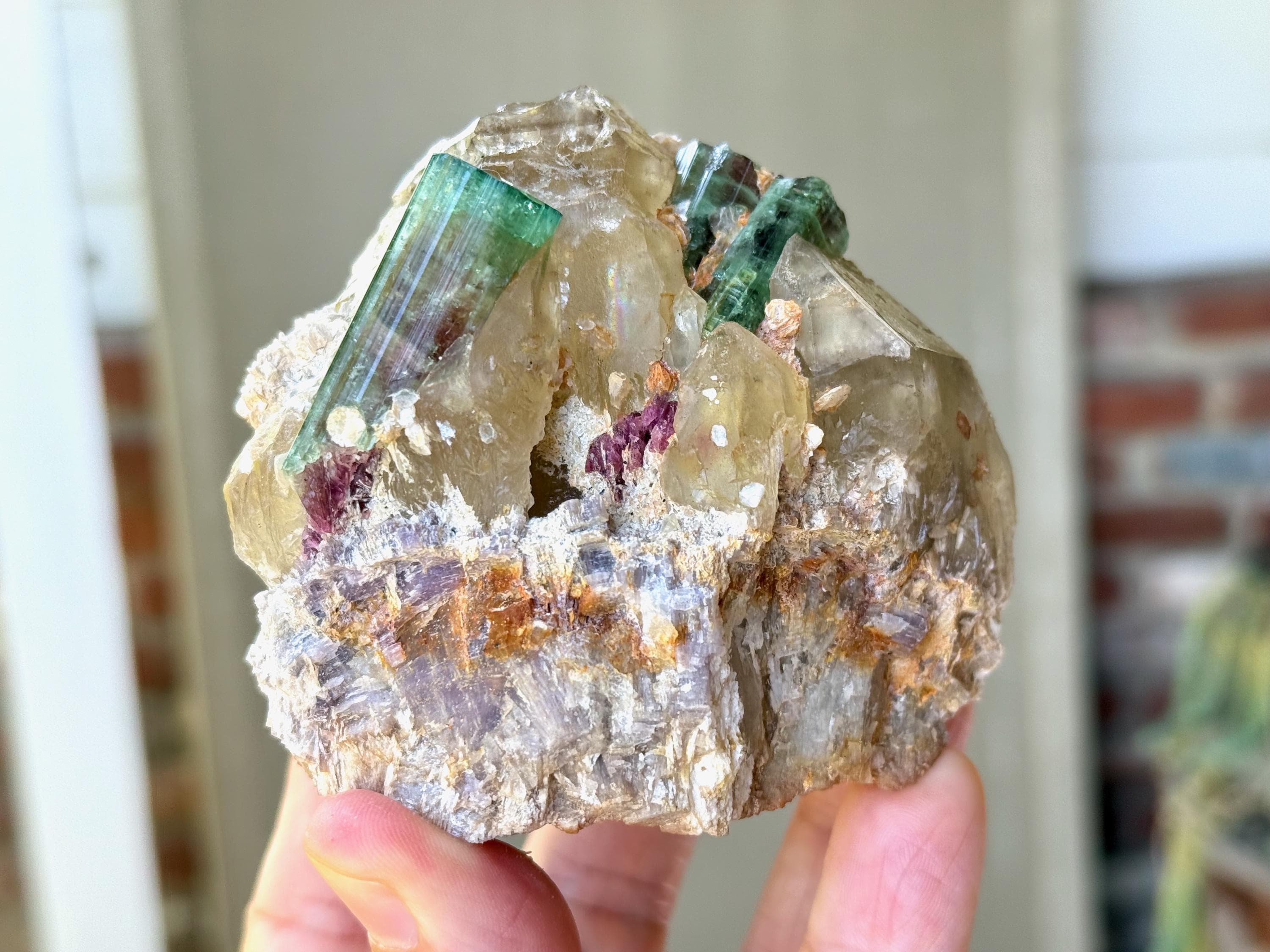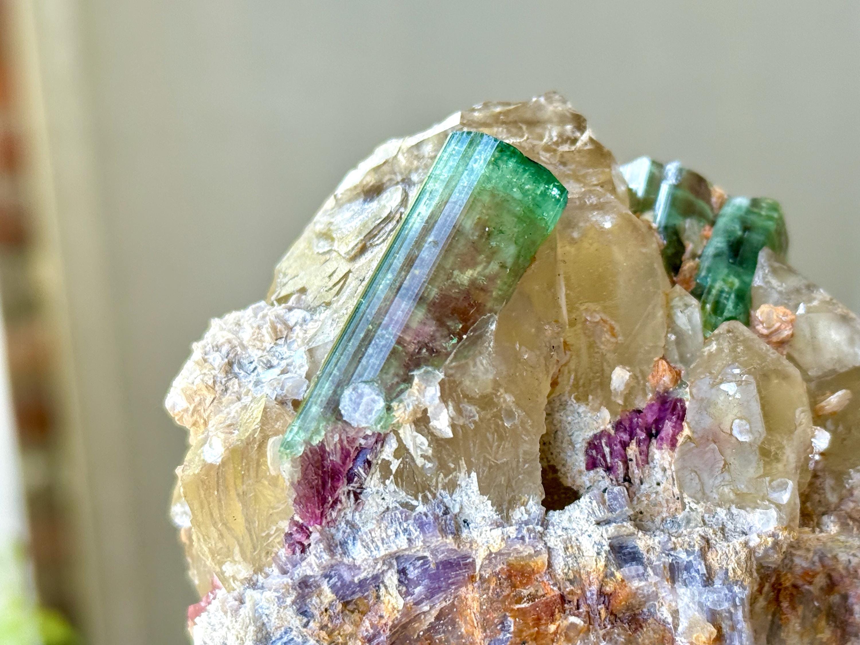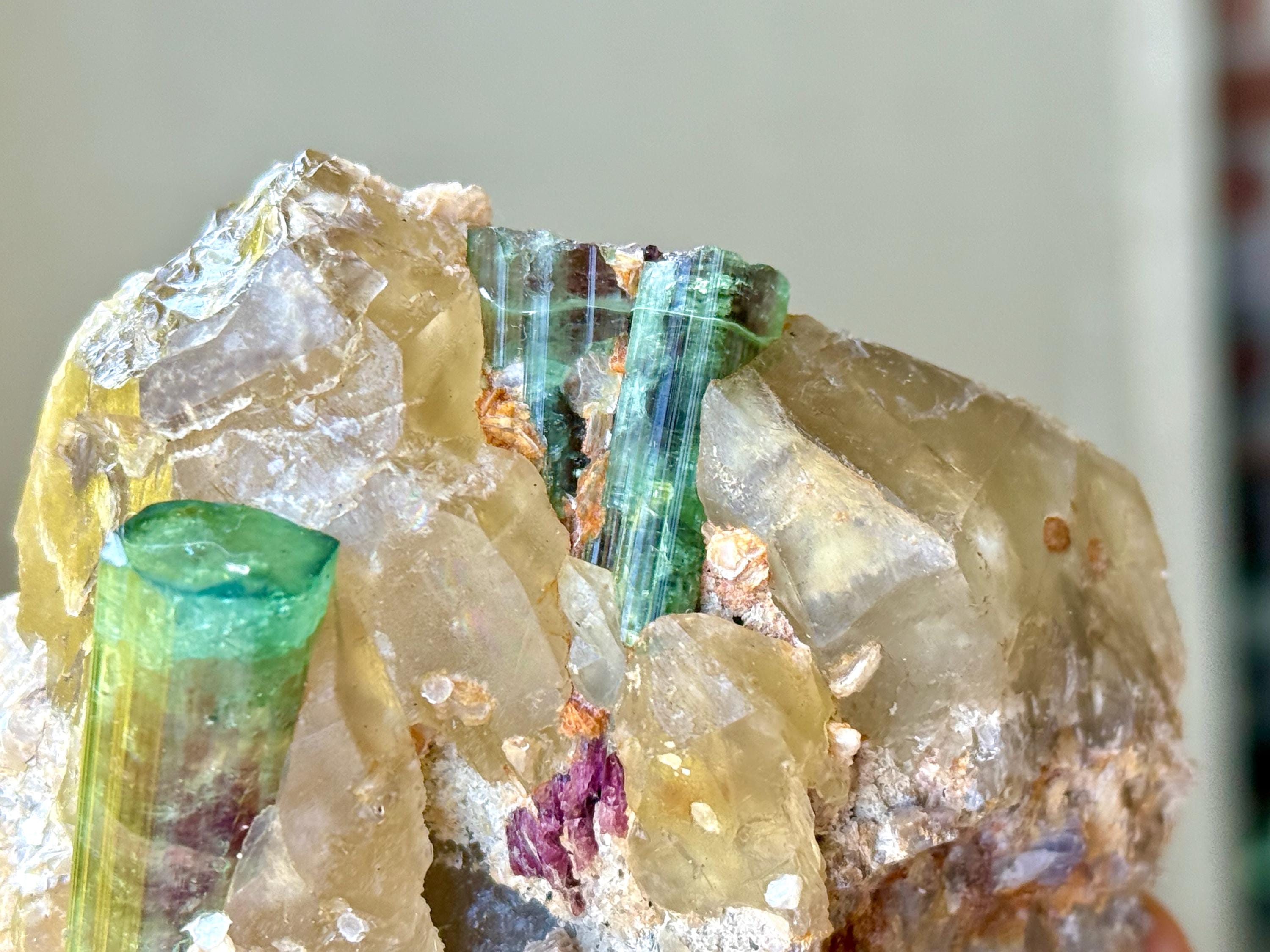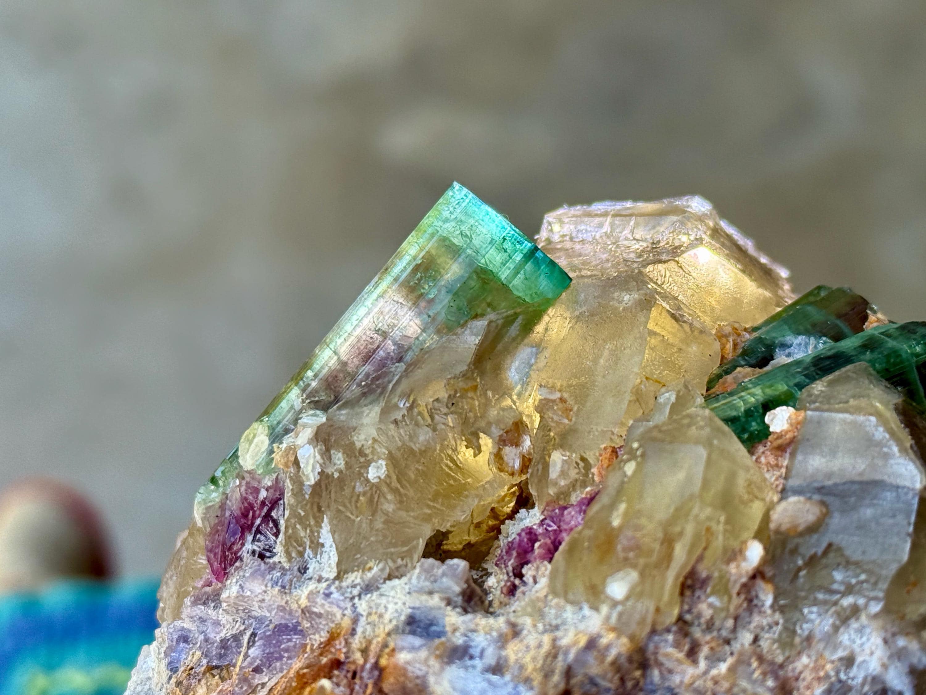 The crystals from this find include unique combinations of Quartz, Citrine, Lepidolite, Albite, Cleavelandite and Feldspar, with vividly colored Tourmalines in lovely hues of green, pink, purple and blue. Crystals with combinations of these minerals are sometimes referred to as "Unicorn Stones."