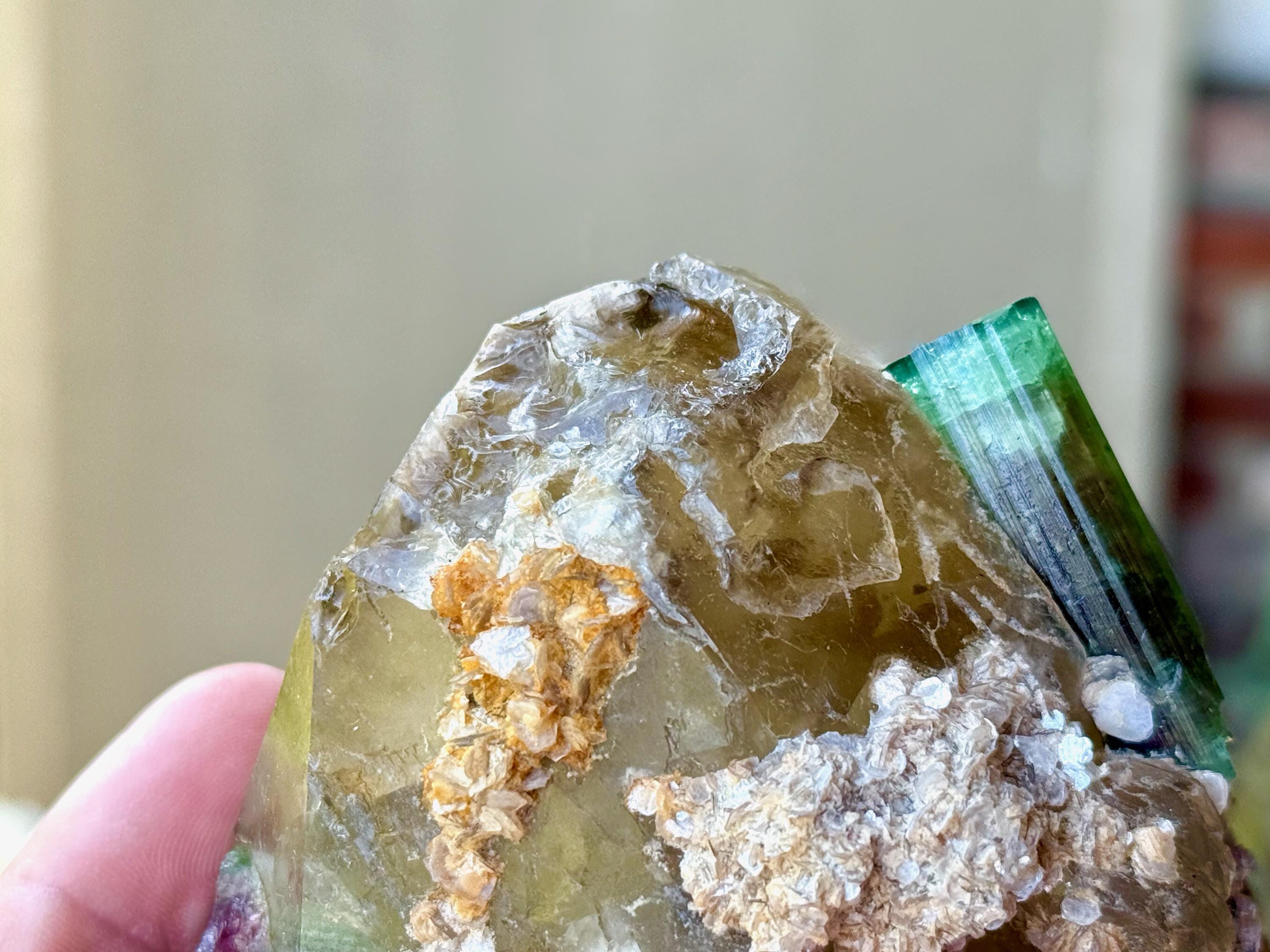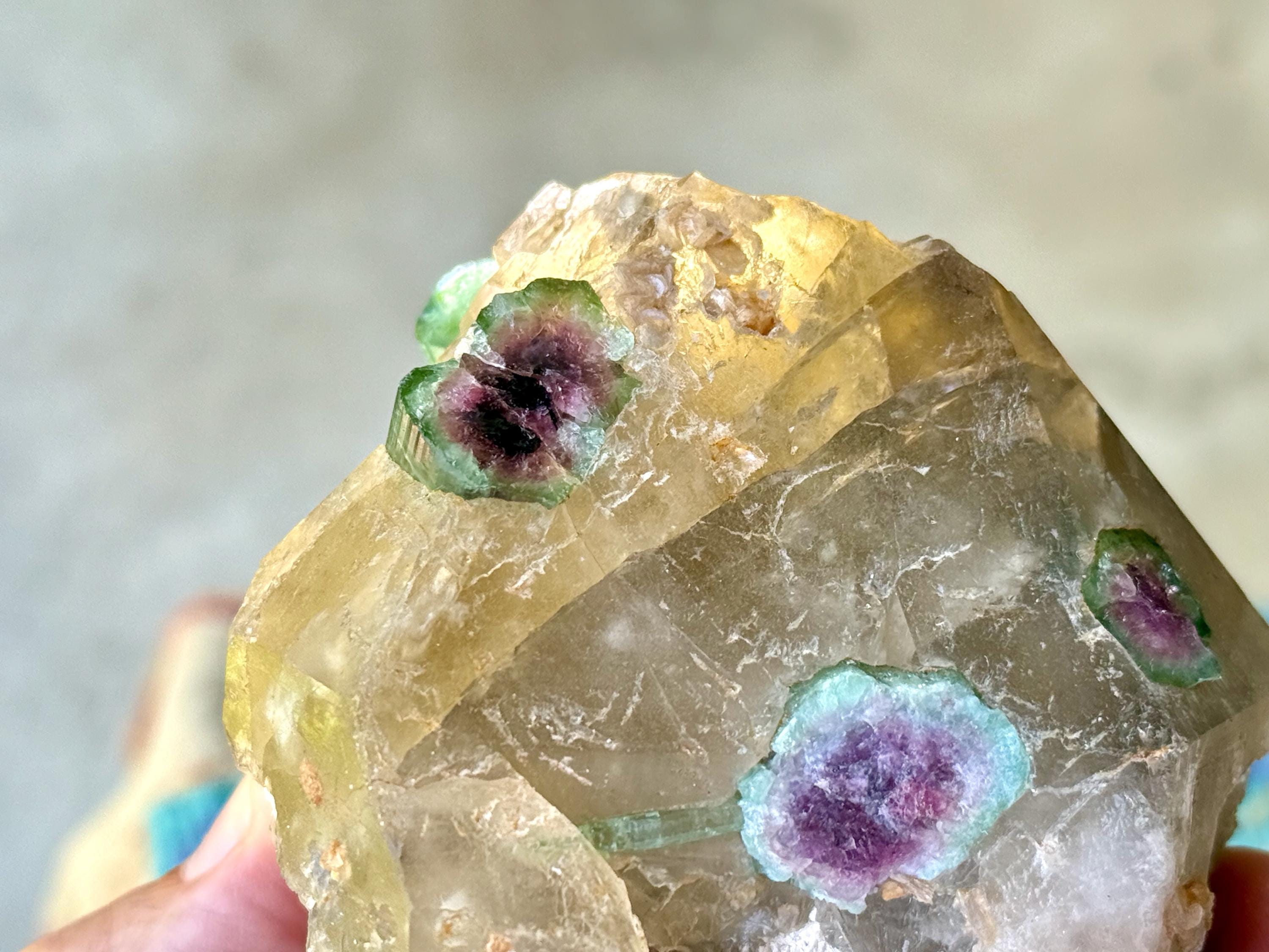 This crystal is primarily Citrine, which possesses a rich golden color and lovely luster. Embedded throughout are vividly colored Watermelon Tourmalines, with juicy pink centers and bright green skins. When we backlight these crystals, they truly come to life, and we can even see a blue layer at the top of at least one (Photos 3-4). What's nice is that these Tourmalines have such great color, they display beautifully even if not backlit.