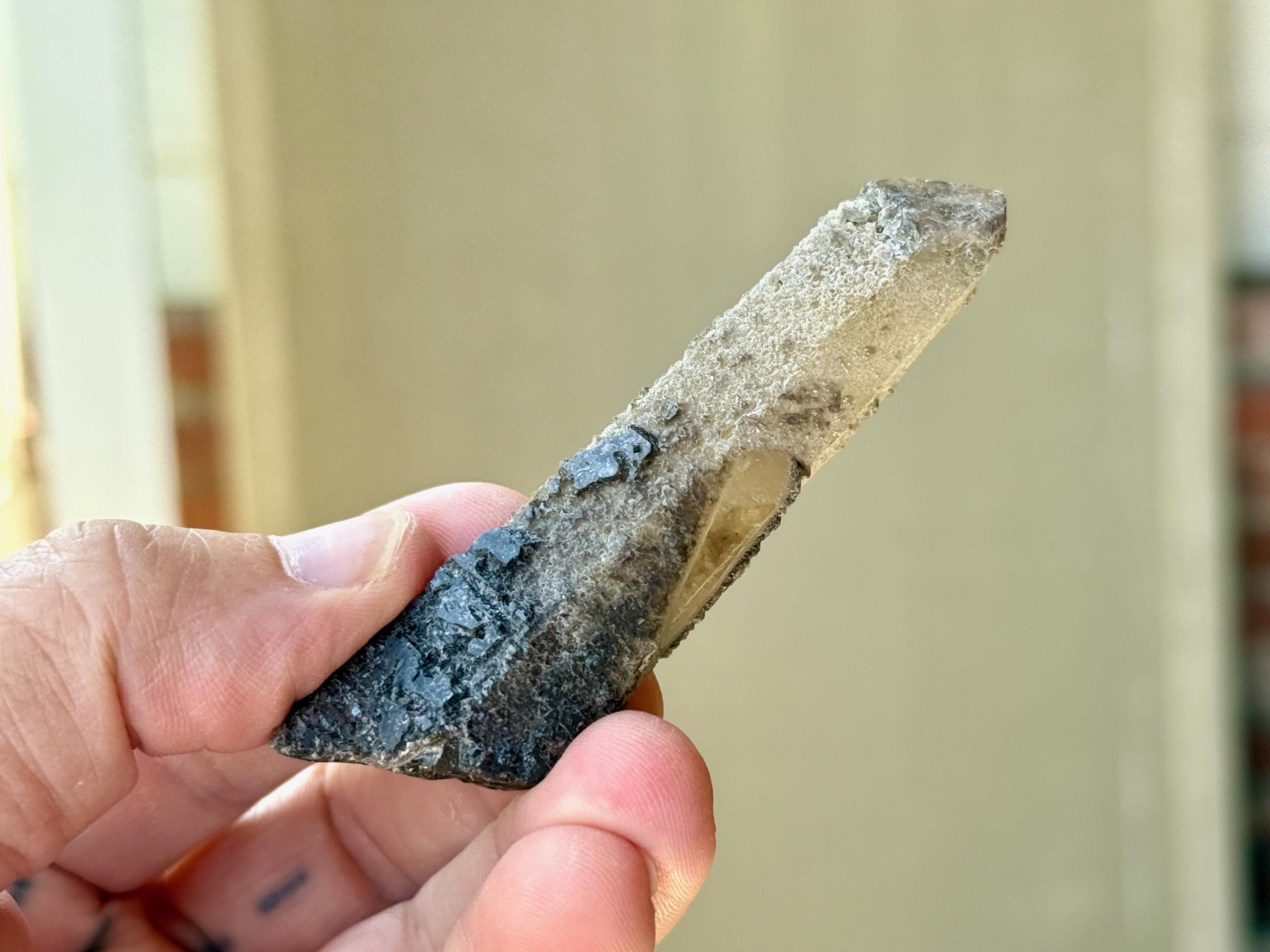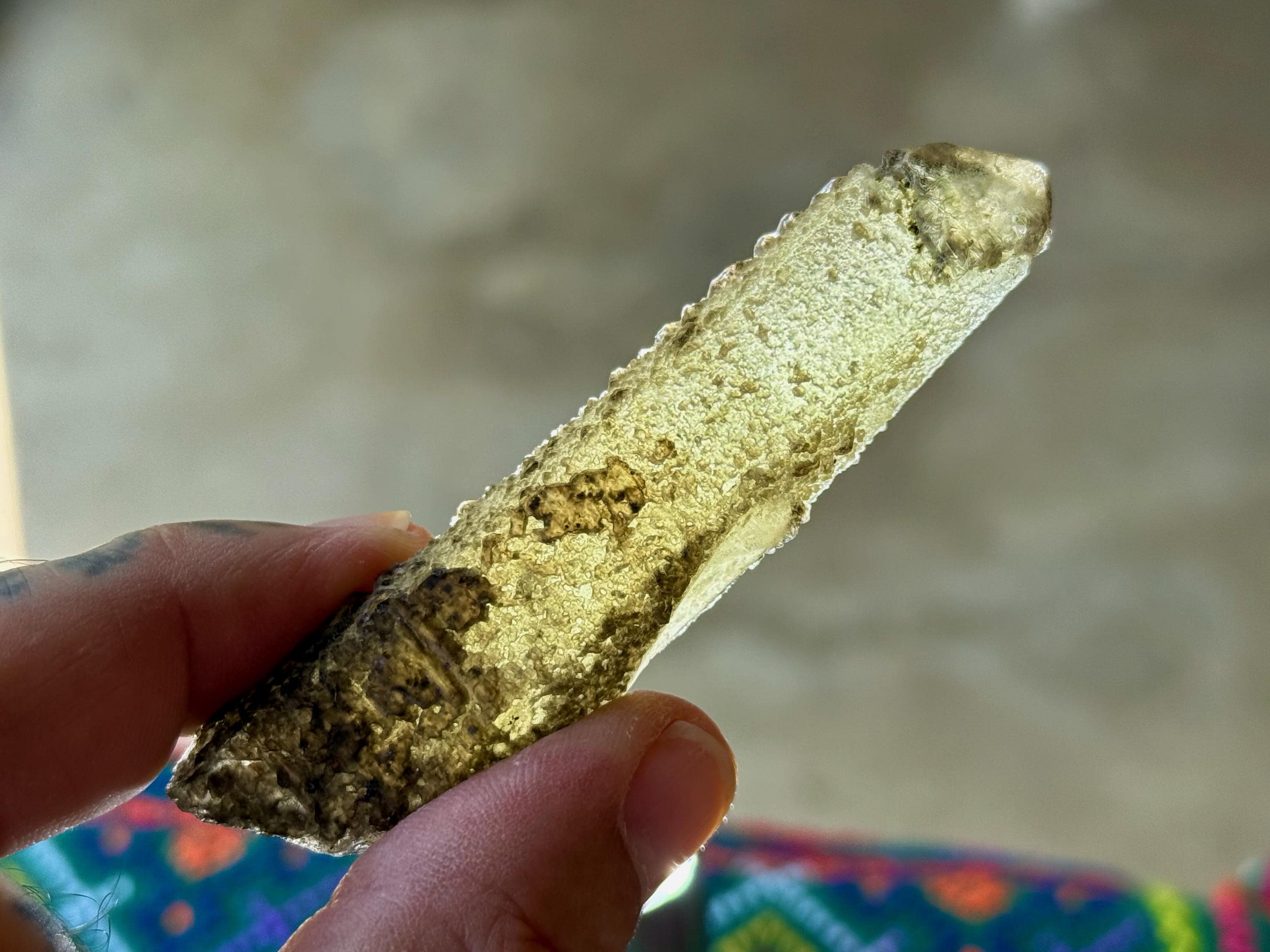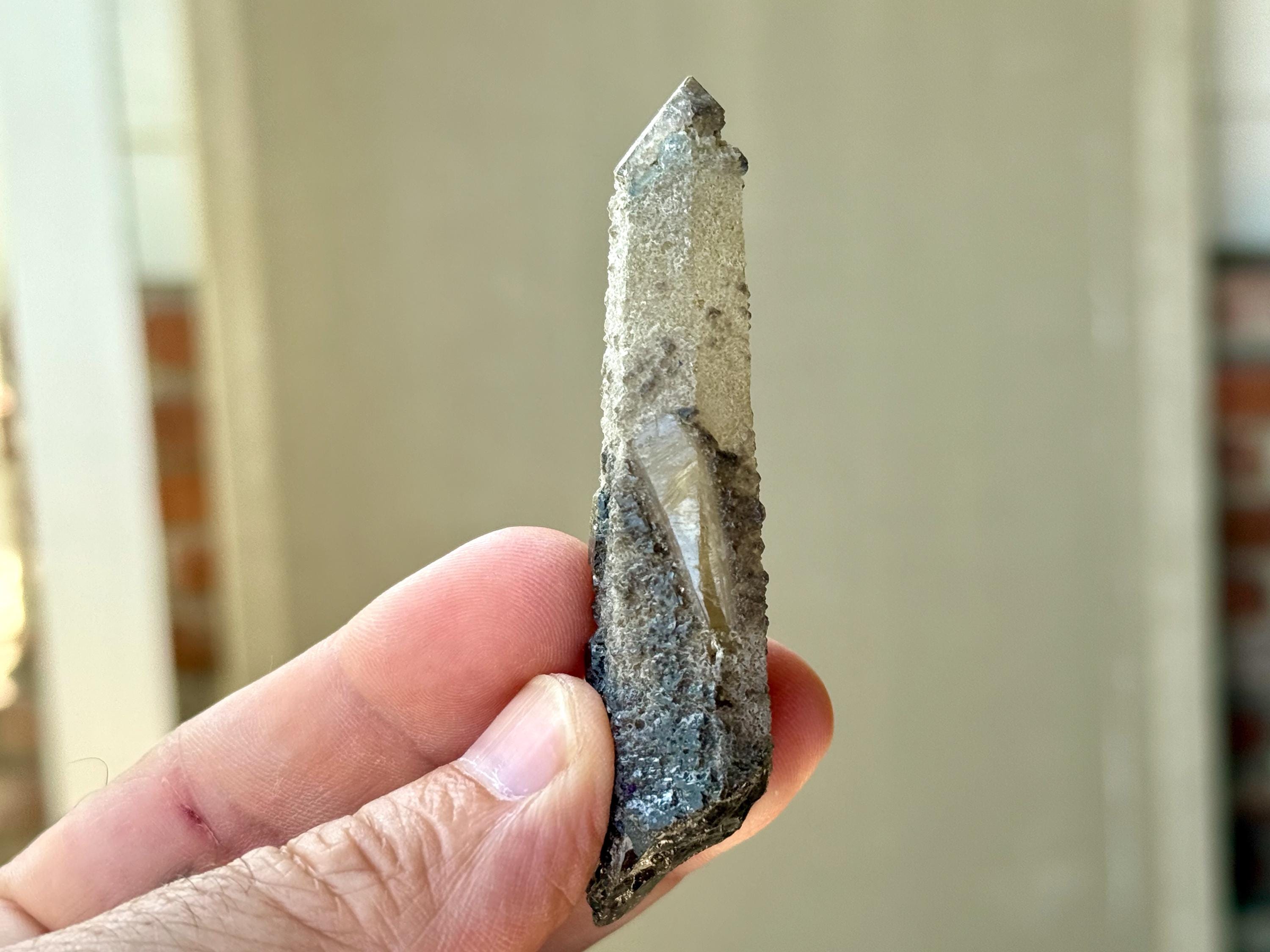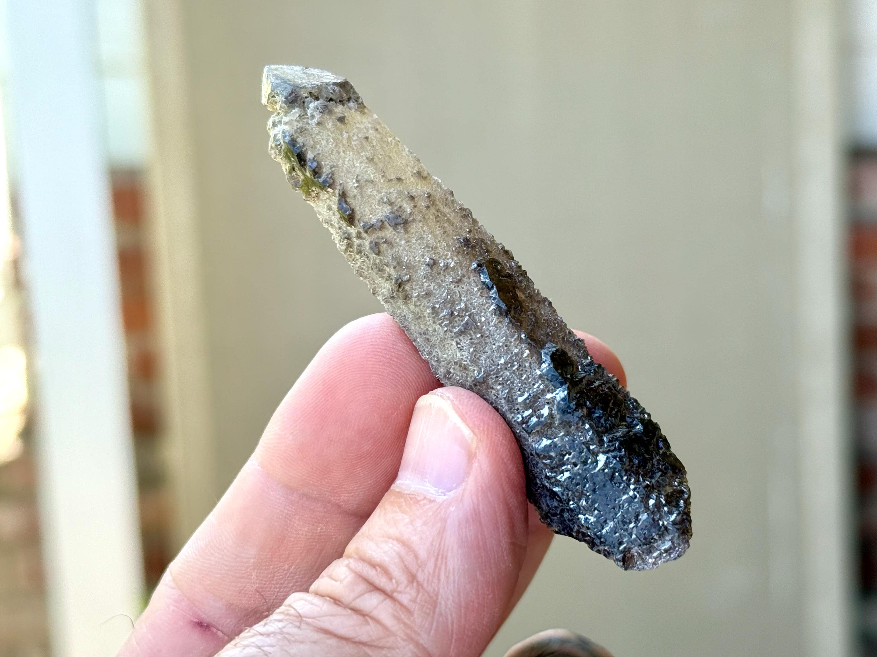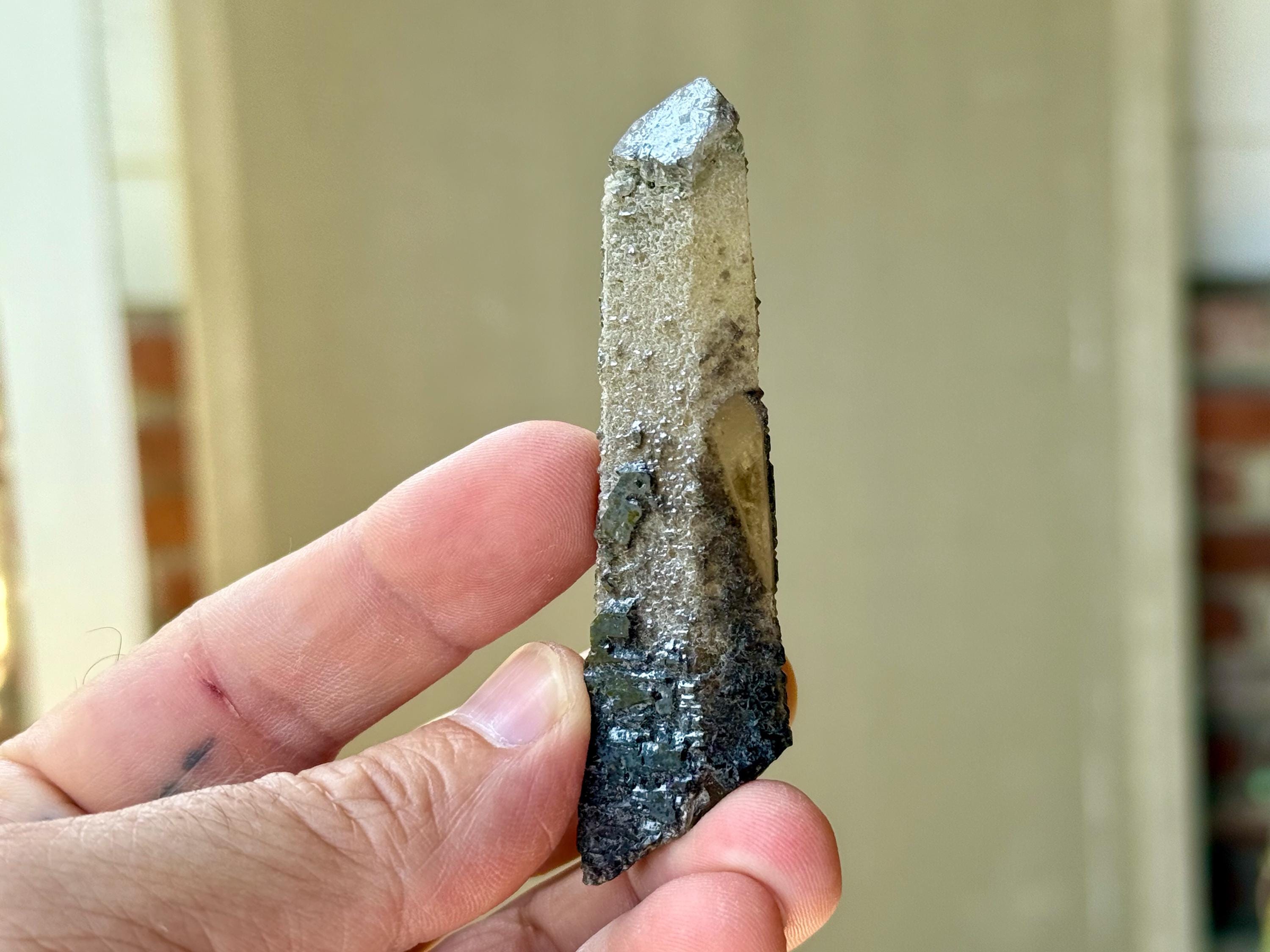 Unique textures to this elongated Smoky Quartz crystal with a mild greenish hue due to Hedenbergite inclusion. When backlit, as in Photos 2-3, this crystal shows just how well it passes light. Love the lustrous smoky overgrowth on the exterior, as well. Excellent termination to this one!