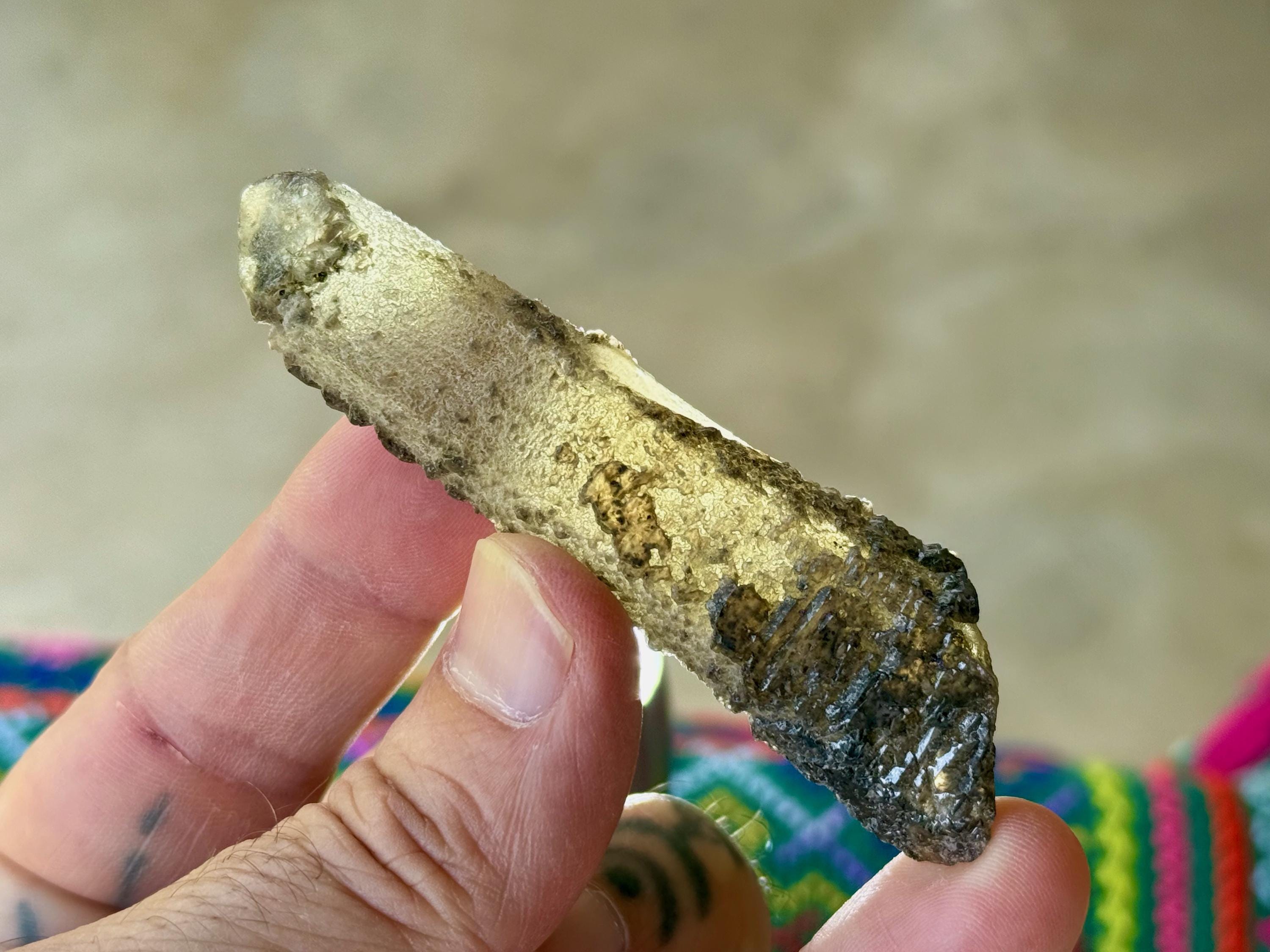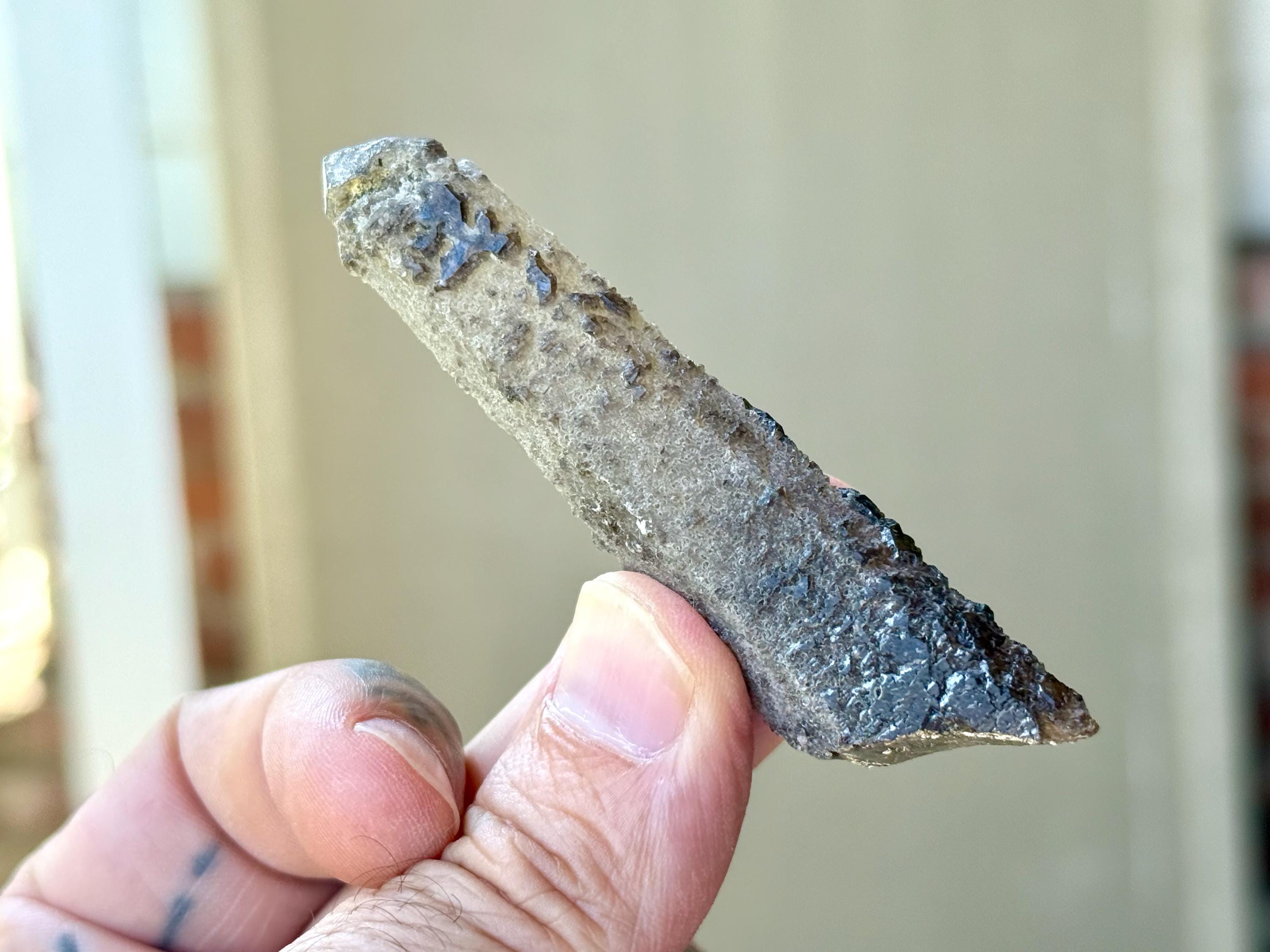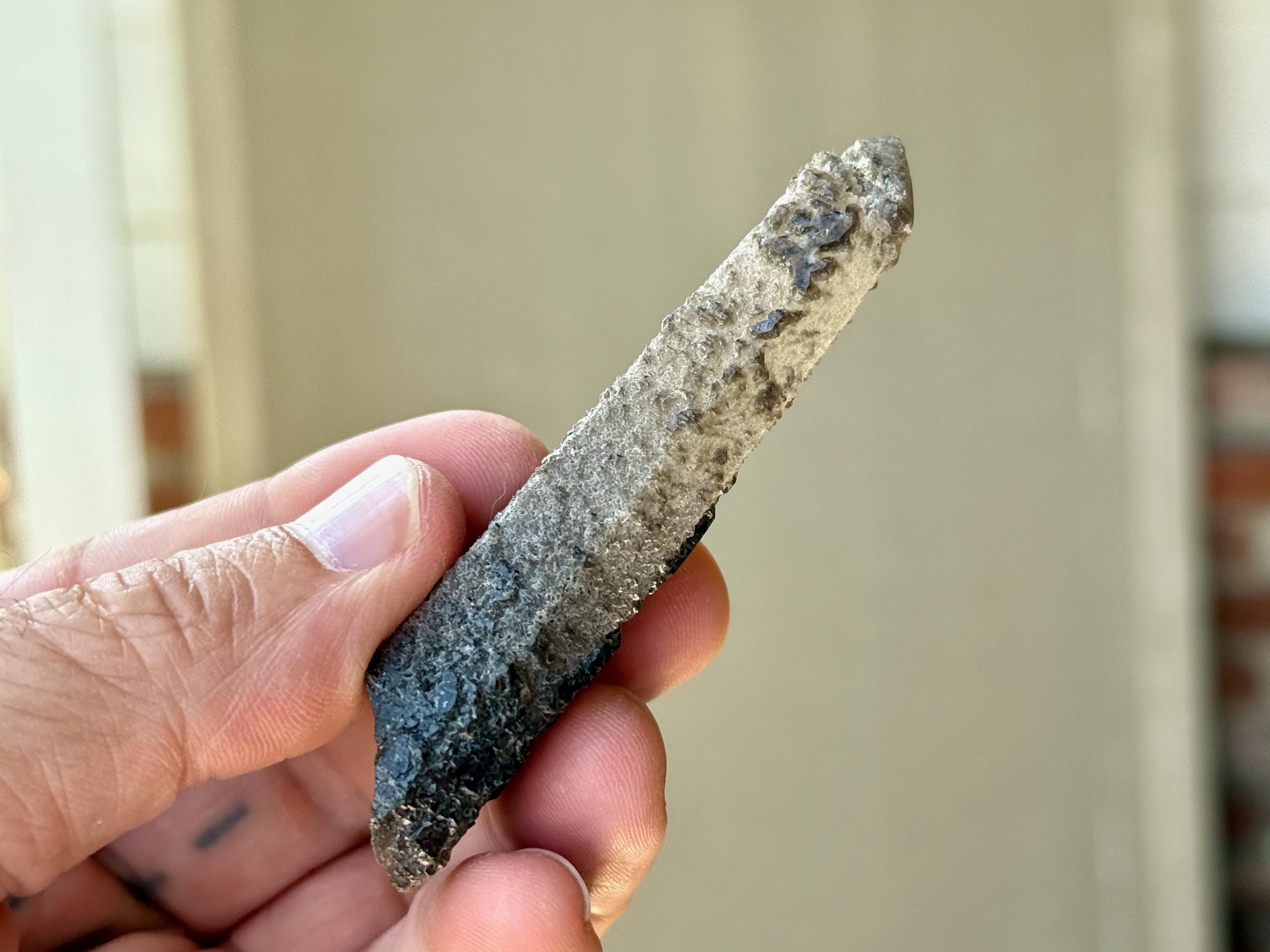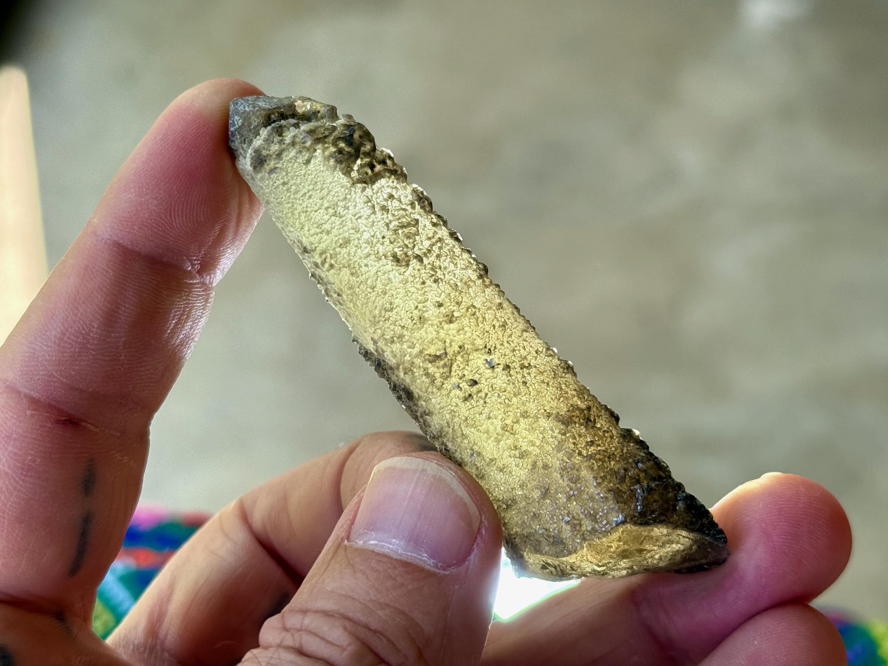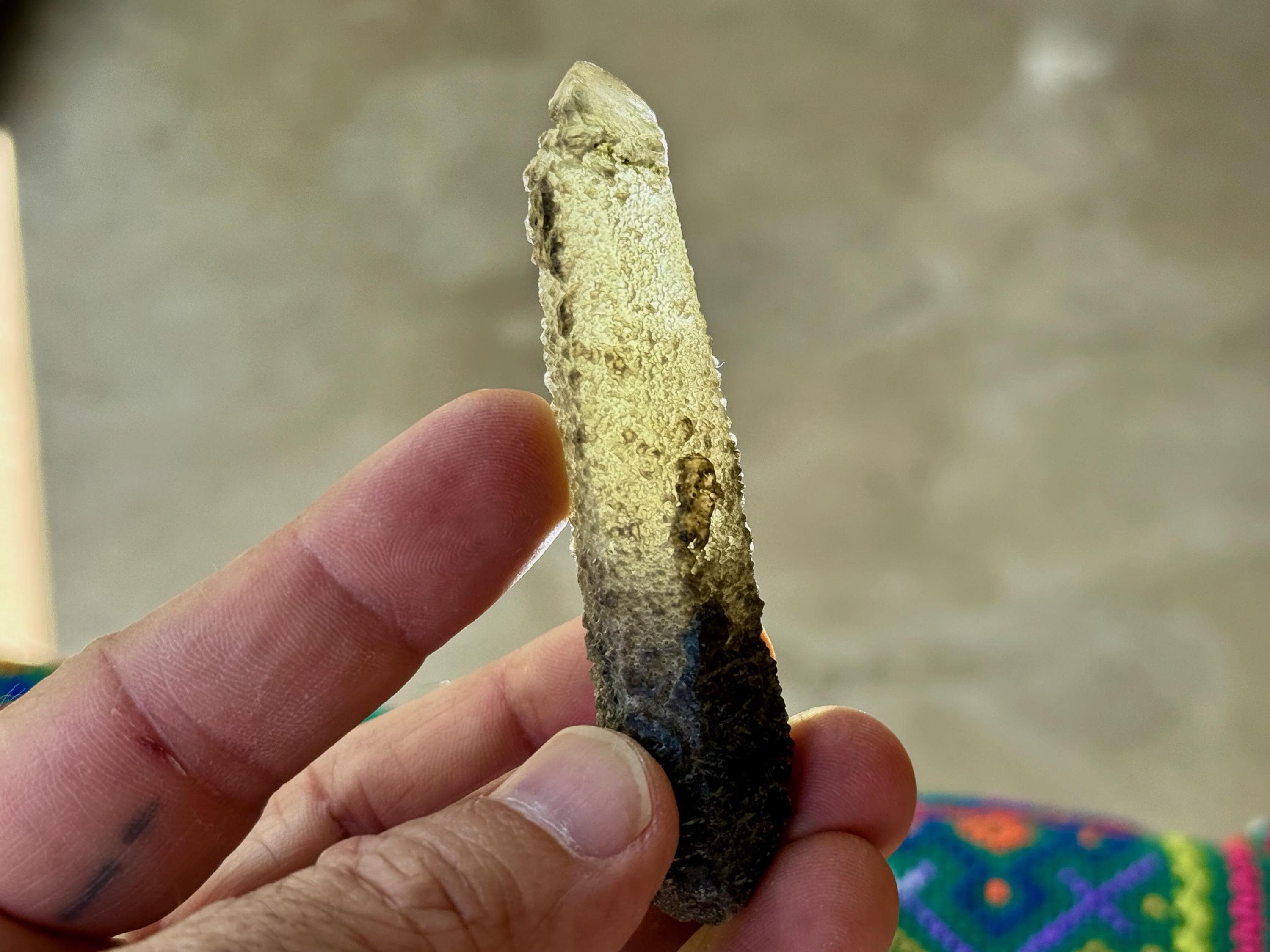 Unique textures to this elongated Smoky Quartz crystal with a mild greenish hue due to Hedenbergite inclusion. When backlit, as in Photos 2-3, this crystal shows just how well it passes light. Love the lustrous smoky overgrowth on the exterior, as well. Excellent termination to this one!