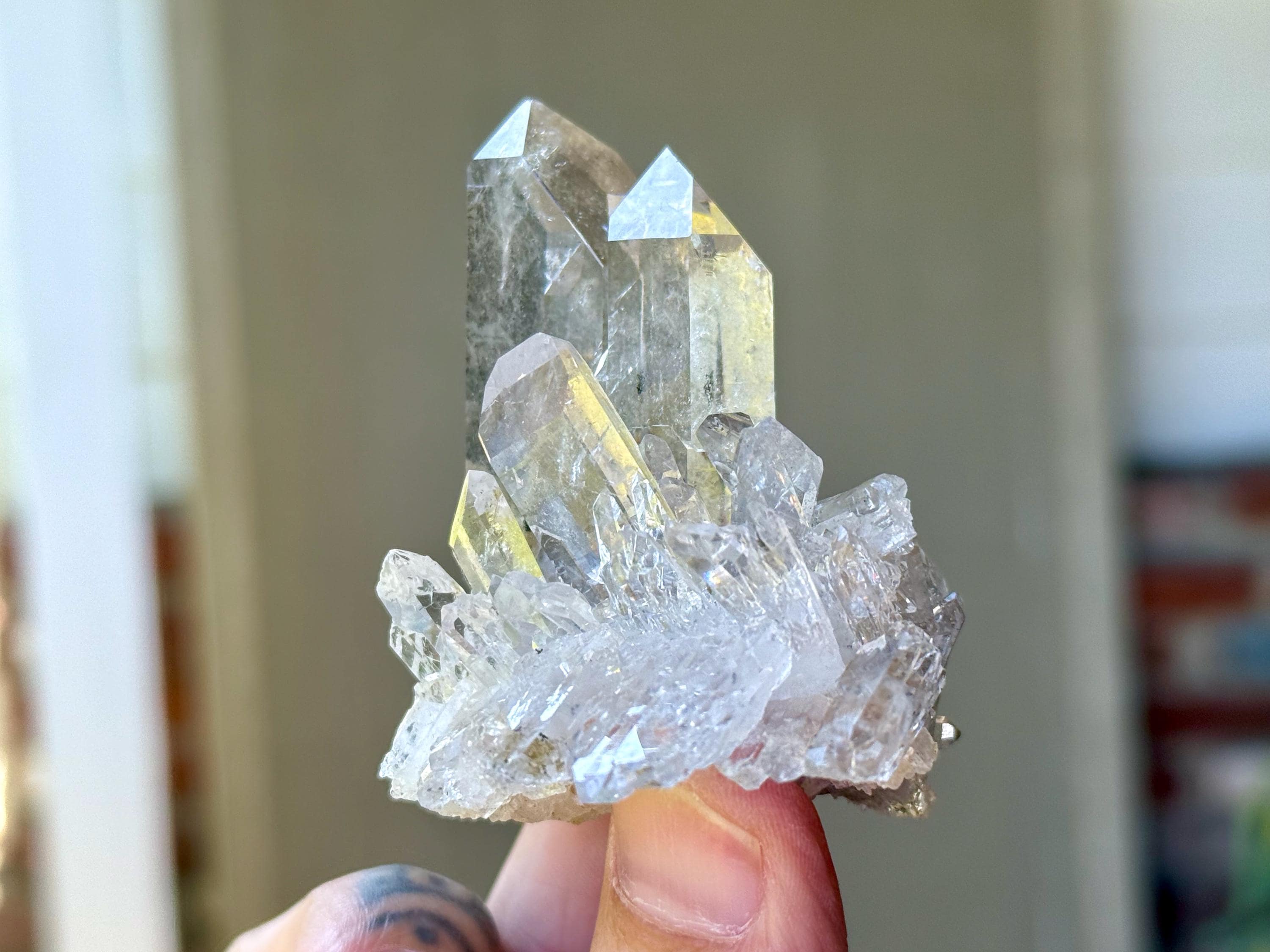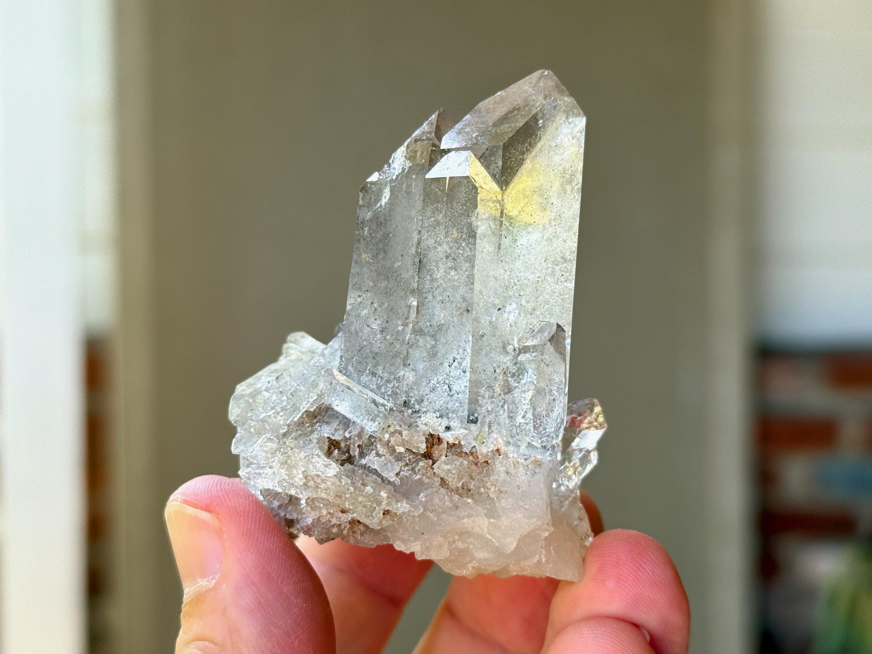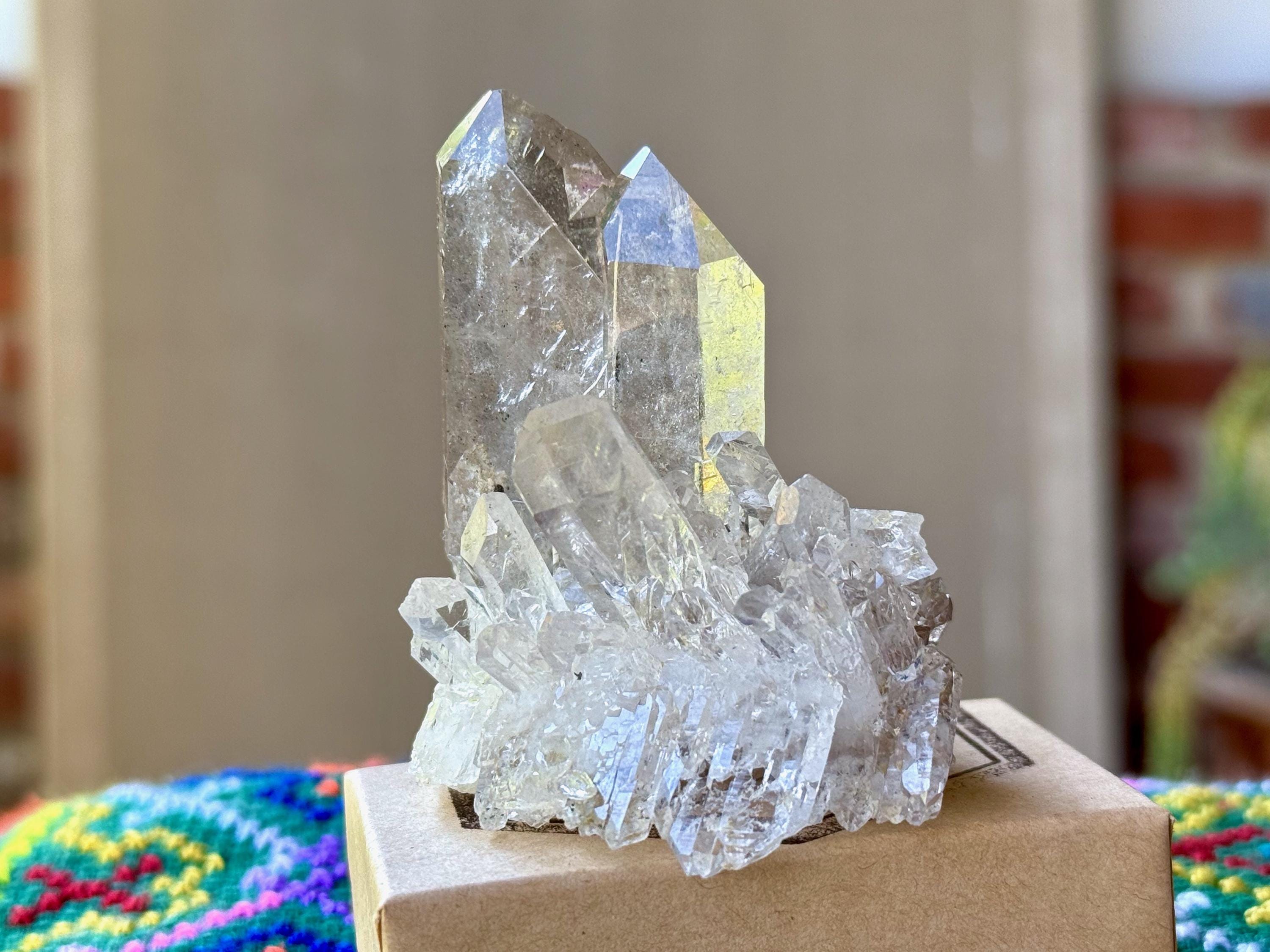 Outstanding quality to this lustrous and water clear Cathedral Faden Quartz crystal. This piece exhibits a very aesthetic Tantric Twin formation that sits amidst a beautiful cluster of smaller crystals at the base. When we look closely, we can see the cloudy Faden line that divides this cluster, with the crystal above the line growing upward and those below it growing outward. This outward growth creates a "platform" allowing the crystal to sit upright nicely on its own.