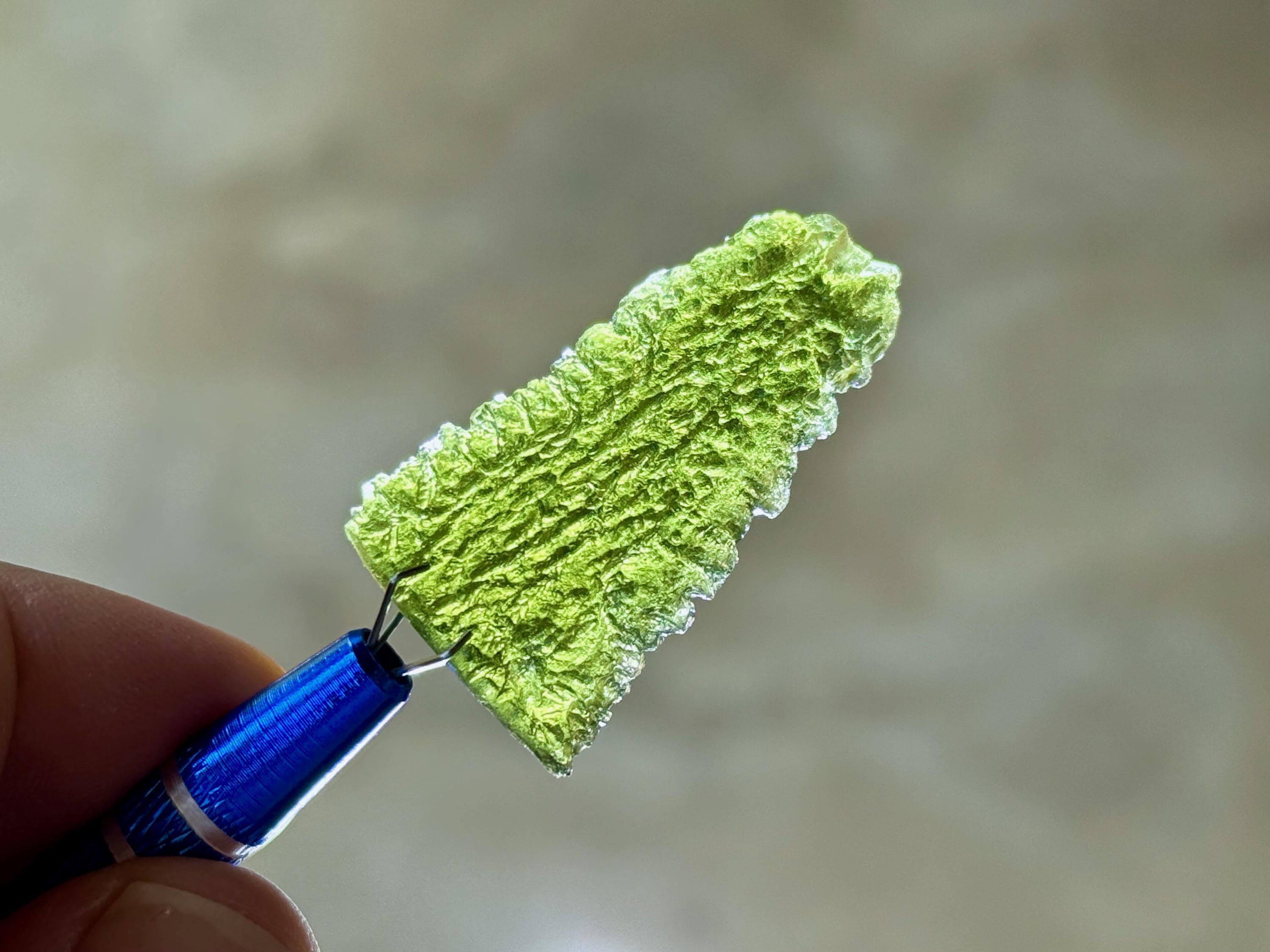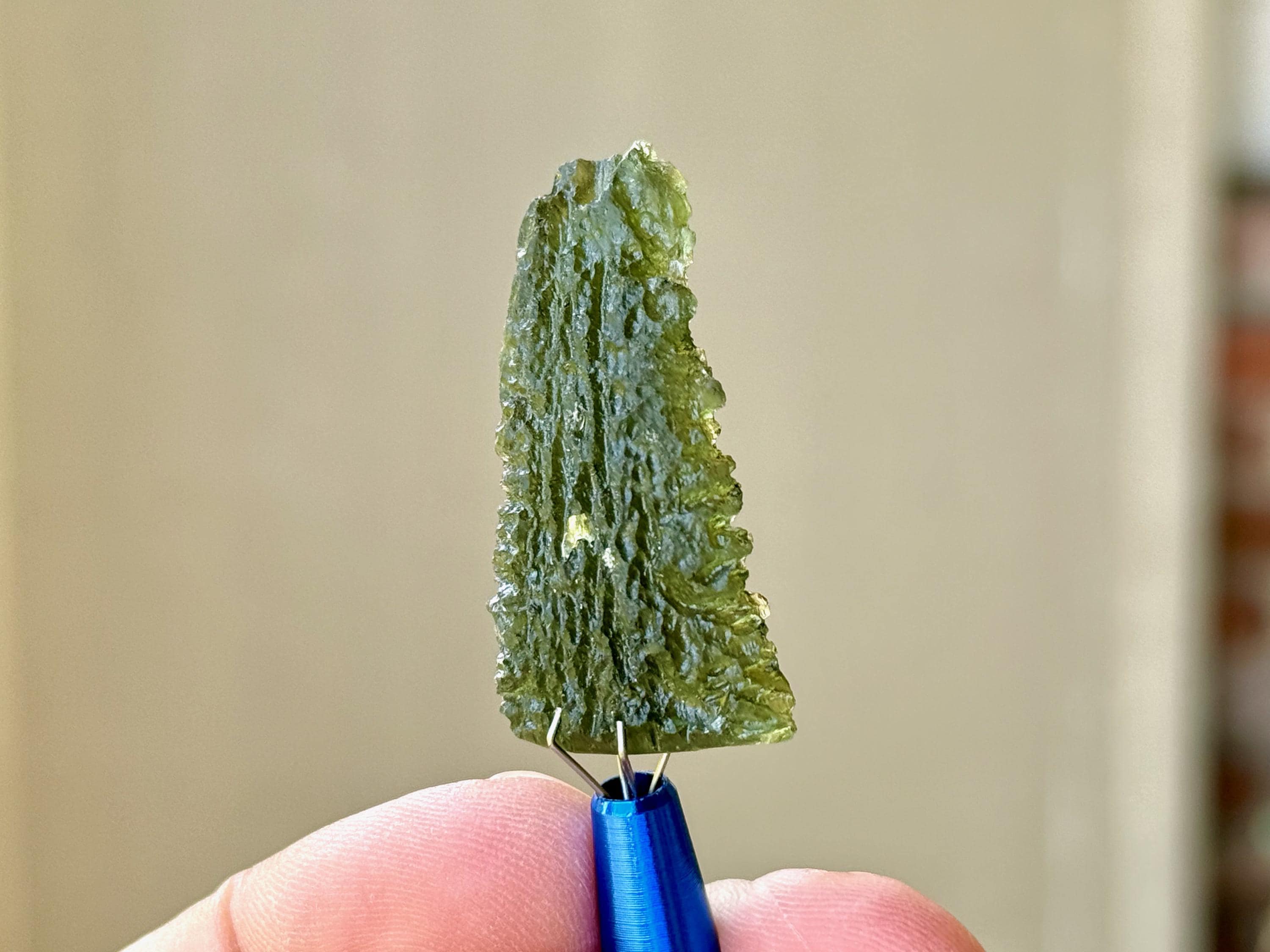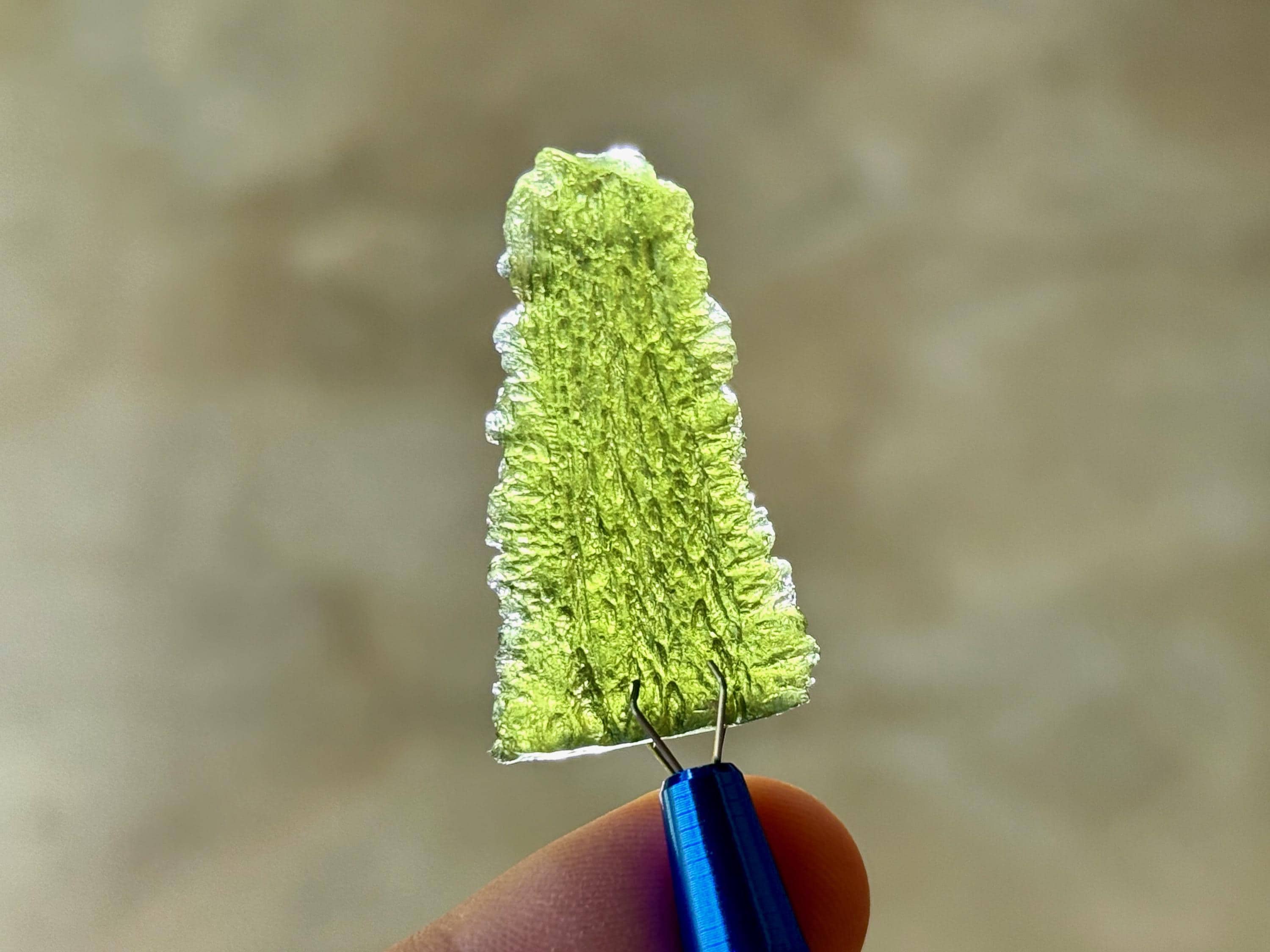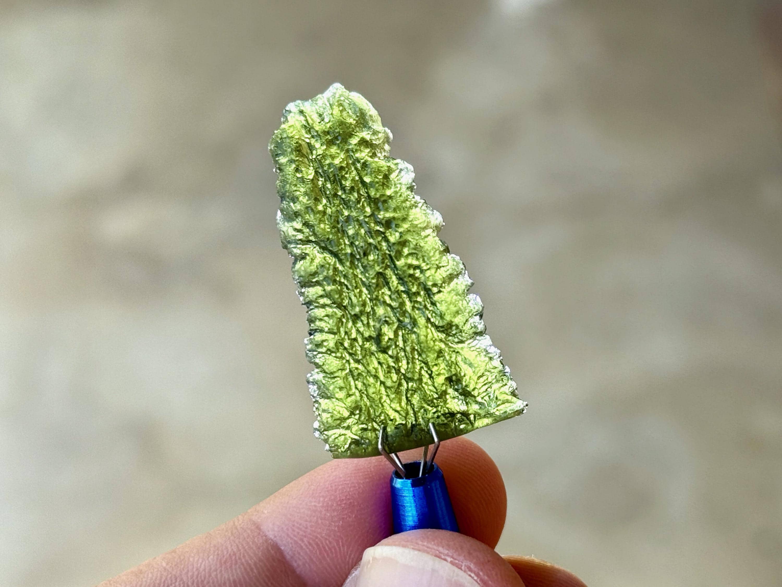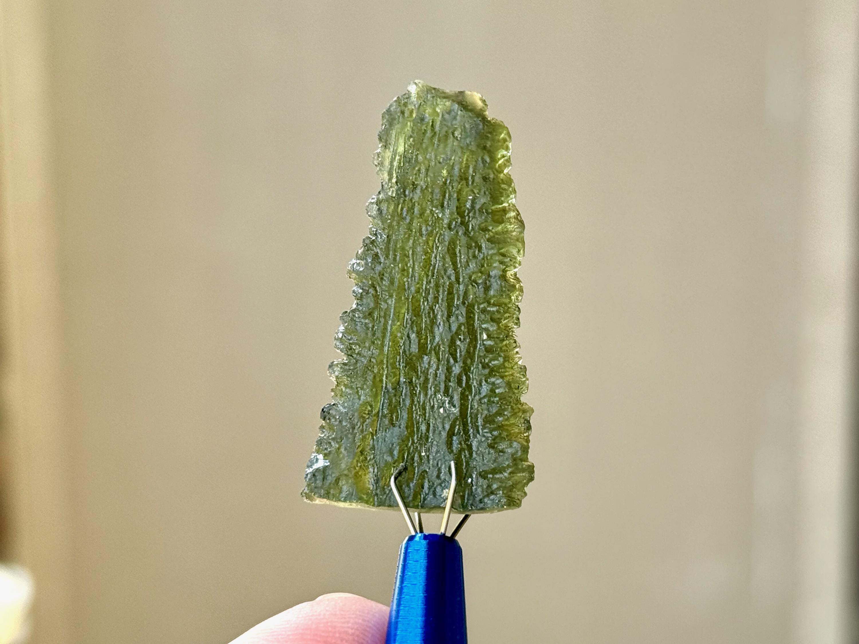 A stunning, natural Moldvatite crystal in a desirable, elongated "leaf" formation! This crystal displays magnificent textures and a vibrant green color. When backlit, we can see the color and translucency really come to life (see Photos 3-5).