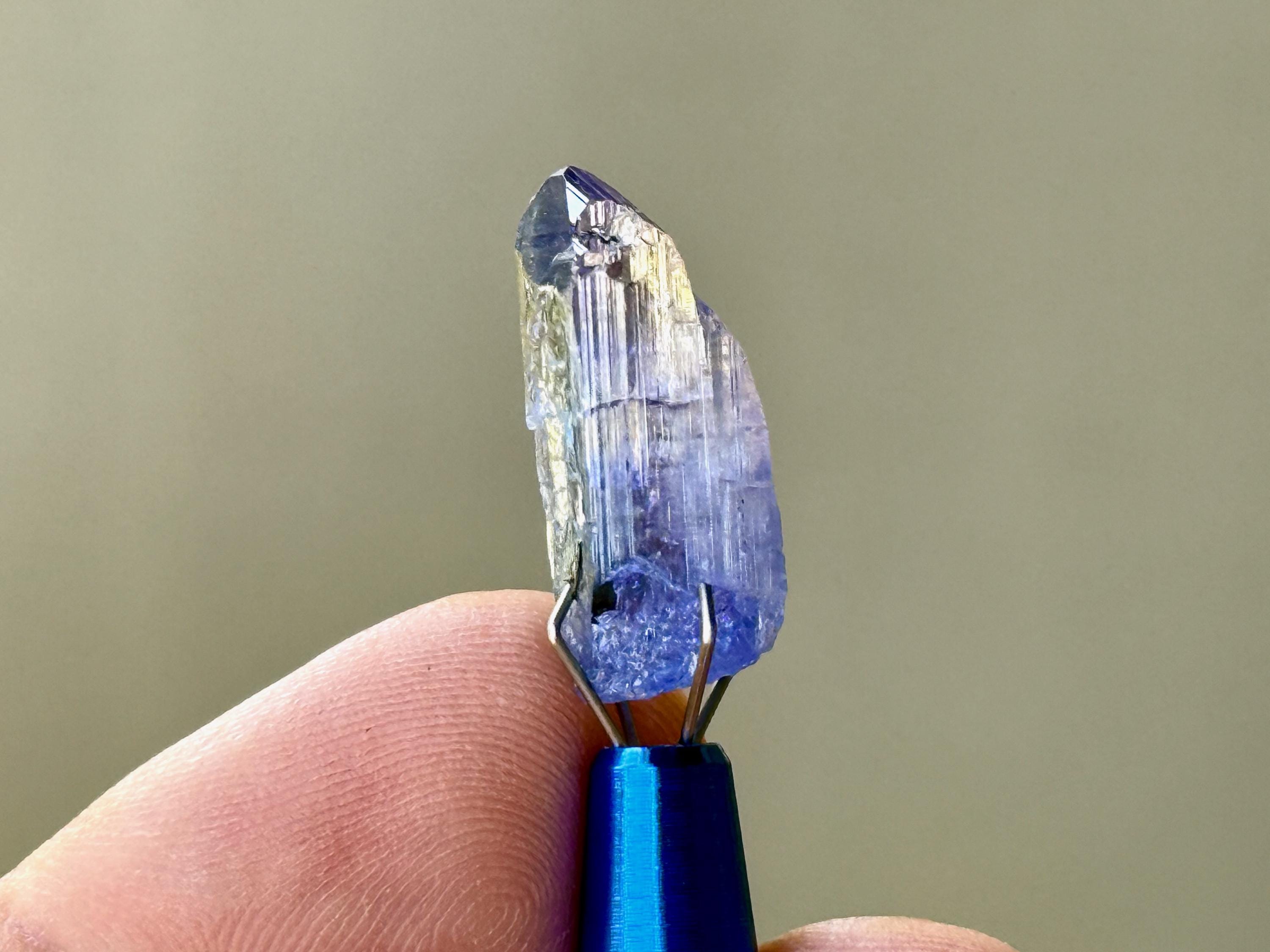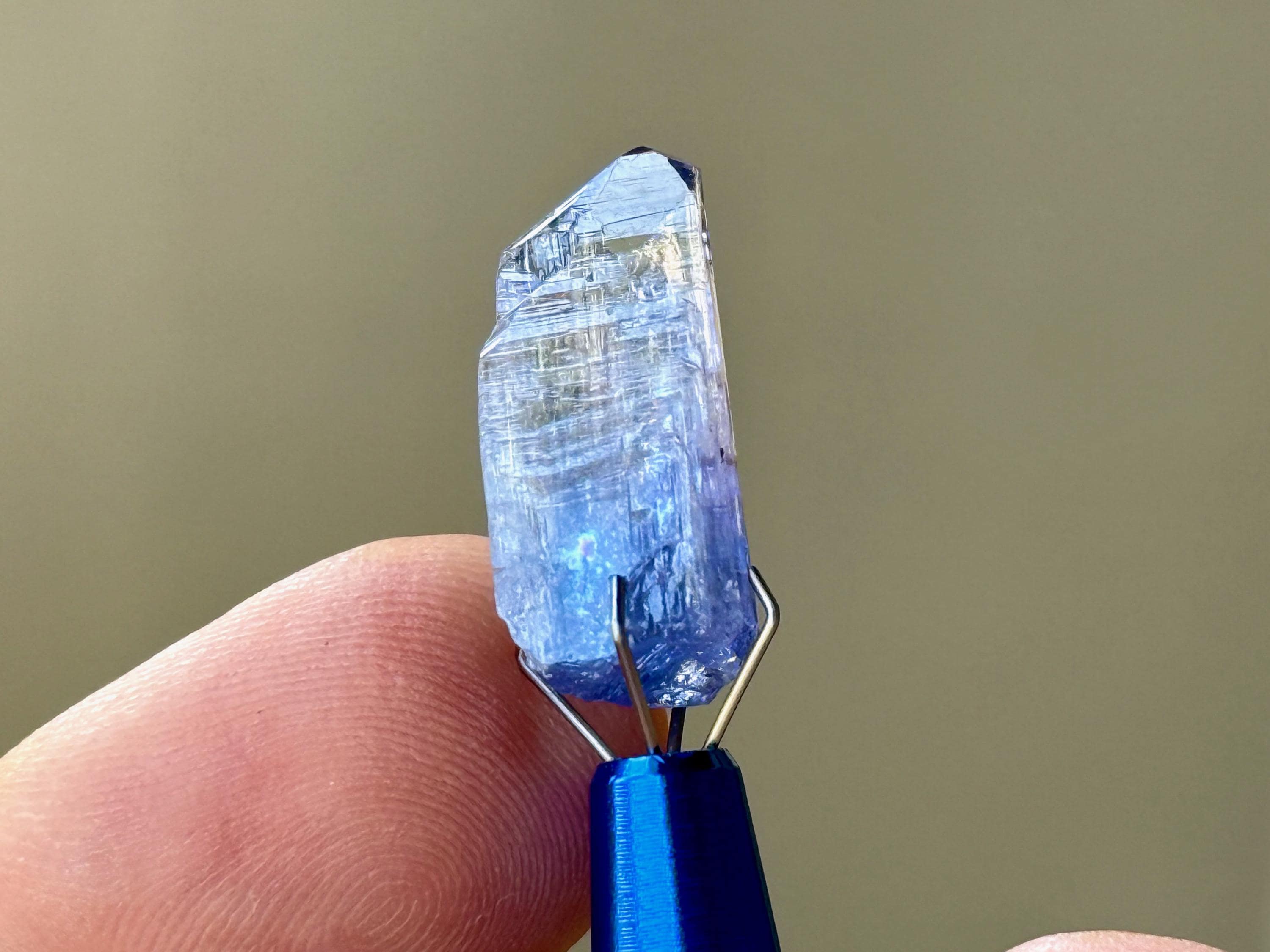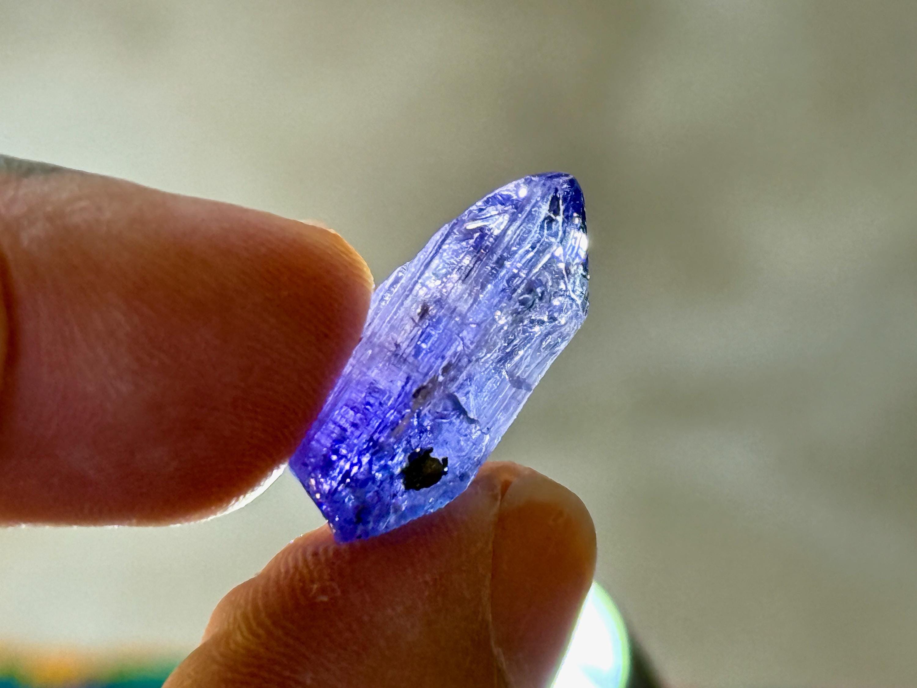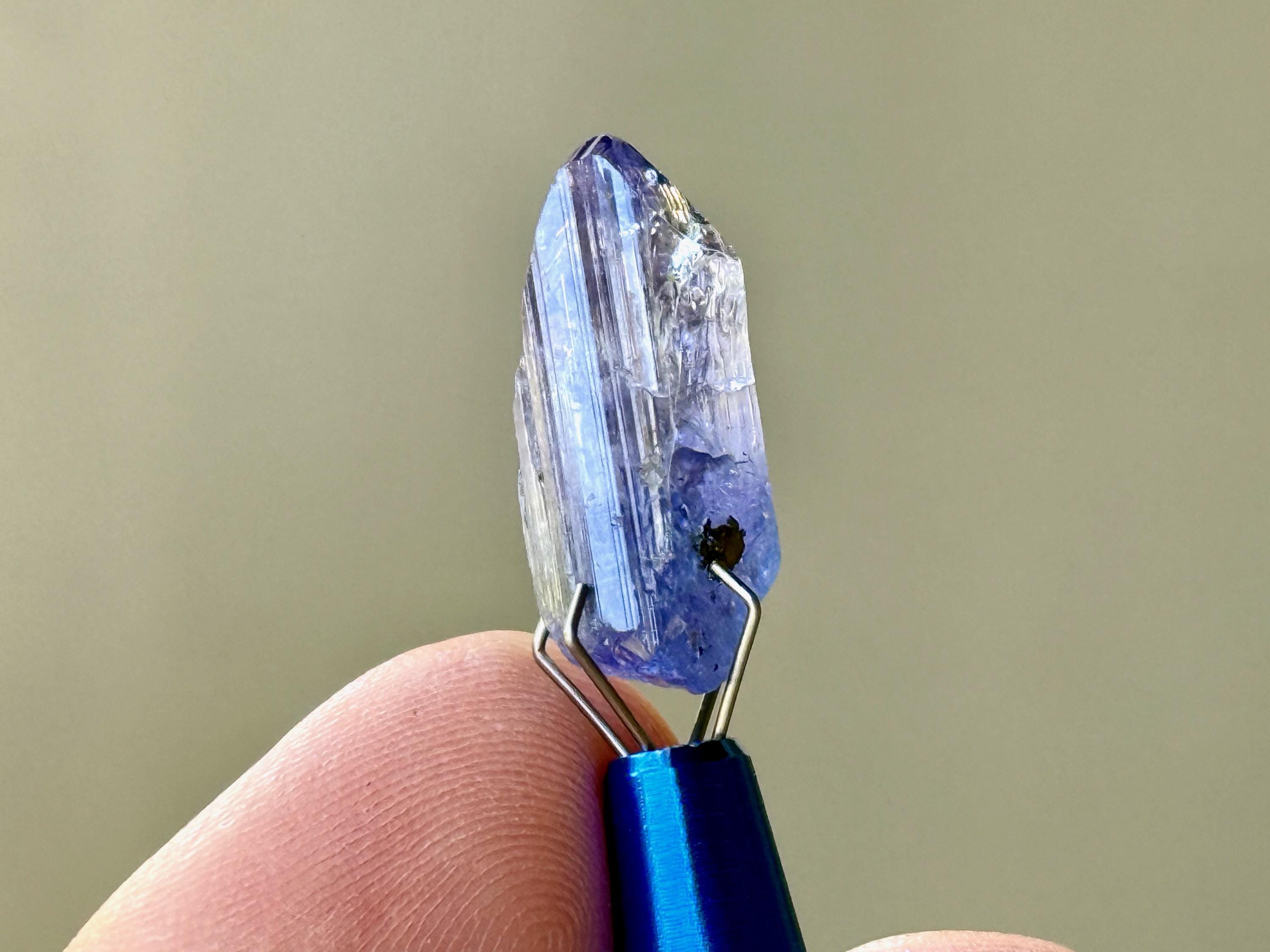 There is a chip to the body of this crystal which can be seen in Photo 5. However, the termination is intact and excellent. Outstanding quality to this stunning Tanzanite!