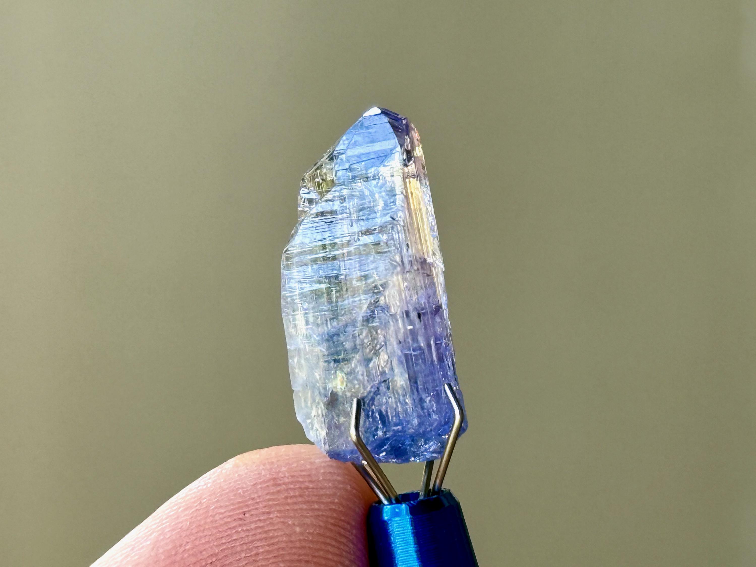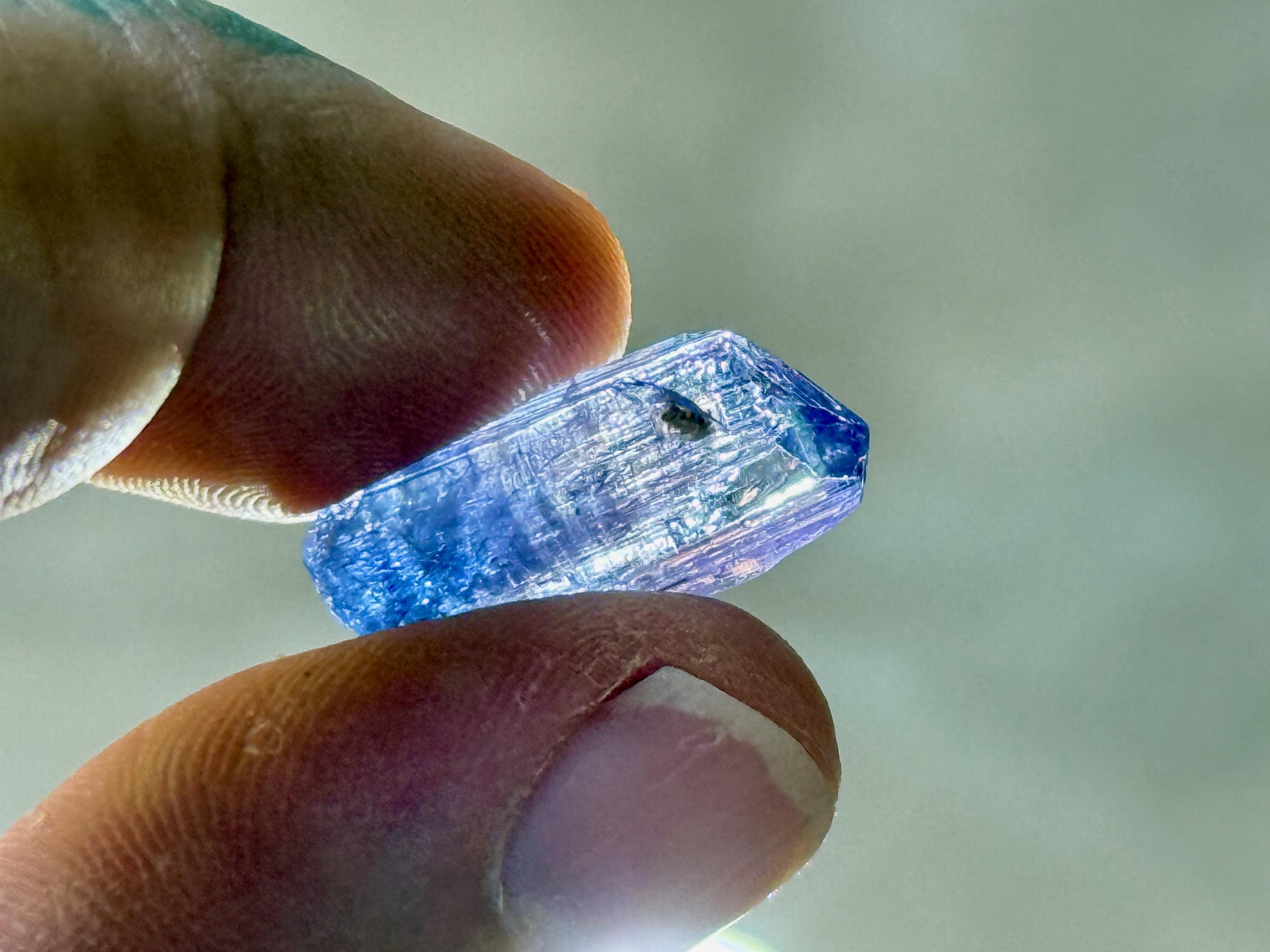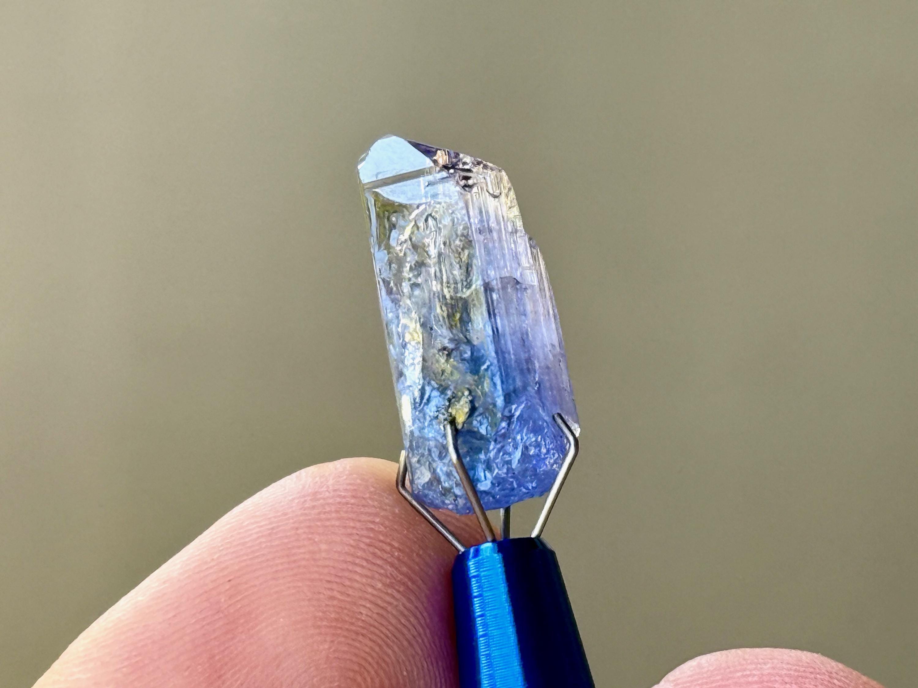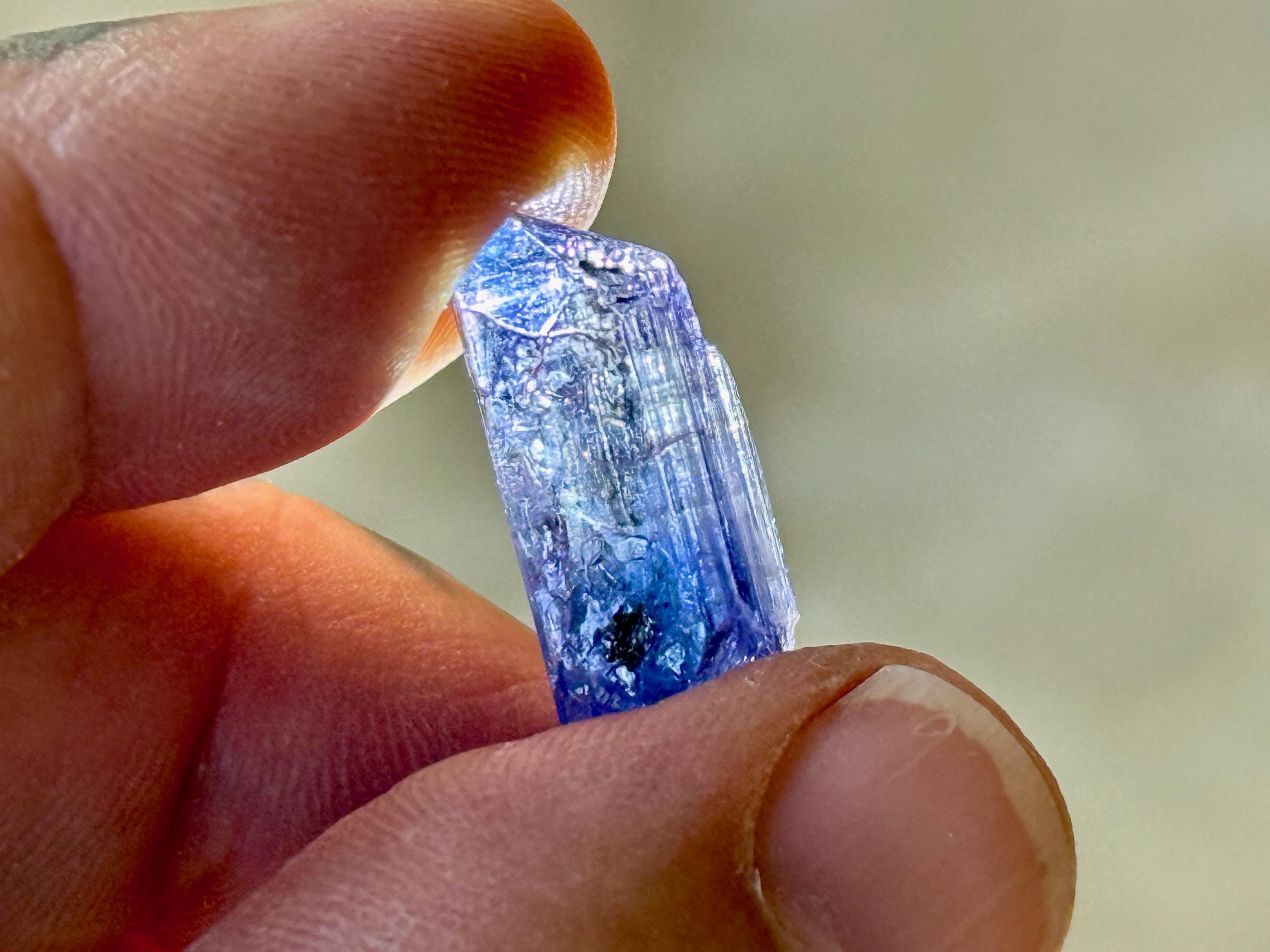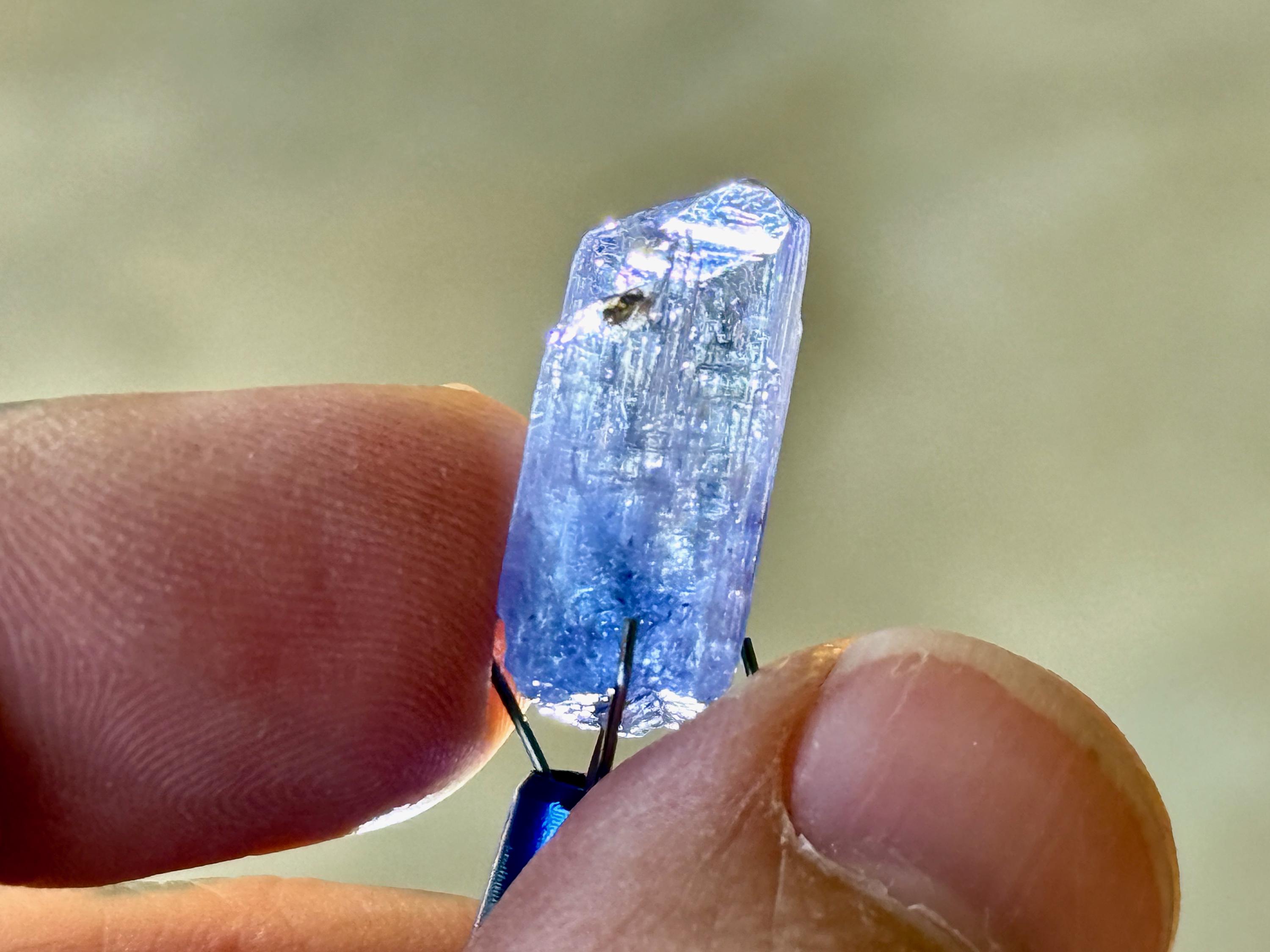 There is a chip to the body of this crystal which can be seen in Photo 5. However, the termination is intact and excellent. Outstanding quality to this stunning Tanzanite!