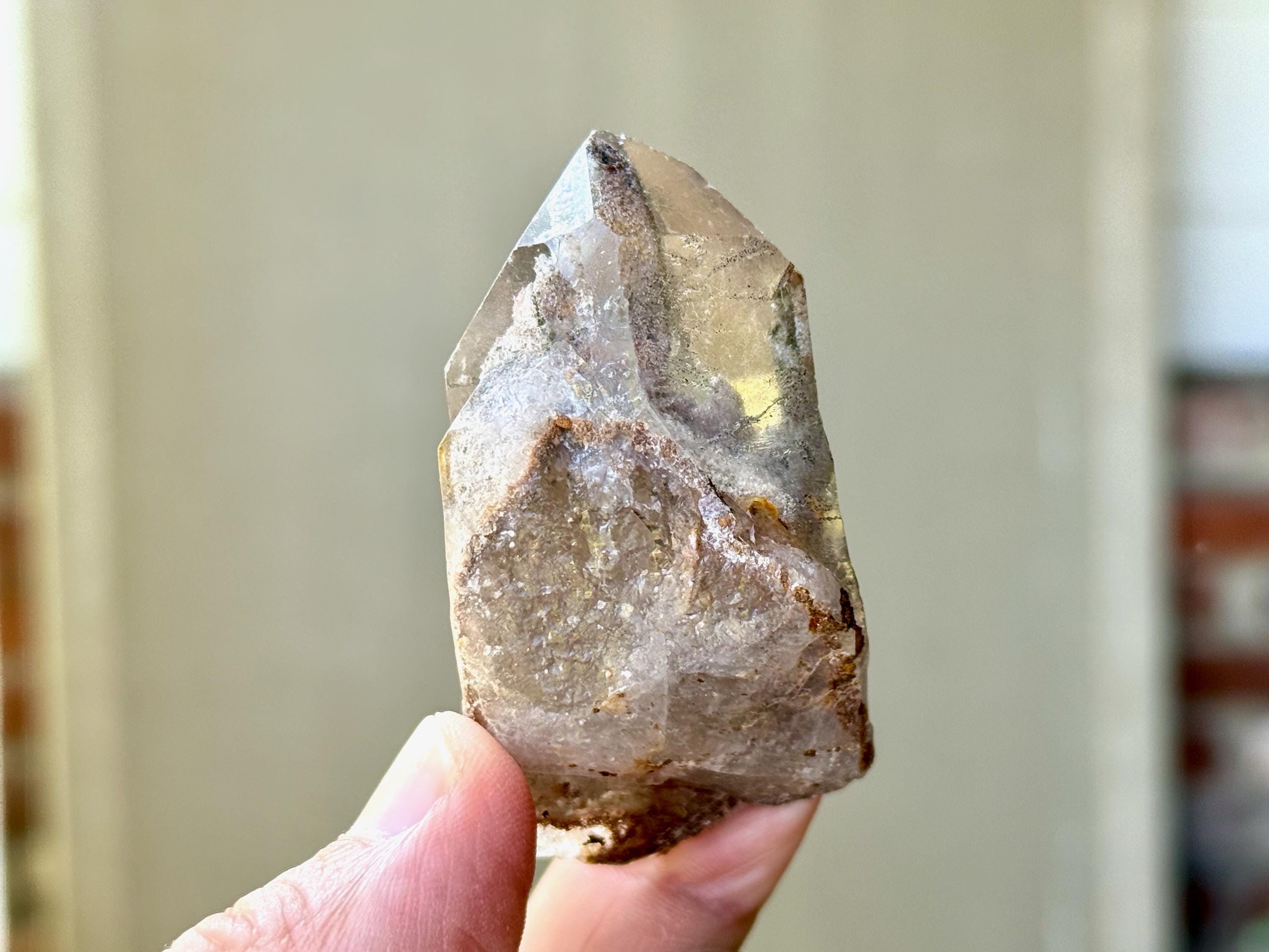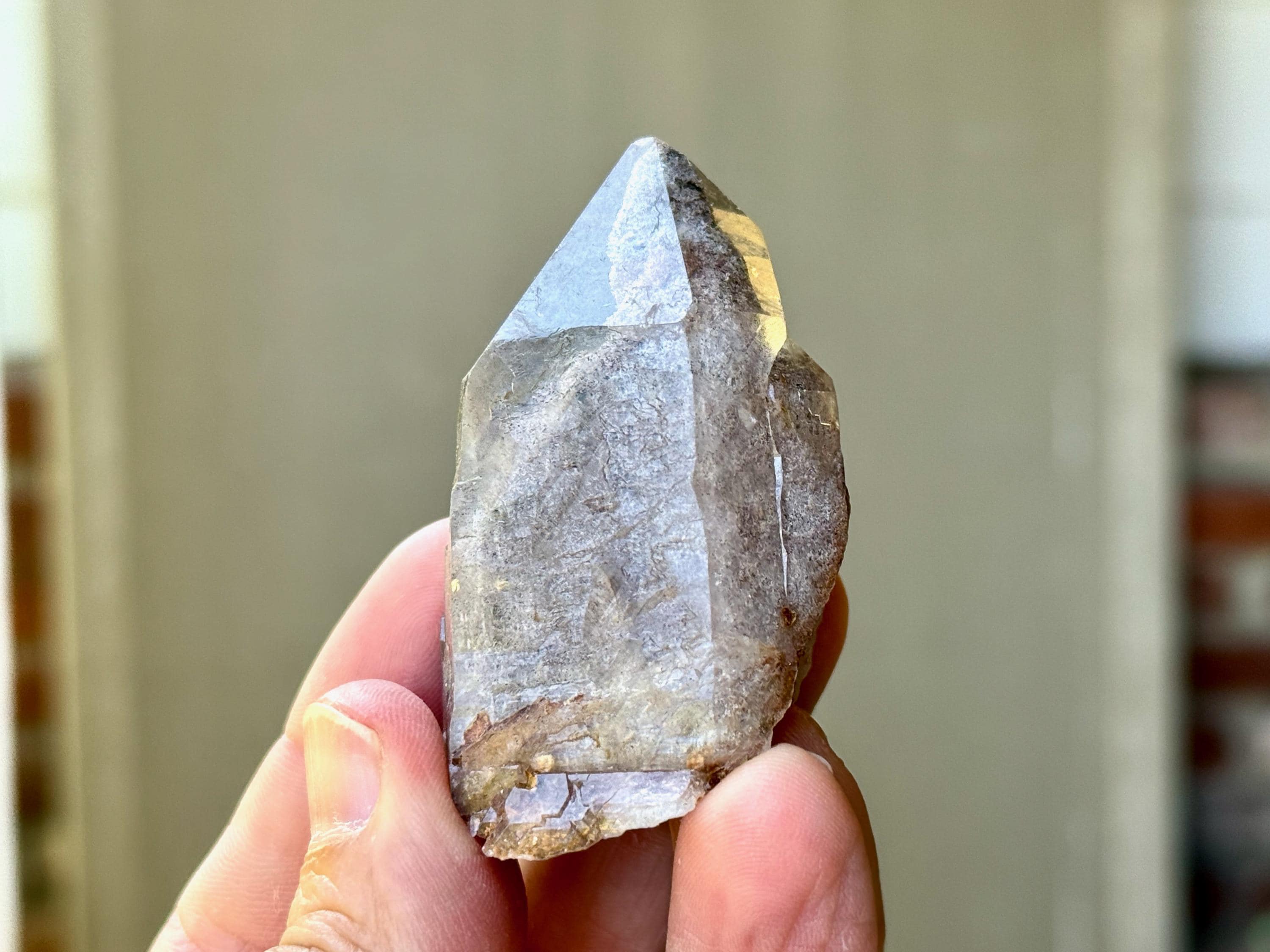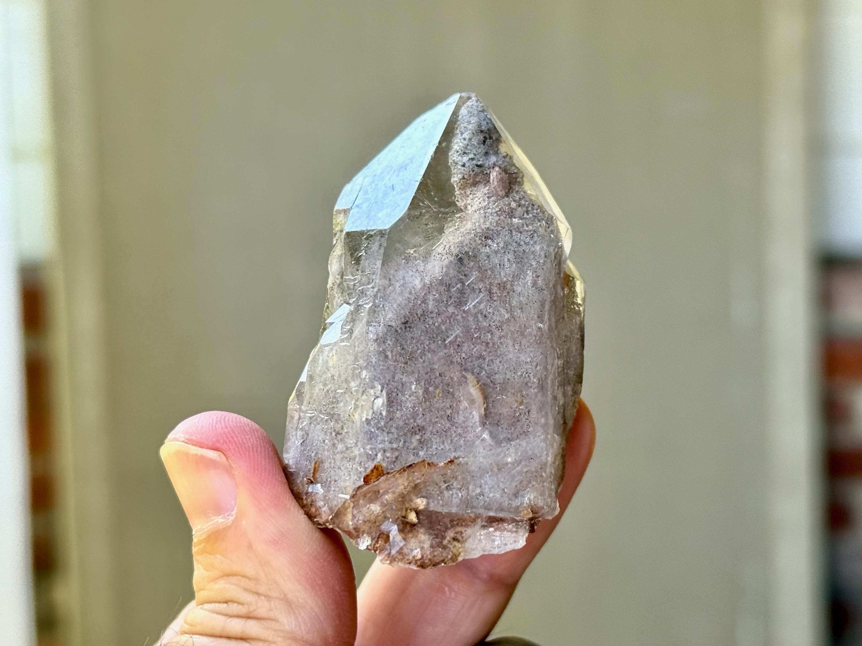 Outstanding clarity to this beautiful Smoky Lodolite Quartz crystal with a mild smoky hue and mossy inclusions of white and pale purple Lodolite within. The clarity of the exterior allows us to peer inside and enjoy all these inclusions. The luster is wonderful and the termination is excellent.