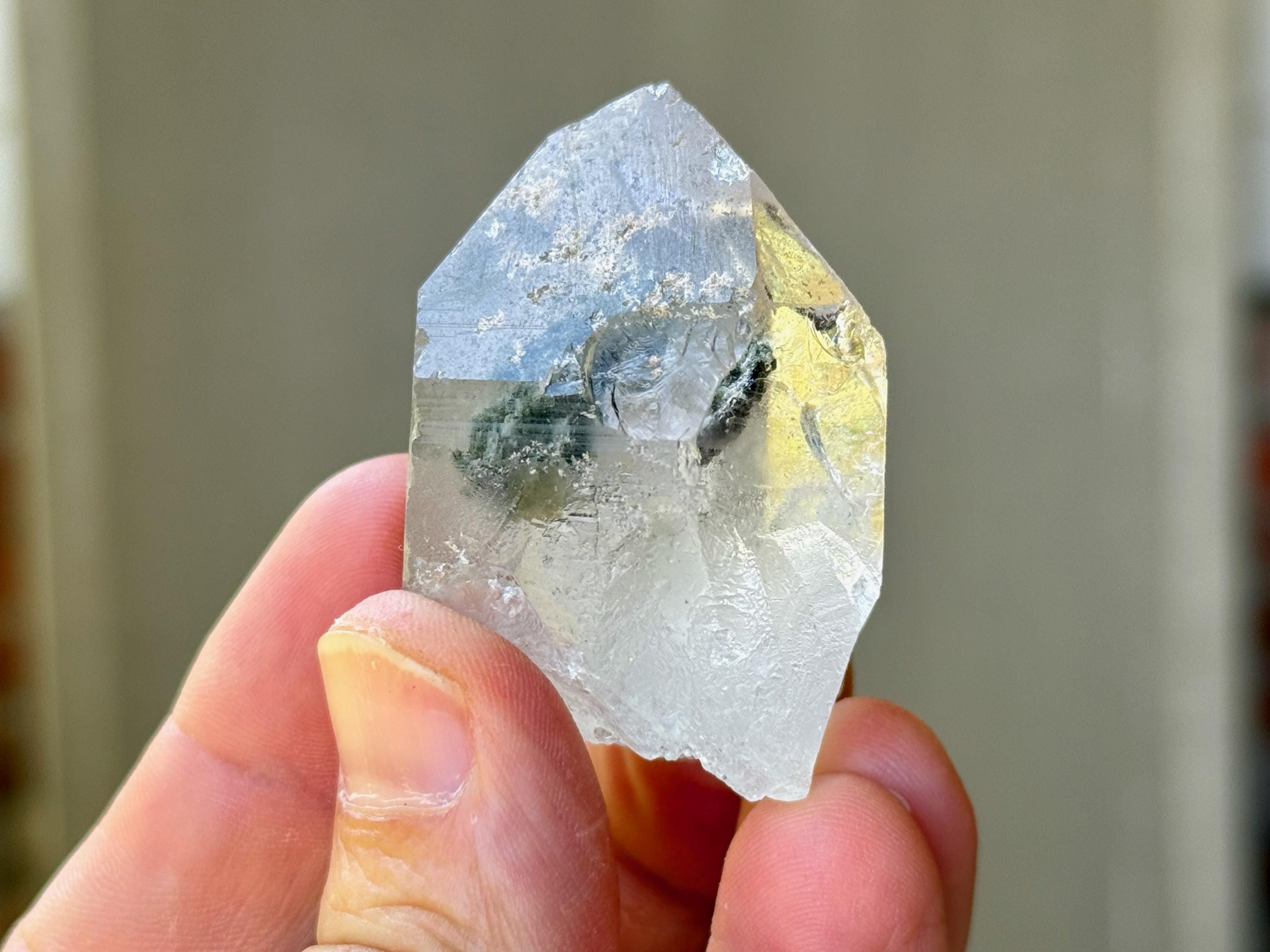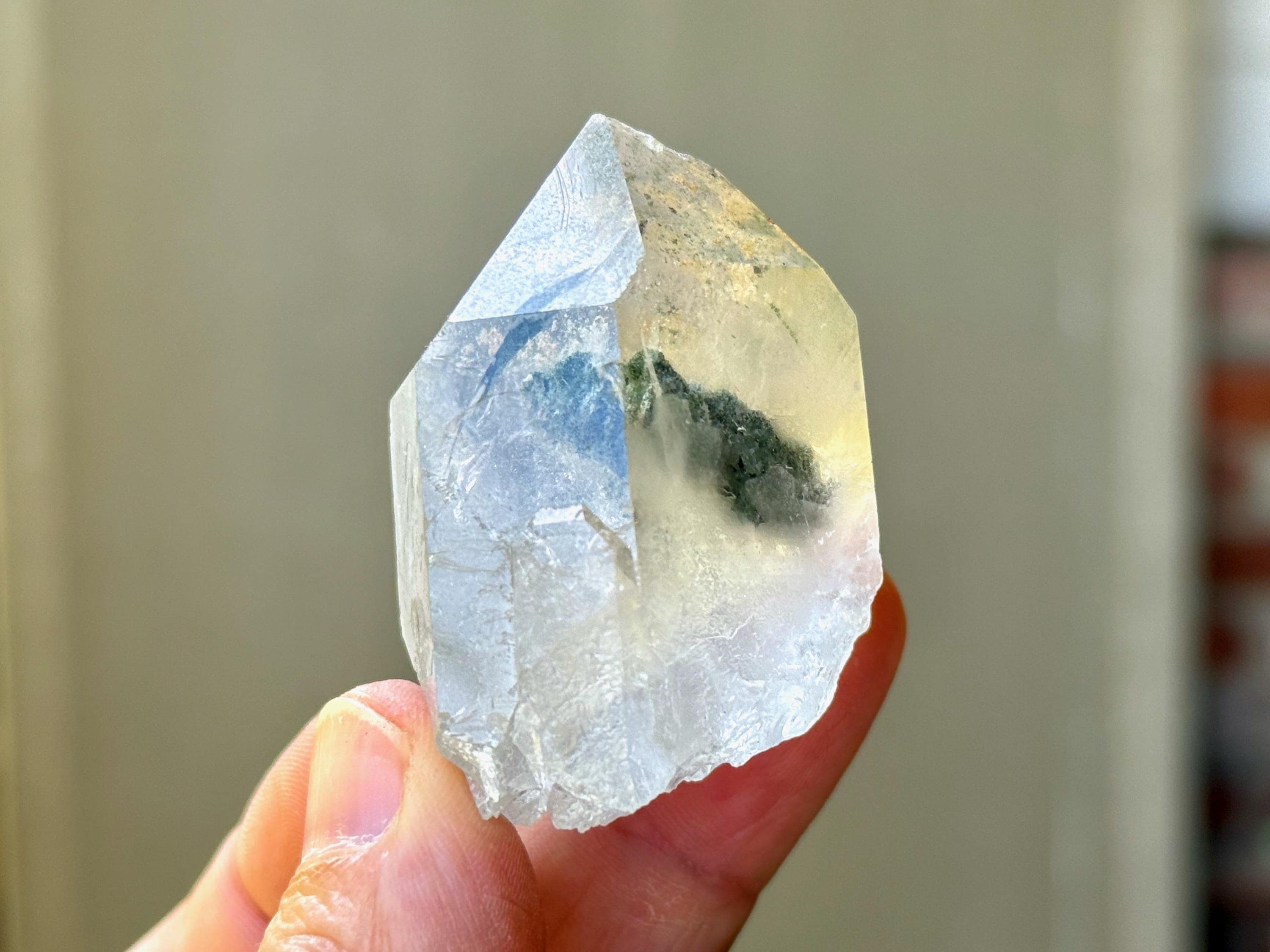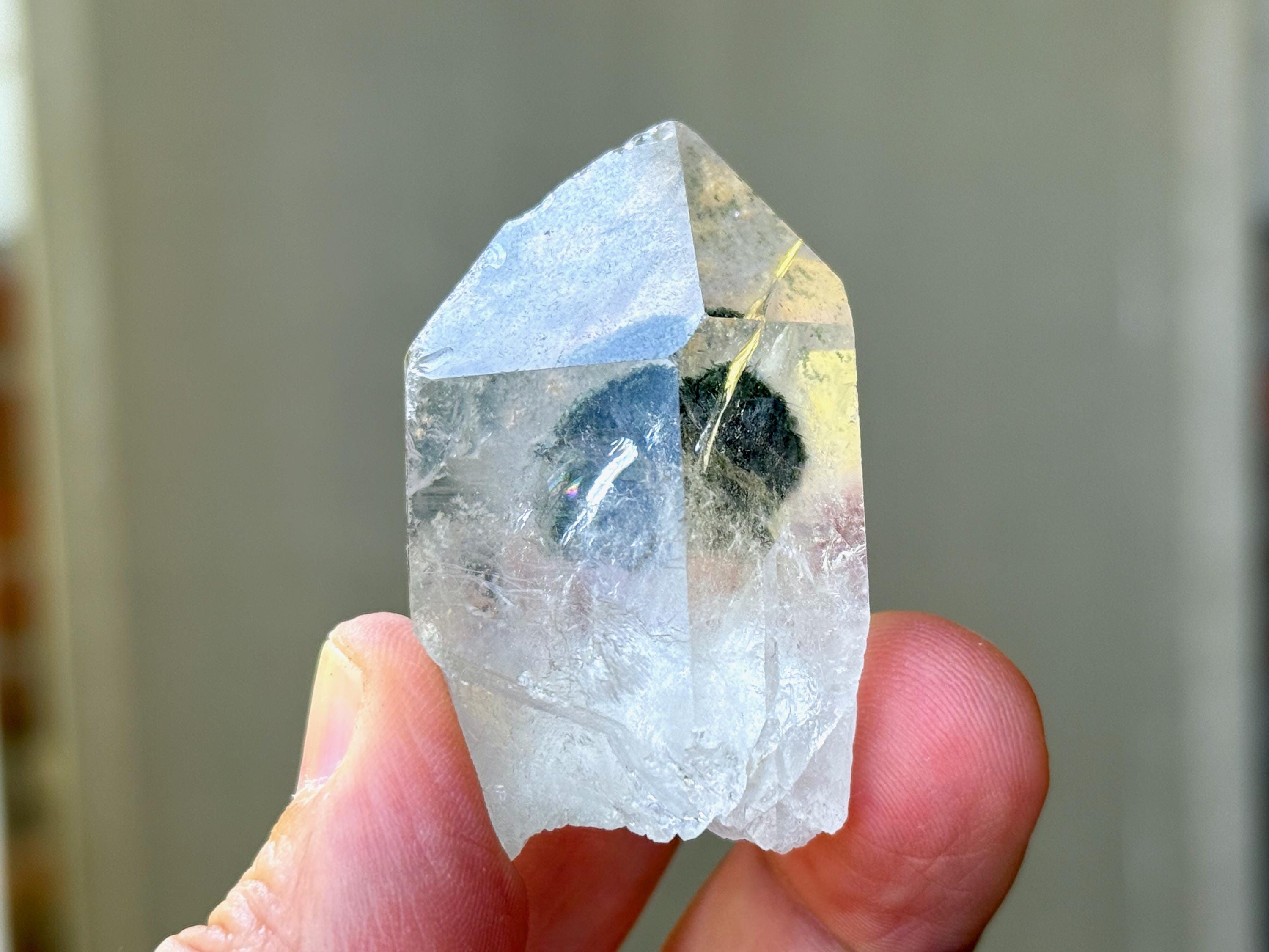 Water-clear clarity and brilliant luster to this broadly formed Quartz crystal with a dark Green Chlorite phantom inclusion hovering in the center. The clarity is magnificent and allows us to see this inclusion from every angle.