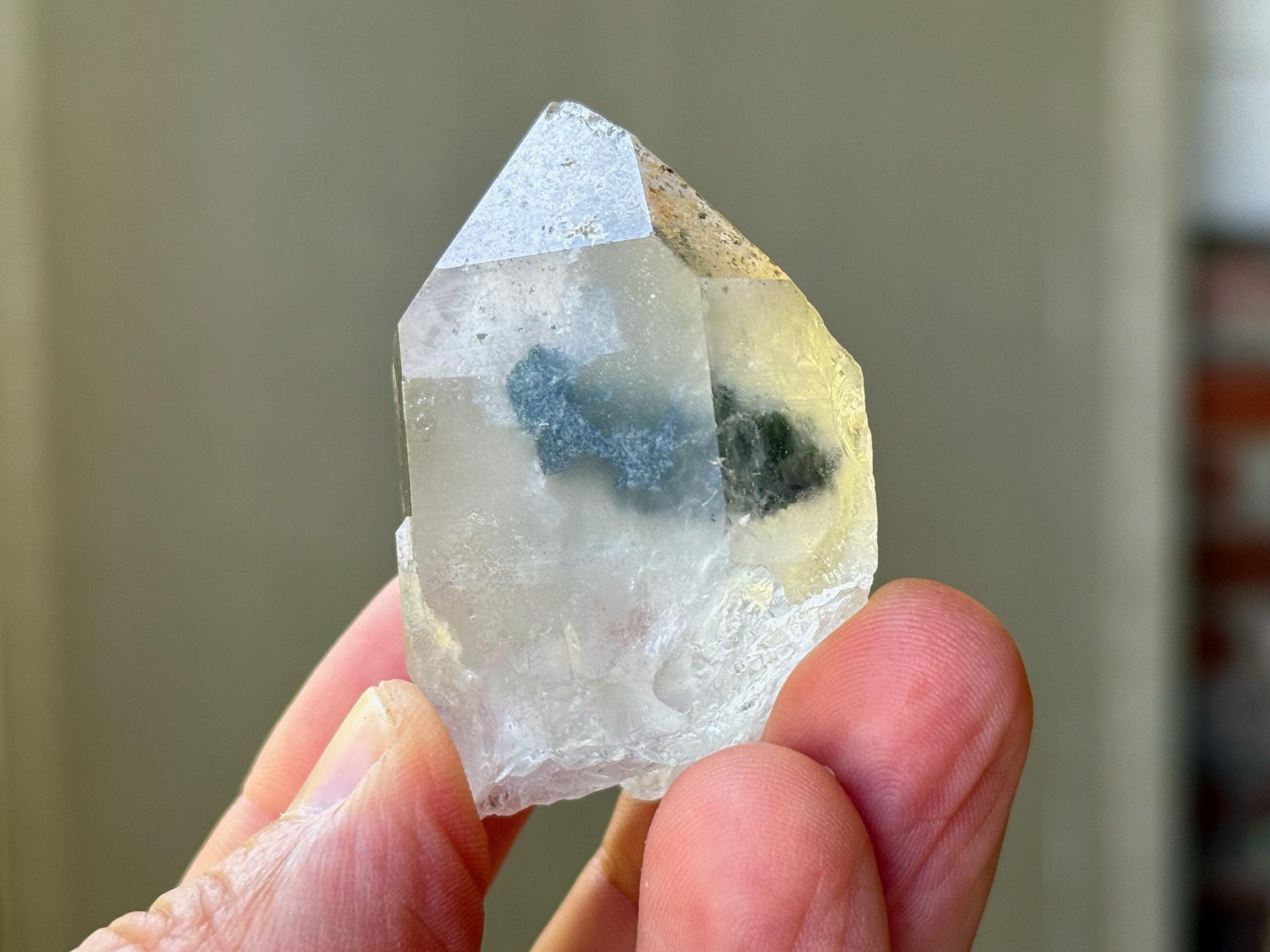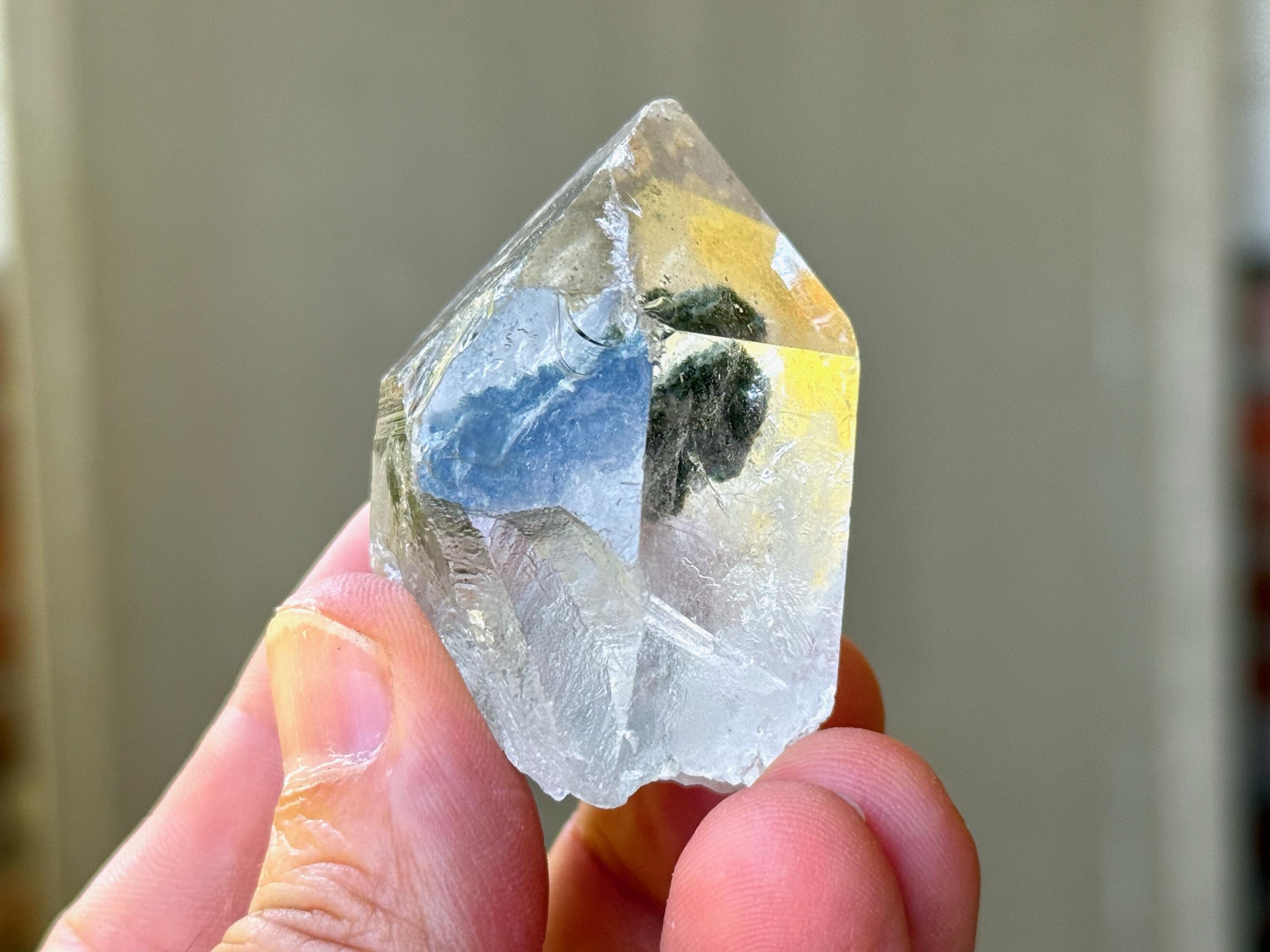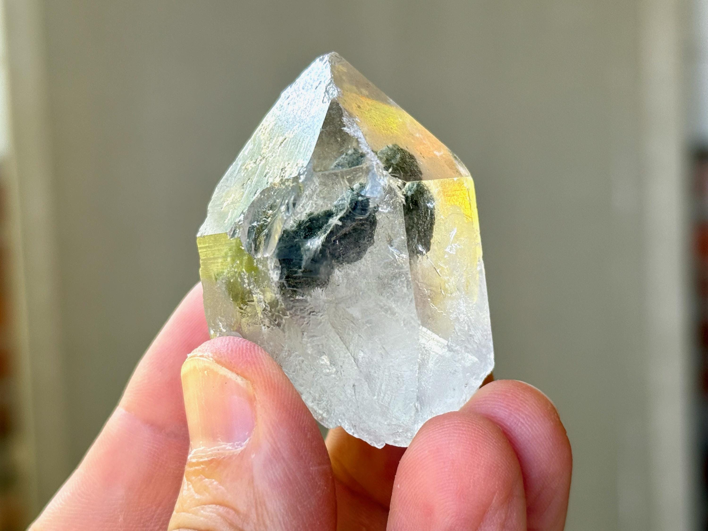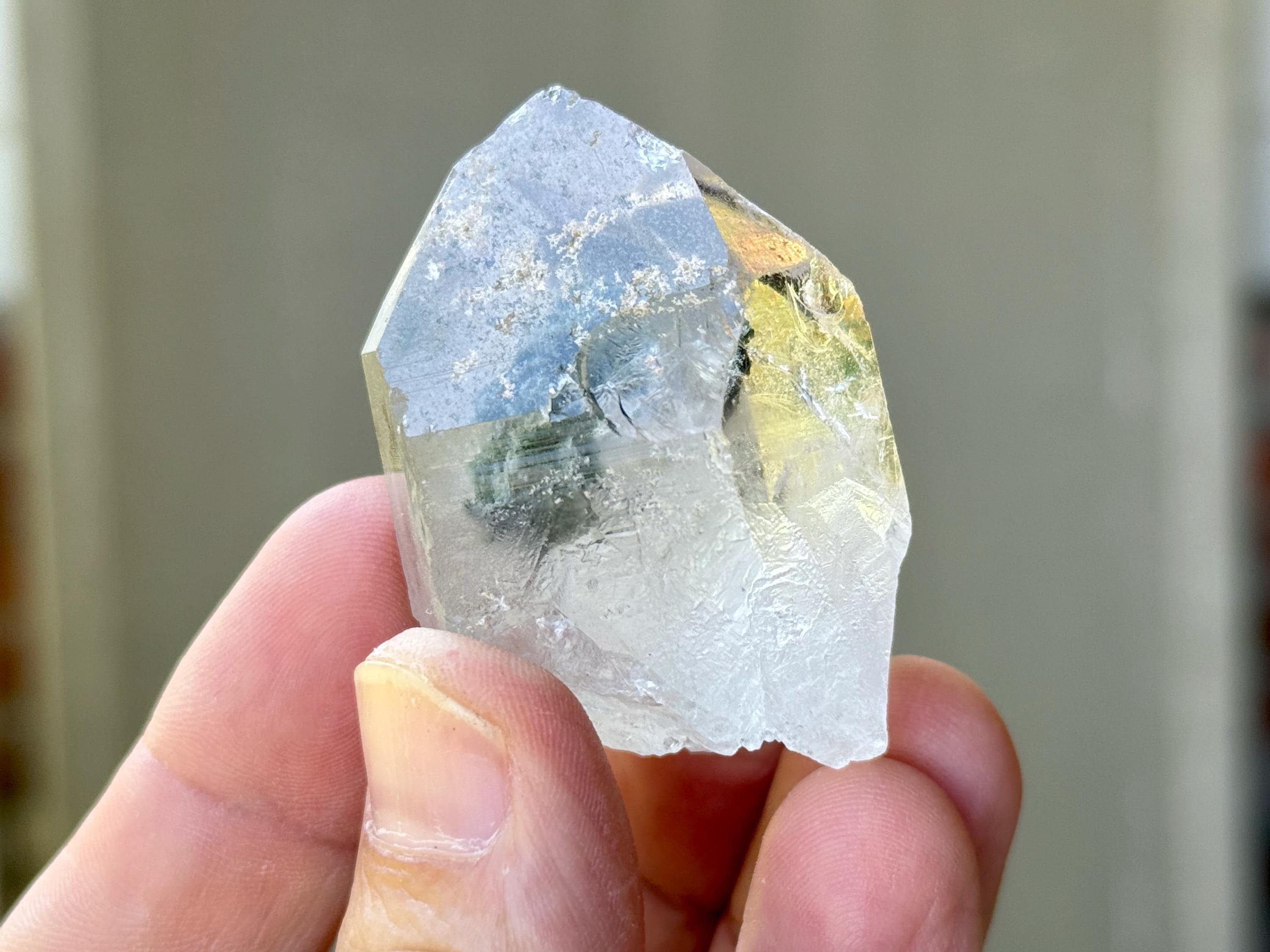 Water-clear clarity and brilliant luster to this broadly formed Quartz crystal with a dark Green Chlorite phantom inclusion hovering in the center. The clarity is magnificent and allows us to see this inclusion from every angle.