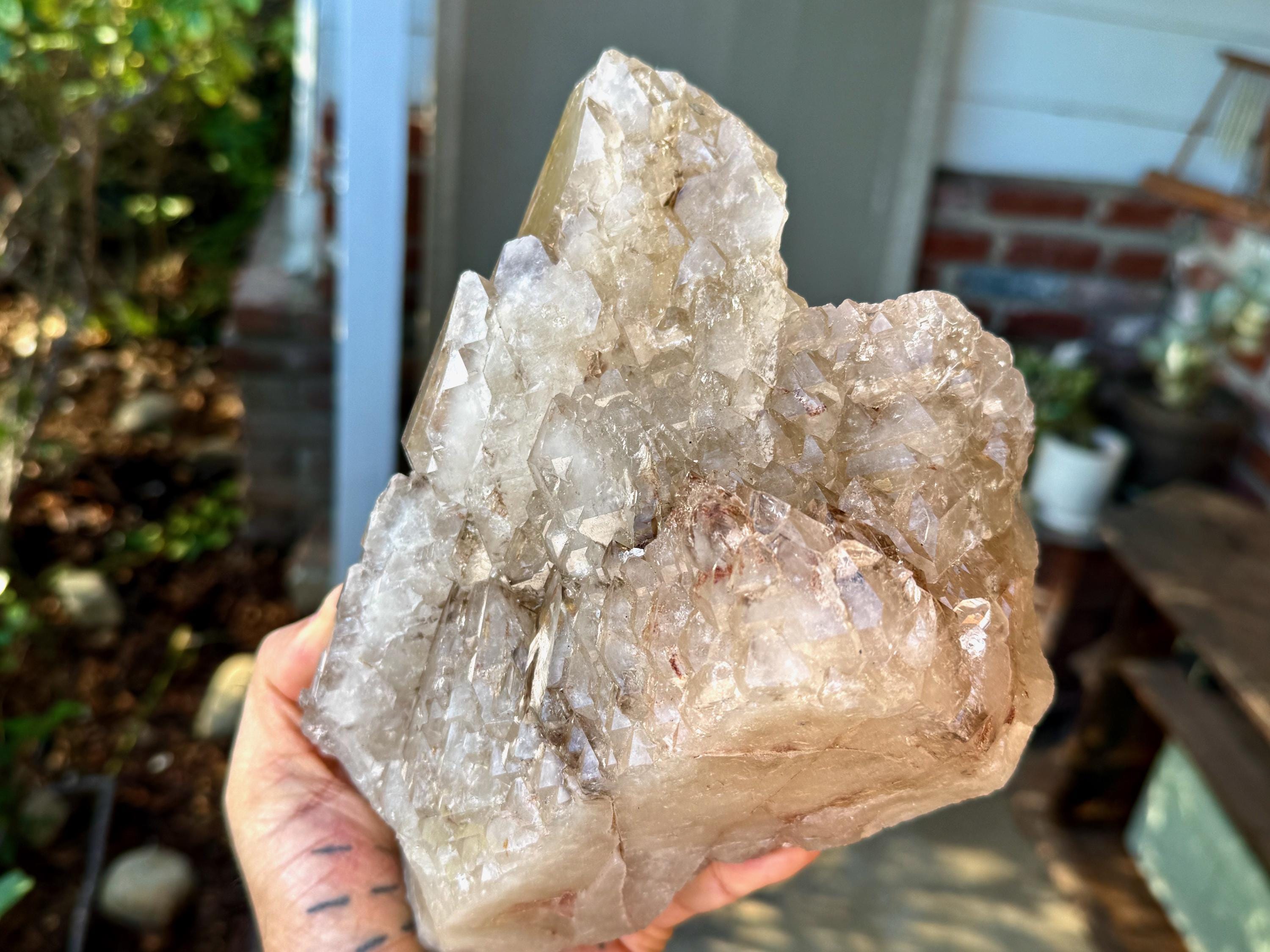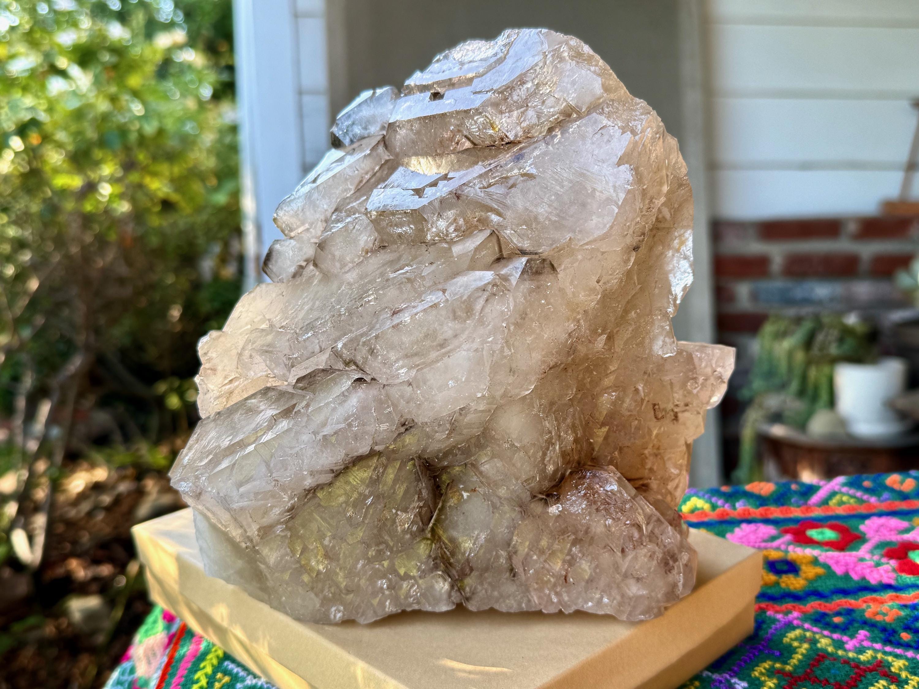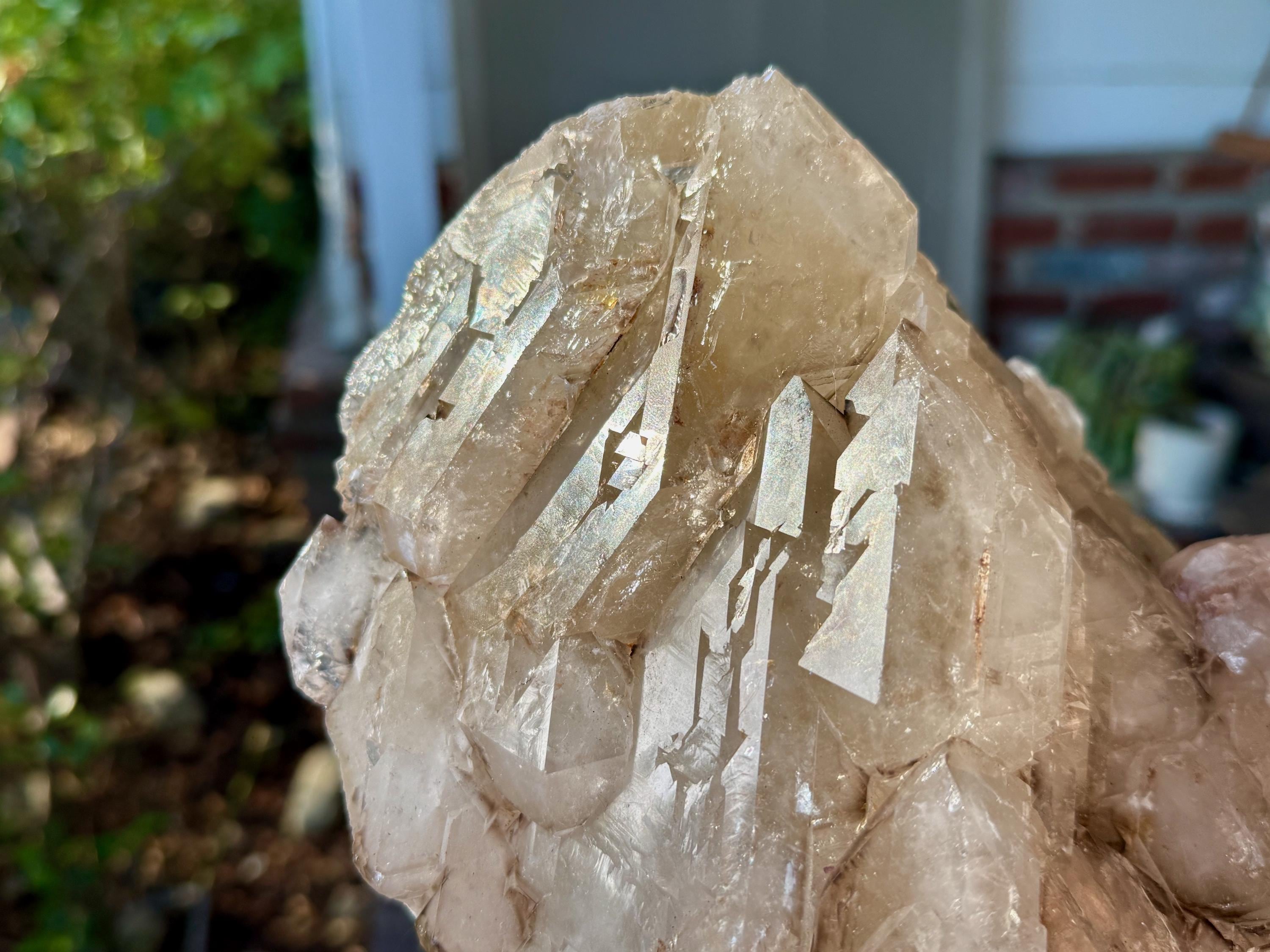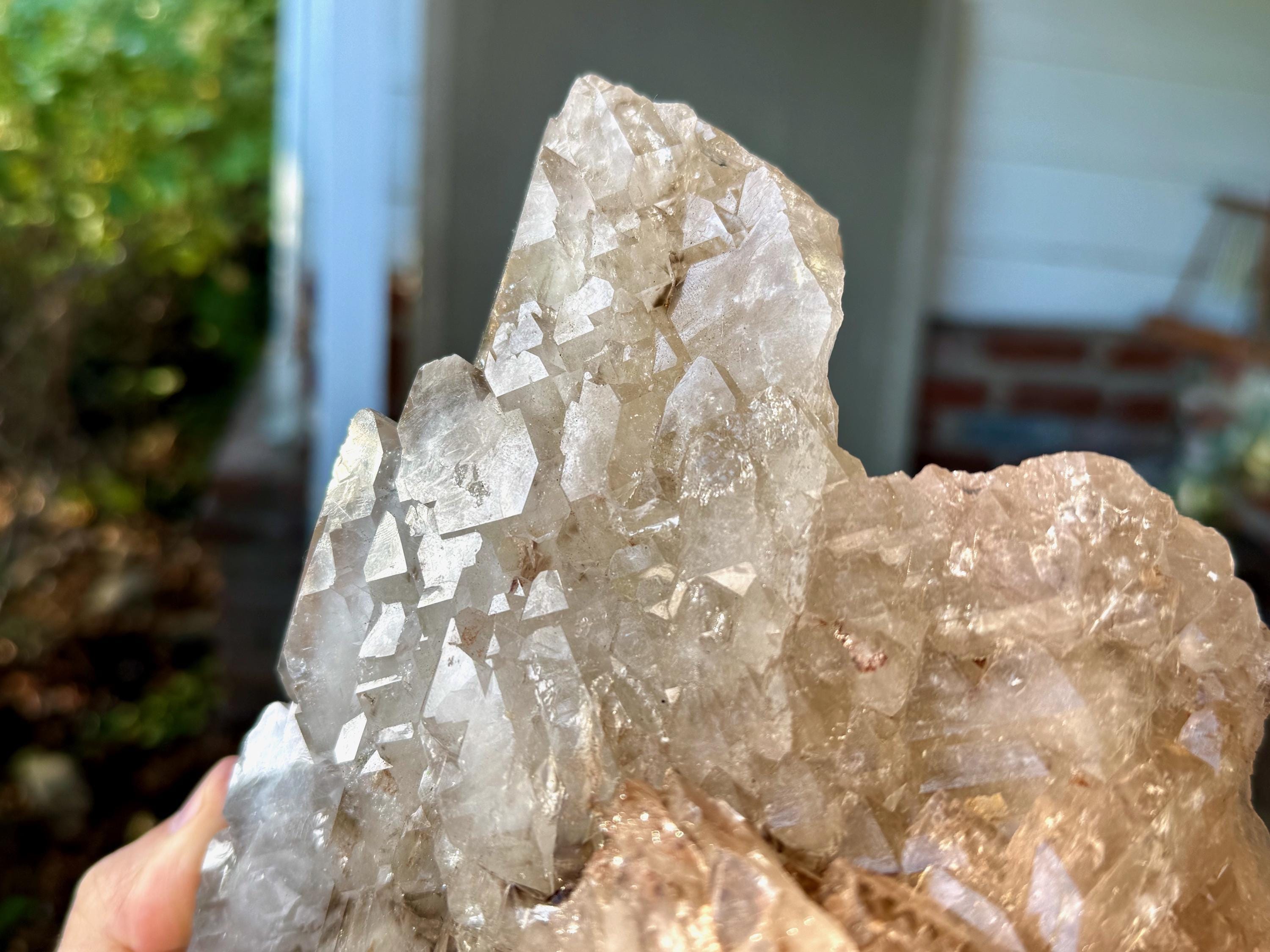 Brilliant luster to this massive Elestial Jacare Quartz with mild veins of smokiness throughout and a spectacular display of pyramidal facets covering its exterior.