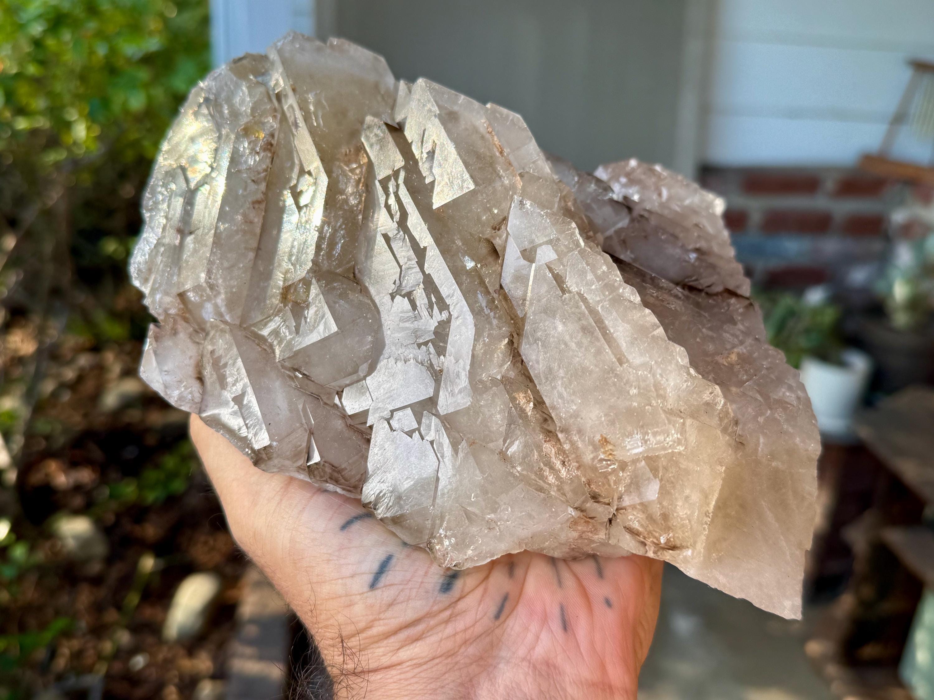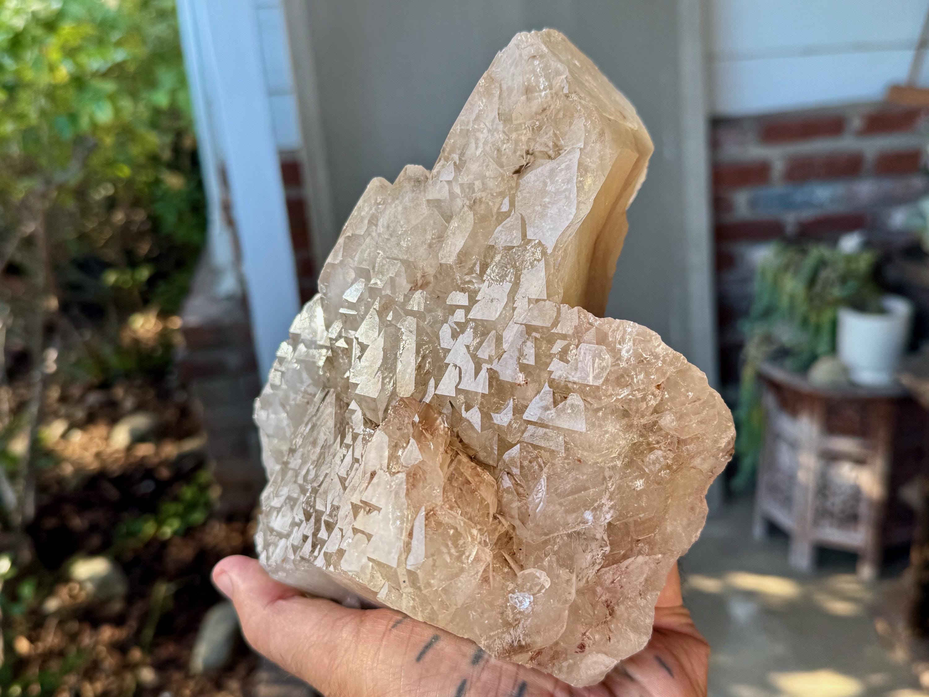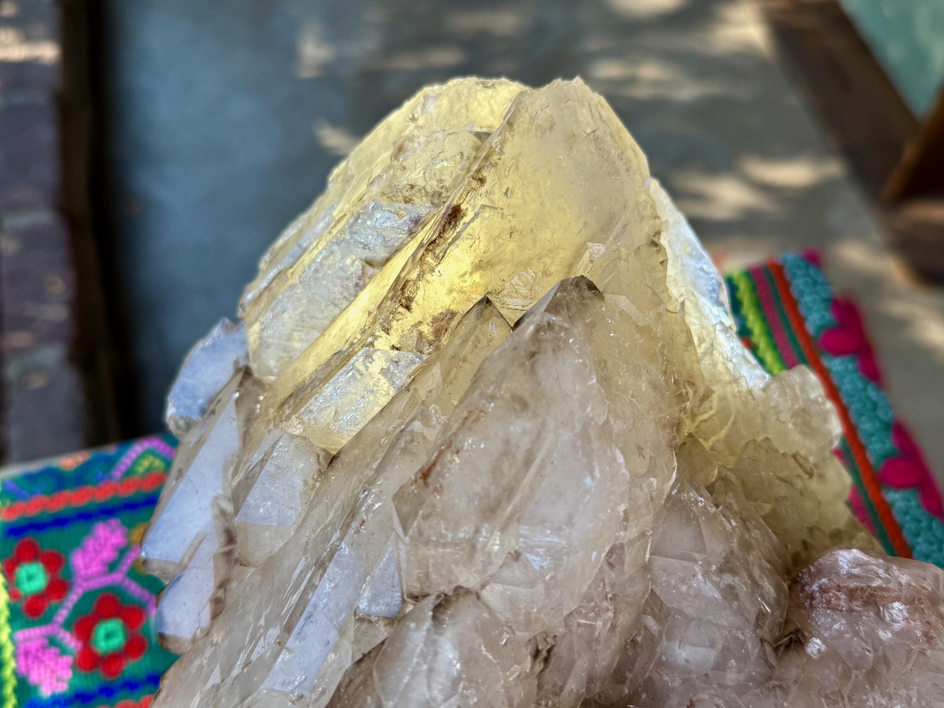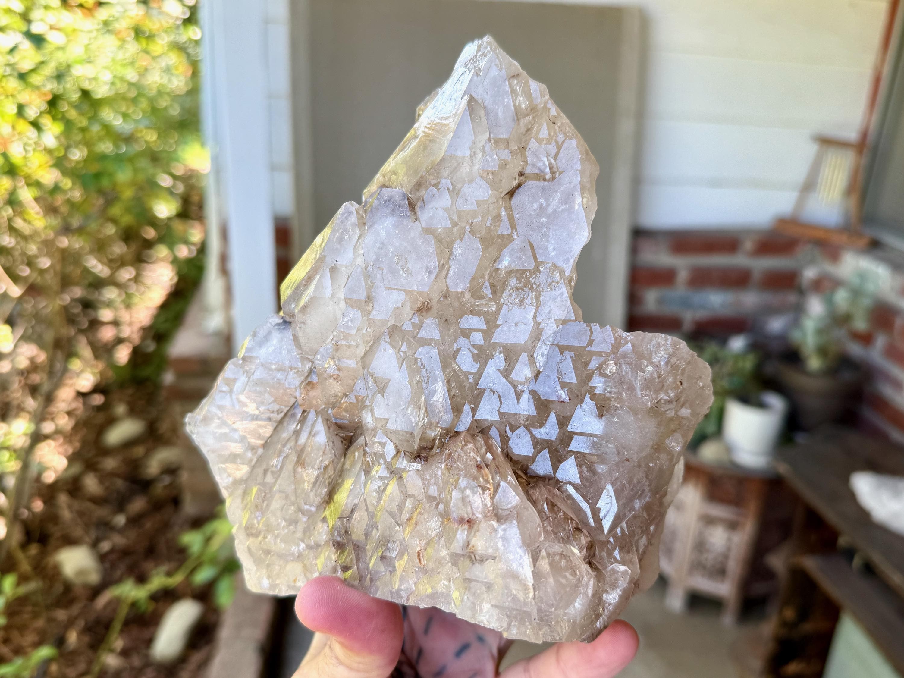 Brilliant luster to this massive Elestial Jacare Quartz with mild veins of smokiness throughout and a spectacular display of pyramidal facets covering its exterior.