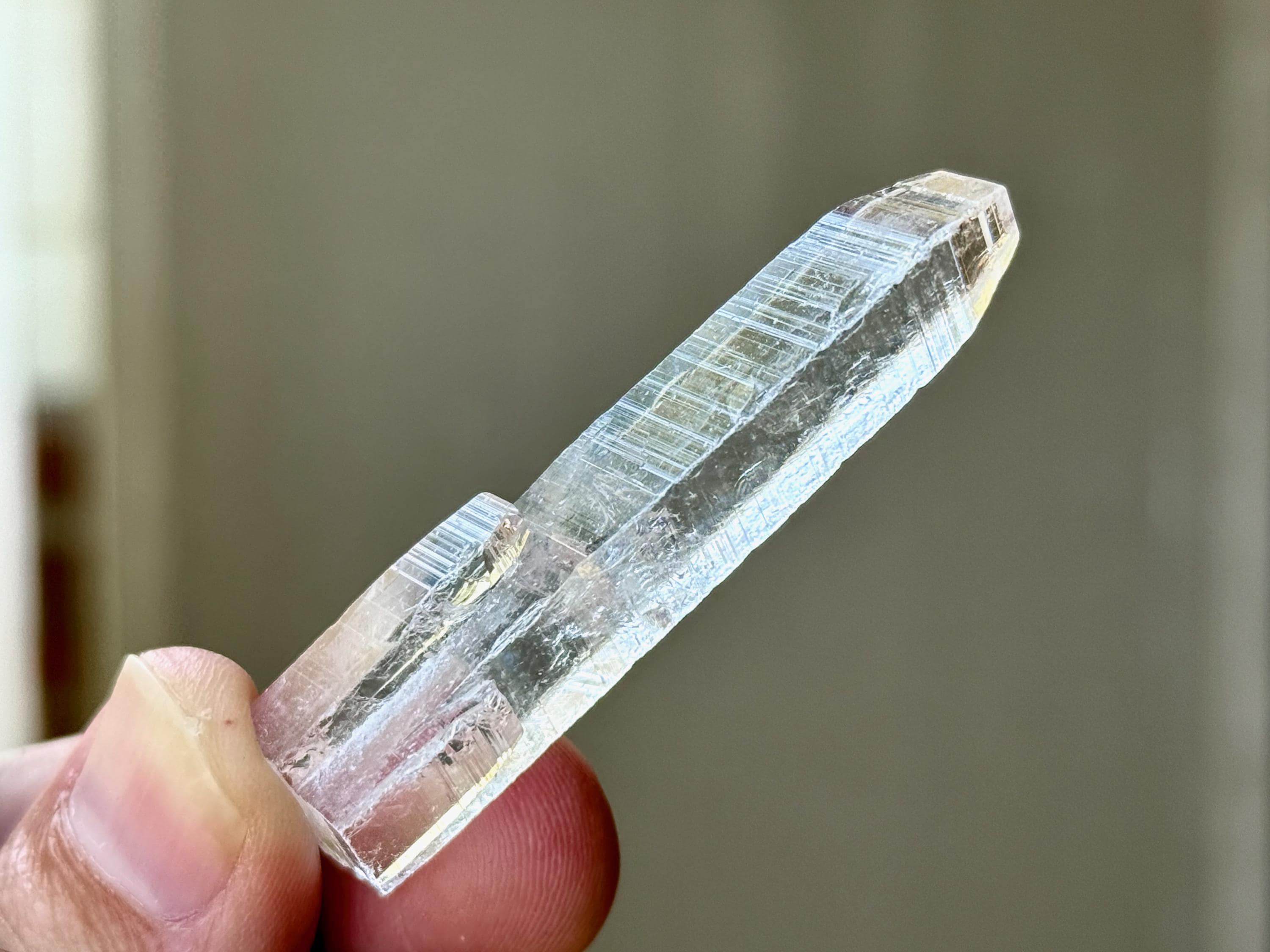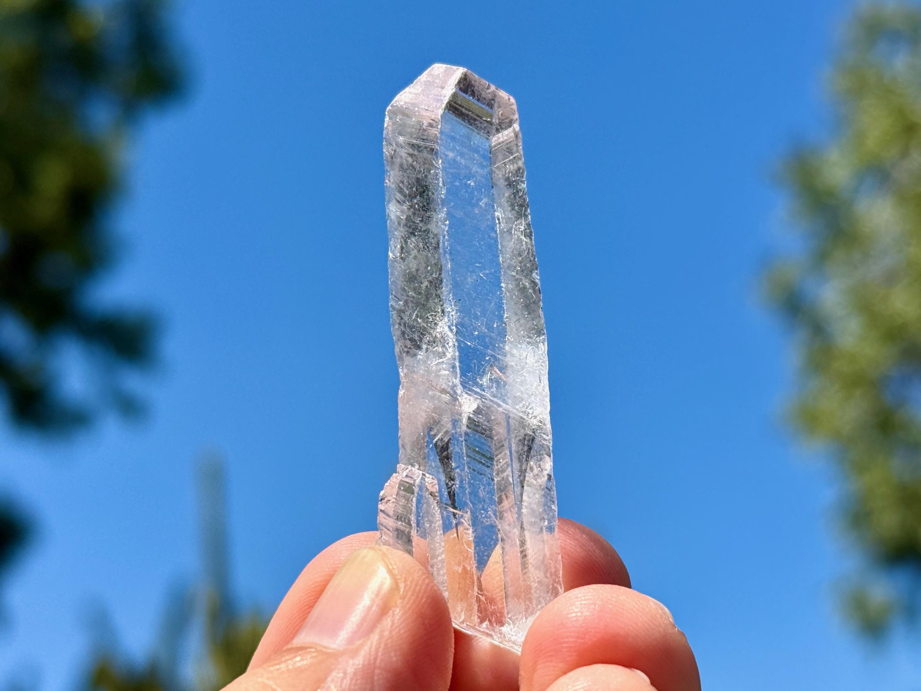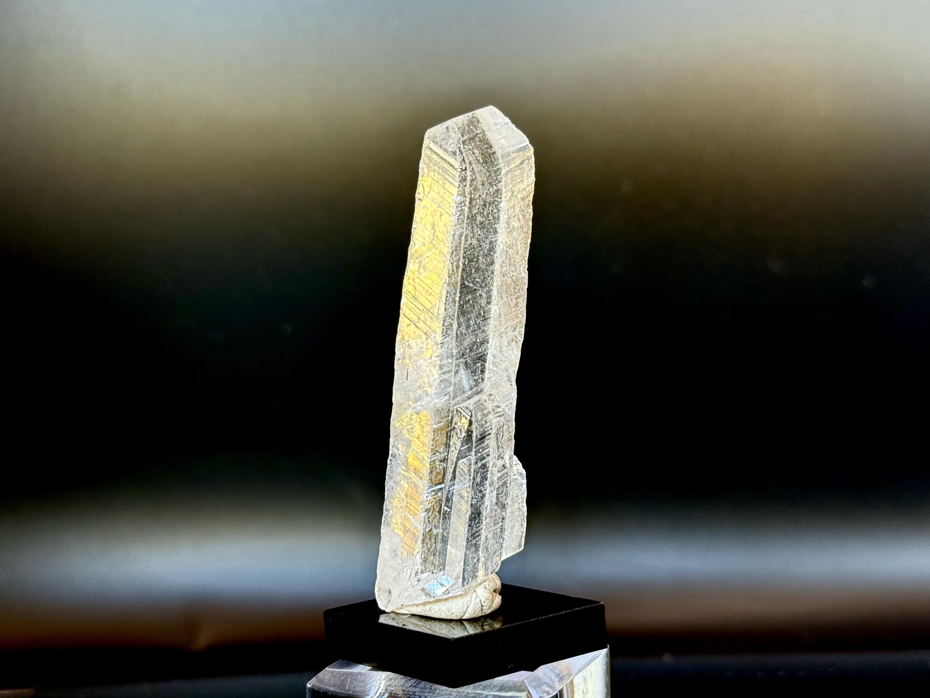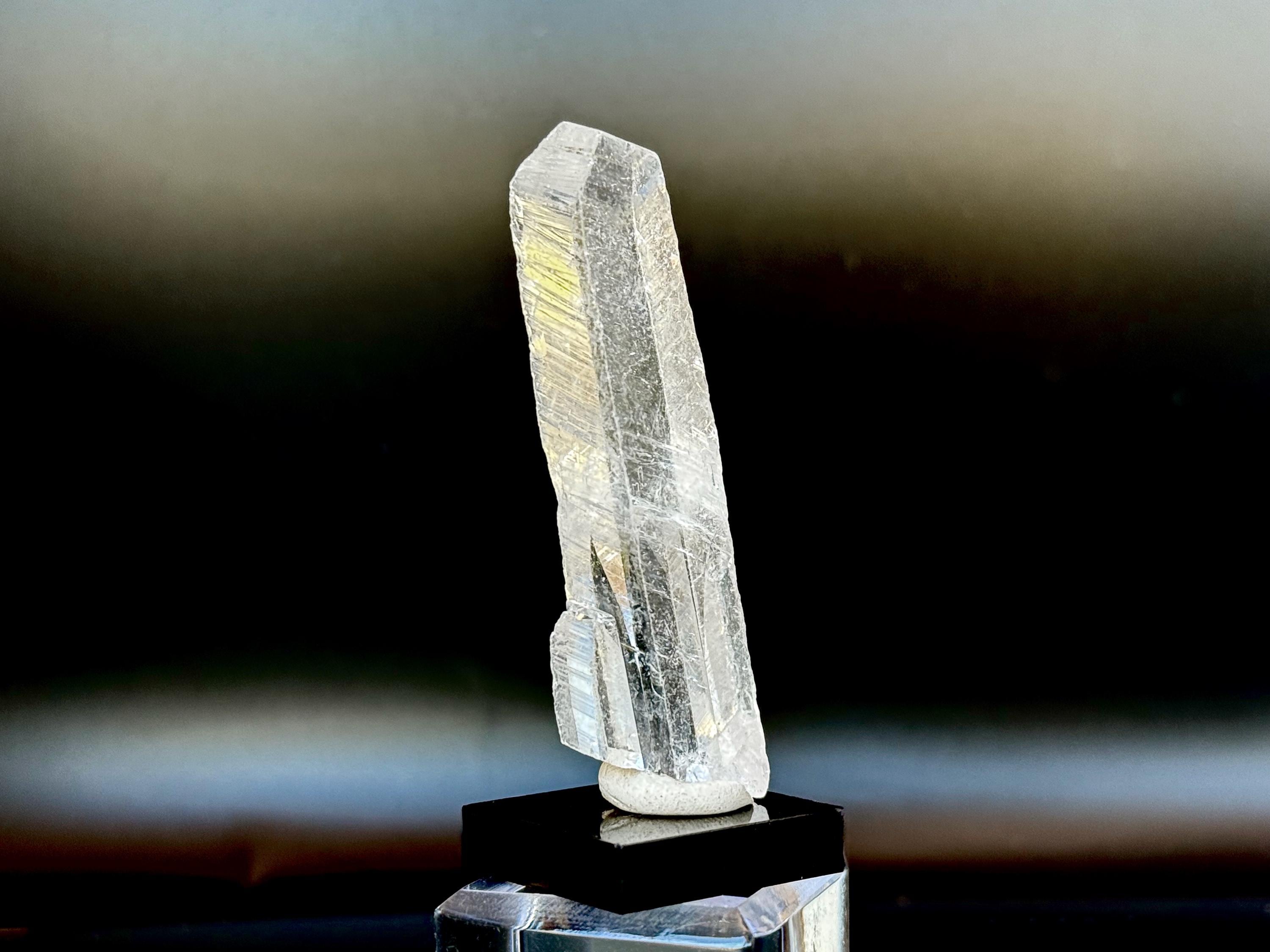 This crystal possesses water-clear clarity and brilliant luster with a glassy complexion and an aesthetic elongated formation. There are two smaller "children" attached at the base. On the exterior you'll find mild diagonal striations on each of its broad sides.