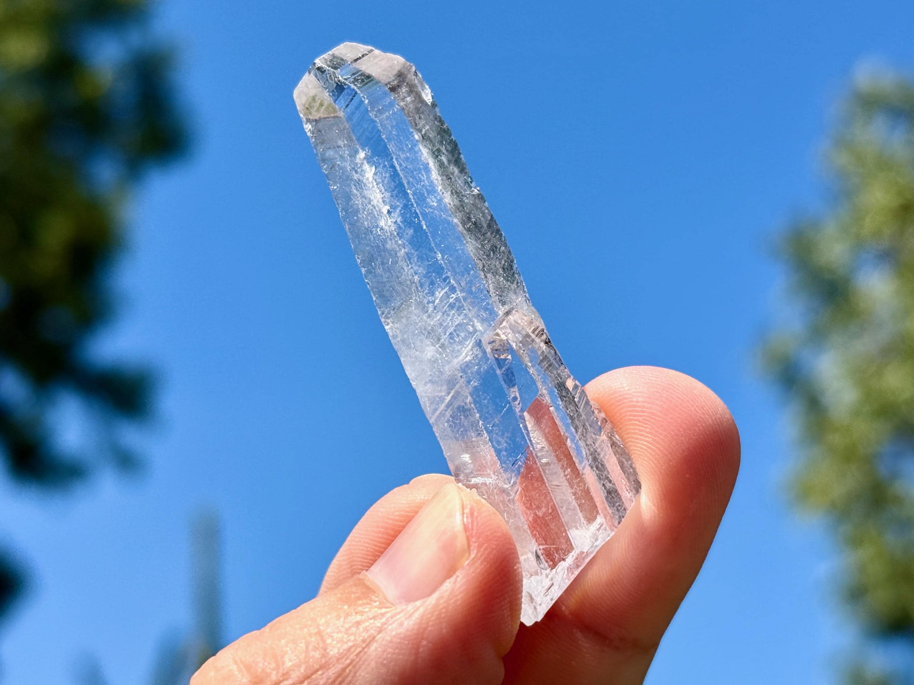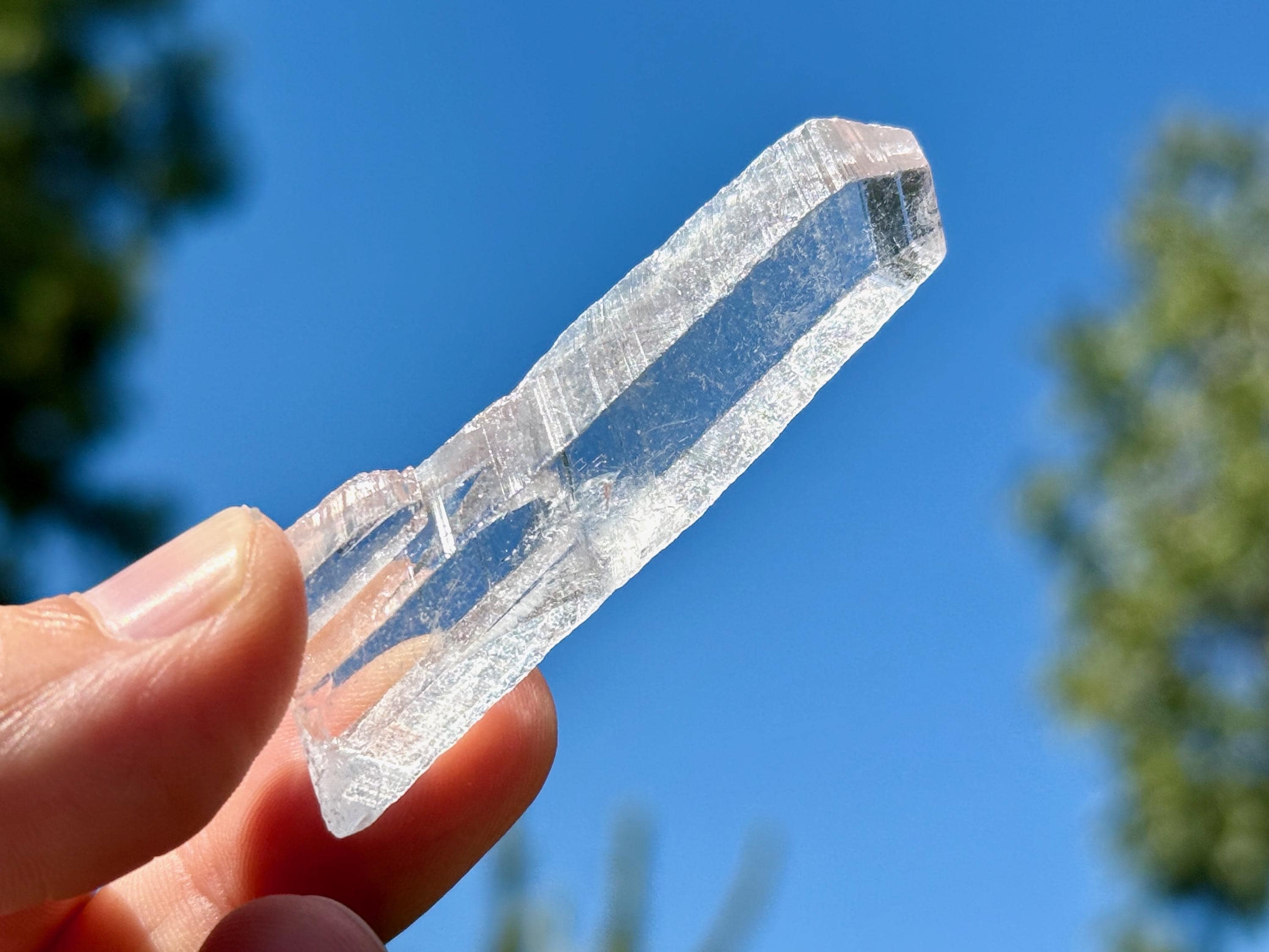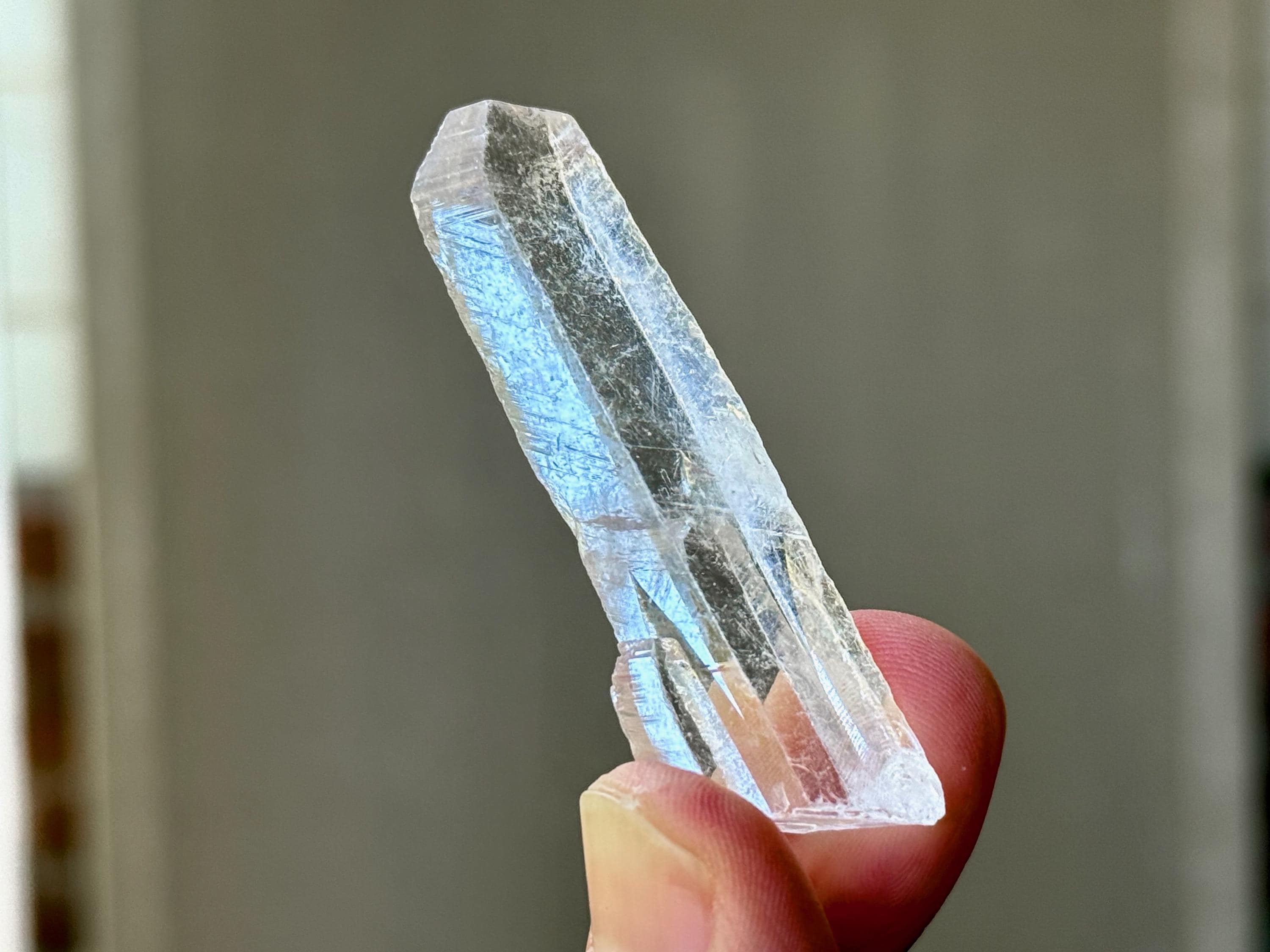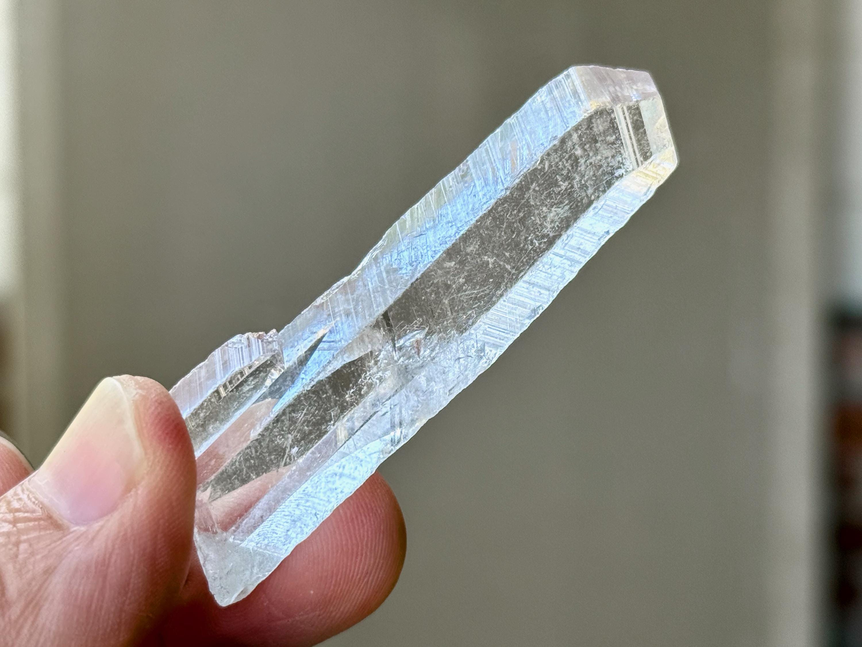 This crystal possesses water-clear clarity and brilliant luster with a glassy complexion and an aesthetic elongated formation. There are two smaller "children" attached at the base. On the exterior you'll find mild diagonal striations on each of its broad sides.