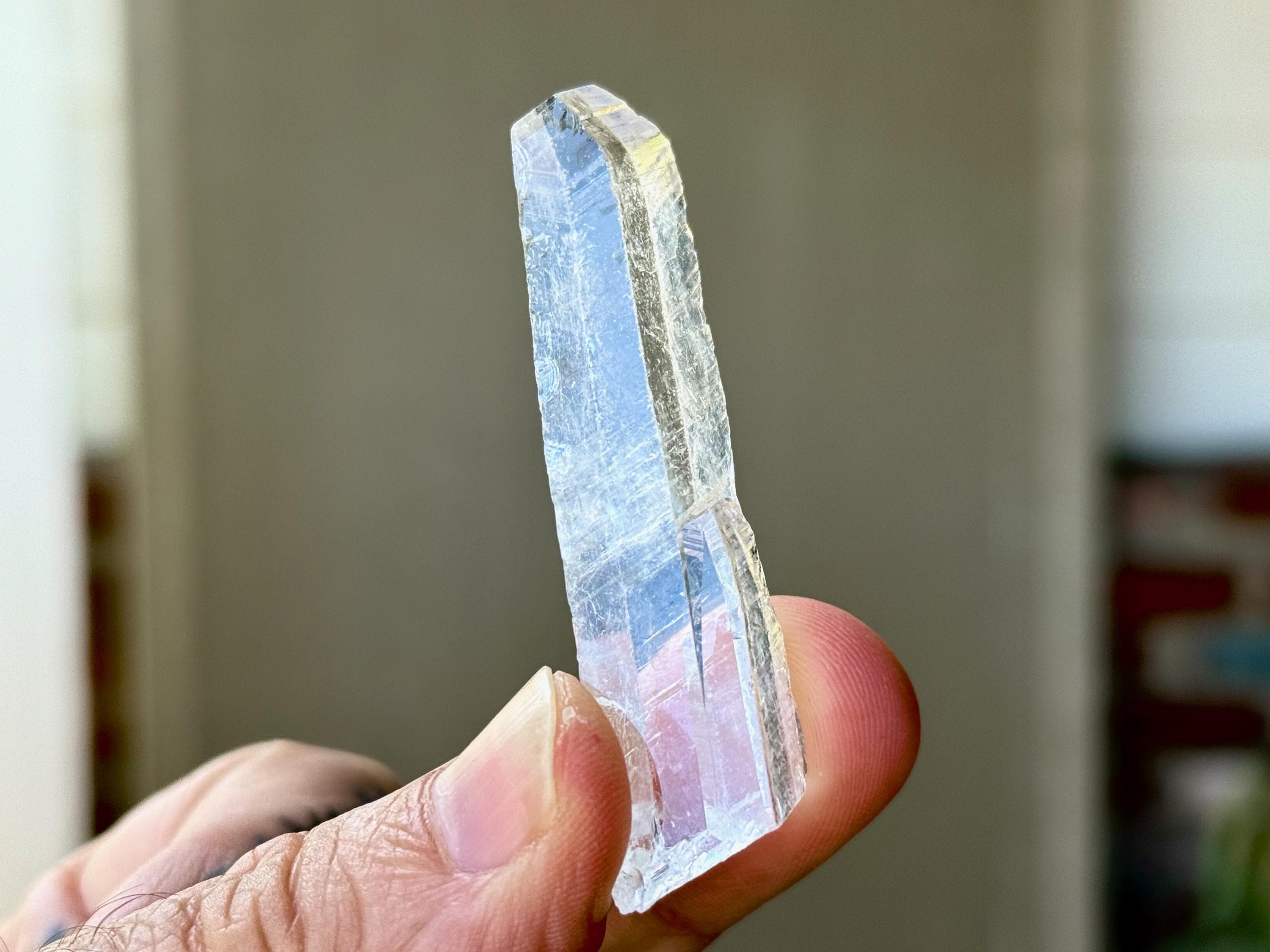 This crystal is naturally terminated with a somewhat "cleaved" (flat) termination on the primary crystal. There are a few minuscule scuffs to some of the edges, but these are basically imperceptible unless viewed with a jeweler's loupe.