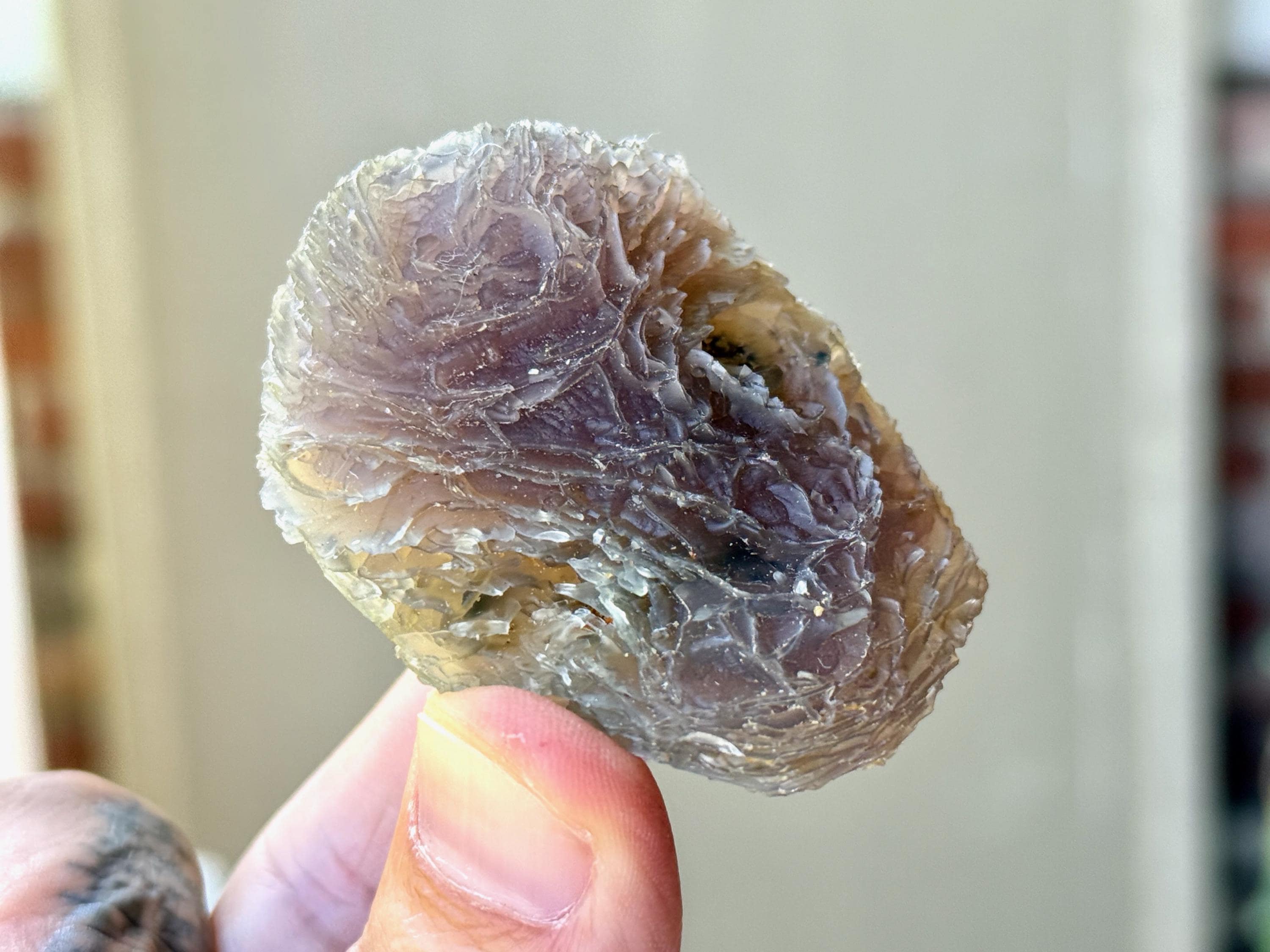 Unique textures in patterns that look like a rose! This is an extraordinary Black Mountain Gobi Agate, one of a very small collection we were able to procure. In natural light, this stone has a greenish-black color with intricate patterning throughout. When backlit, this stone lights up brilliantly! (Photos 1, 3-4). Outstanding beauty to this extraordinary fossil stone.